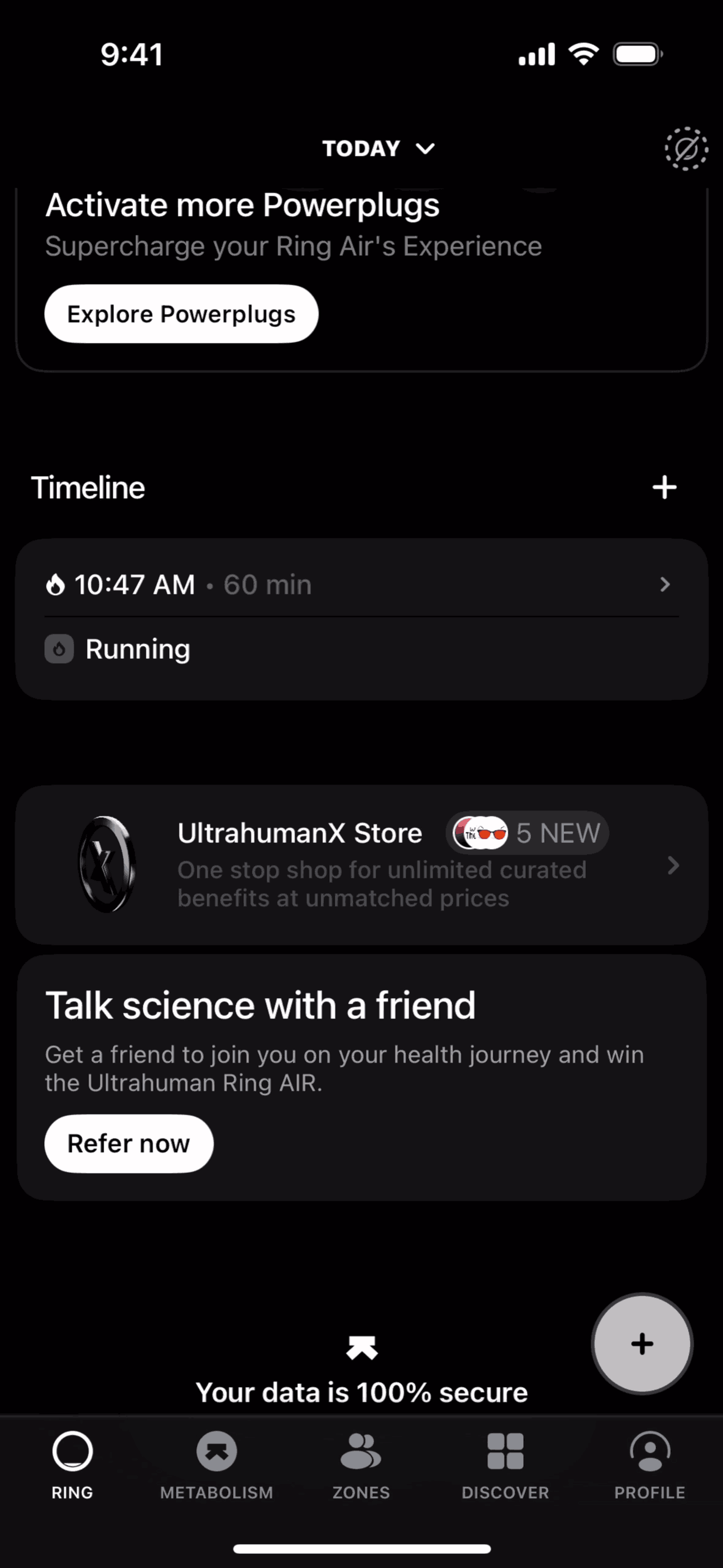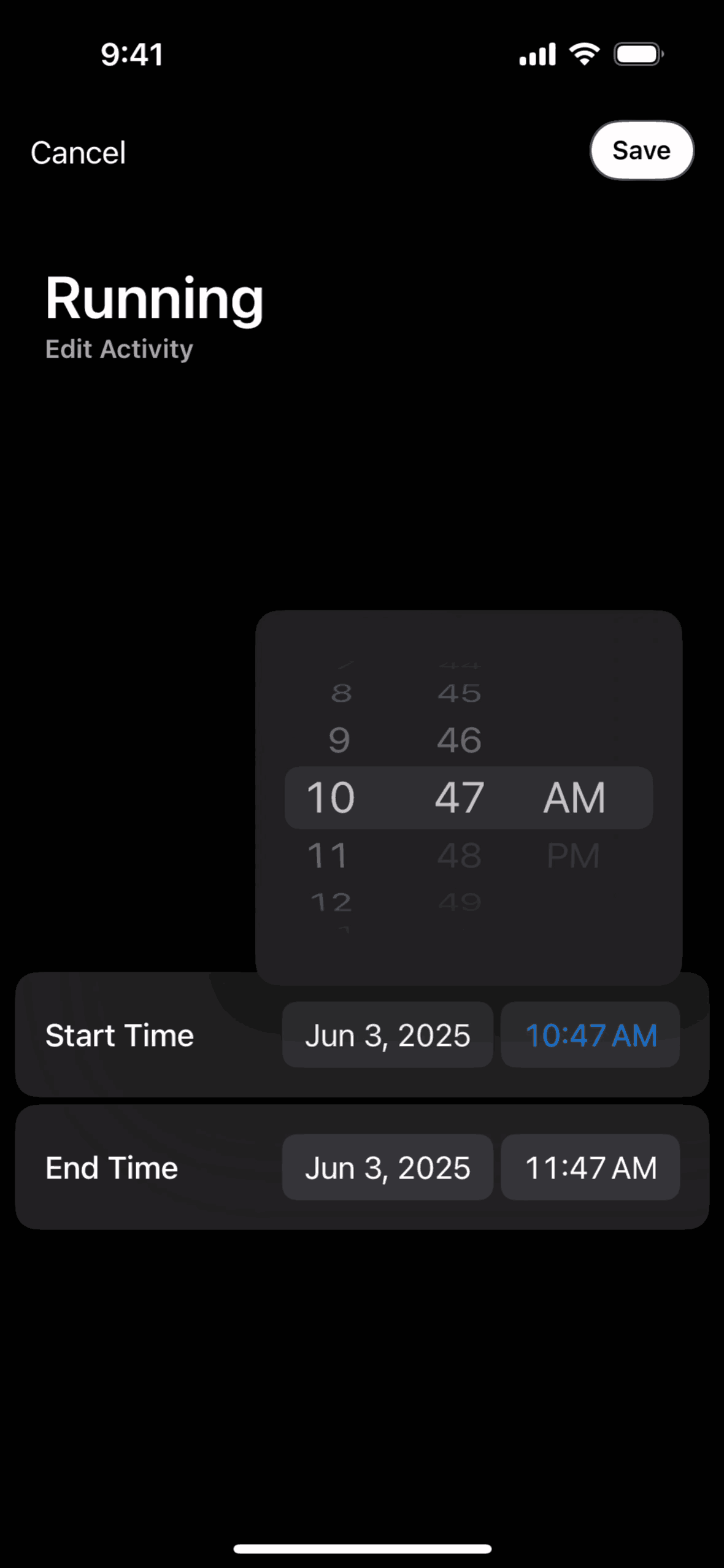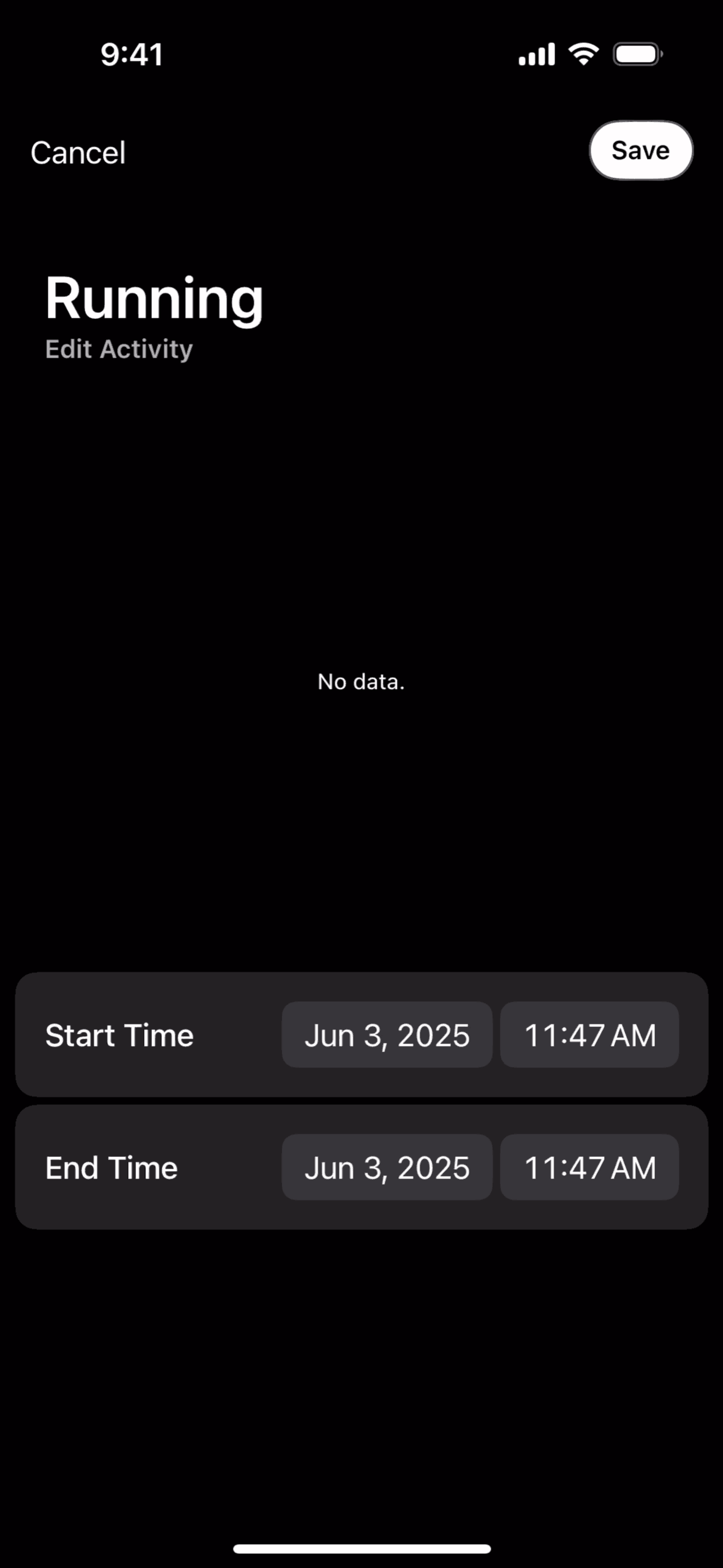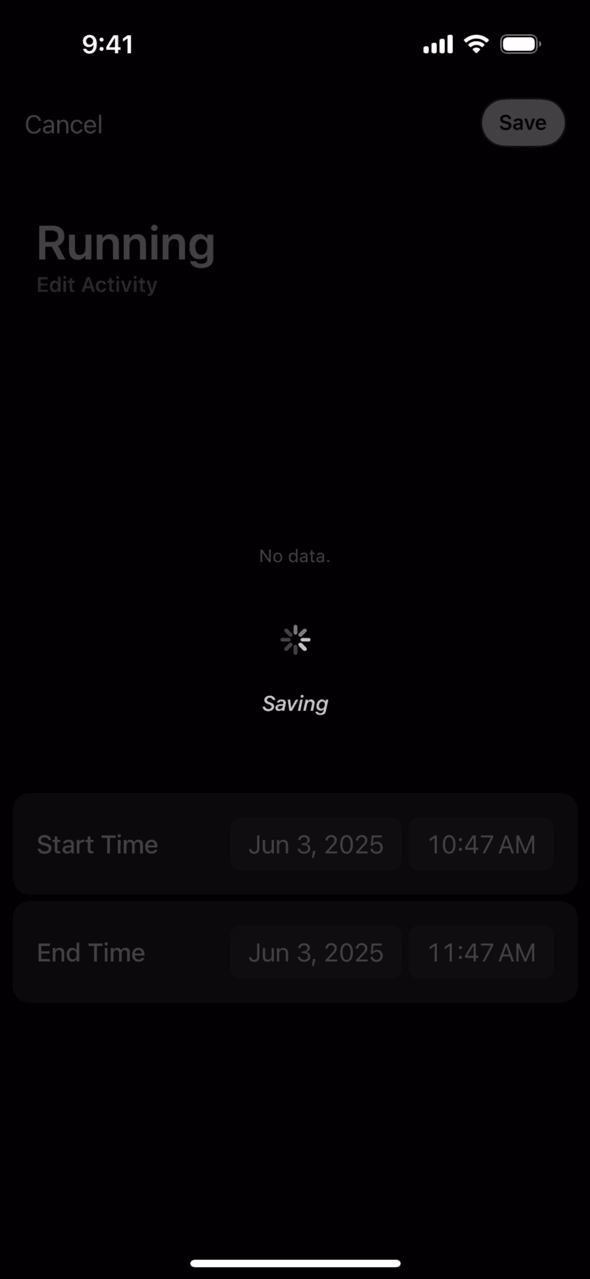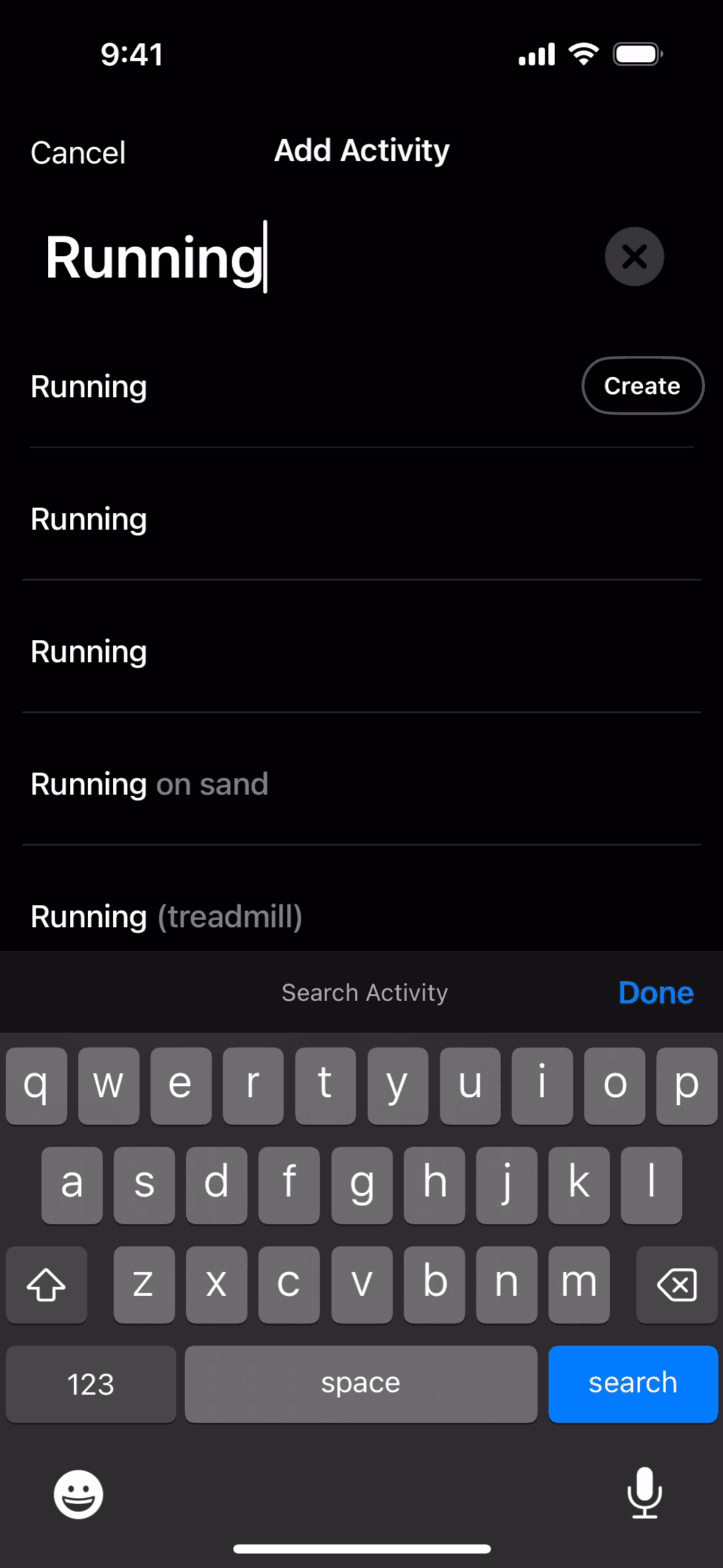 The user logs a running activity by searching, setting the time, and saving. The activity then appears on the home dashboard timeline.