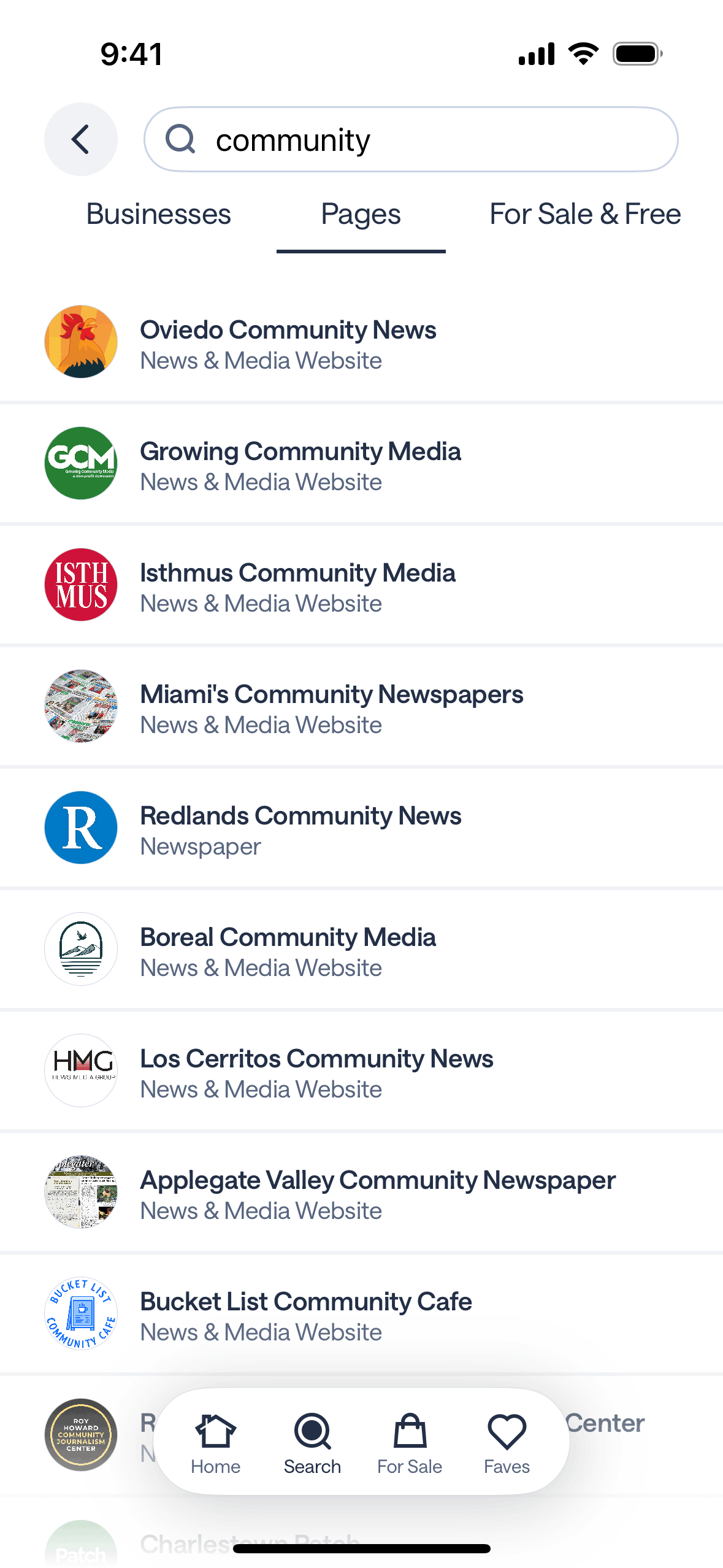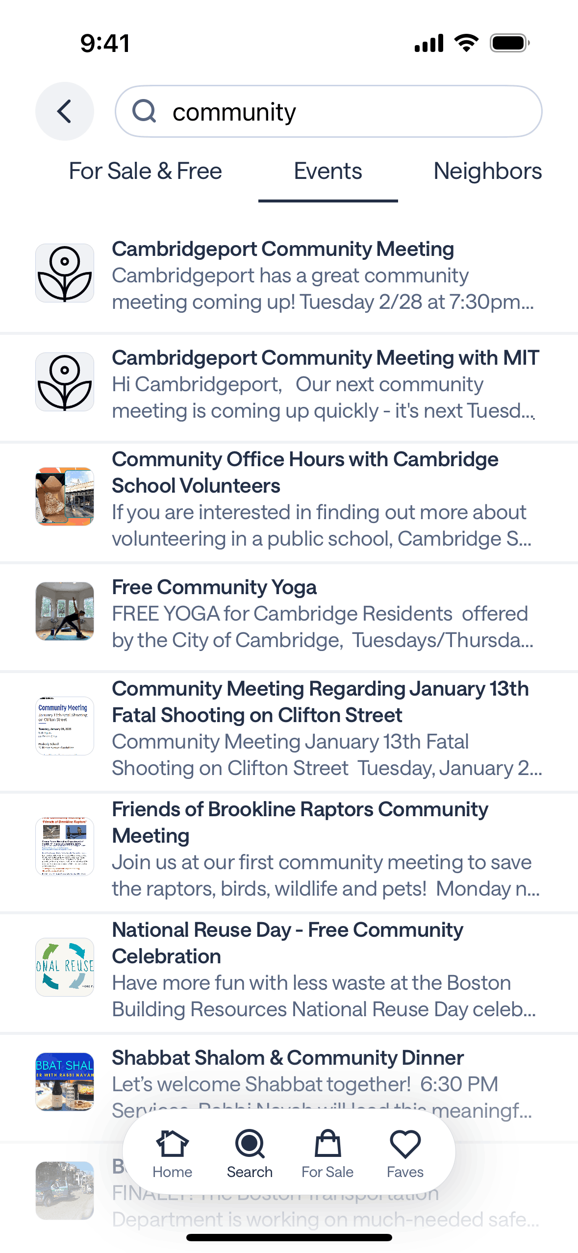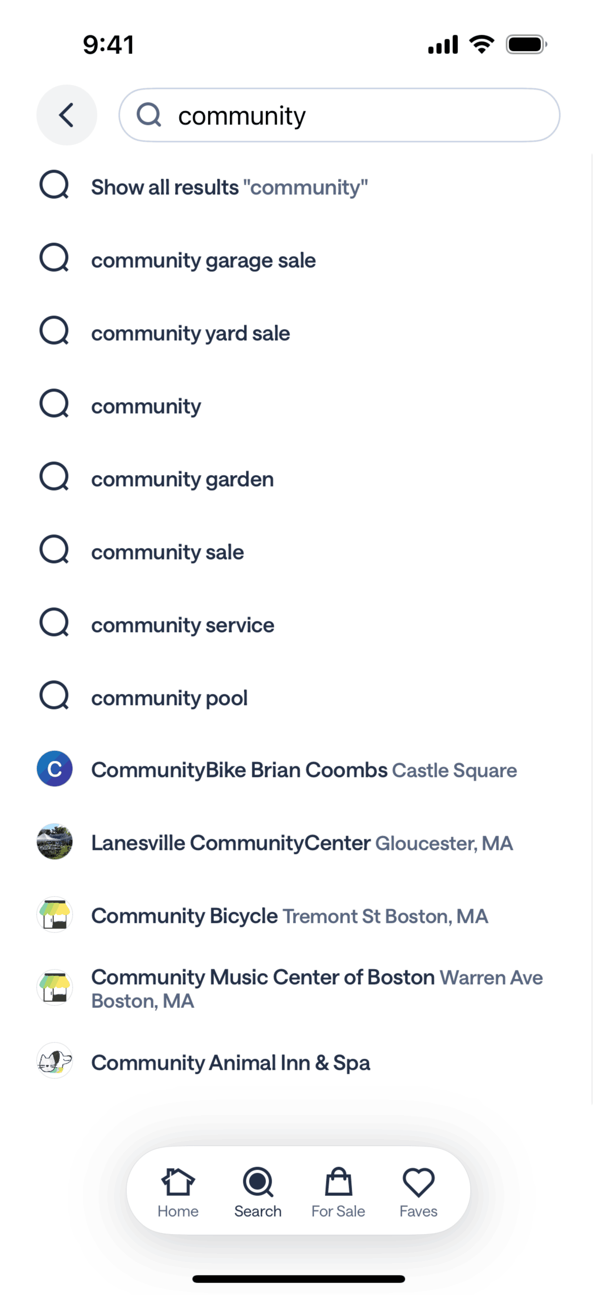 The user searches for "community" and explores the results across different categories. This showcases how a user can find local information.
