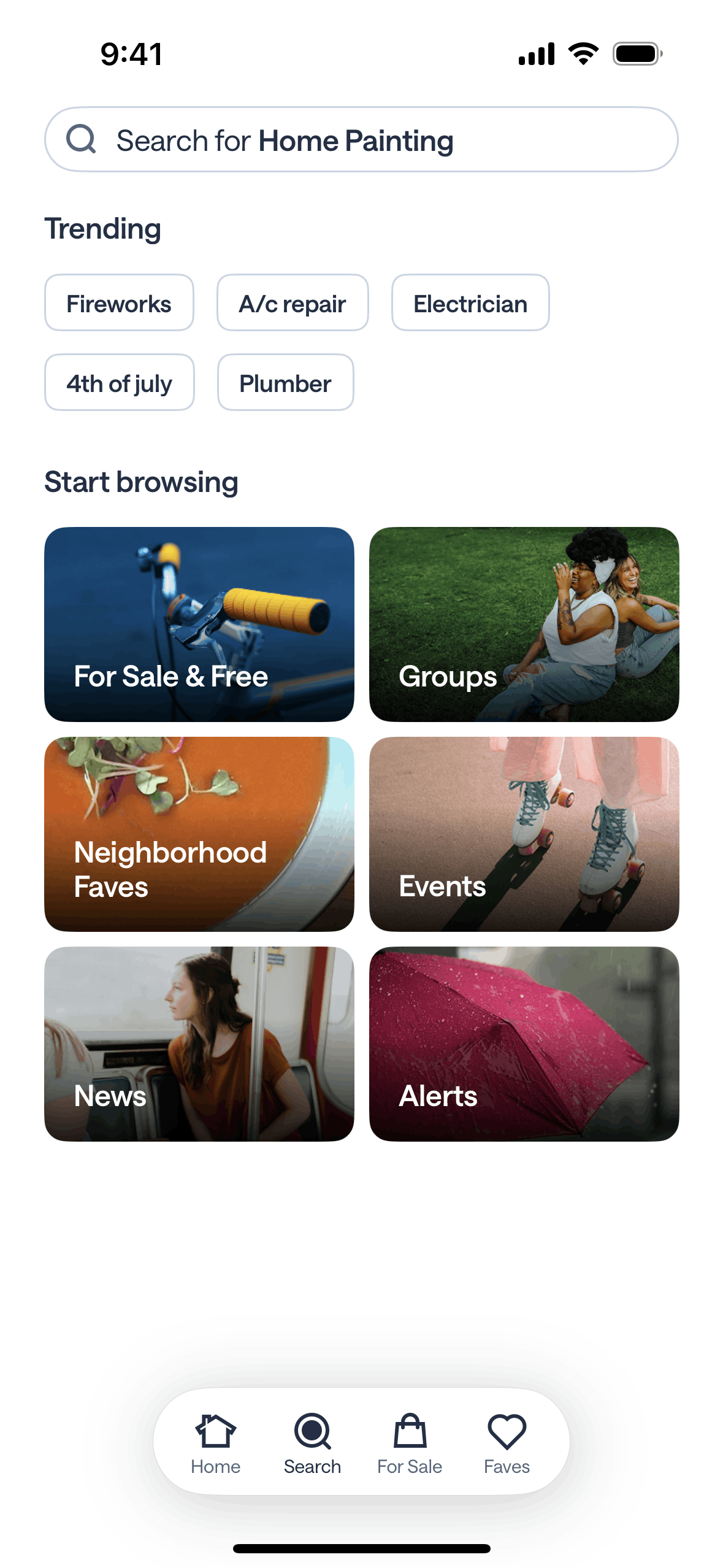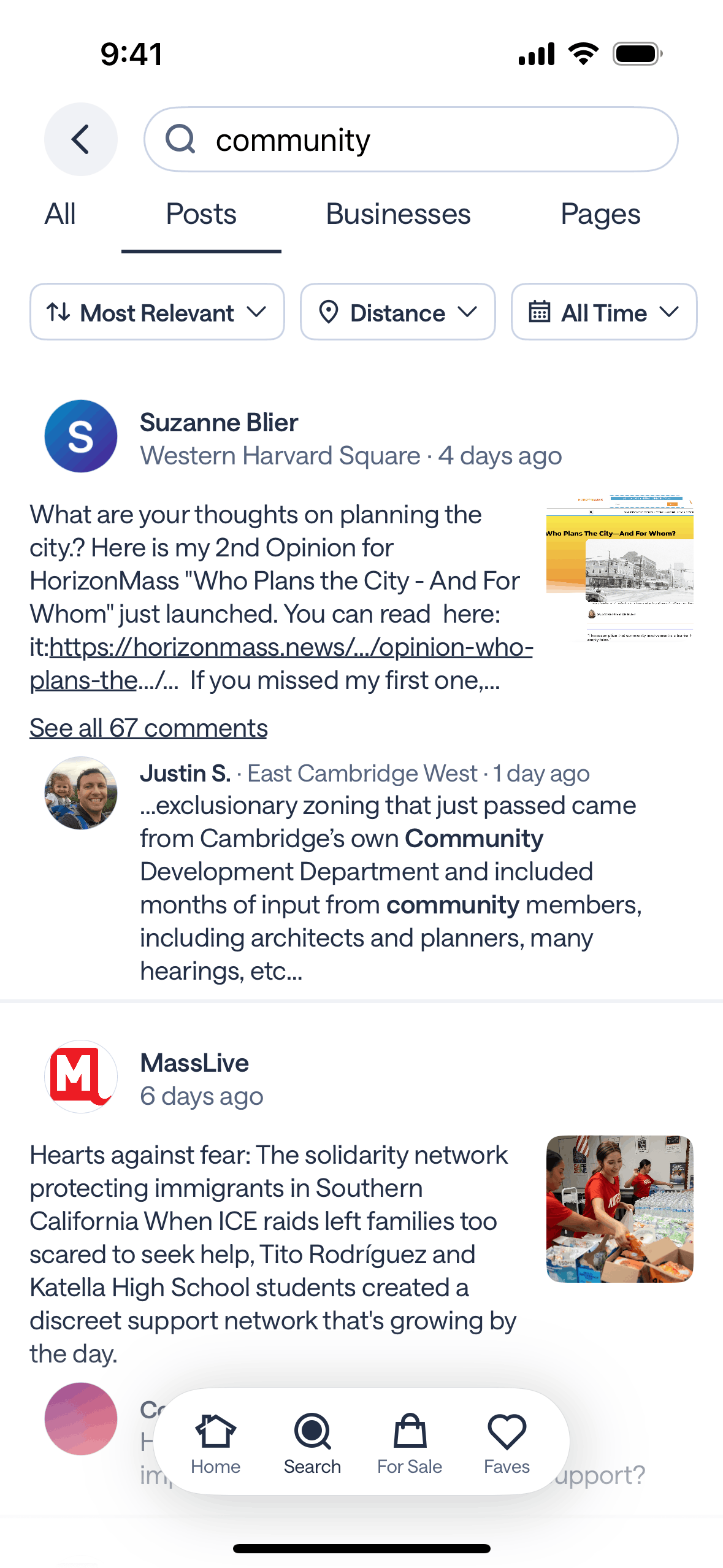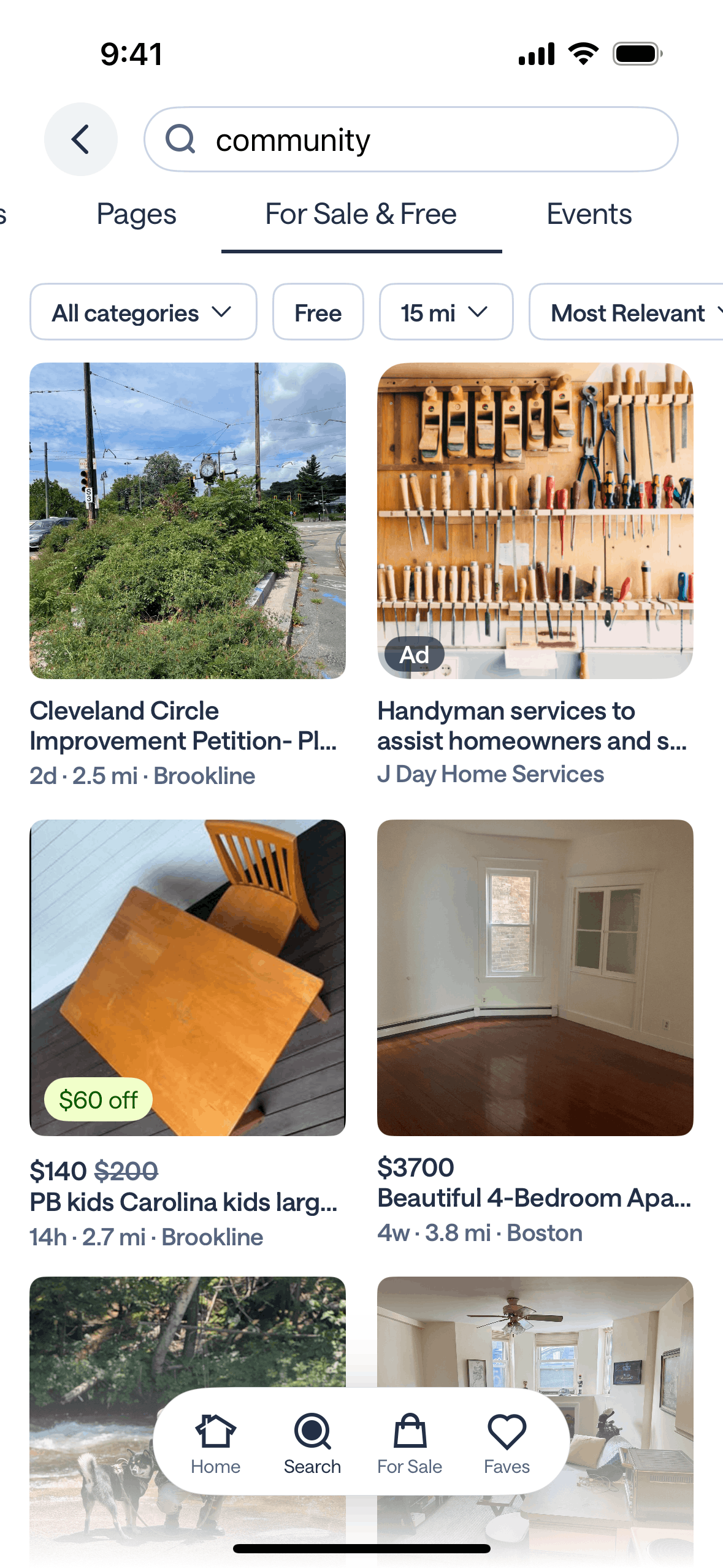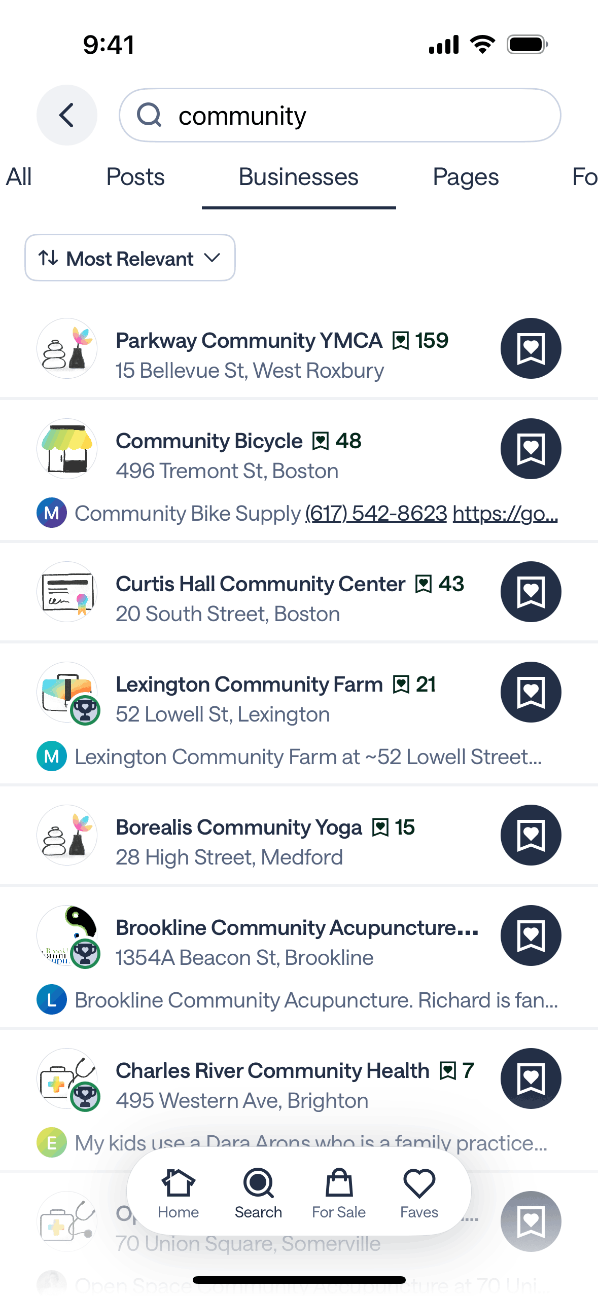 The user searches for "community" and explores the results across different categories. This showcases how a user can find local information.