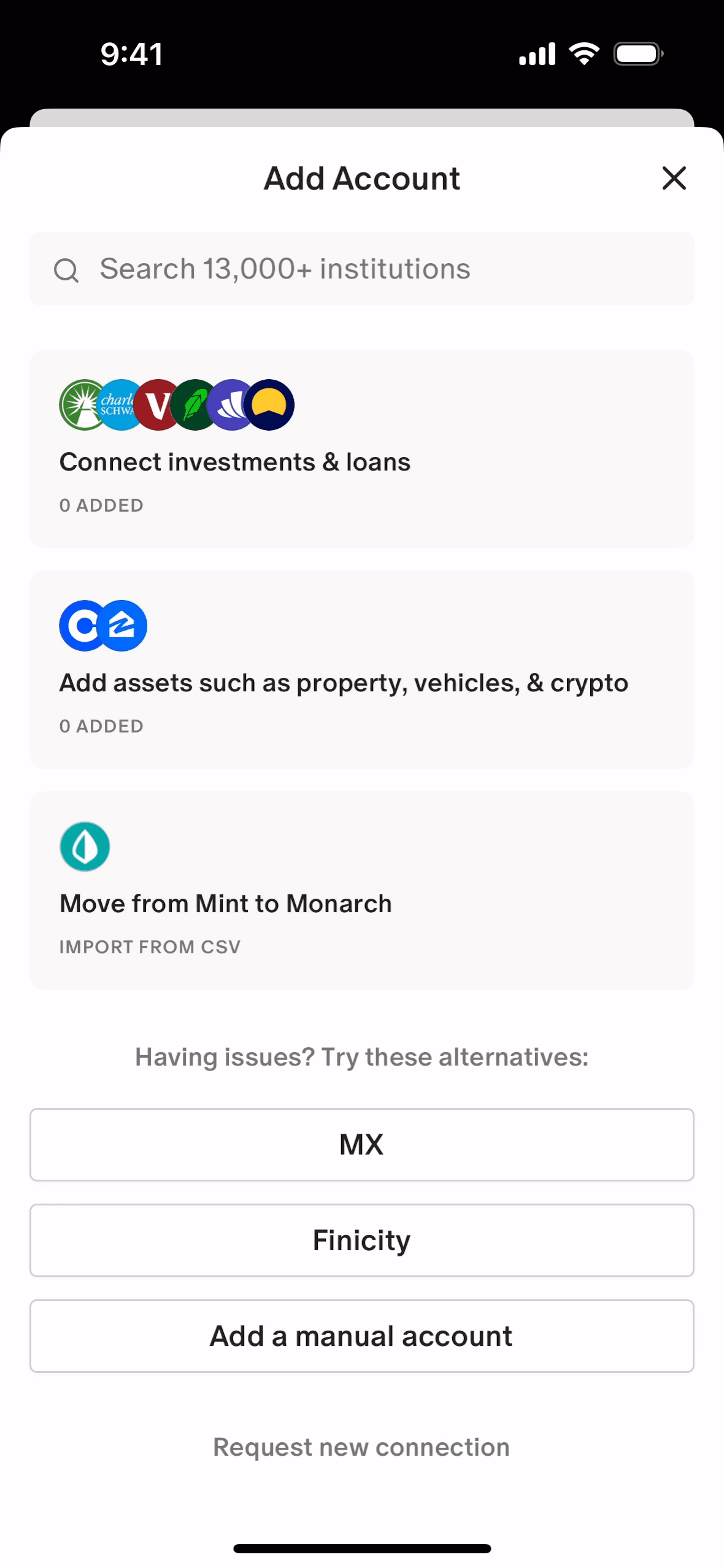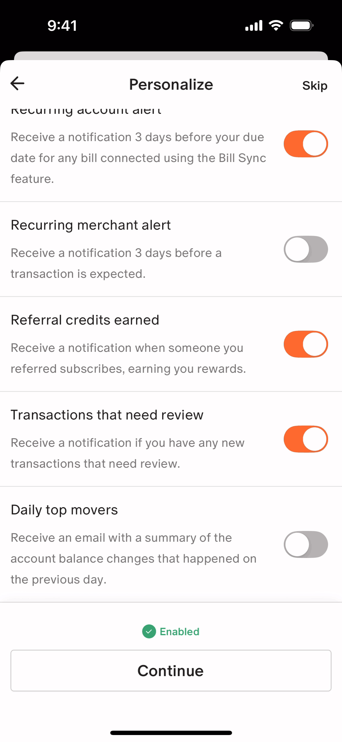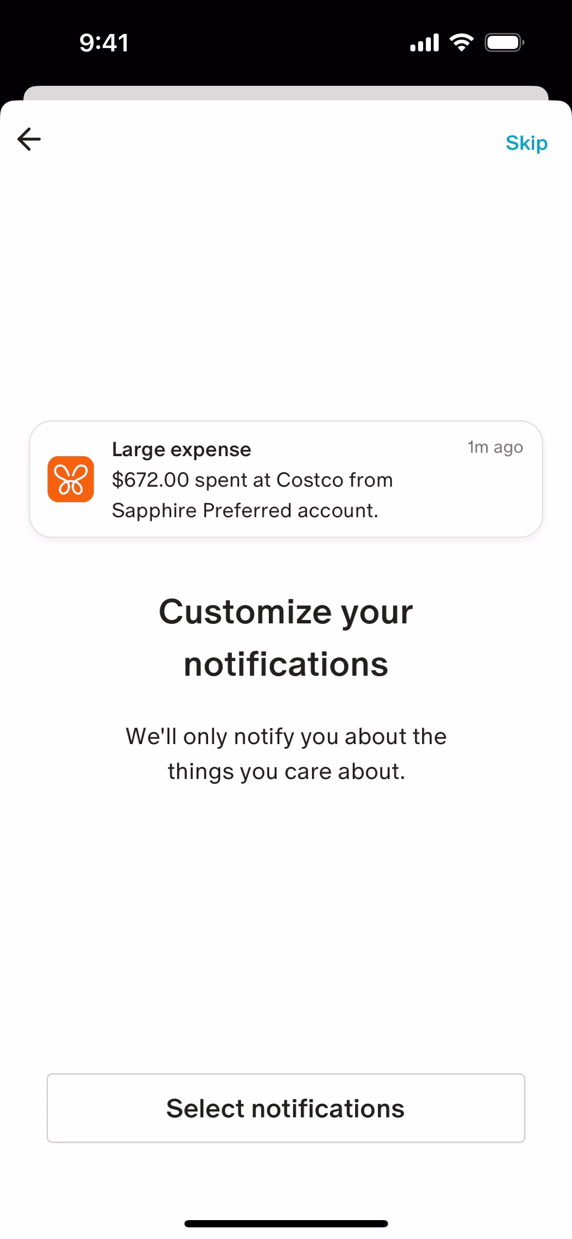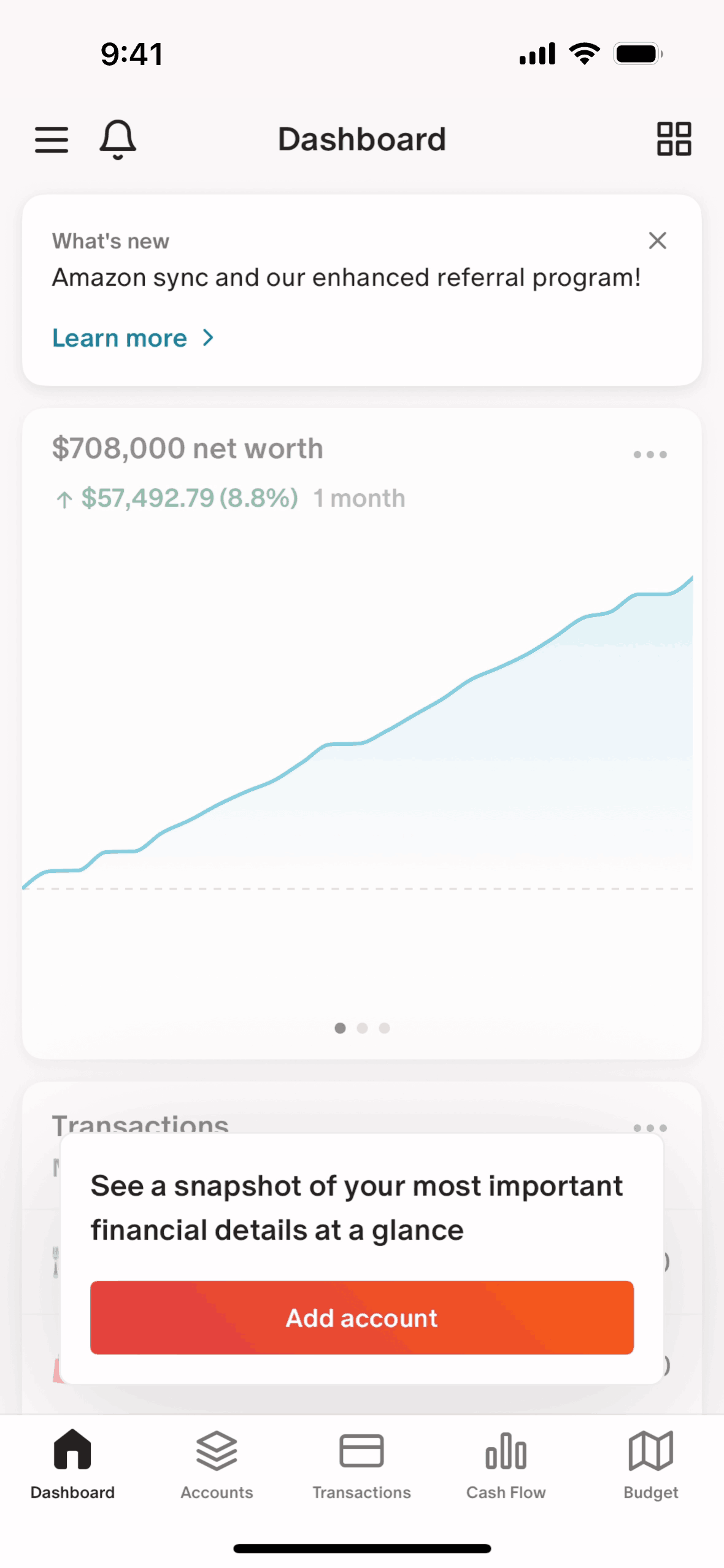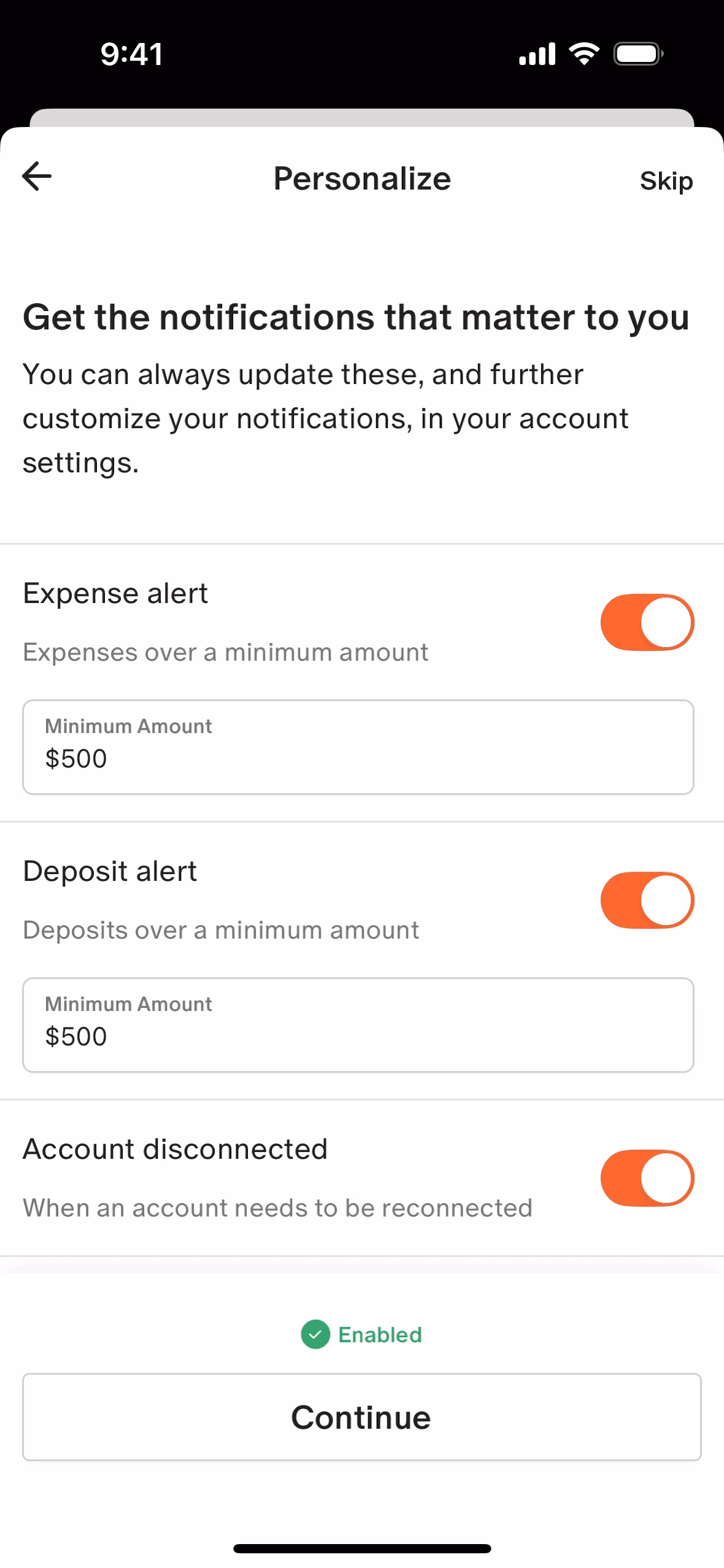 The user connects their bank account, configures notifications, and views the updated account on the dashboard. The flow guides the user through the account connection process.