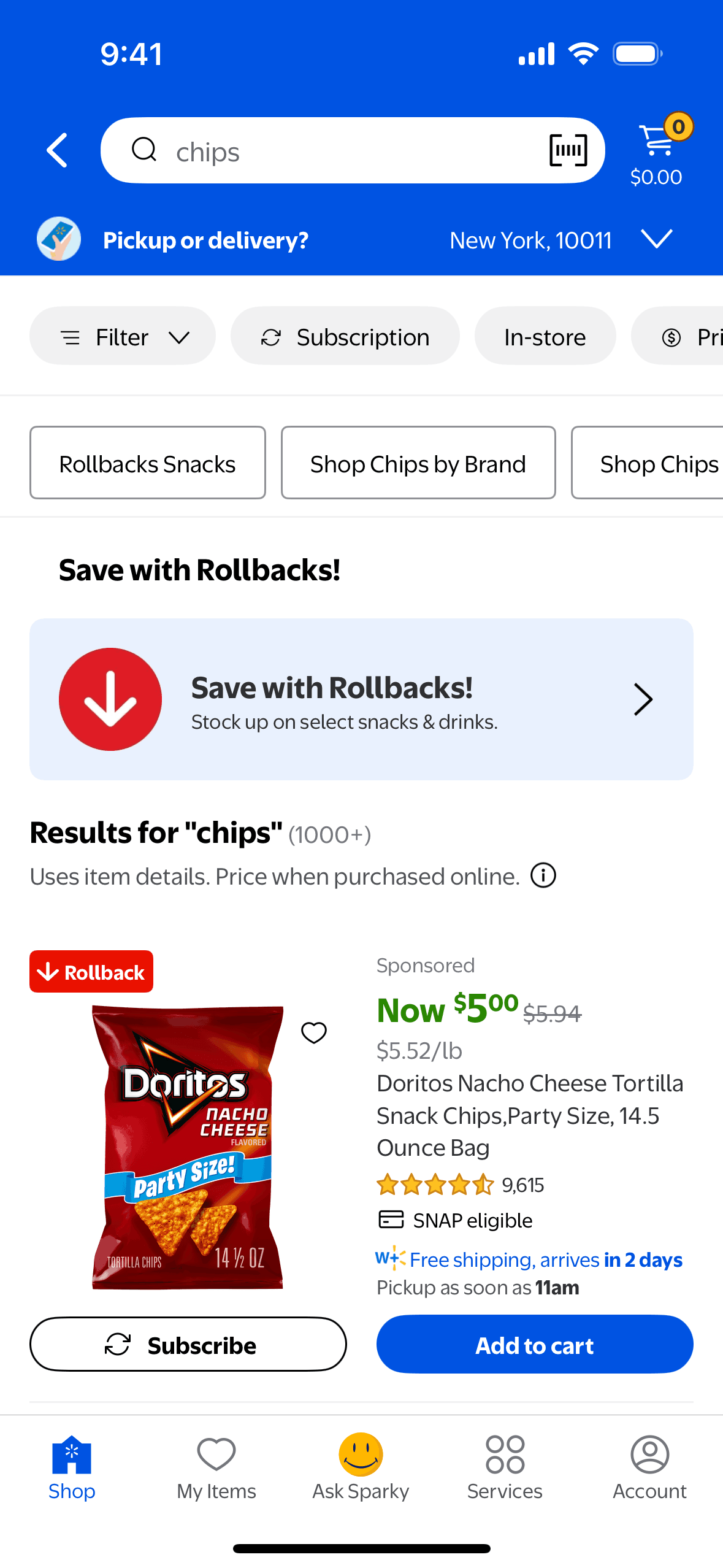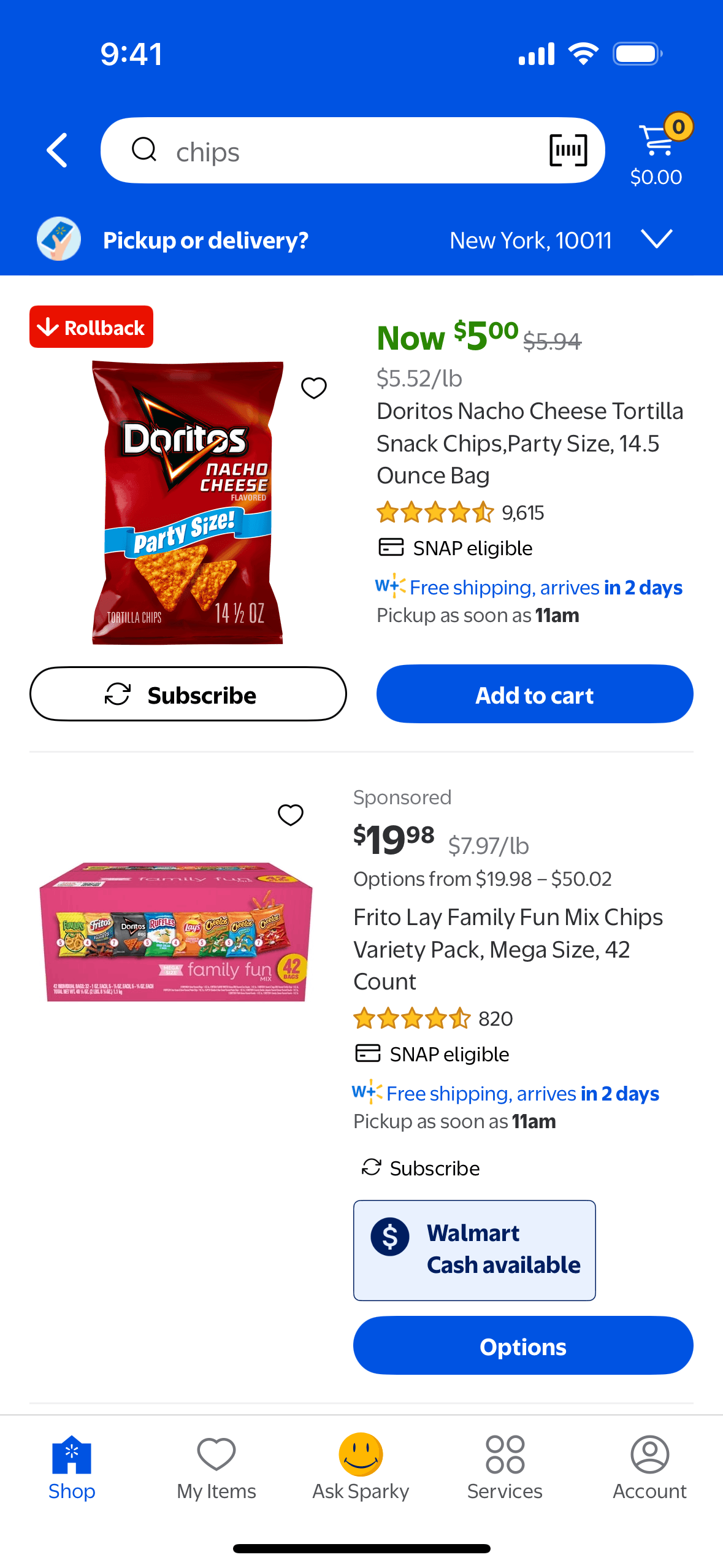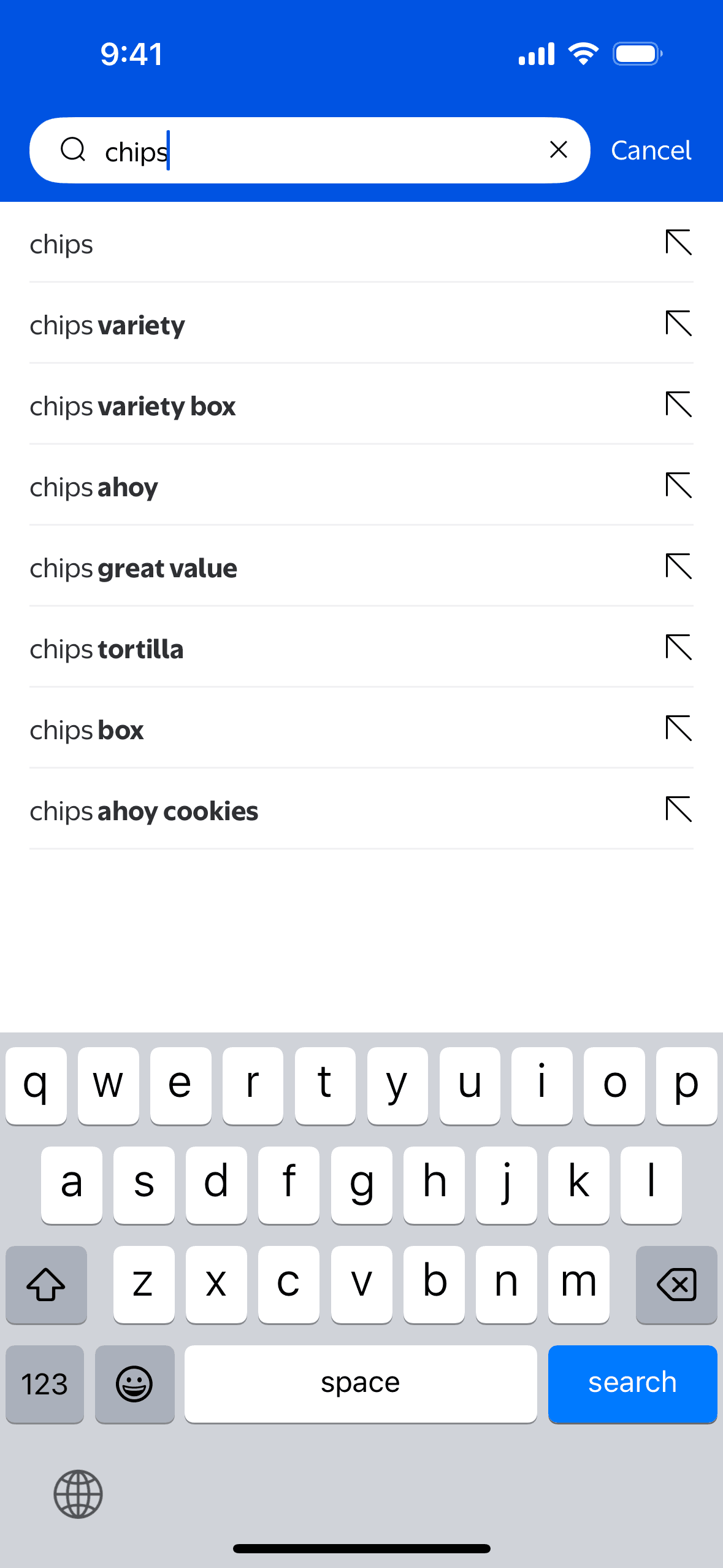 The user searches for "chips" on the Walmart app. The app displays search suggestions and then the search results, with the user scrolling to view more options.