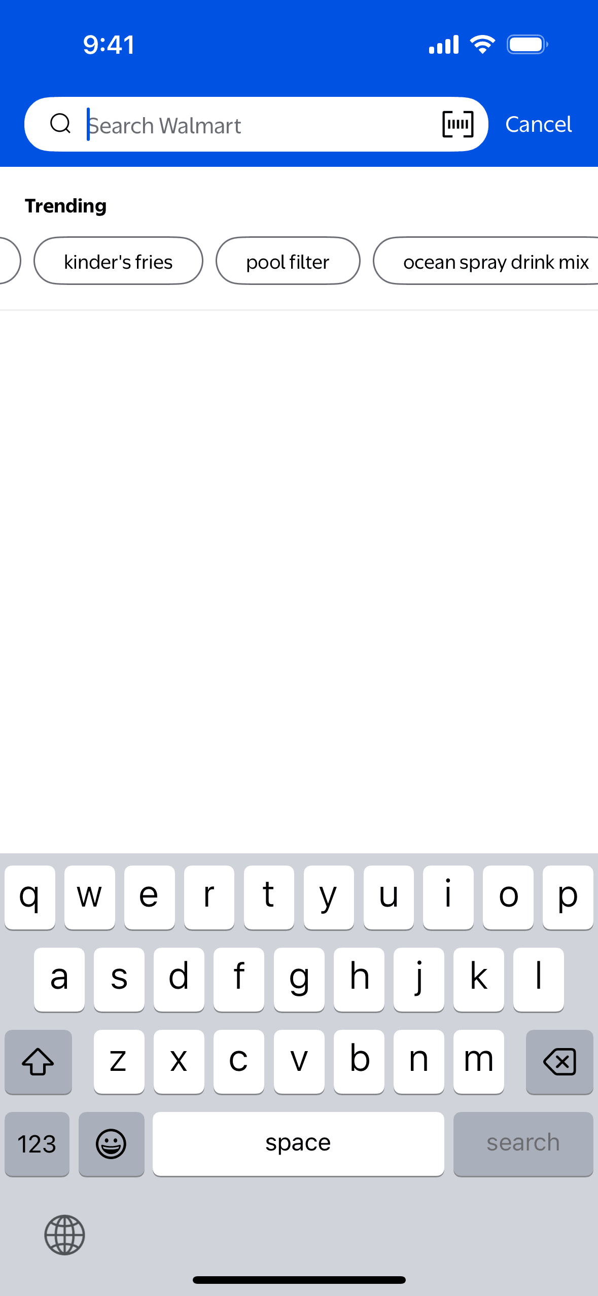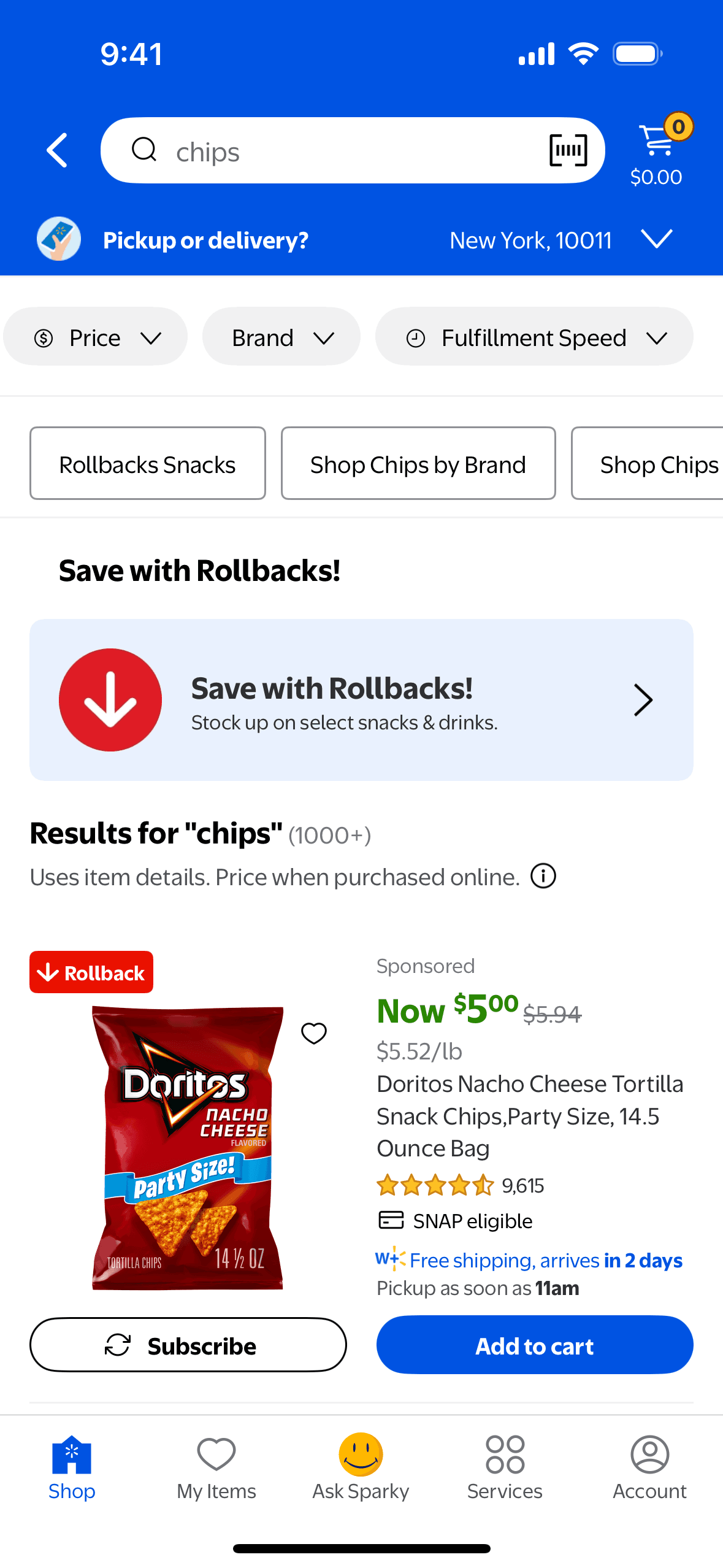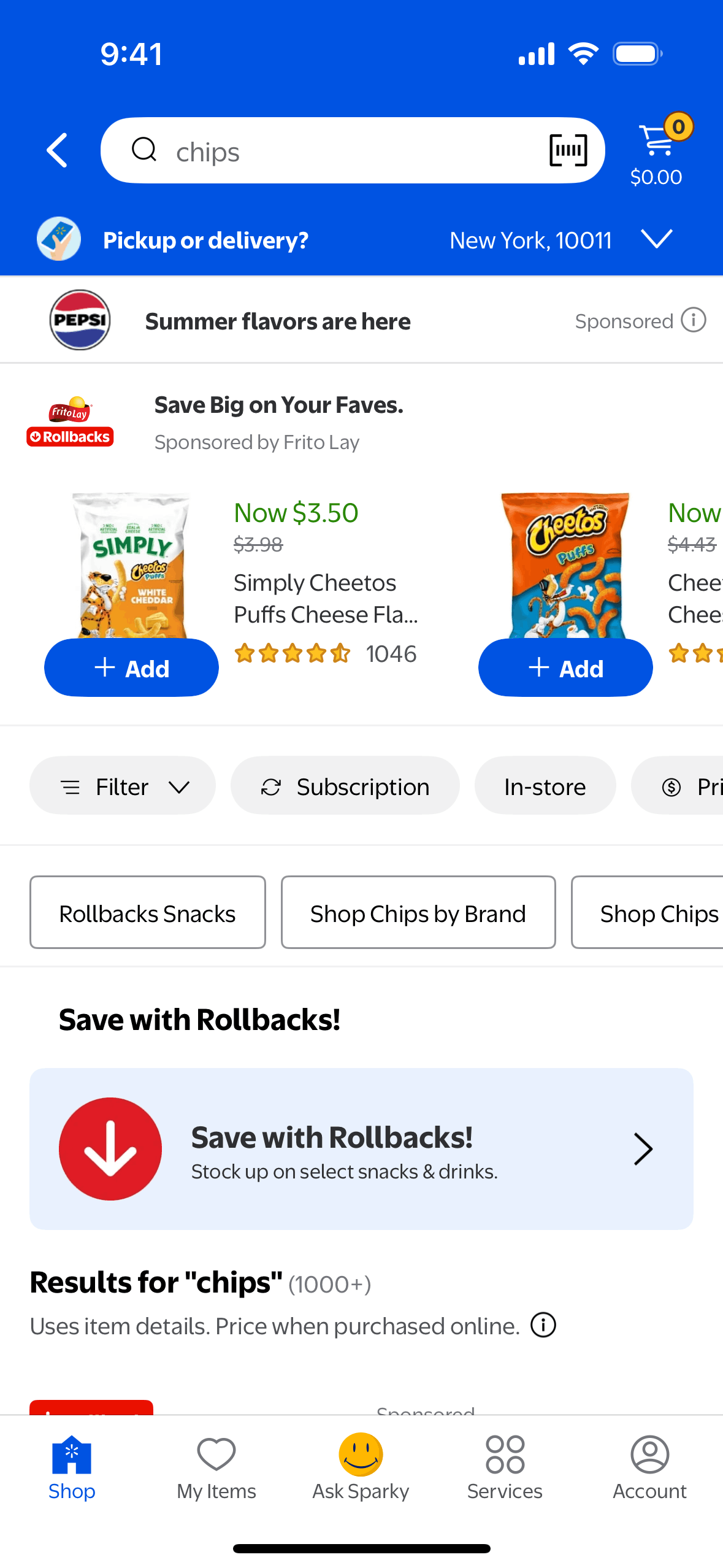 The user searches for "chips" on the Walmart app. The app displays search suggestions and then the search results, with the user scrolling to view more options.