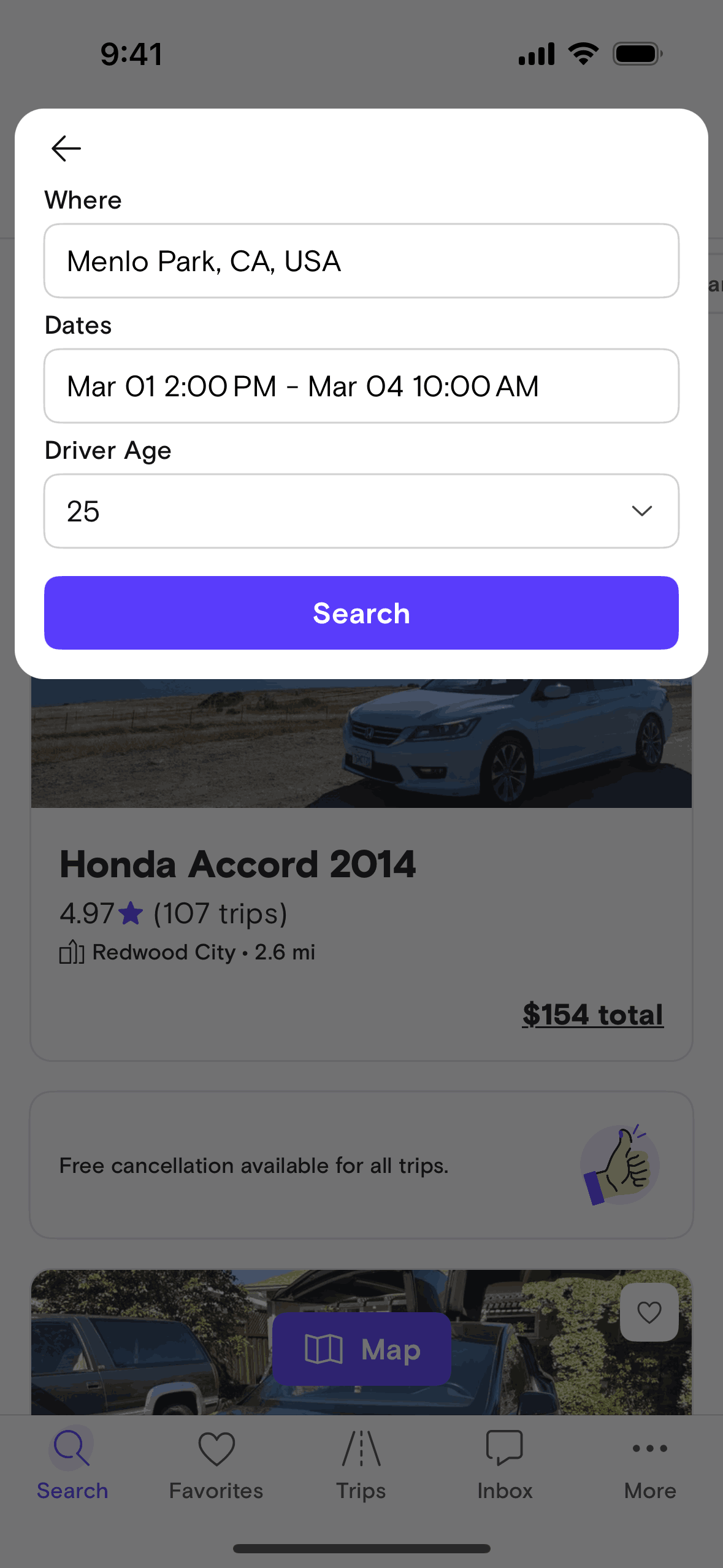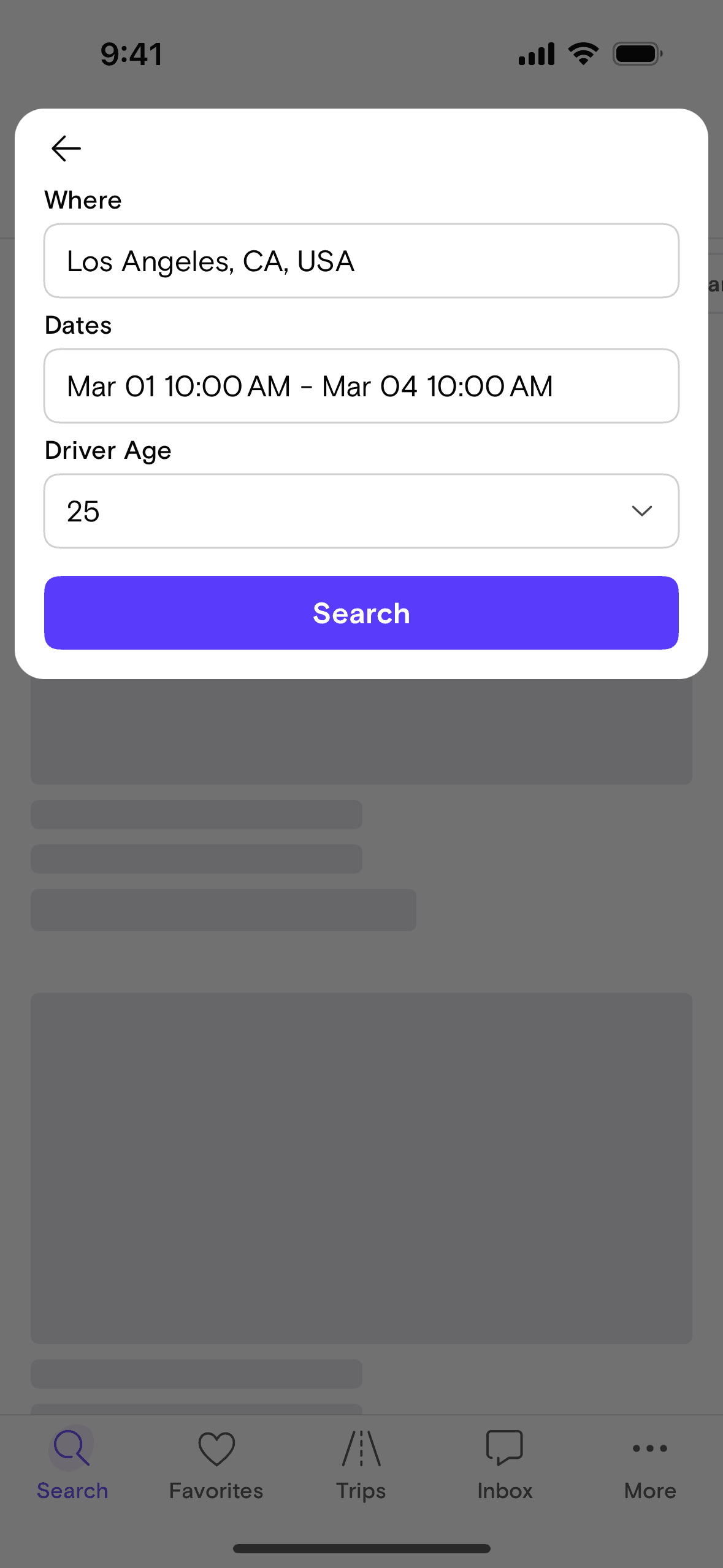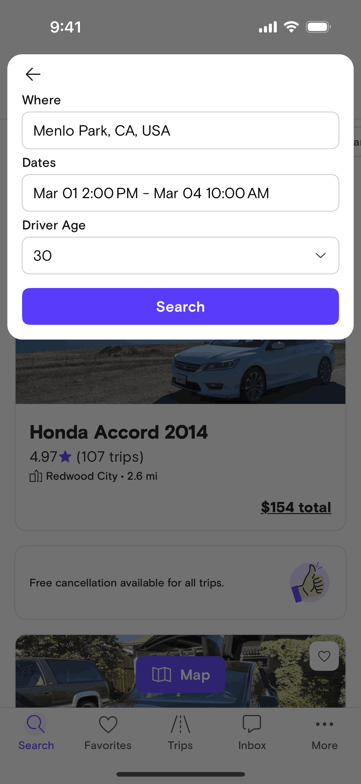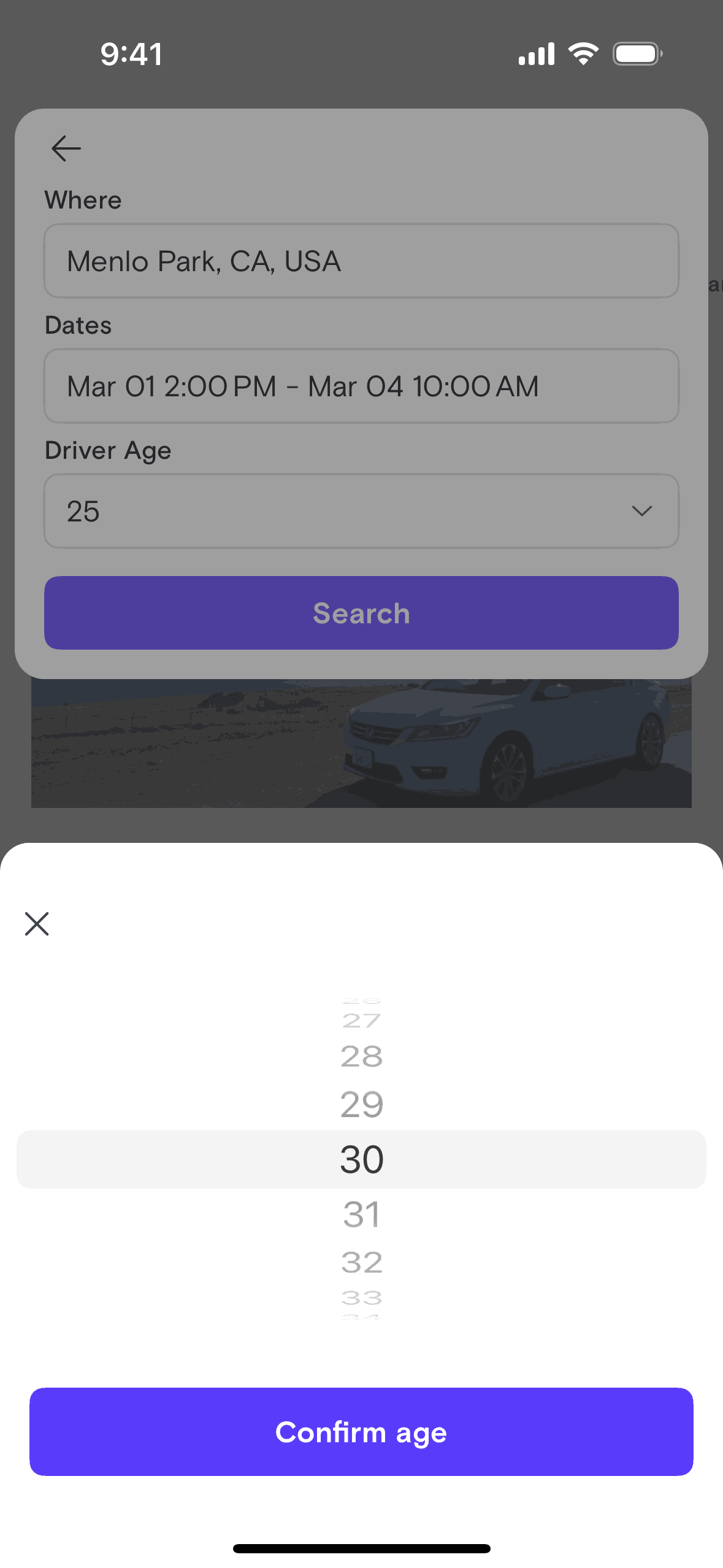 The user searches for a car by specifying a location, dates, and driver age. The app then displays a list of cars available based on the search criteria.