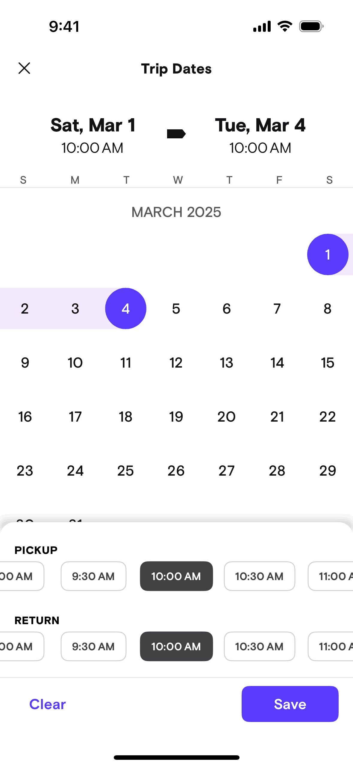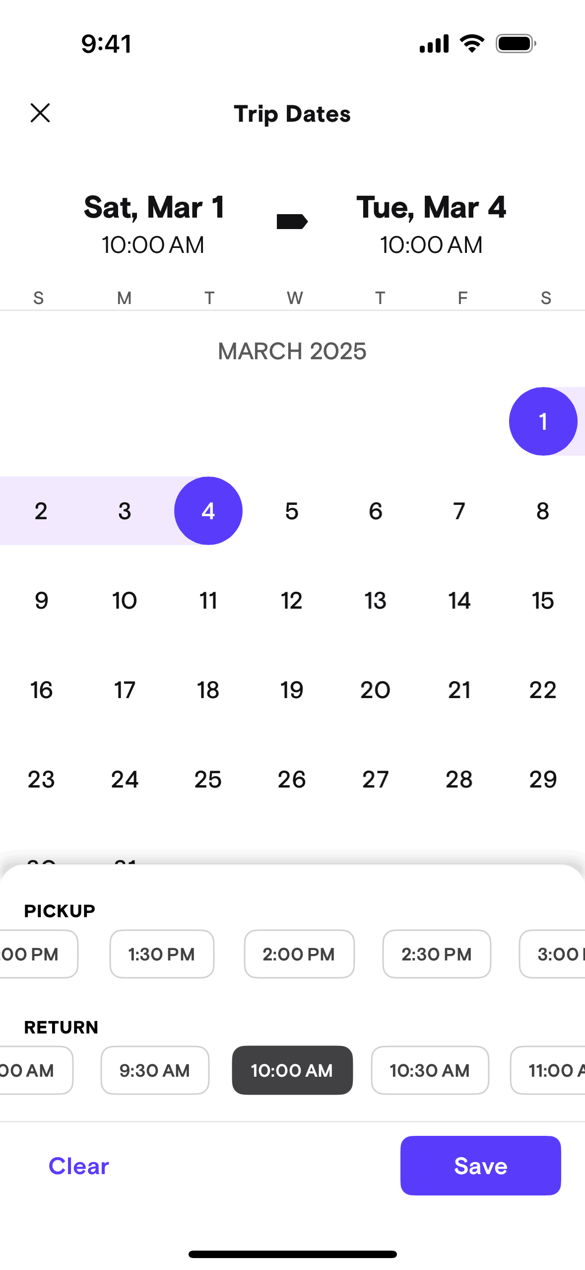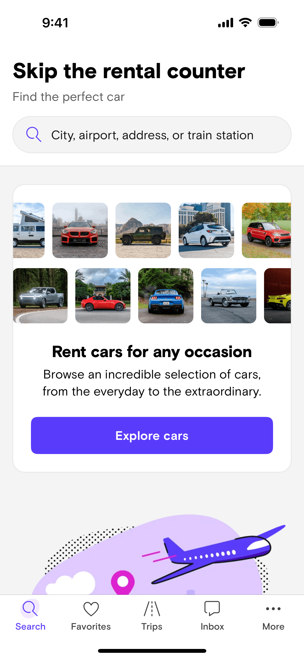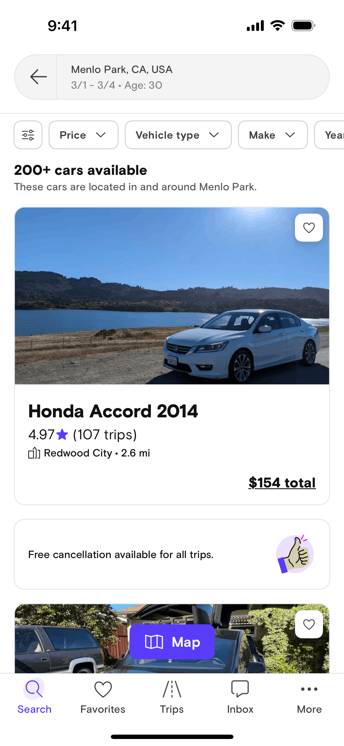 The user searches for a car by specifying a location, dates, and driver age. The app then displays a list of cars available based on the search criteria.