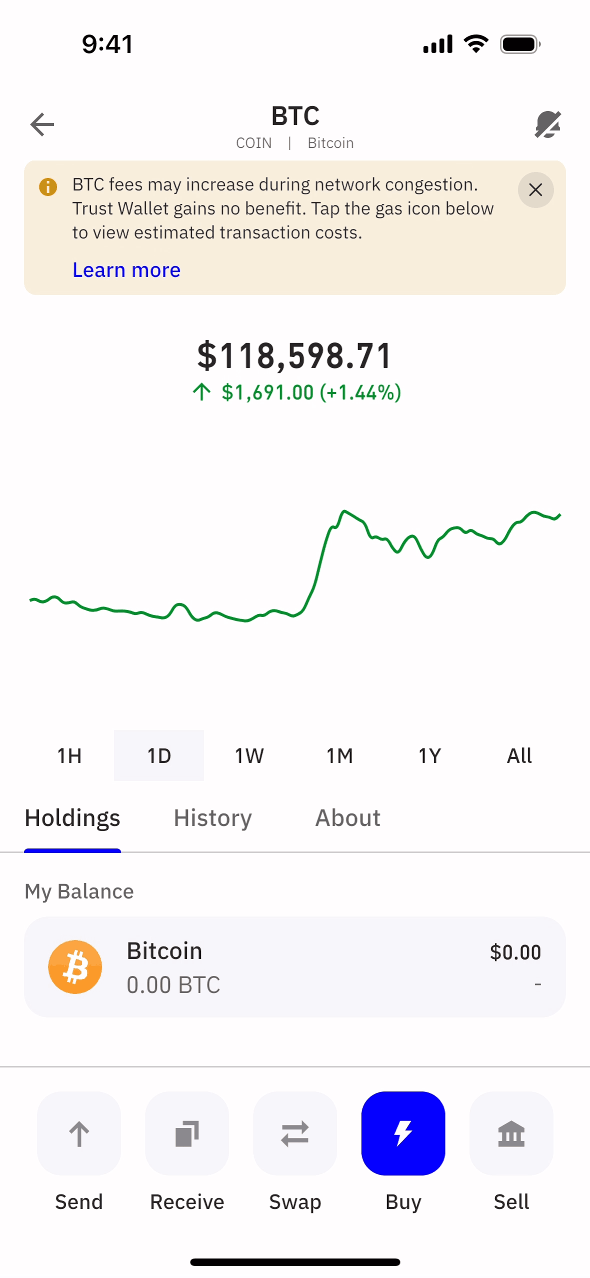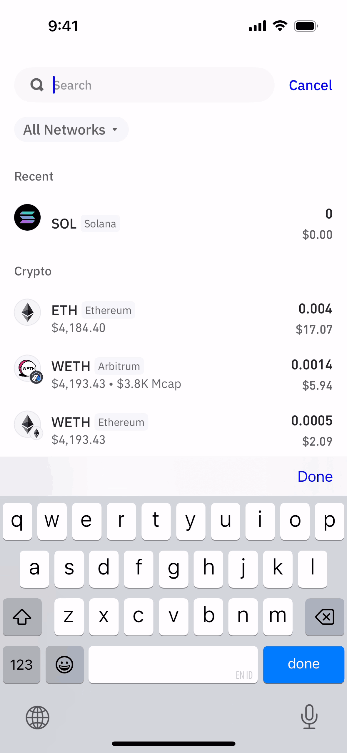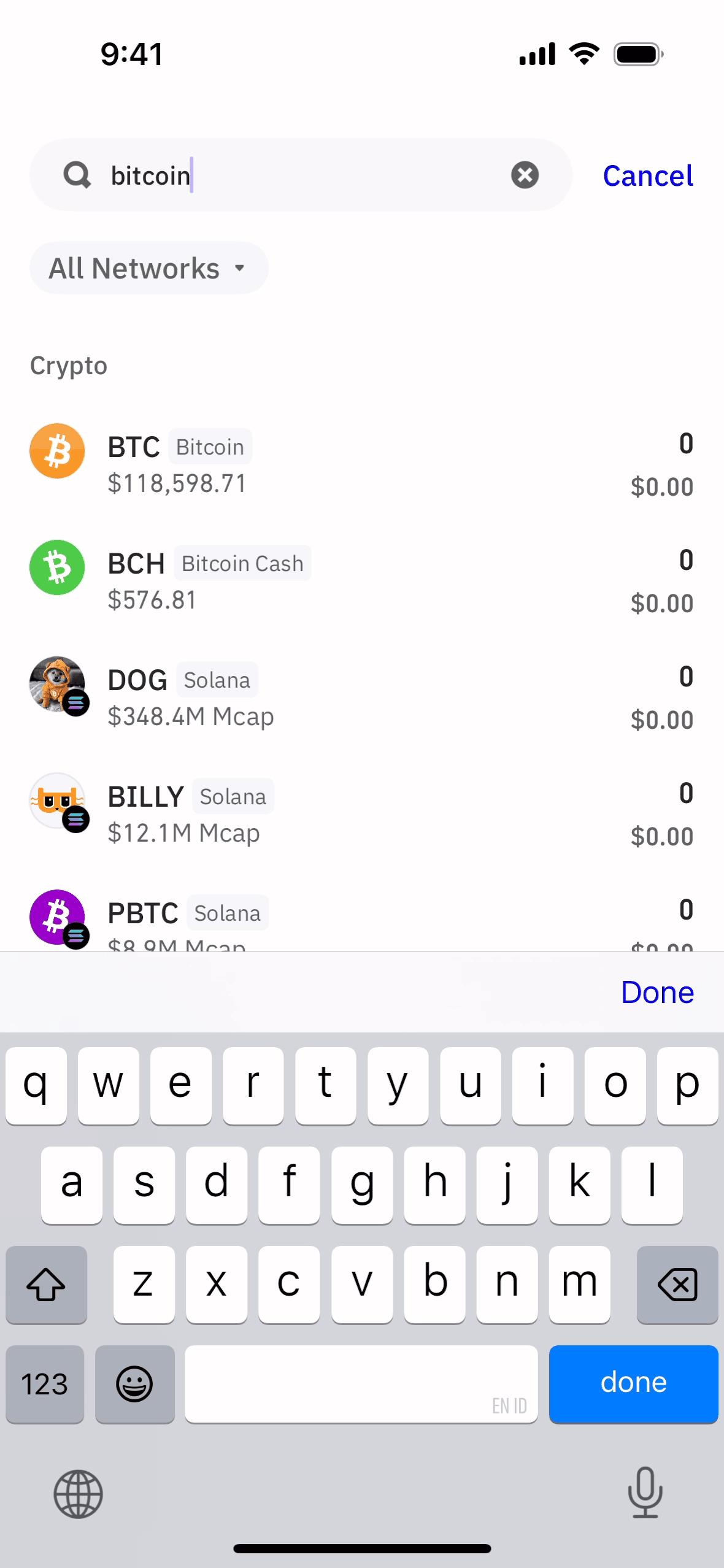 The user searches for Bitcoin in their wallet. They navigate from the wallet overview to the Bitcoin details screen.