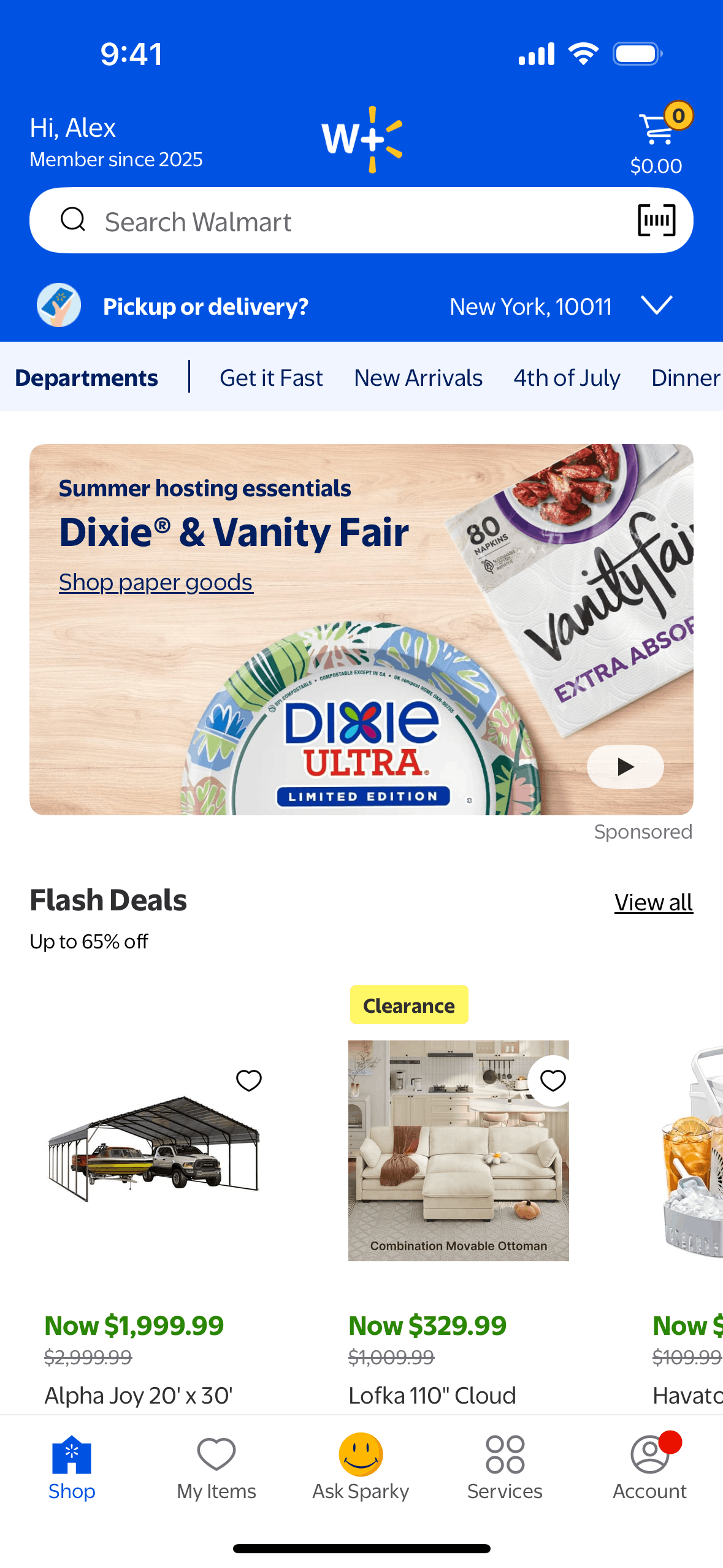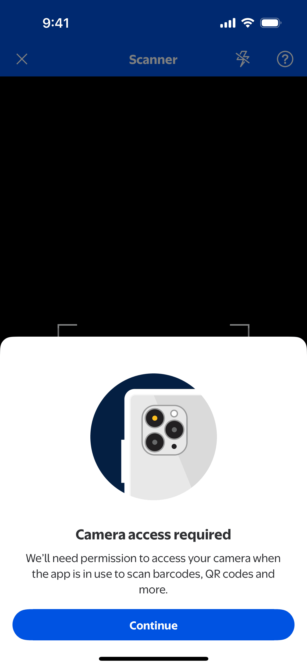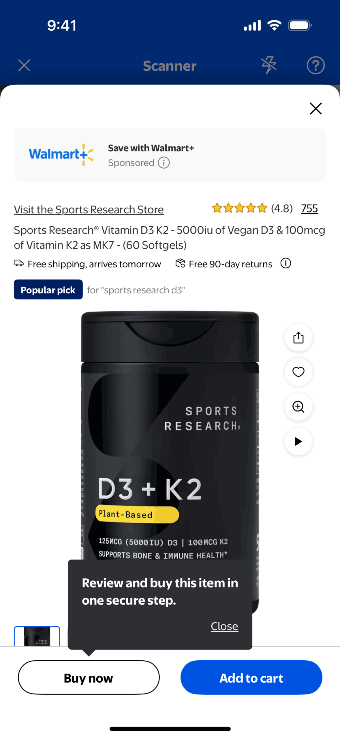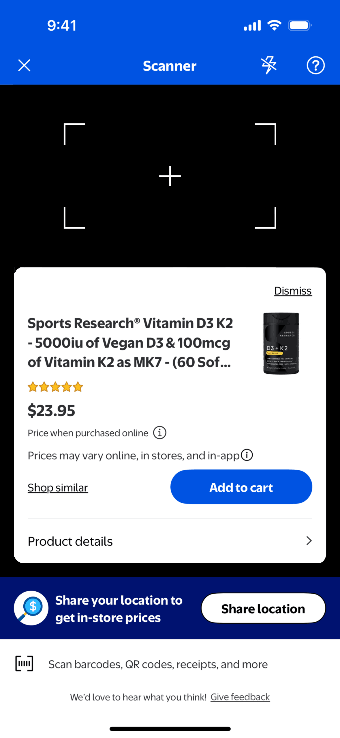 The user scans a product using the Walmart app's scanner feature. The flow leads to the product details page after scanning.