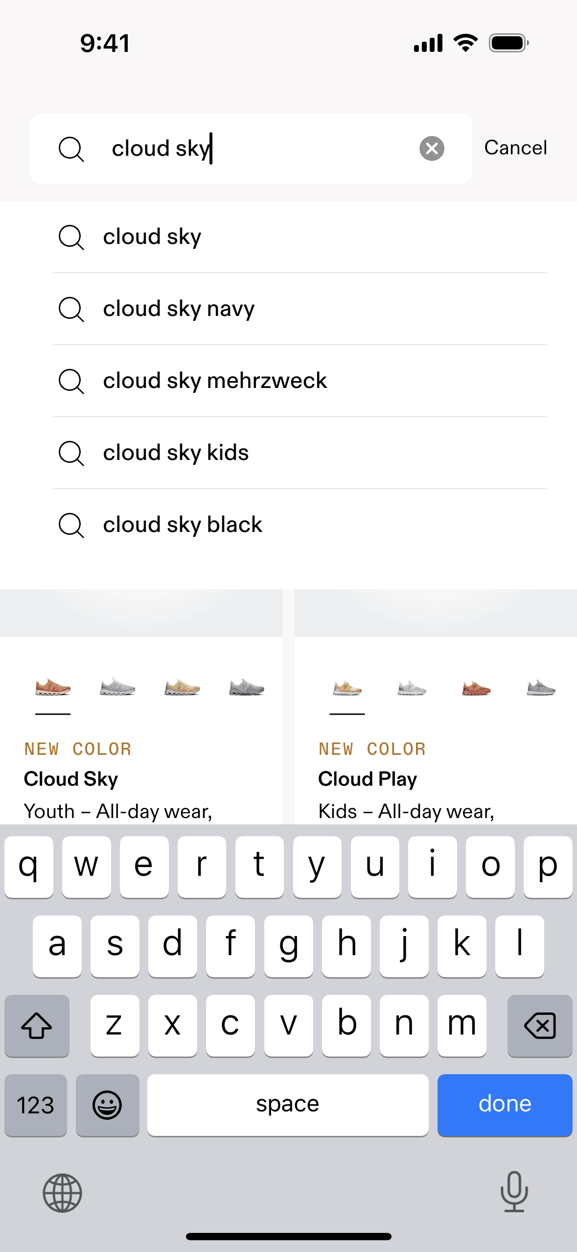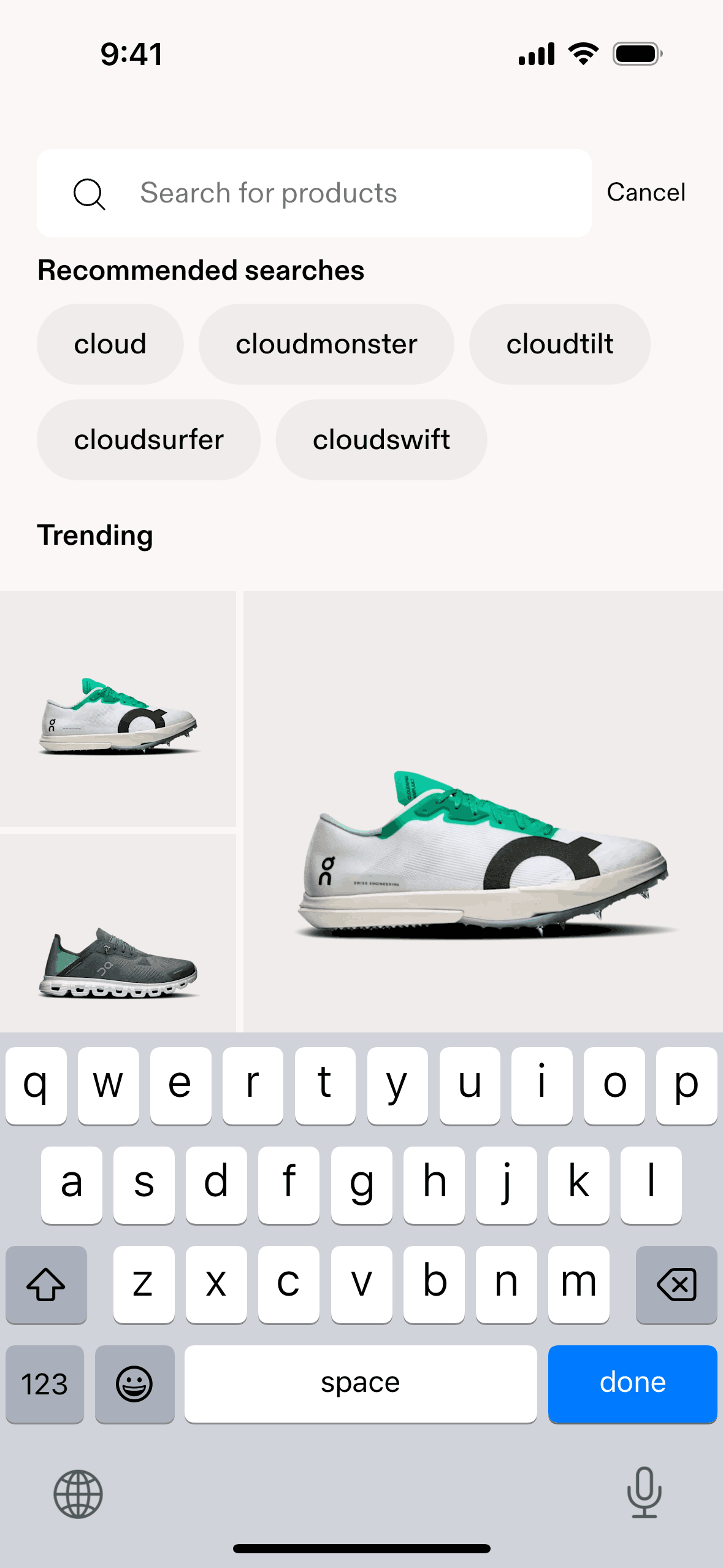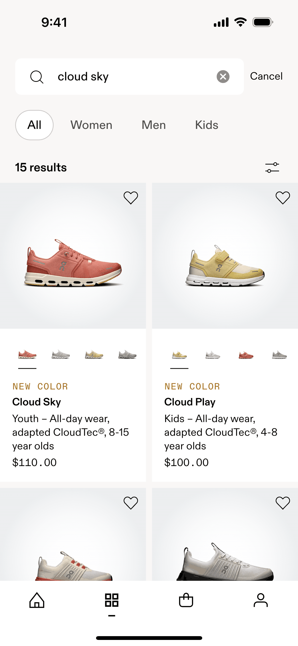 The user searches for a specific product on an e-commerce app. They start from the product listing, then enter a search term and view the corresponding search results.