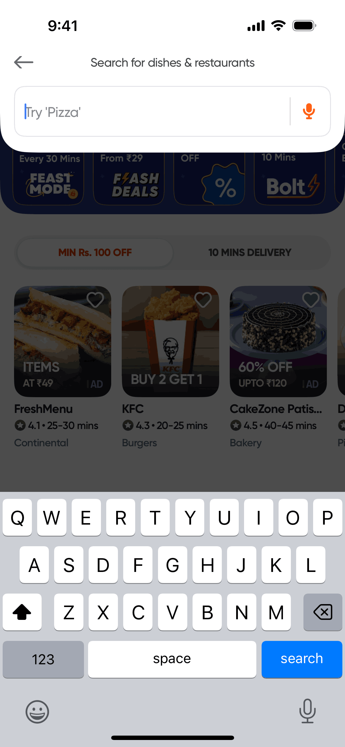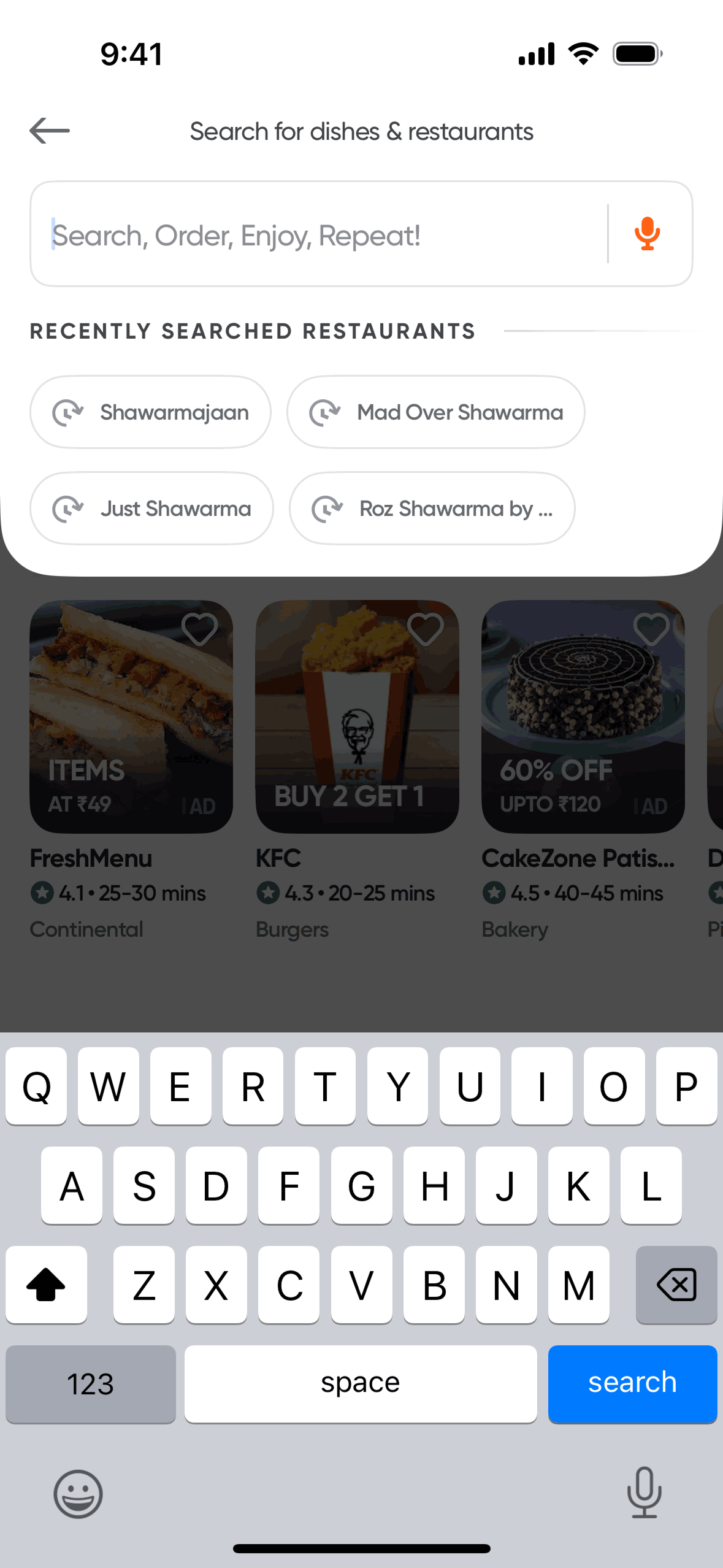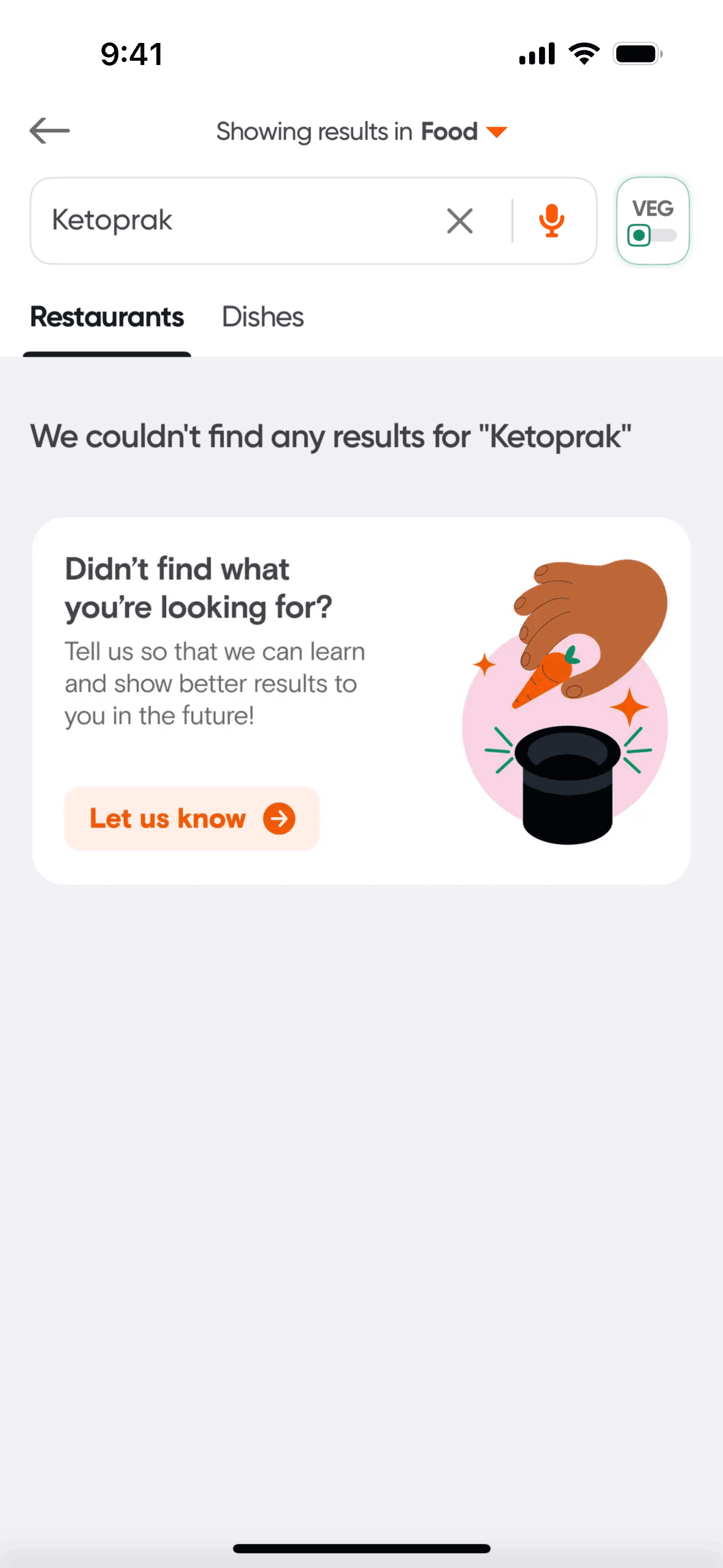 The user searches for dishes and restaurants using the search bar. The flow demonstrates successful and unsuccessful search scenarios.