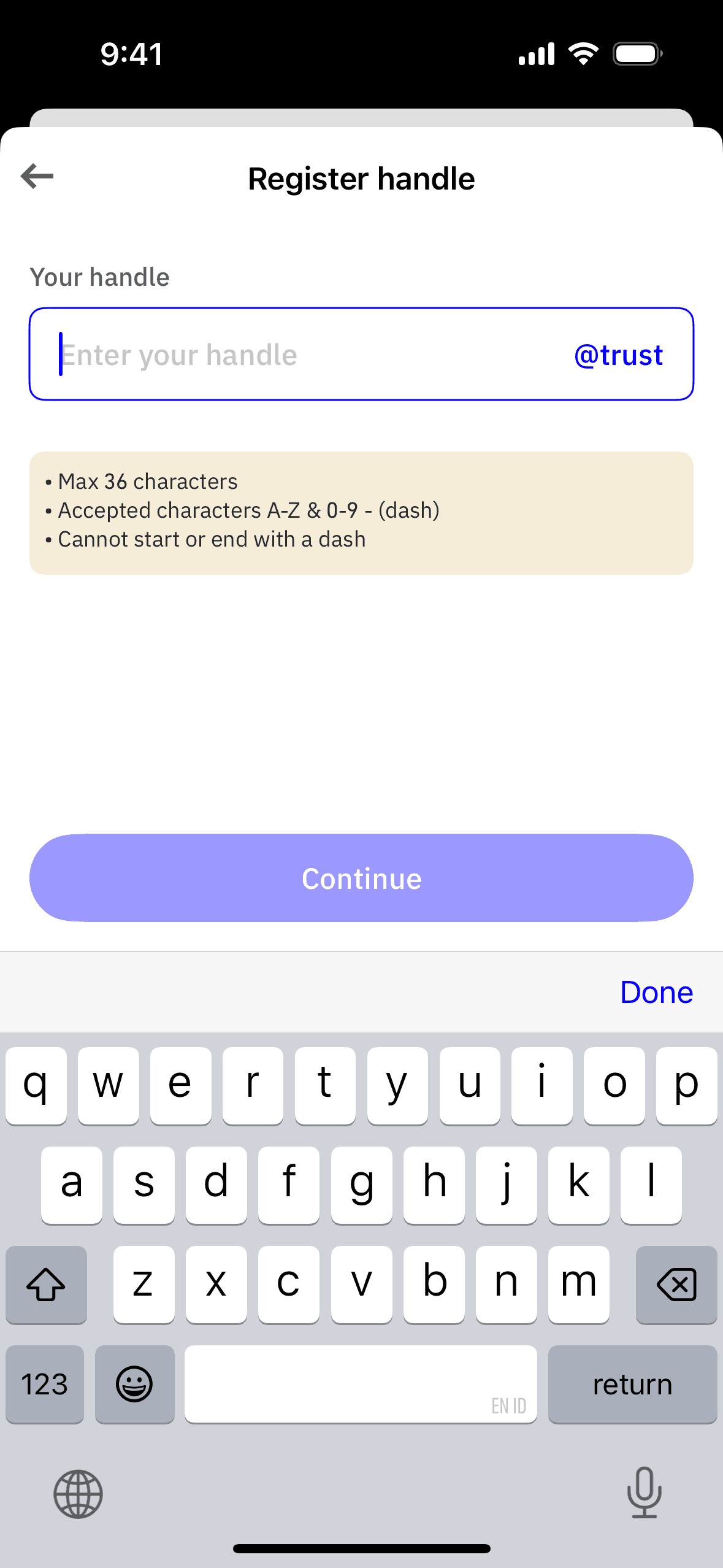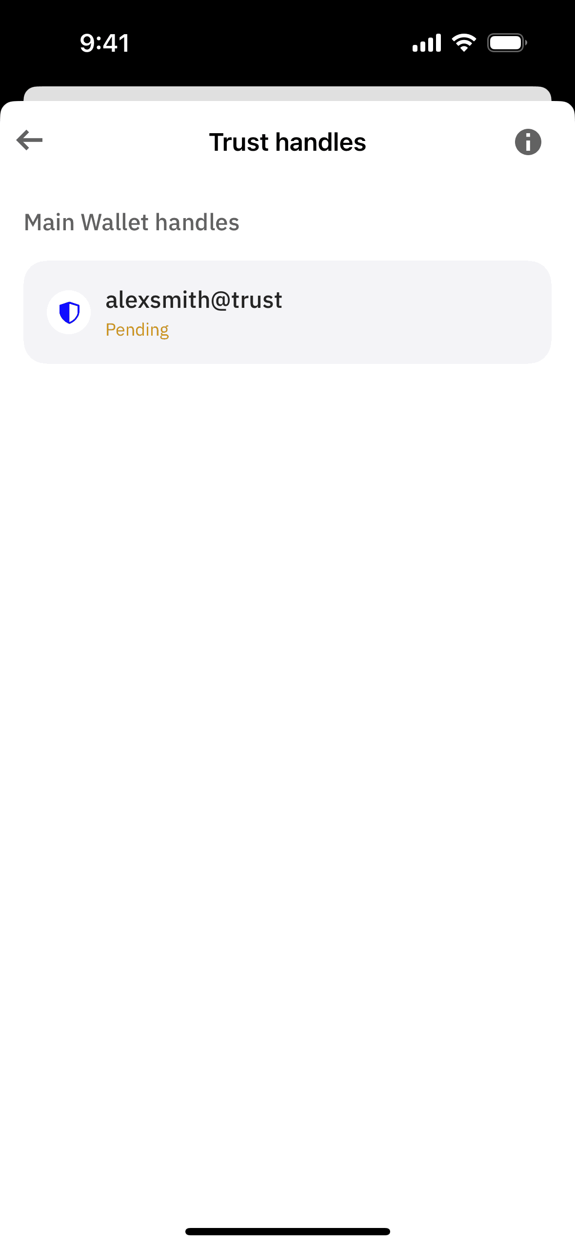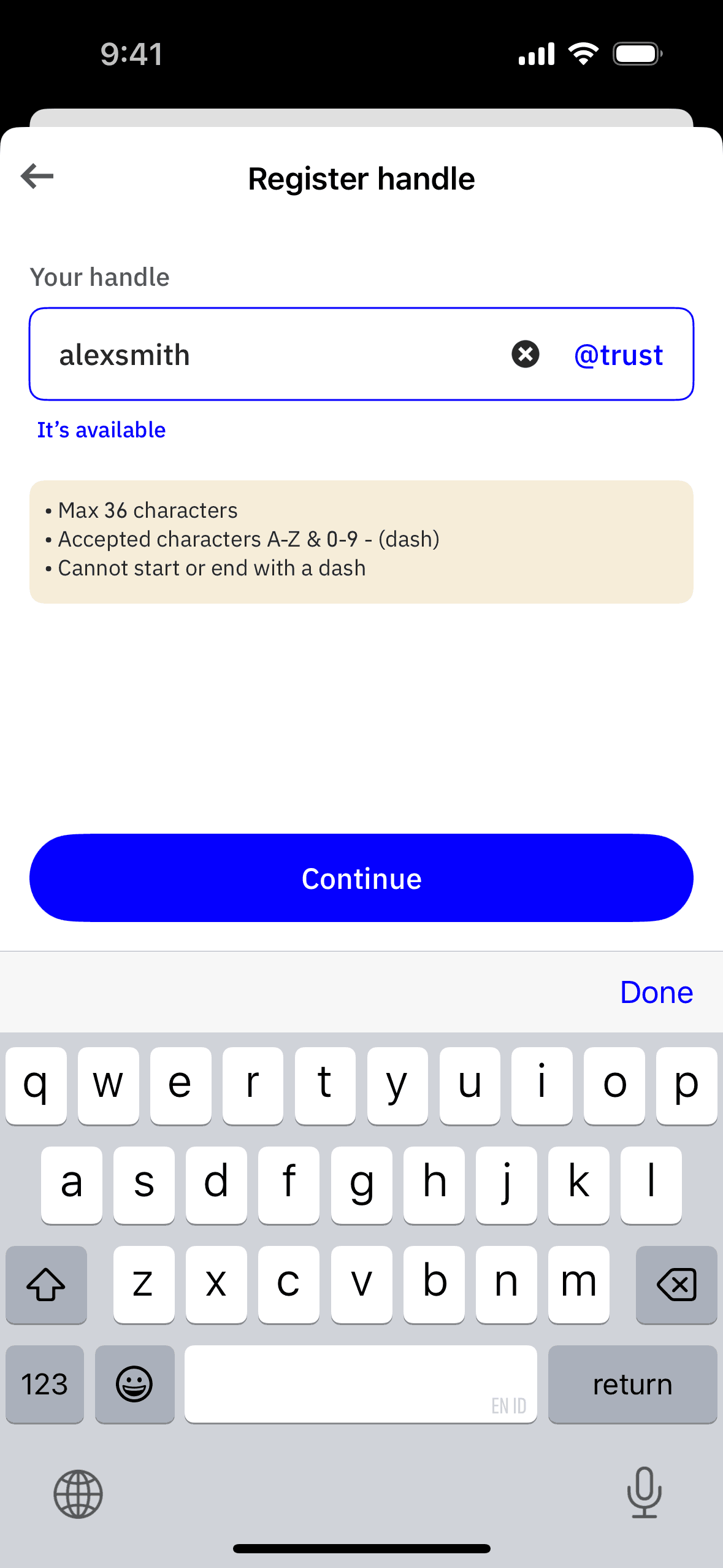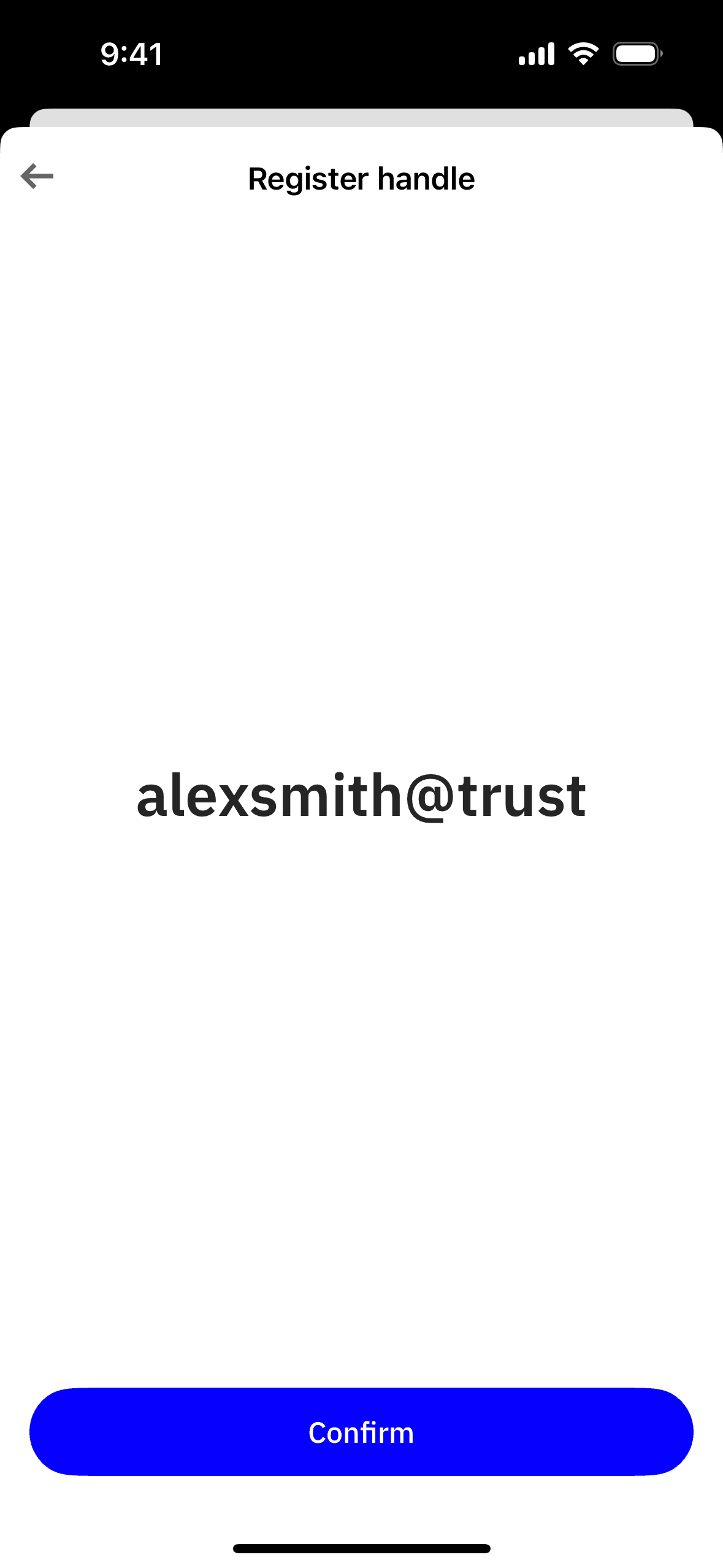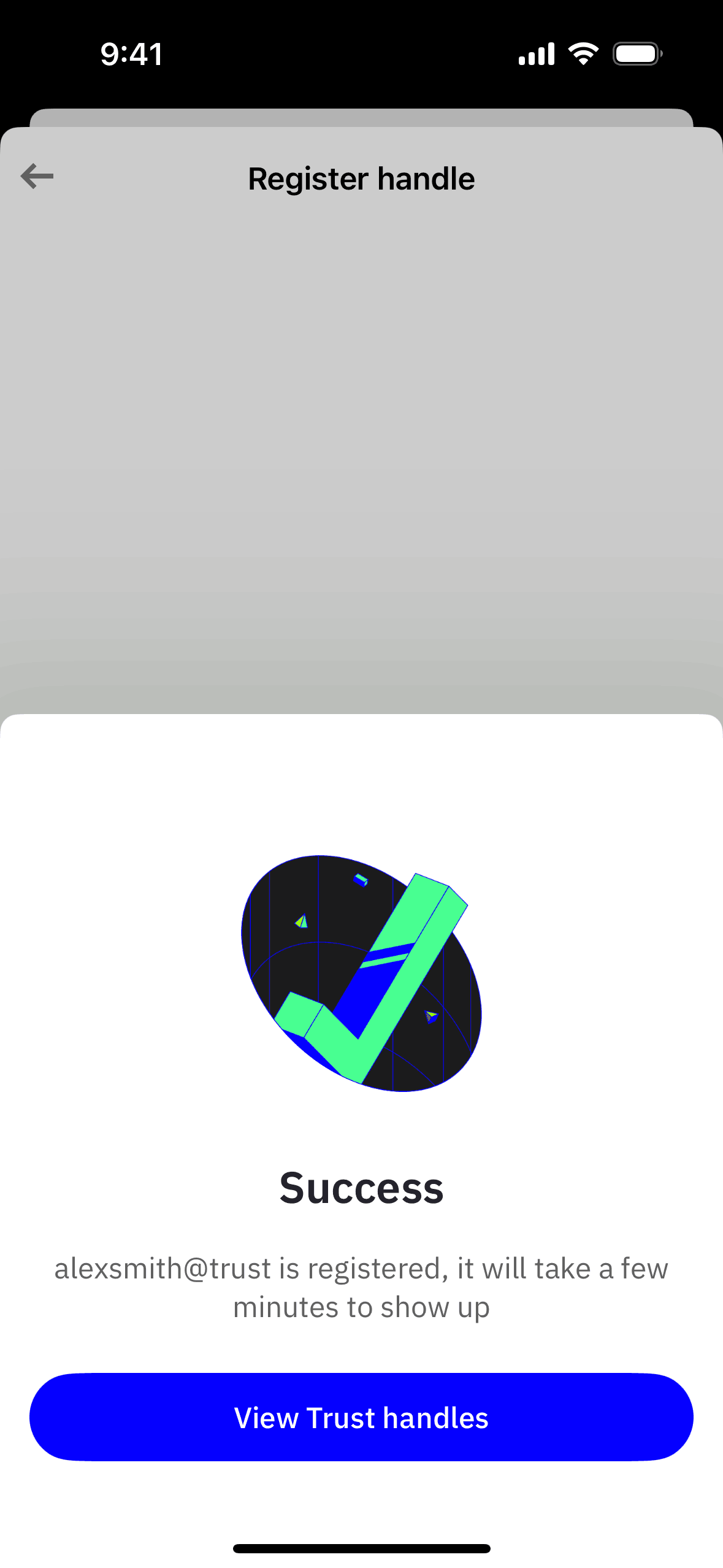 The user navigates through settings to register a new handle. They input a handle, confirm it, and see it pending.