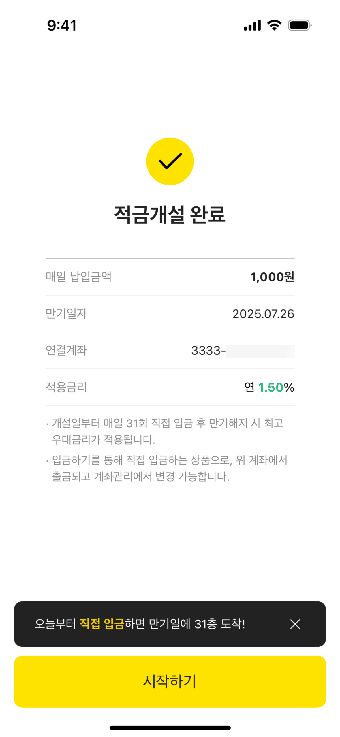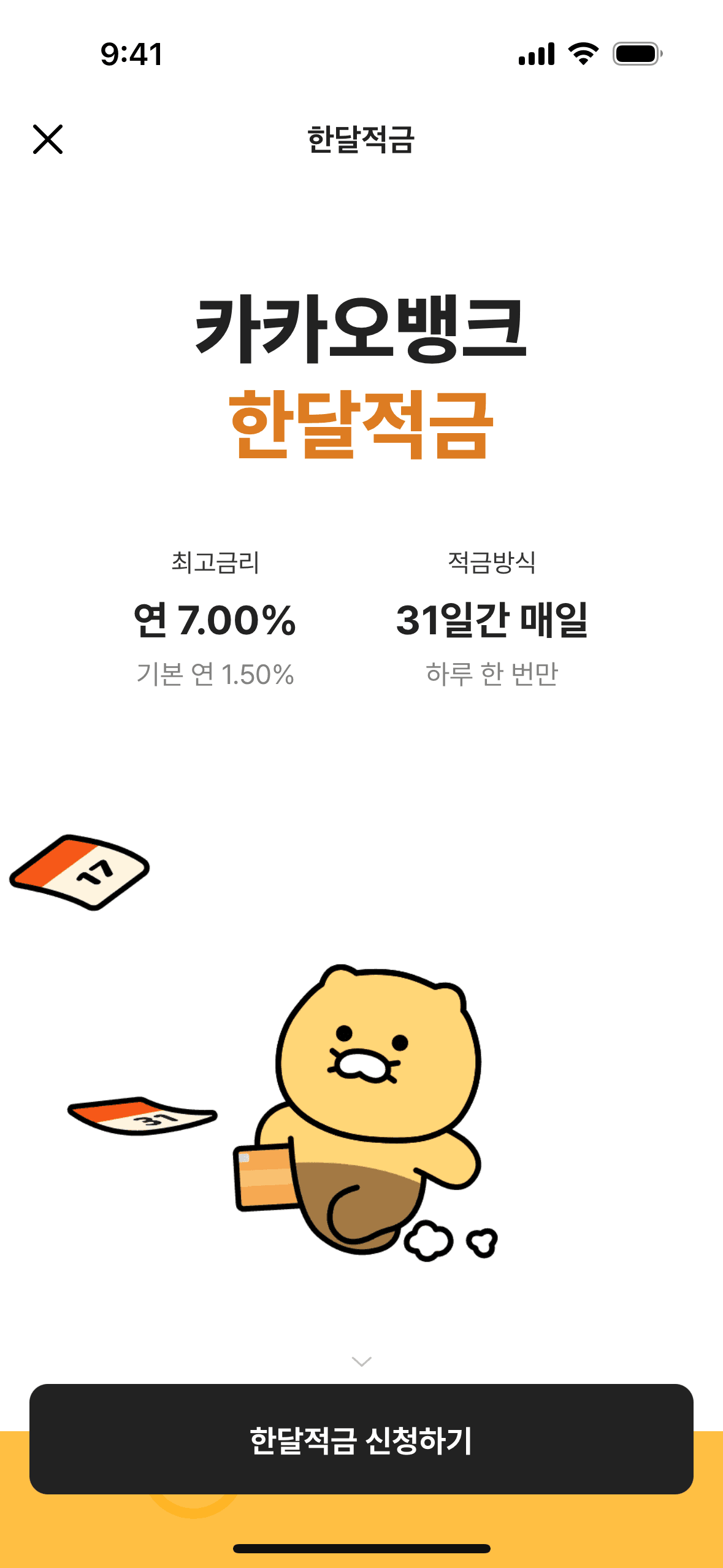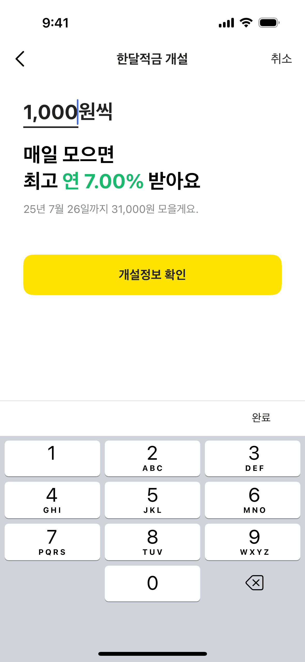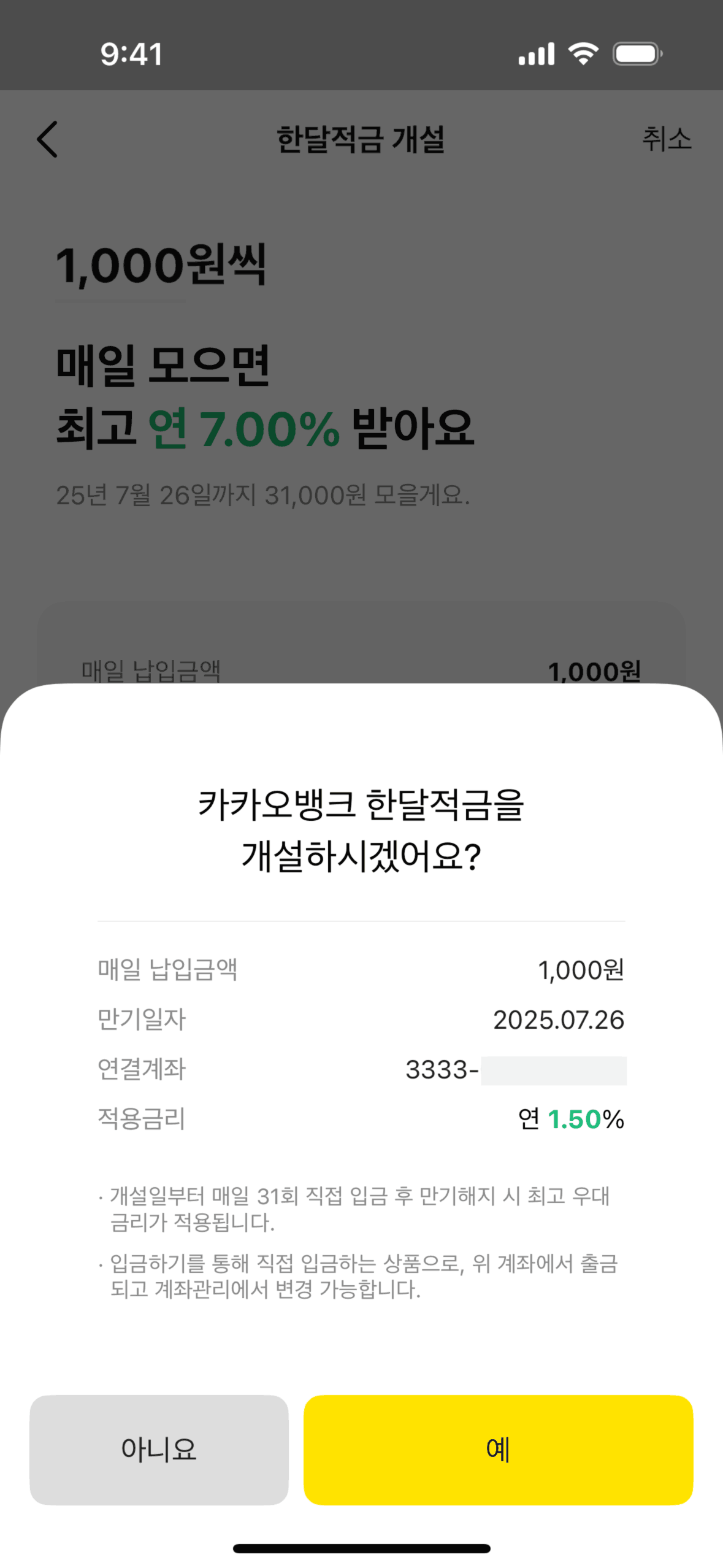 The user flow demonstrates opening a one-month savings account. It includes agreeing to terms, entering the amount, and confirming account creation.