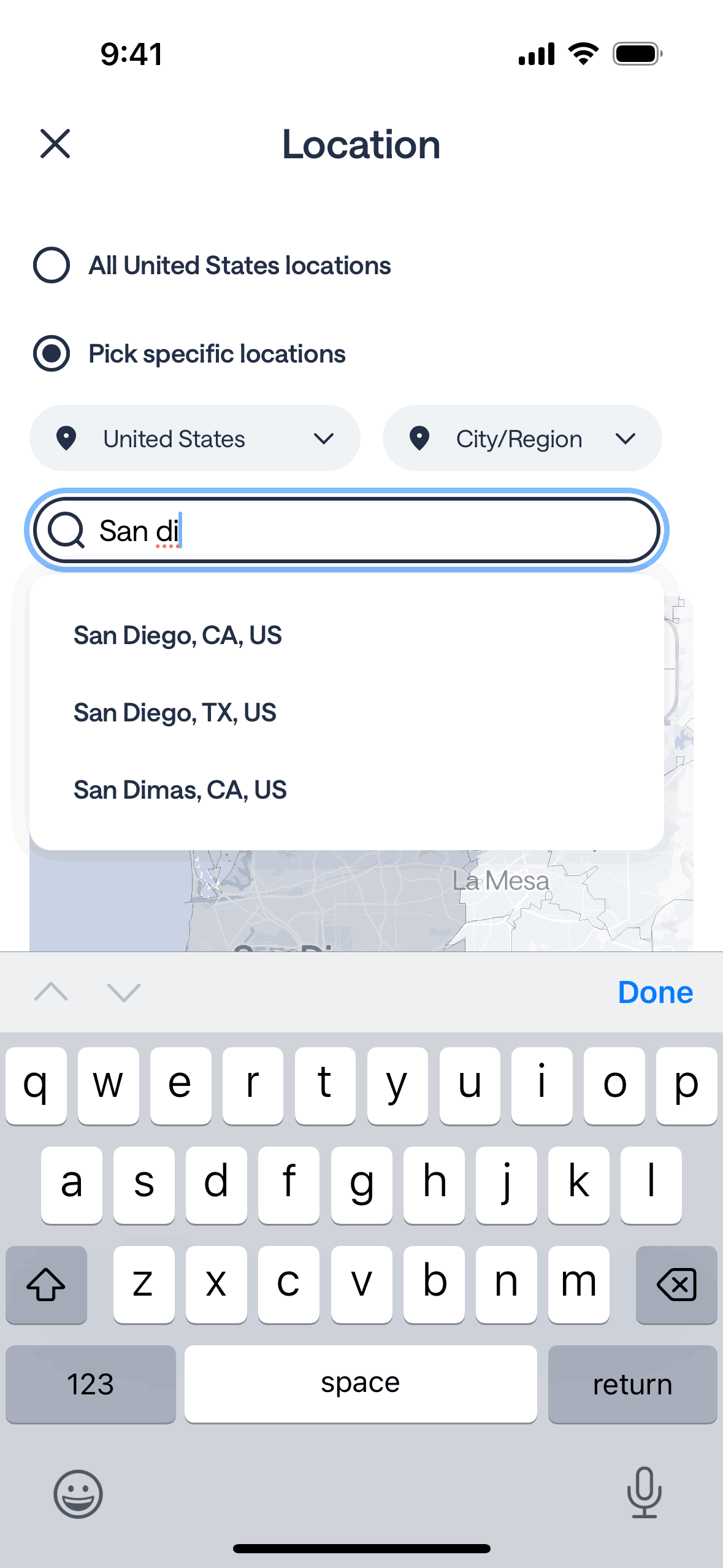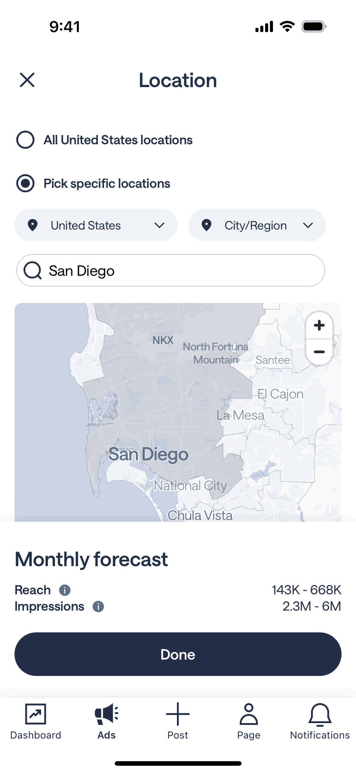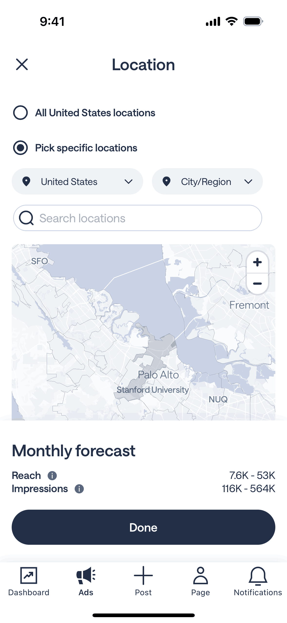 The user flow demonstrates setting location targets for an ad campaign. The user selects a specific location and returns to the targeting options.