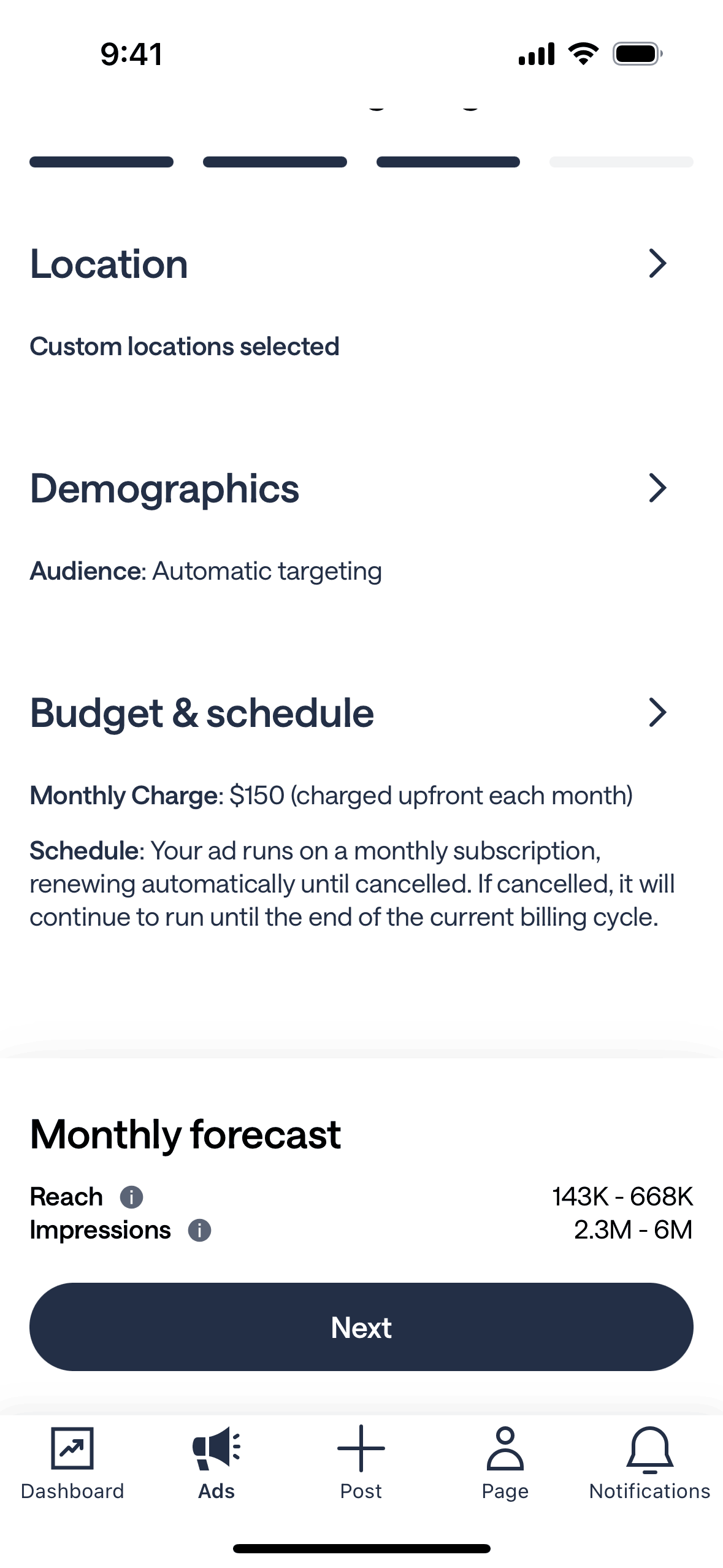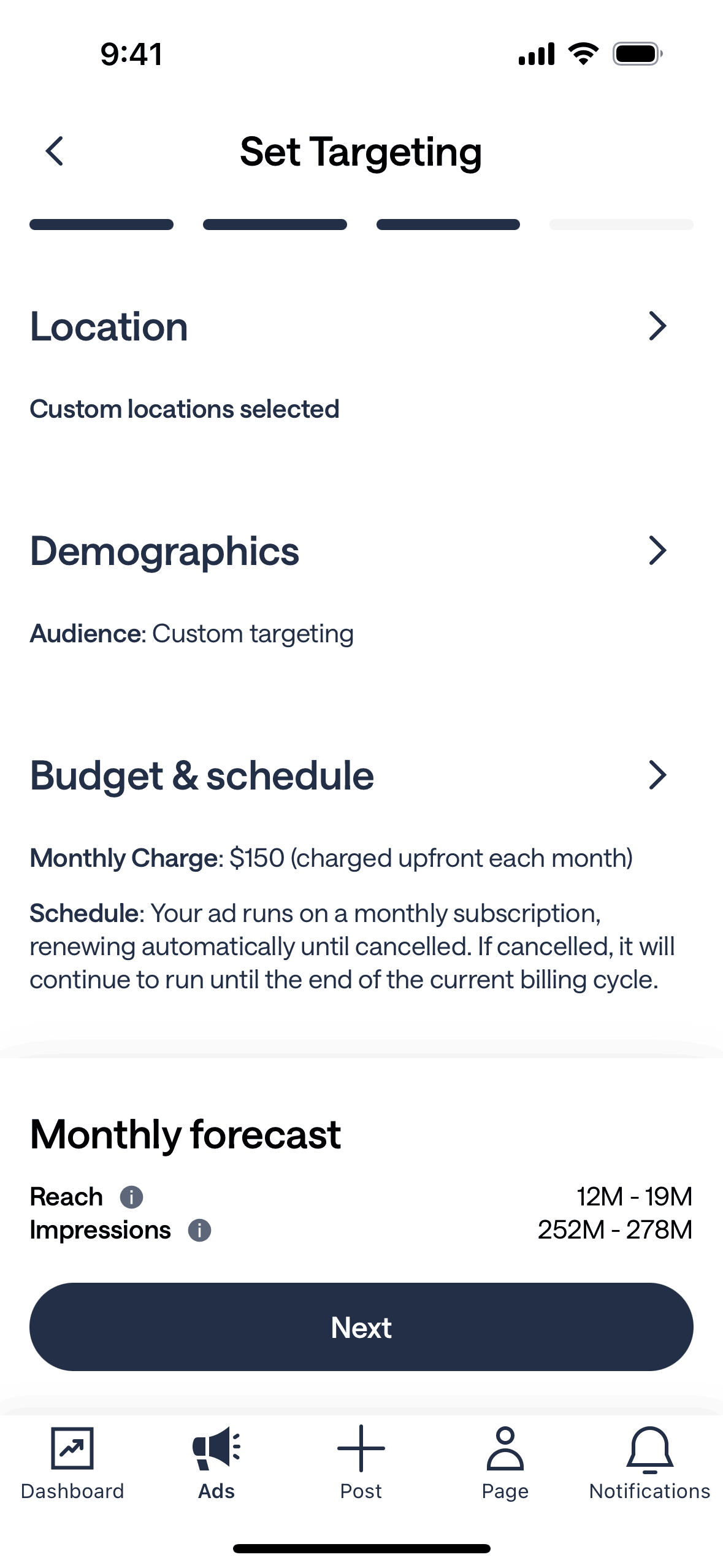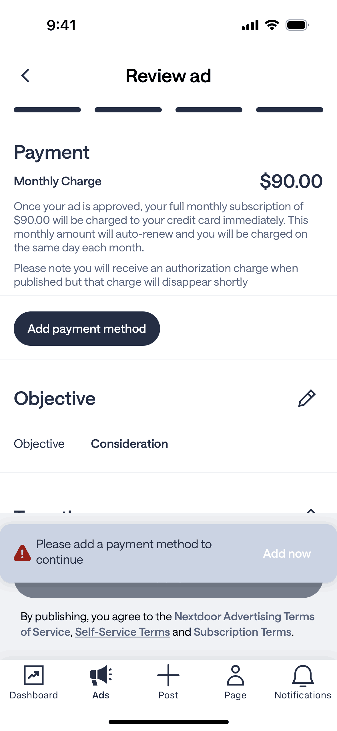 The user flow involves setting the budget for an ad campaign and then reviewing the ad before adding a payment method.