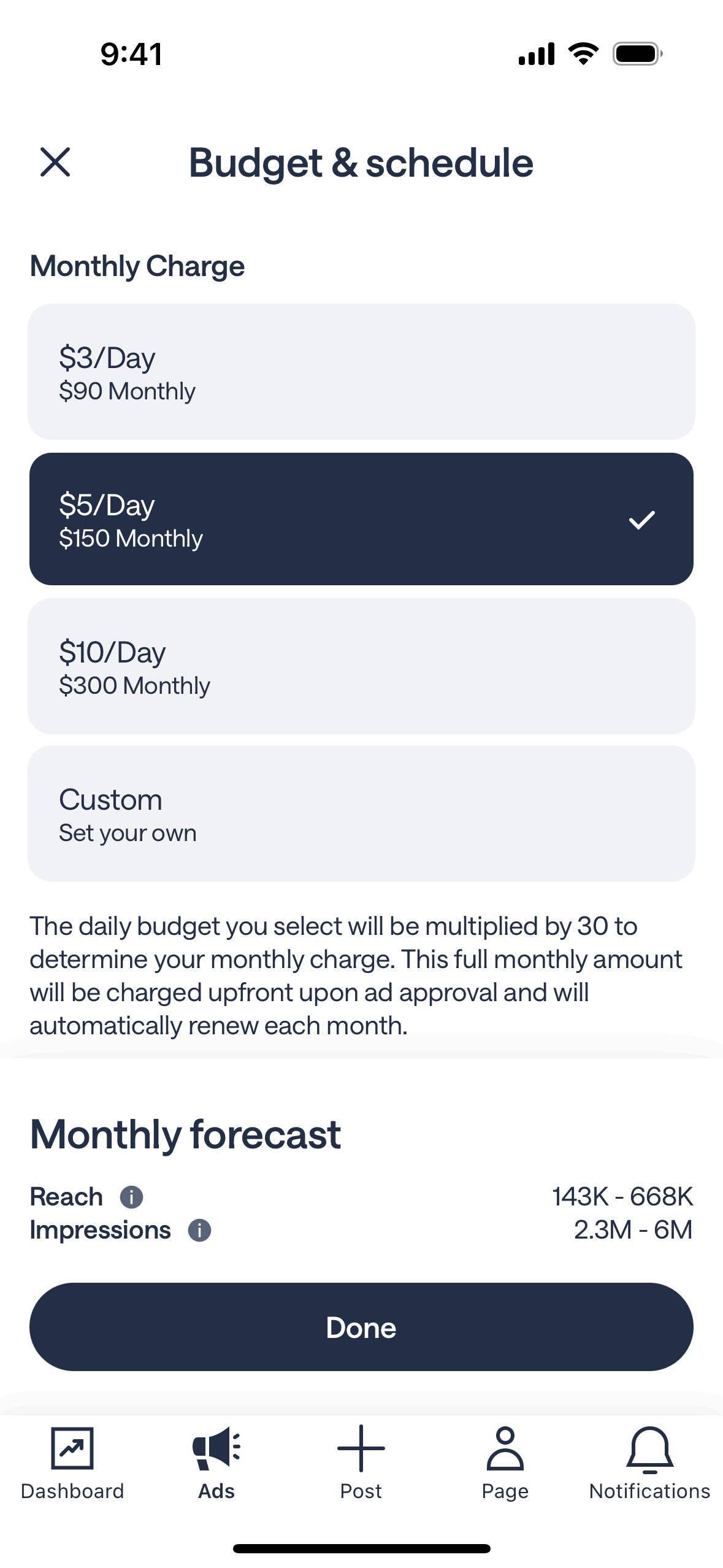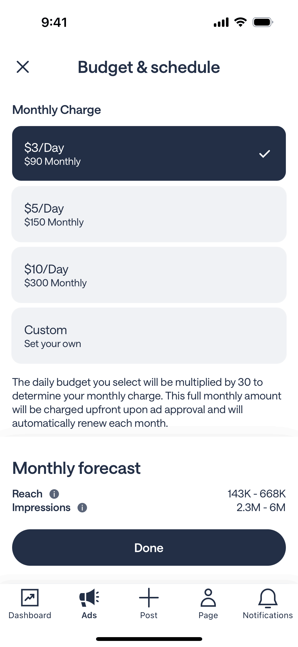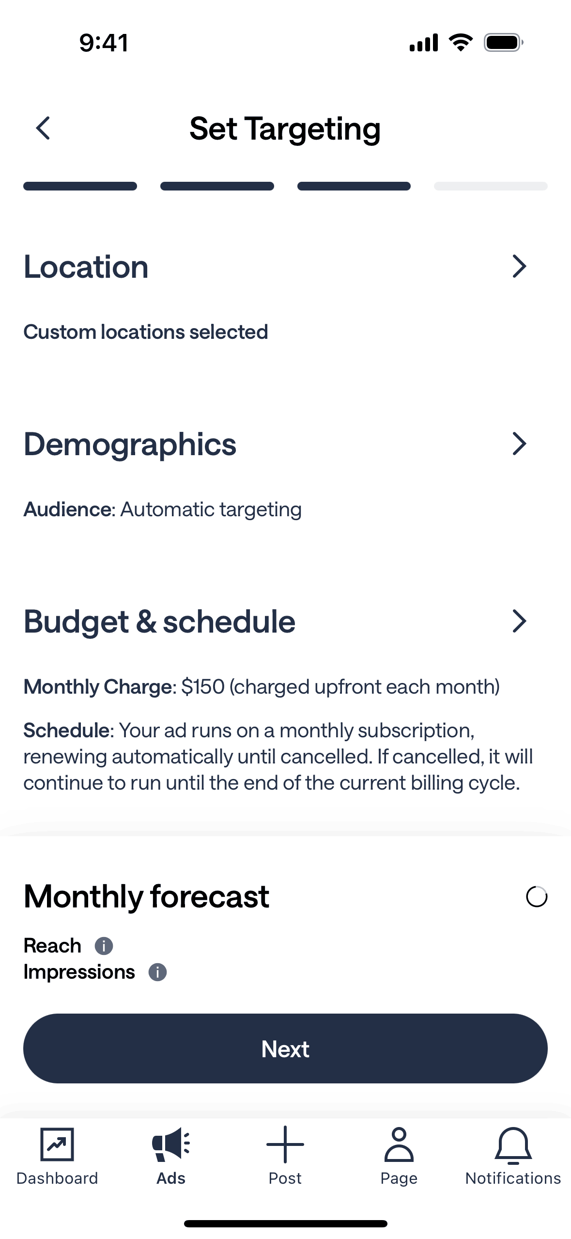 The user flow involves setting the budget for an ad campaign and then reviewing the ad before adding a payment method.