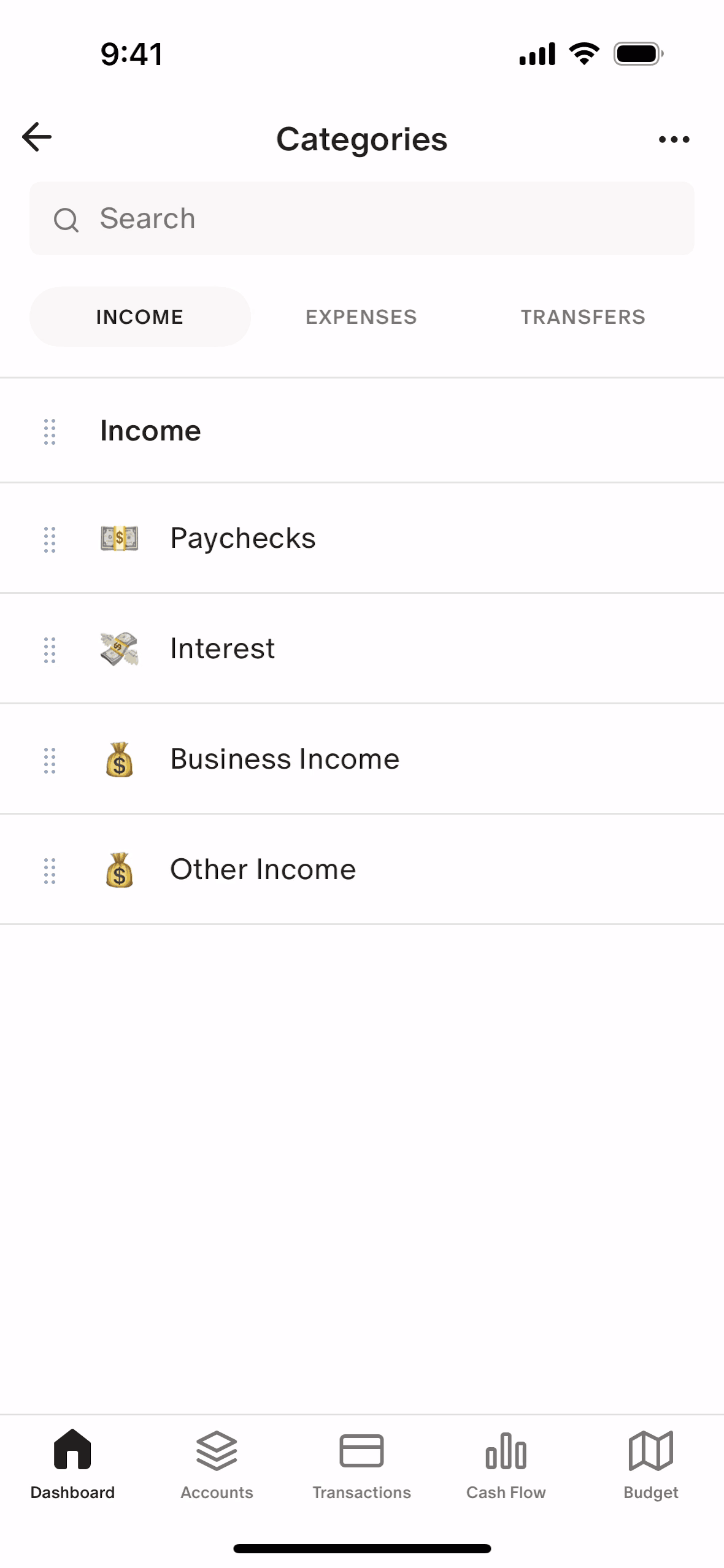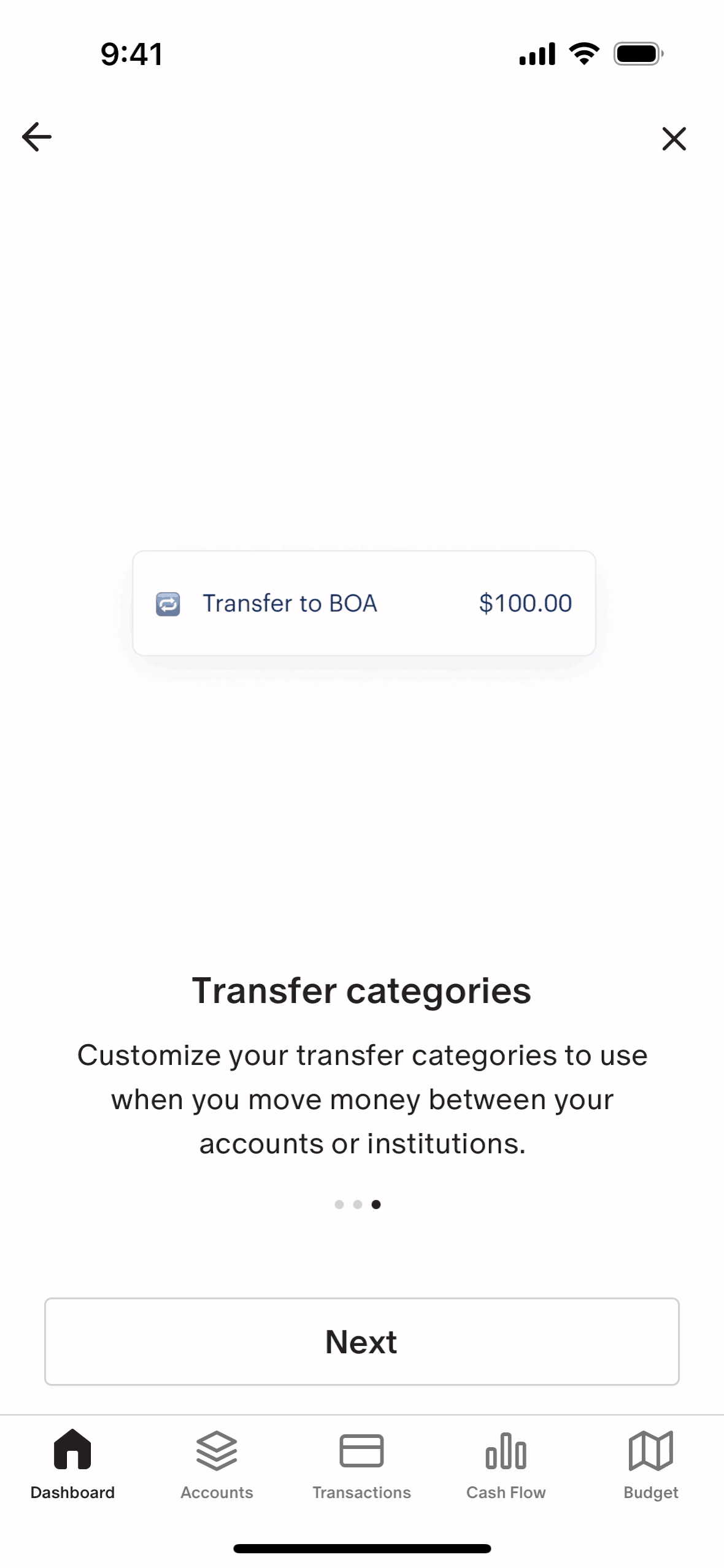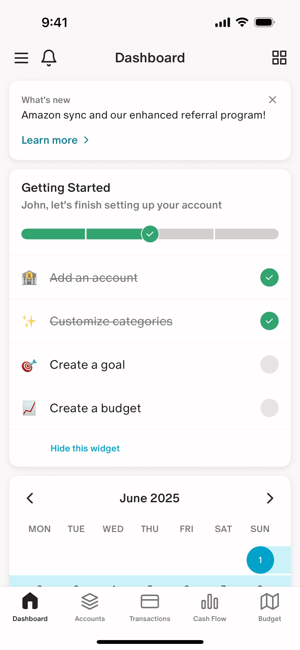 The user flow guides the user to customize categories, including income and transfer categories. The flow concludes by updating the dashboard checklist to reflect the completed task.