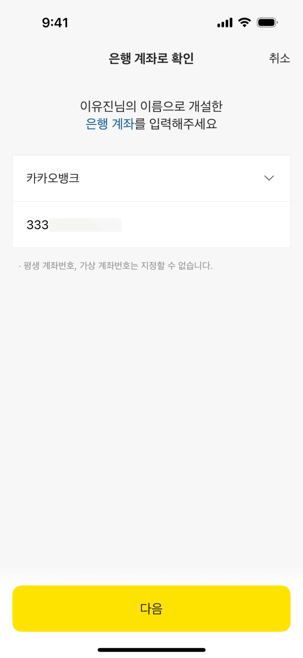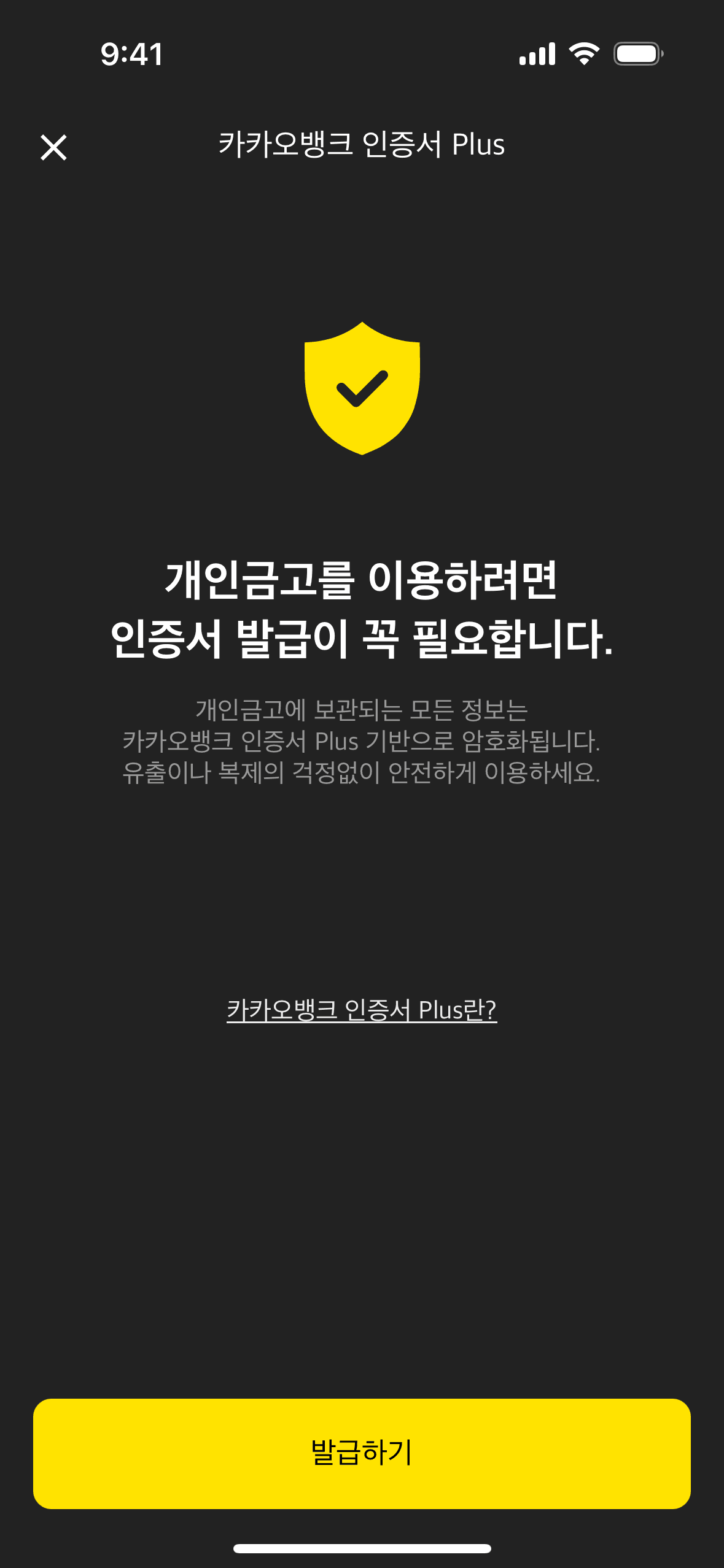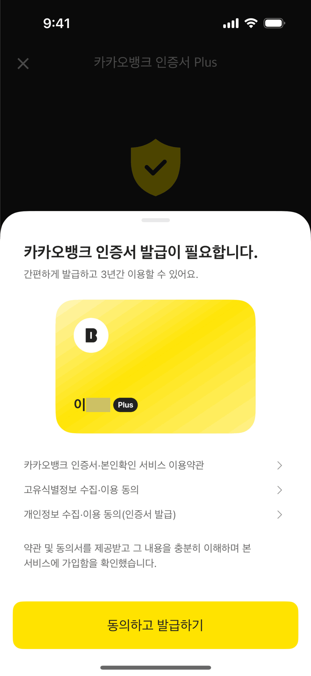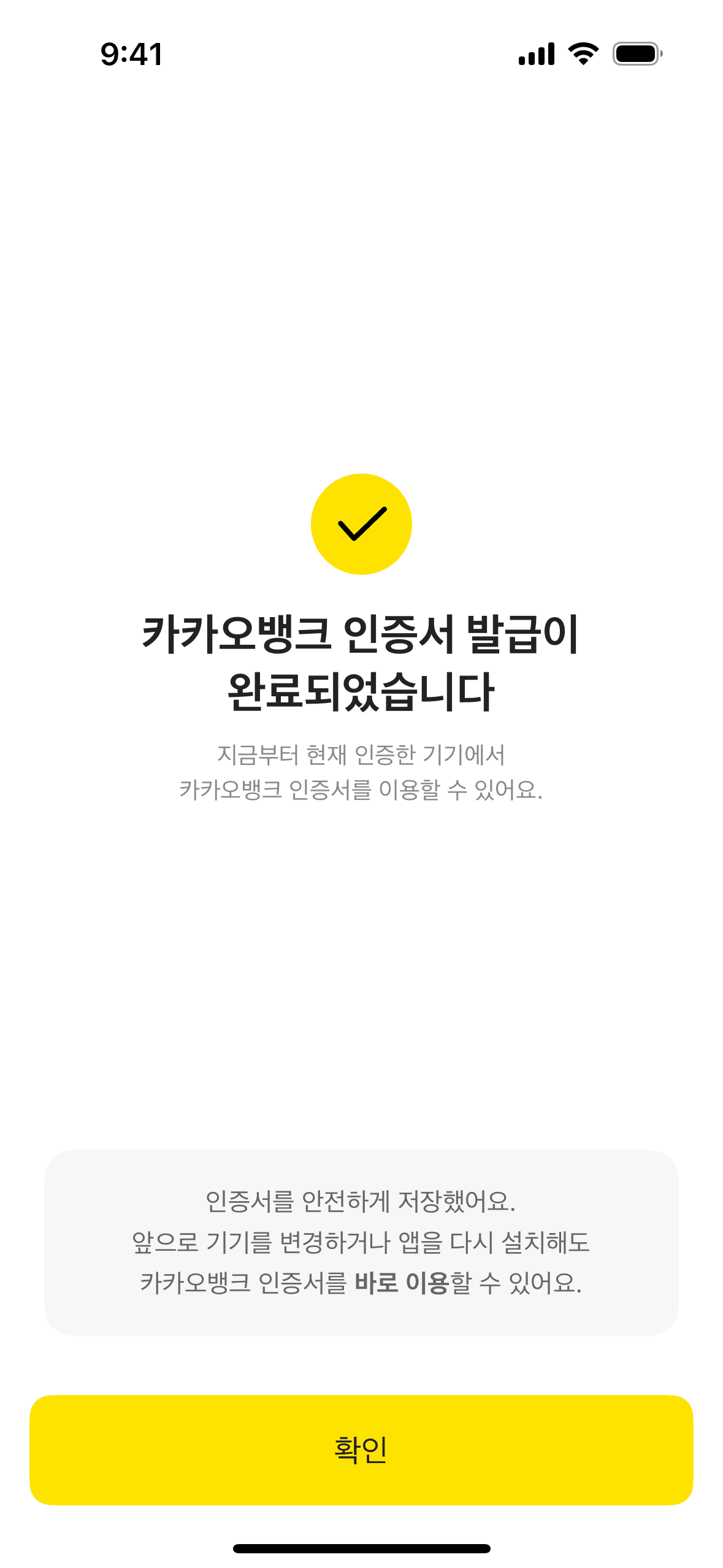 The user flow demonstrates setting up a personal safe by issuing a KakaoBank certificate. It involves ID submission, information confirmation, and account verification.