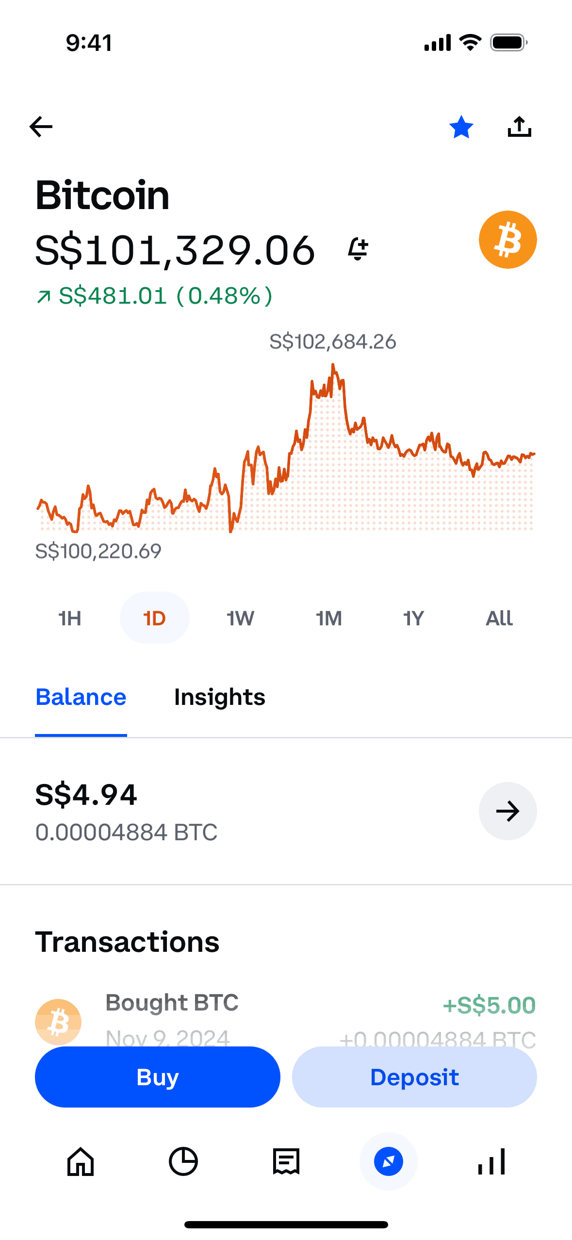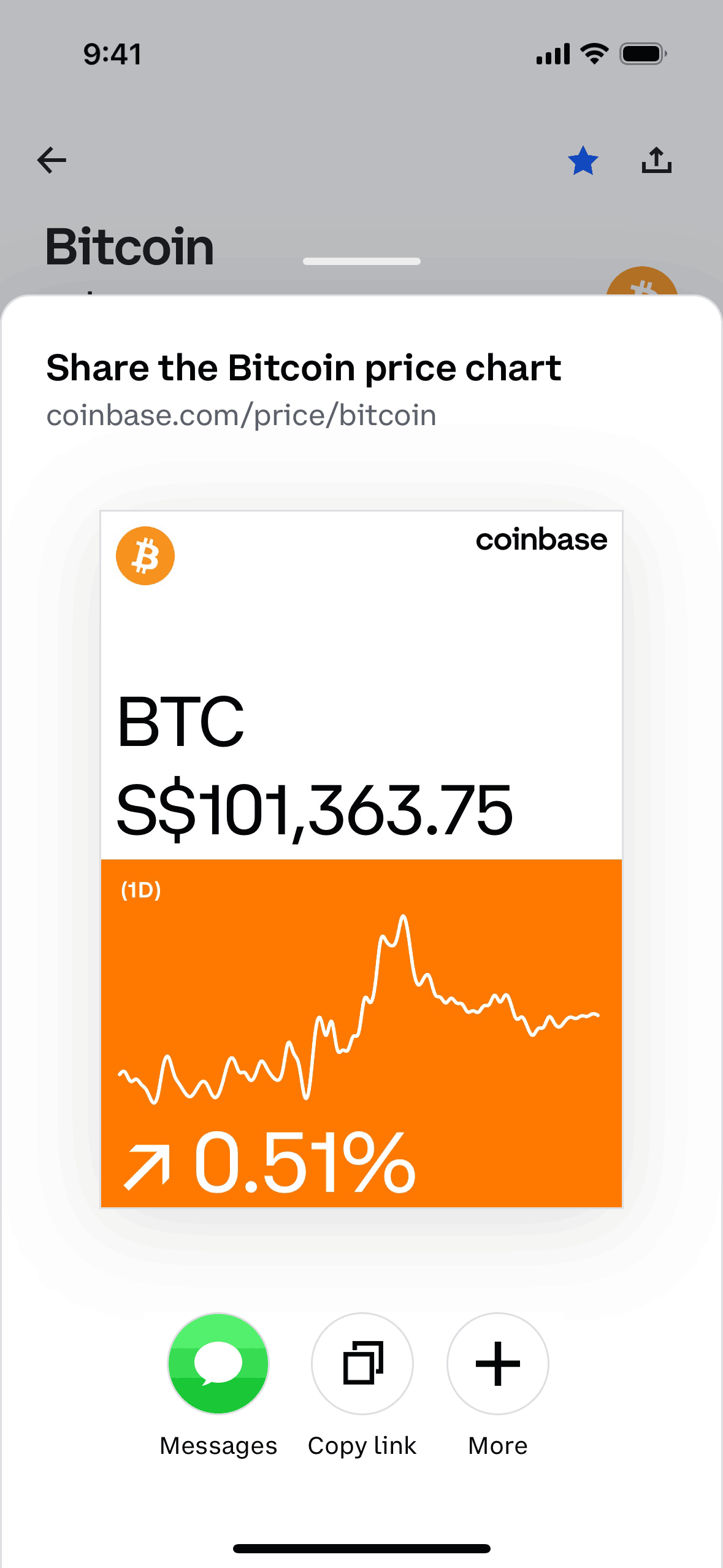 The user views Bitcoin details and then shares the Bitcoin price chart. Share options include messages, copy link, and more.