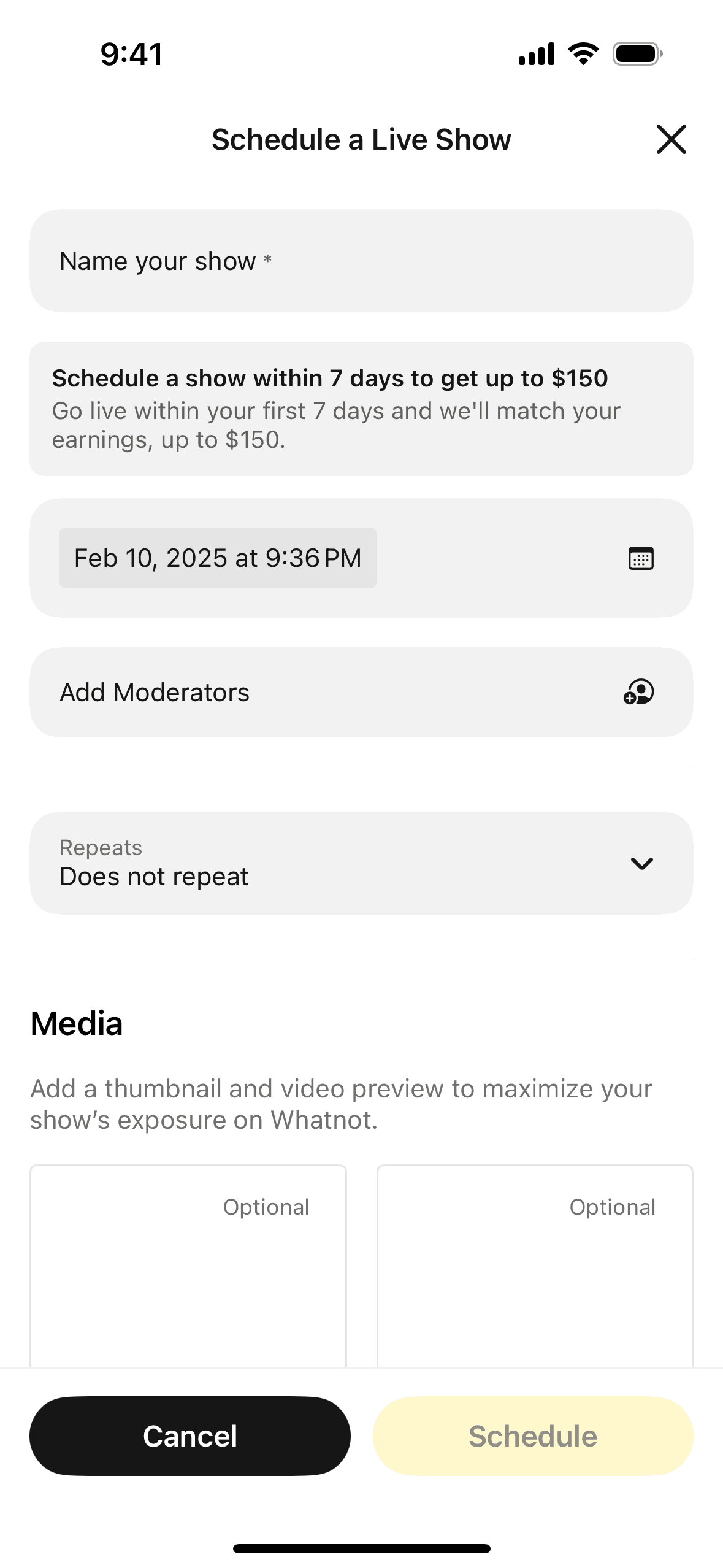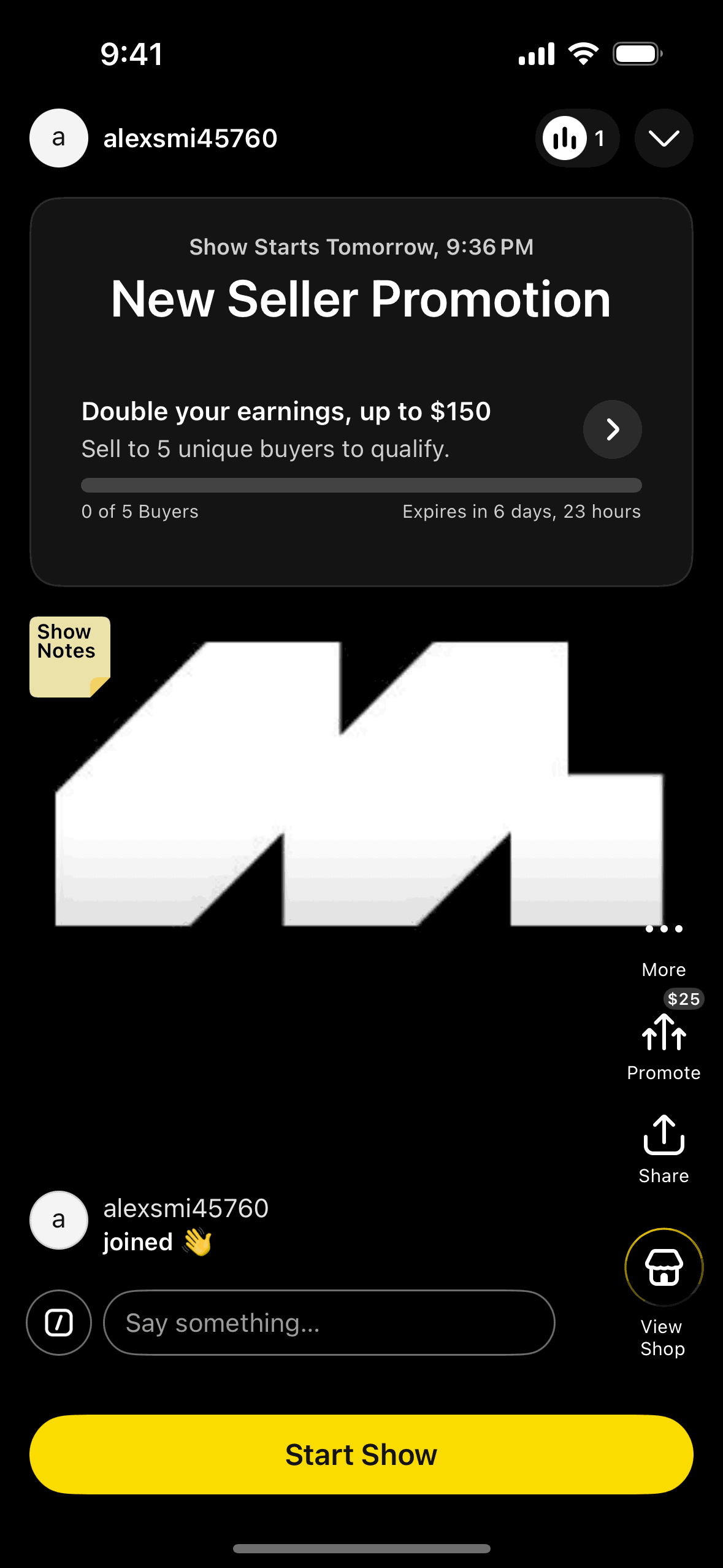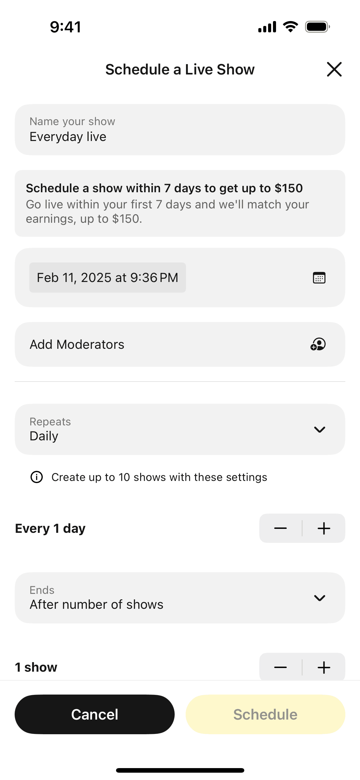 The user schedules a live show by filling out a form with show details. The user is then presented with the show details and a new seller promotion.