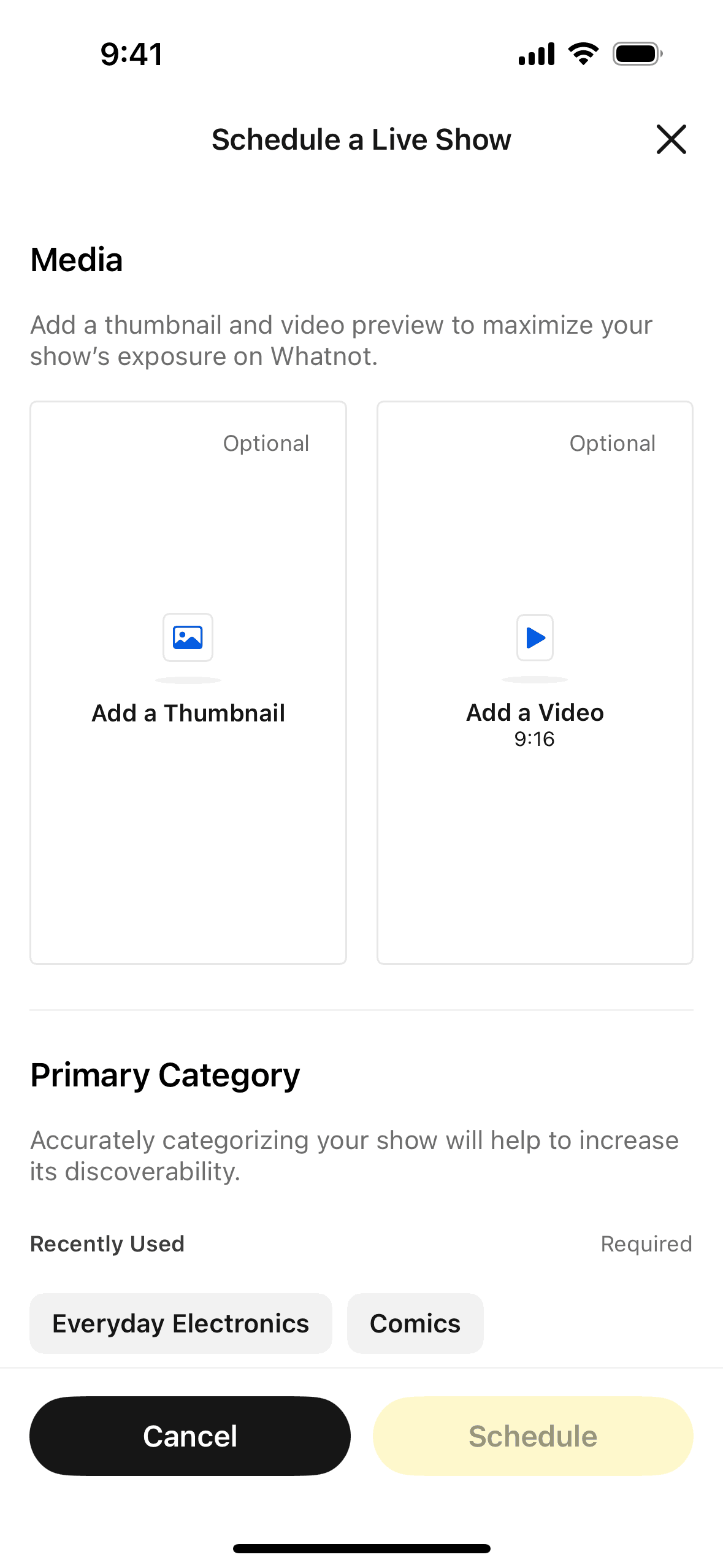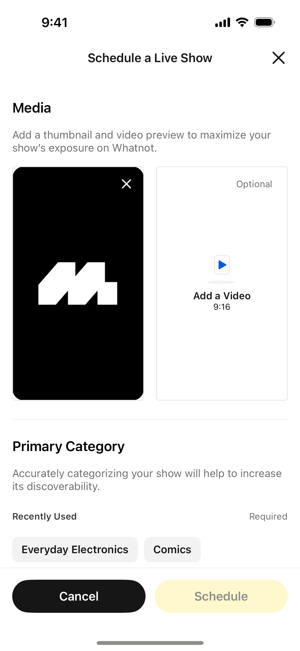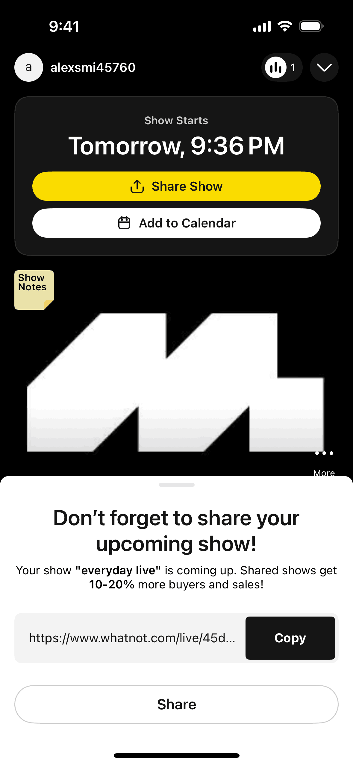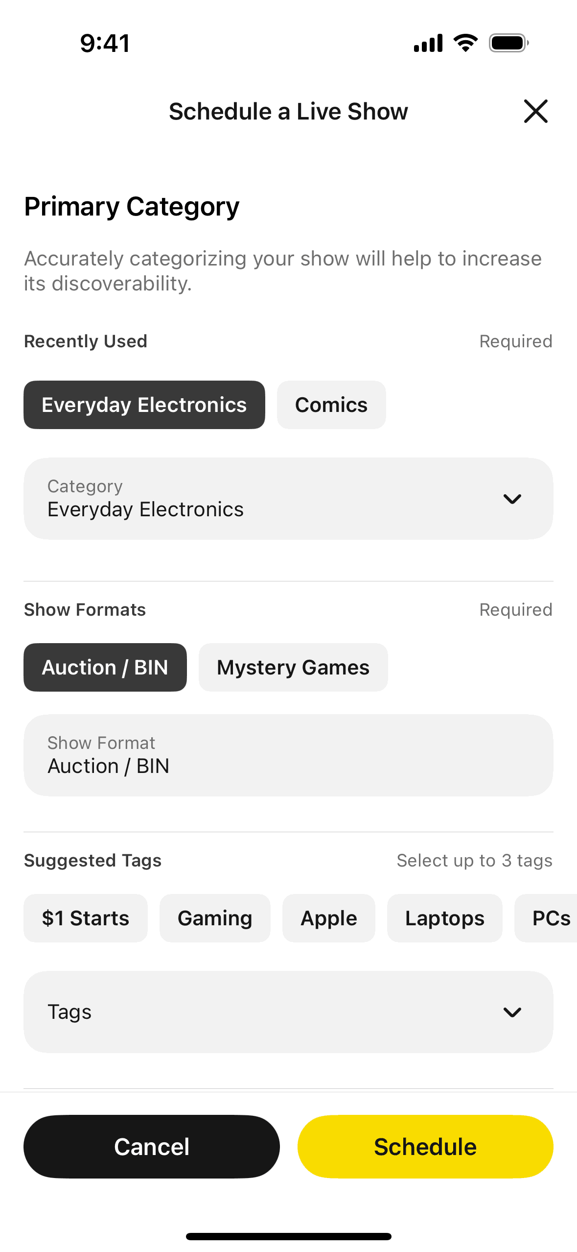 The user schedules a live show by filling out a form with show details. The user is then presented with the show details and a new seller promotion.