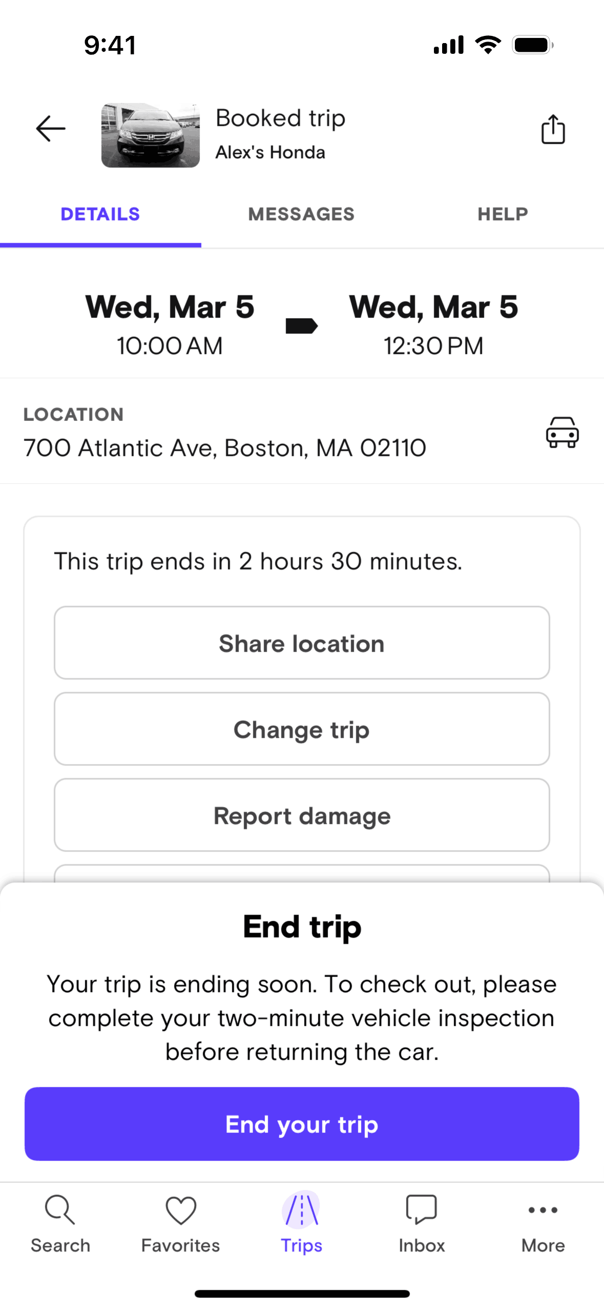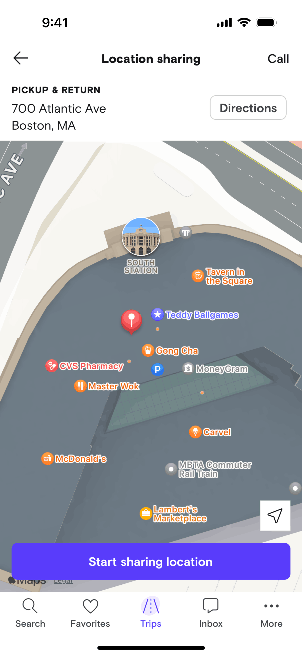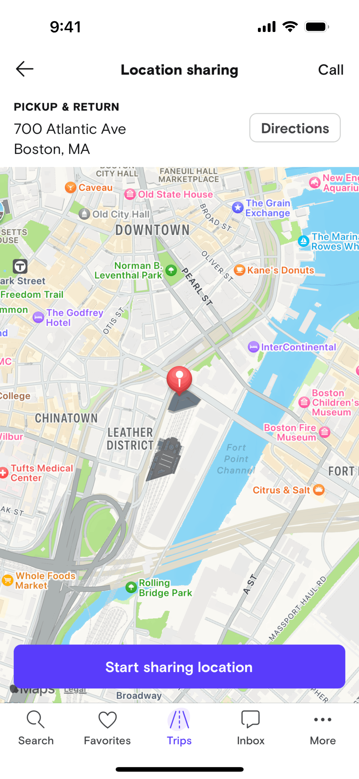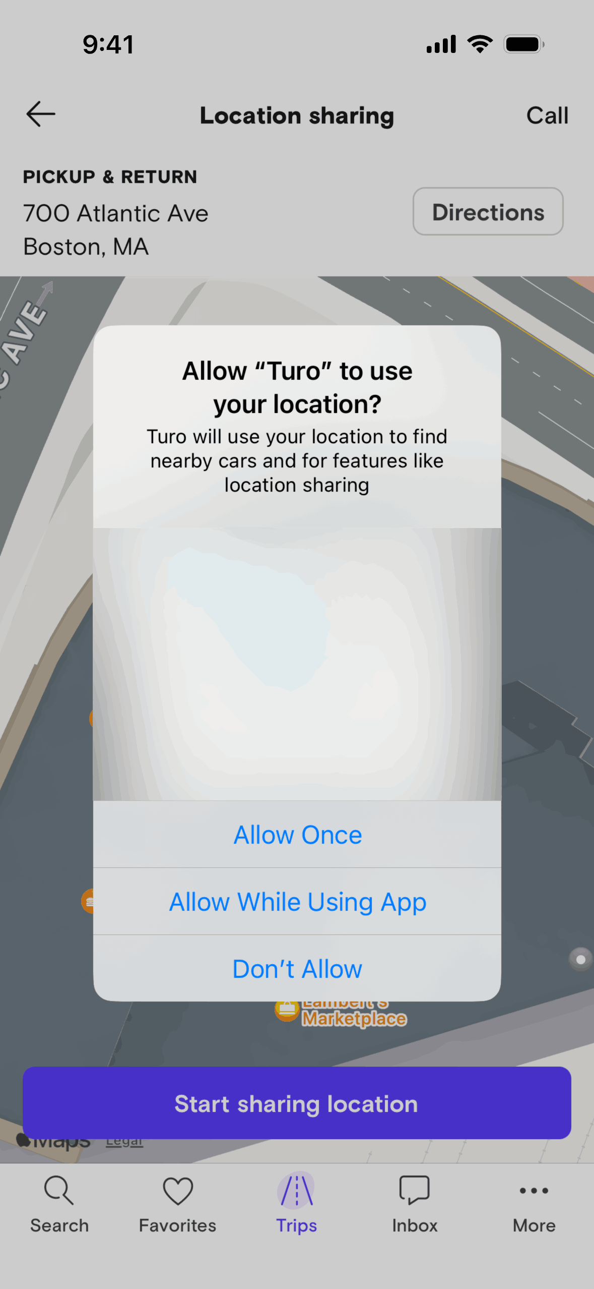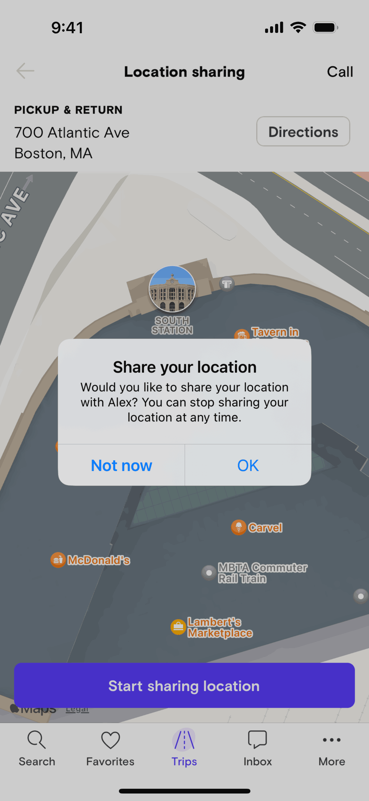 The user initiates location sharing from the trip details screen, navigates through permission requests, and activates location sharing. The flow concludes with the option to stop sharing location.