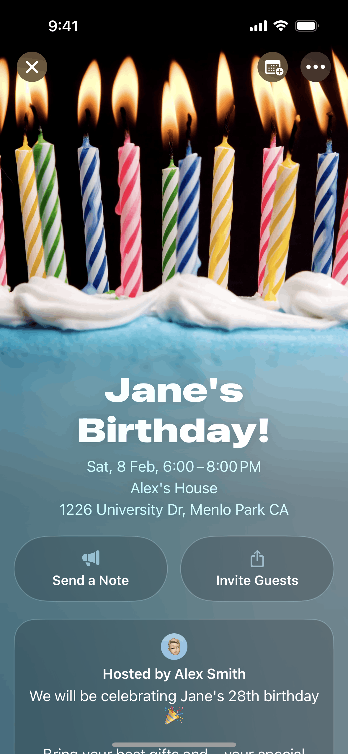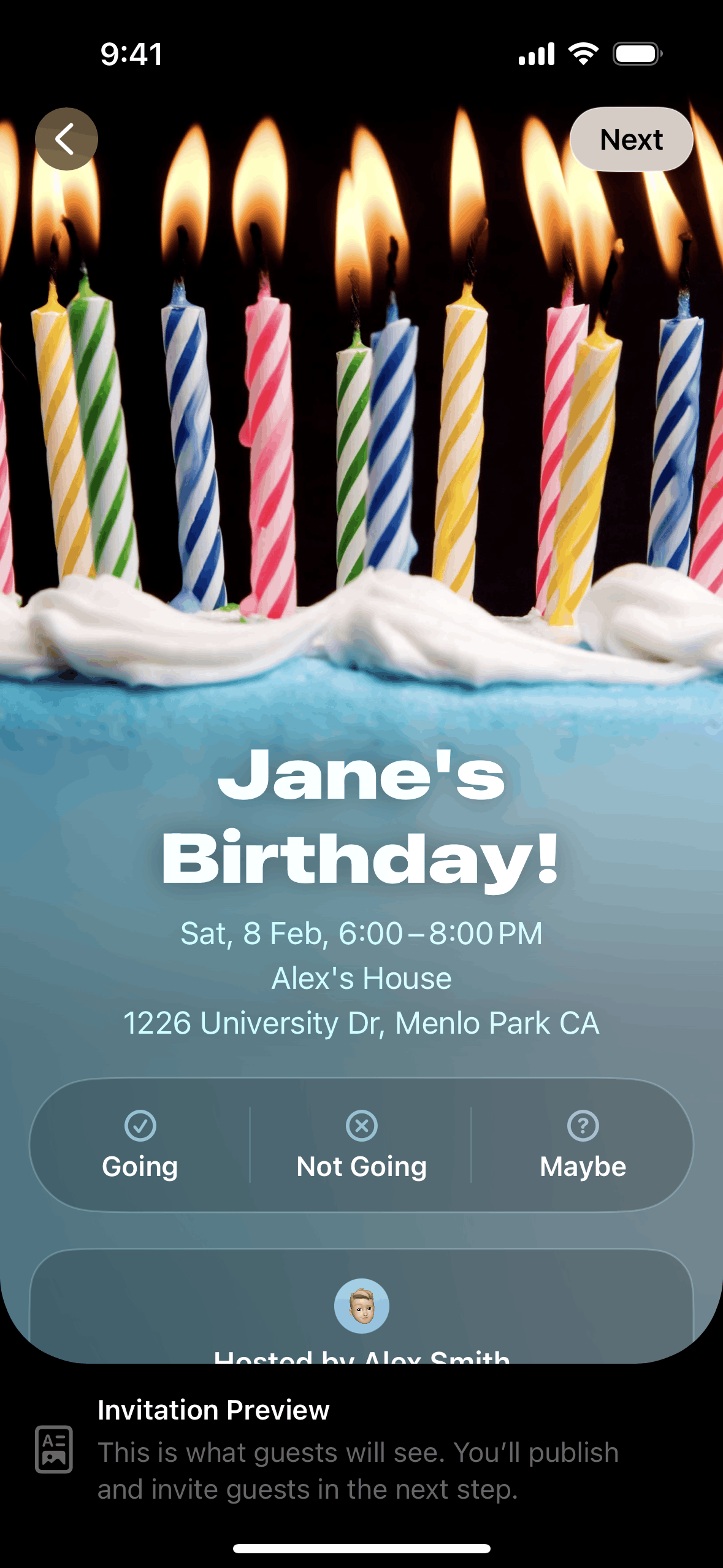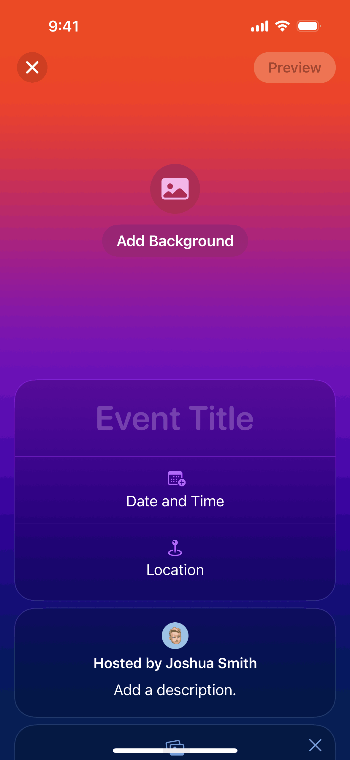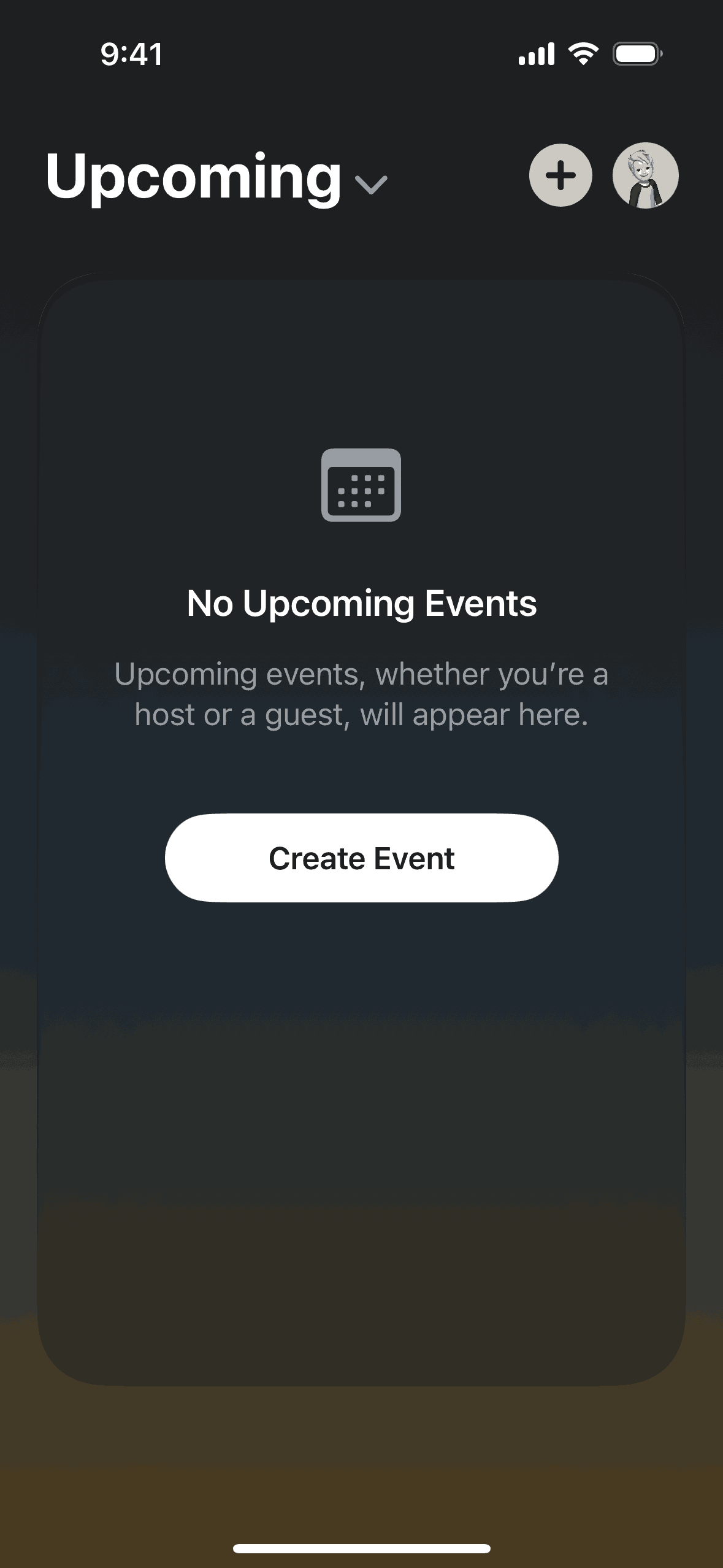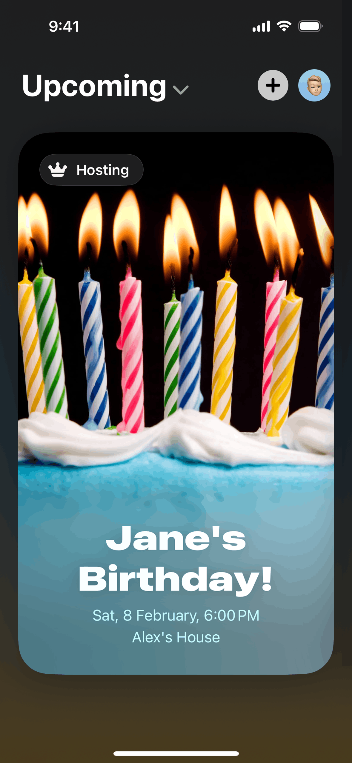 The user creates an event by adding details and inviting guests. The created event is then displayed in the upcoming events list.