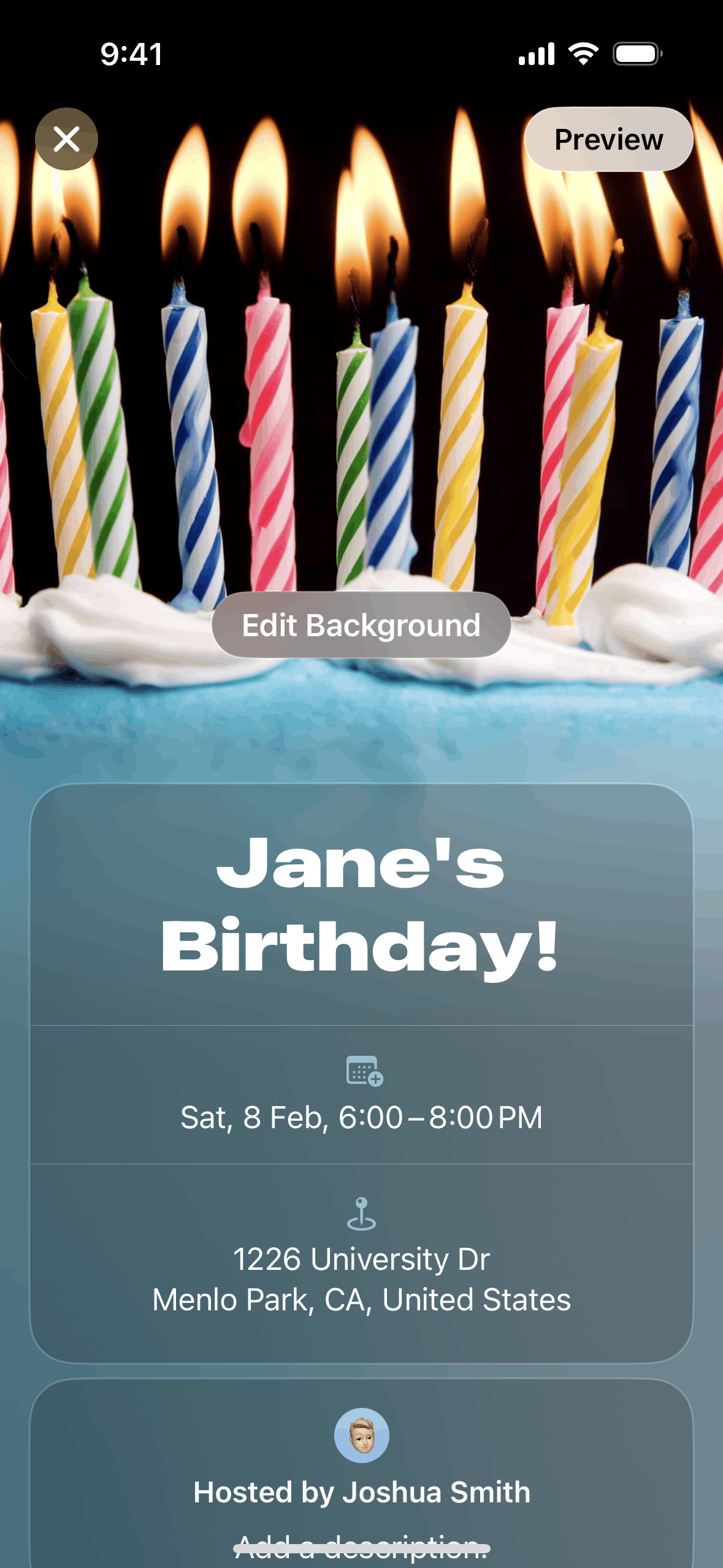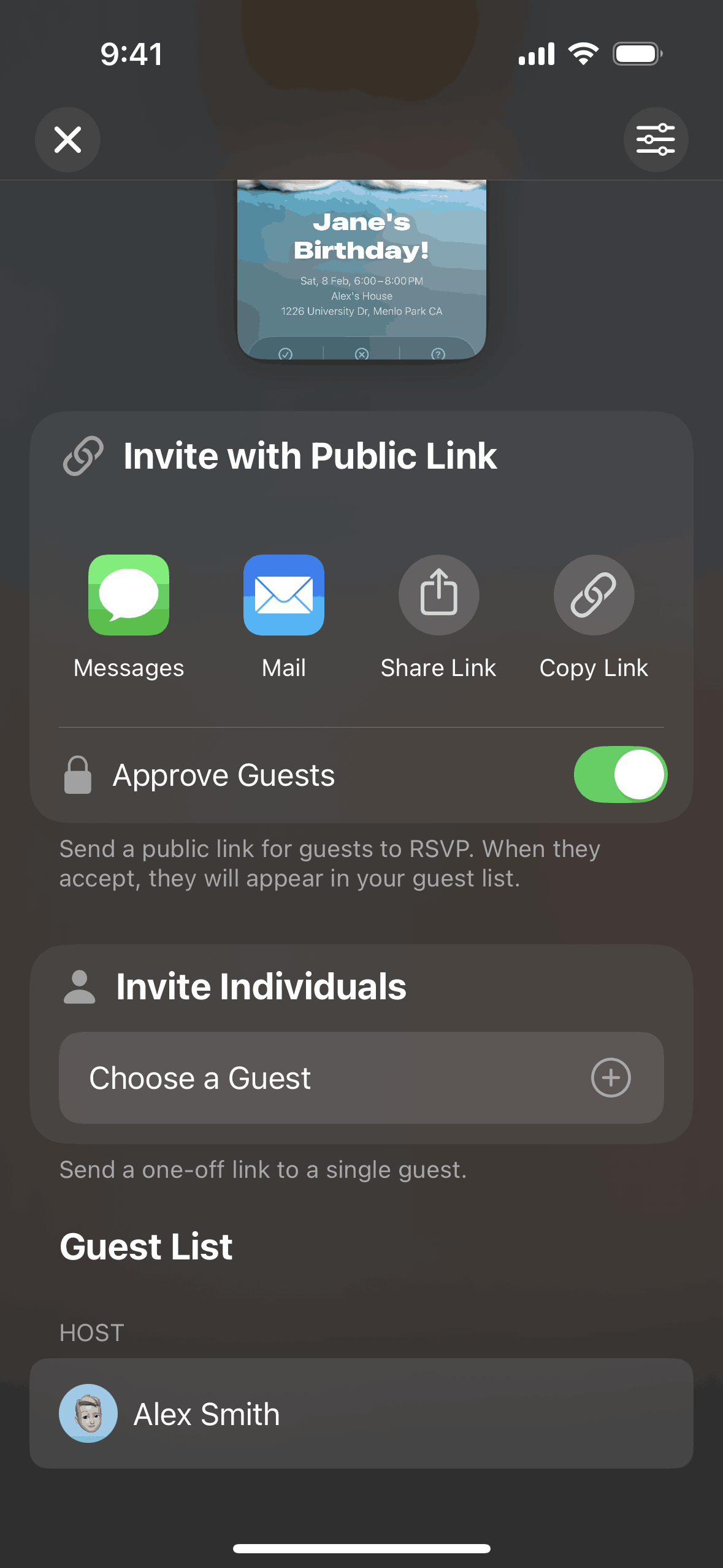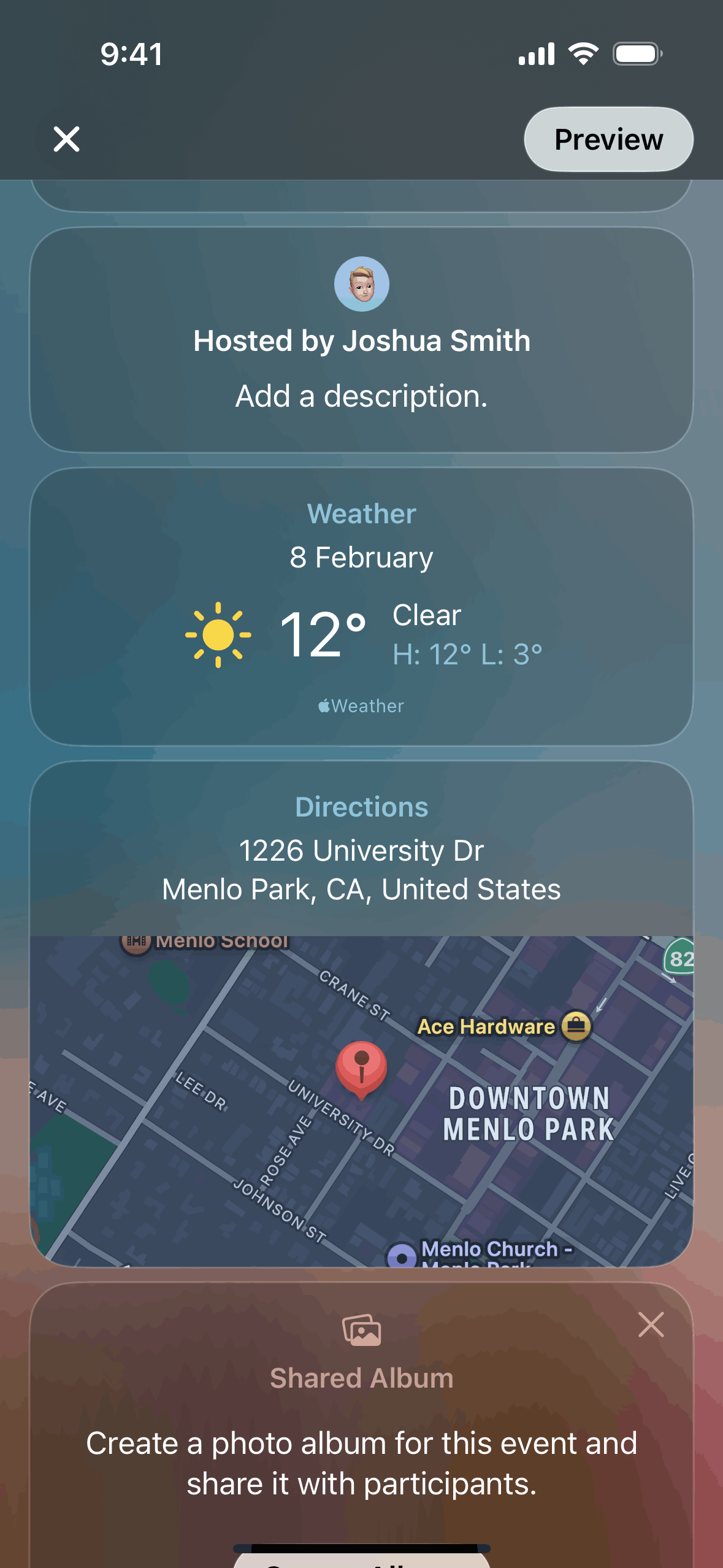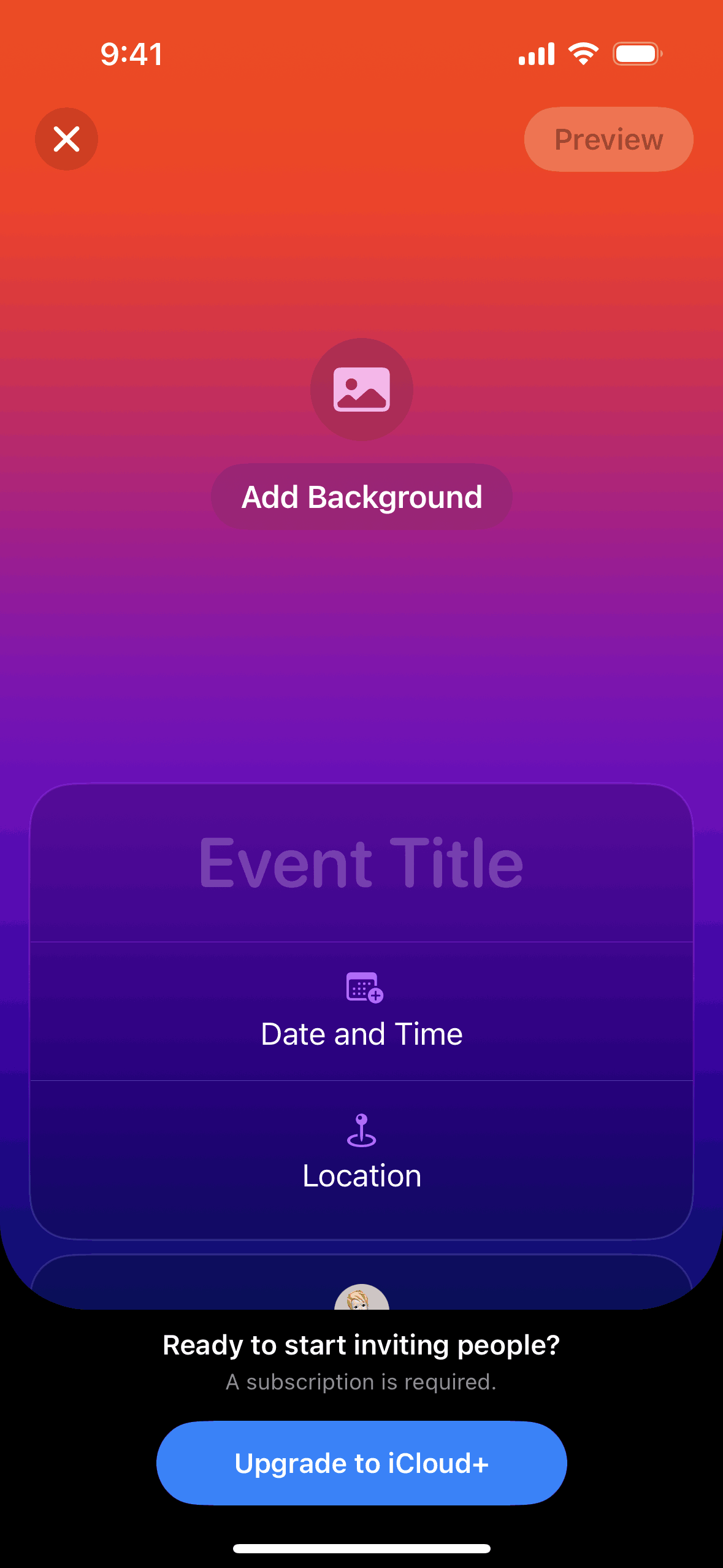 The user creates an event by adding details and inviting guests. The created event is then displayed in the upcoming events list.