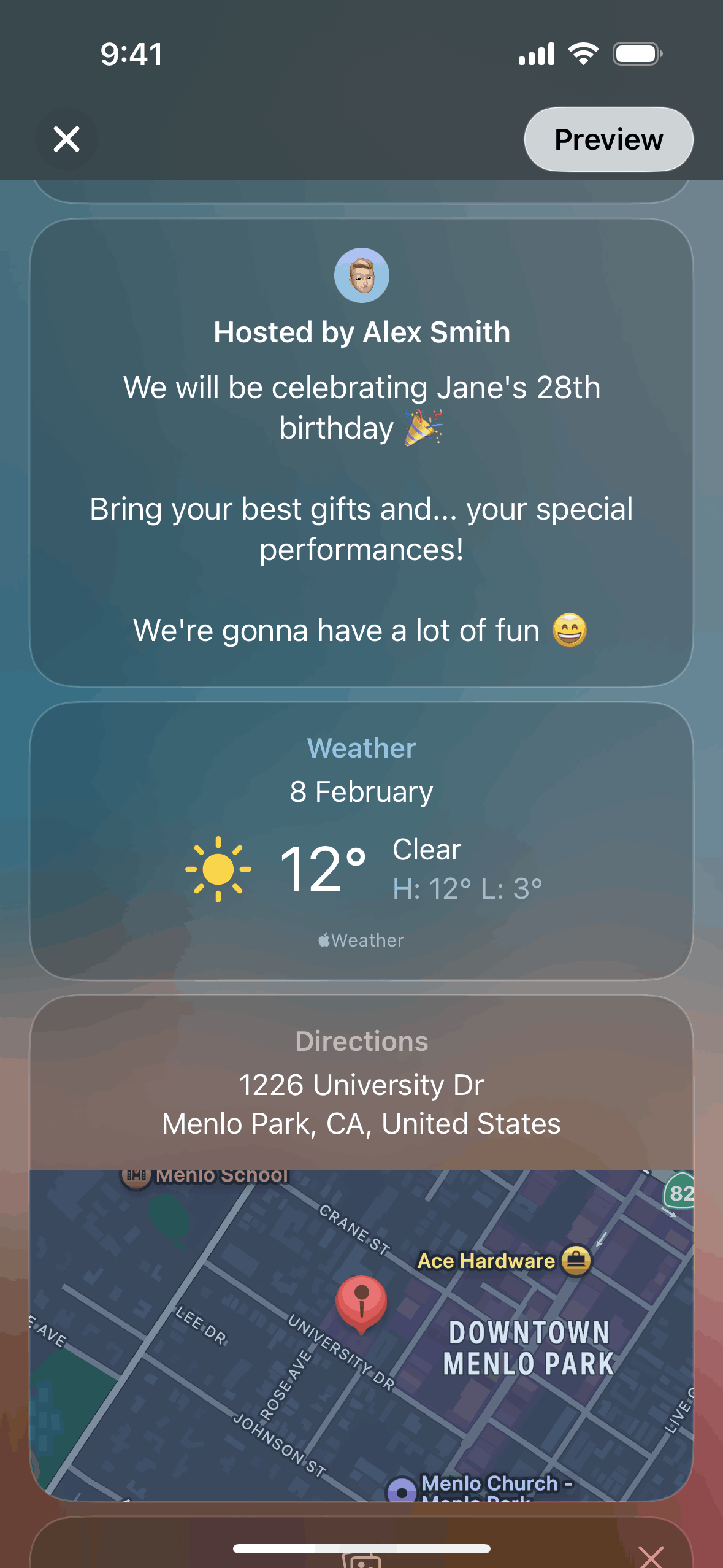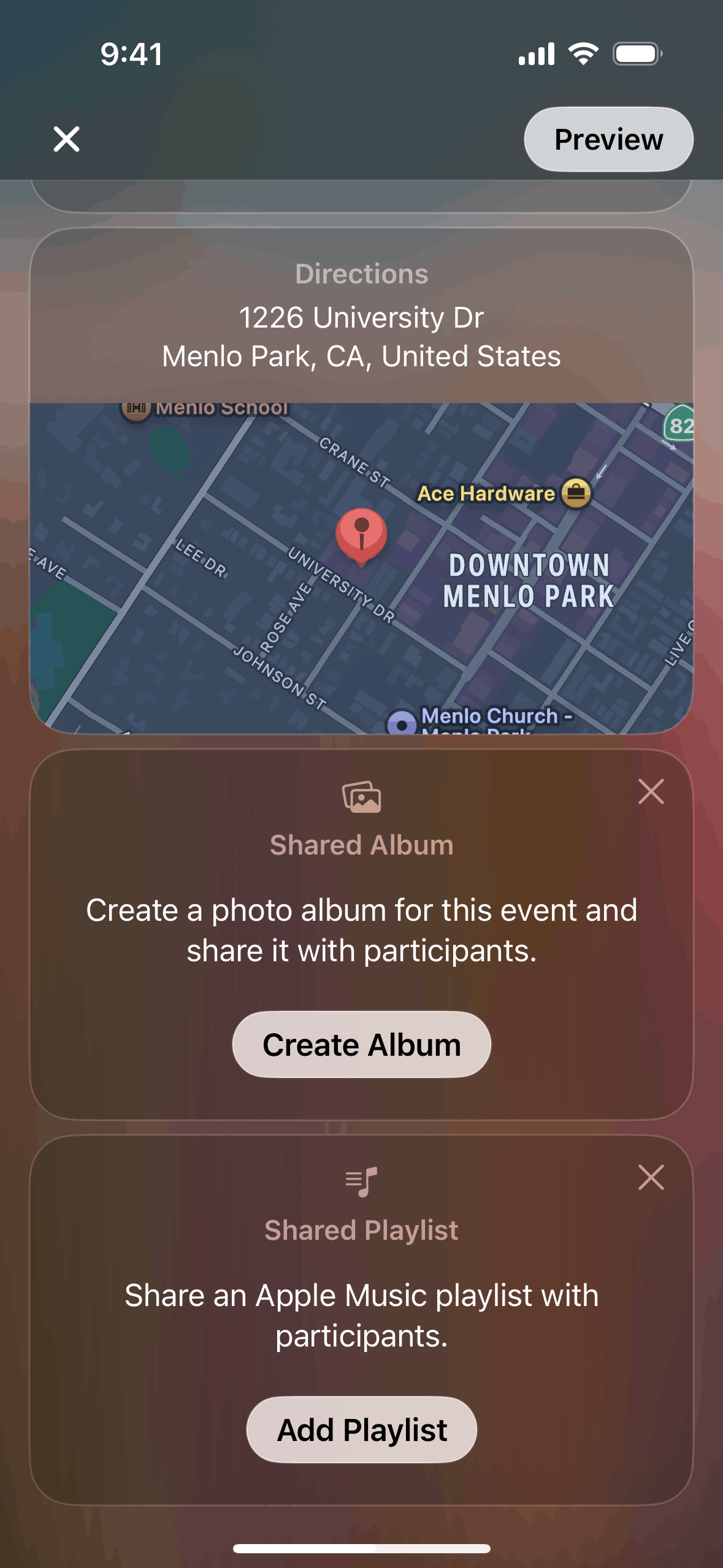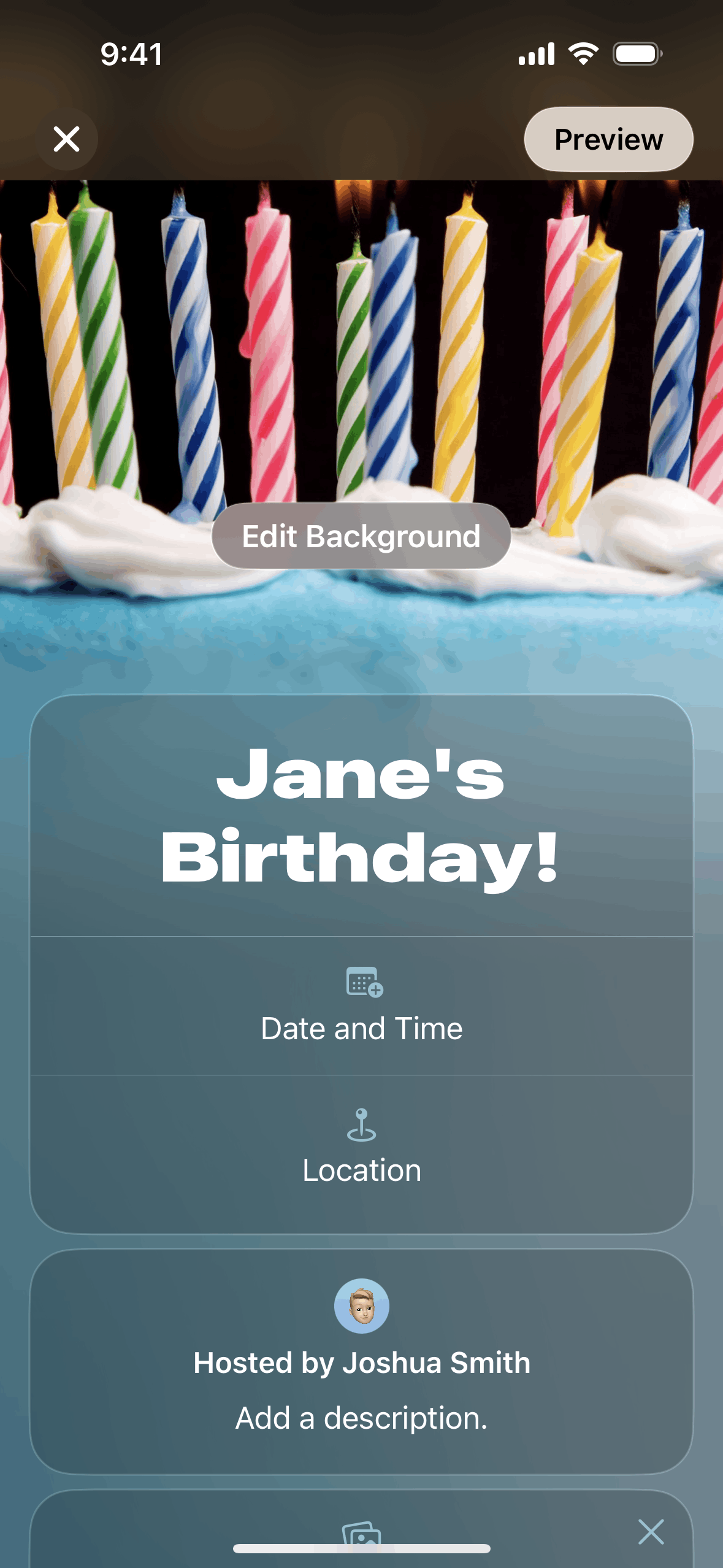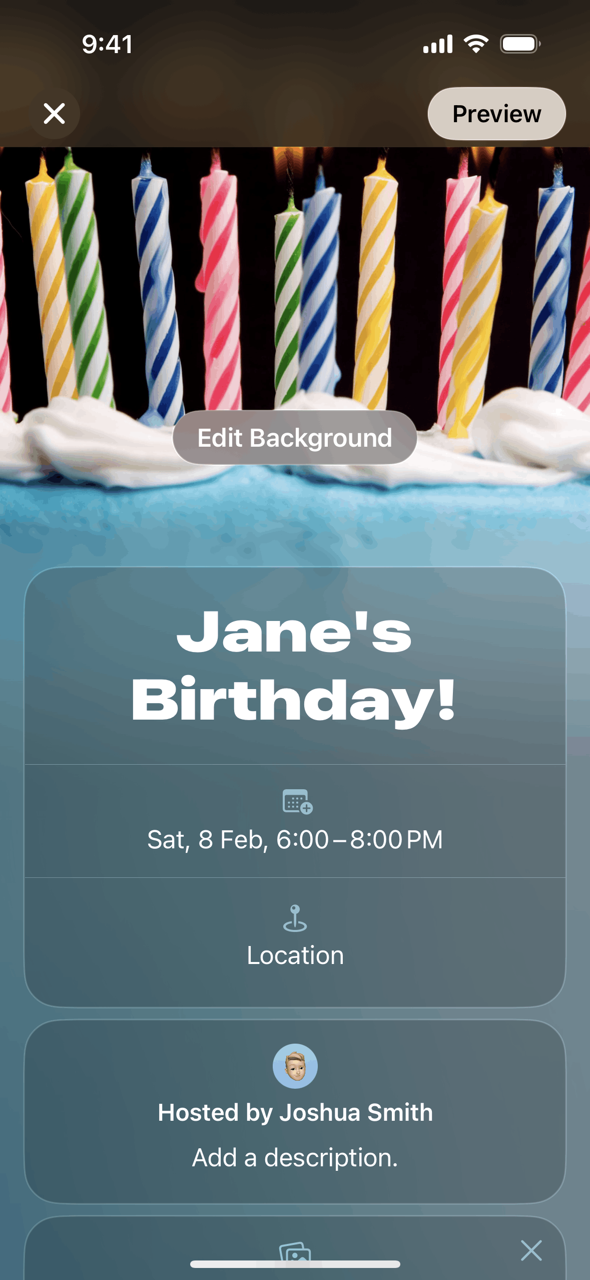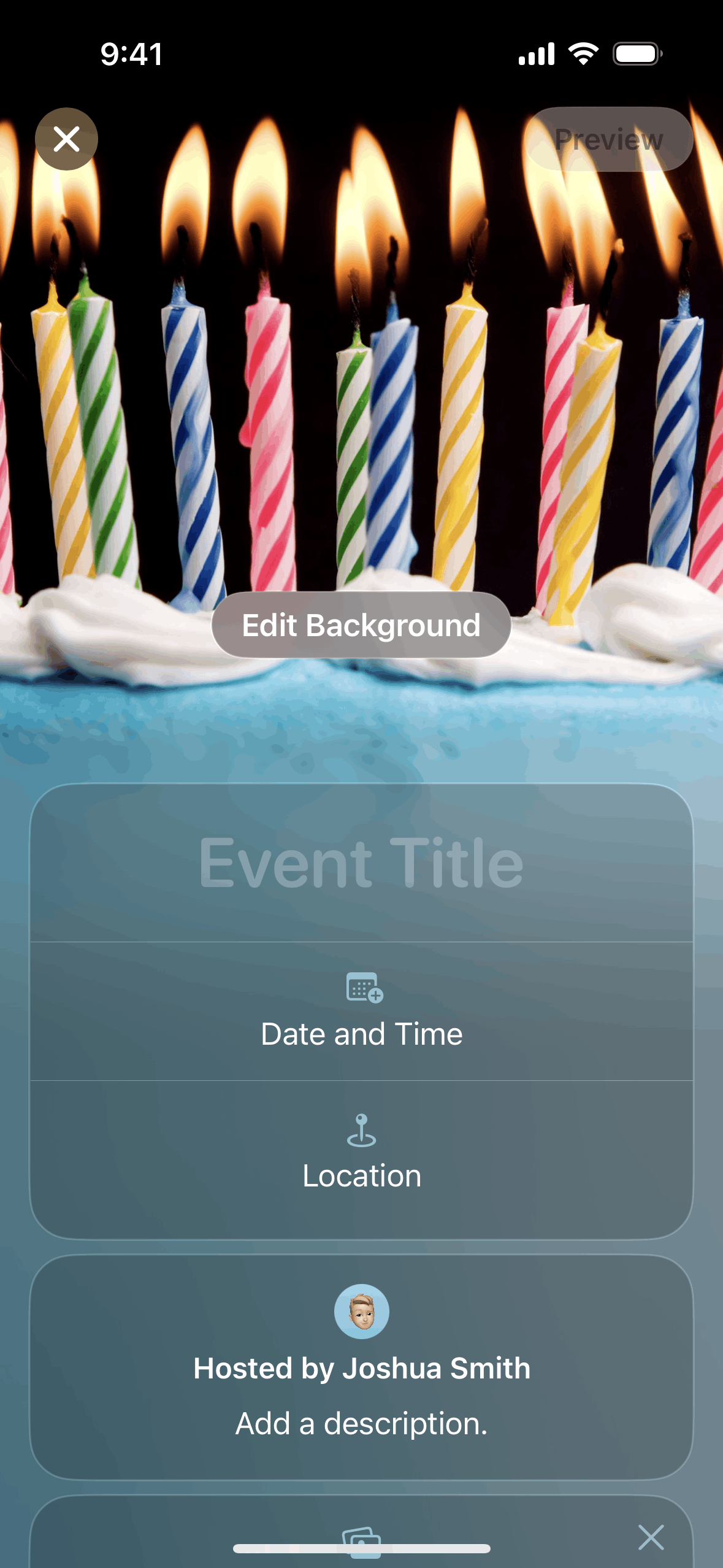 The user creates an event by adding details and inviting guests. The created event is then displayed in the upcoming events list.