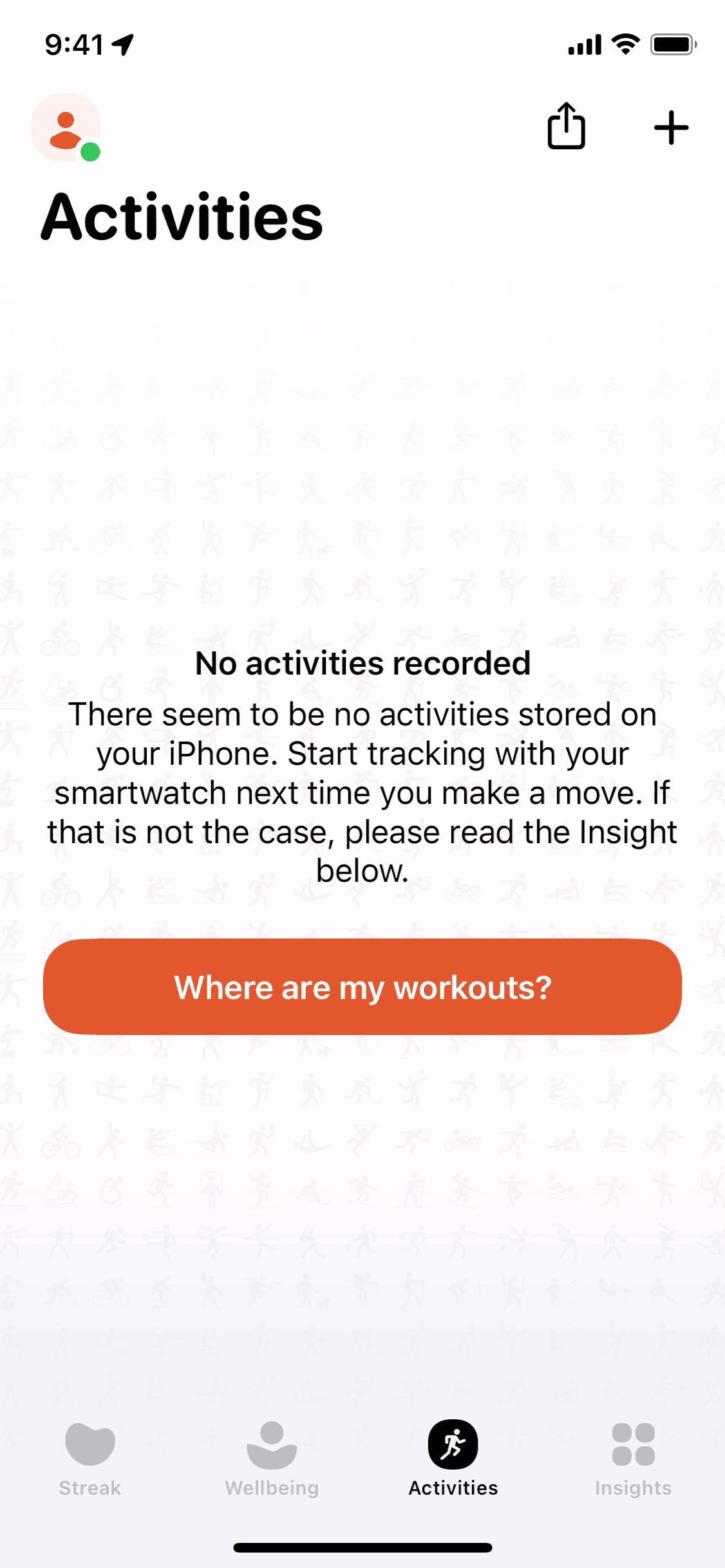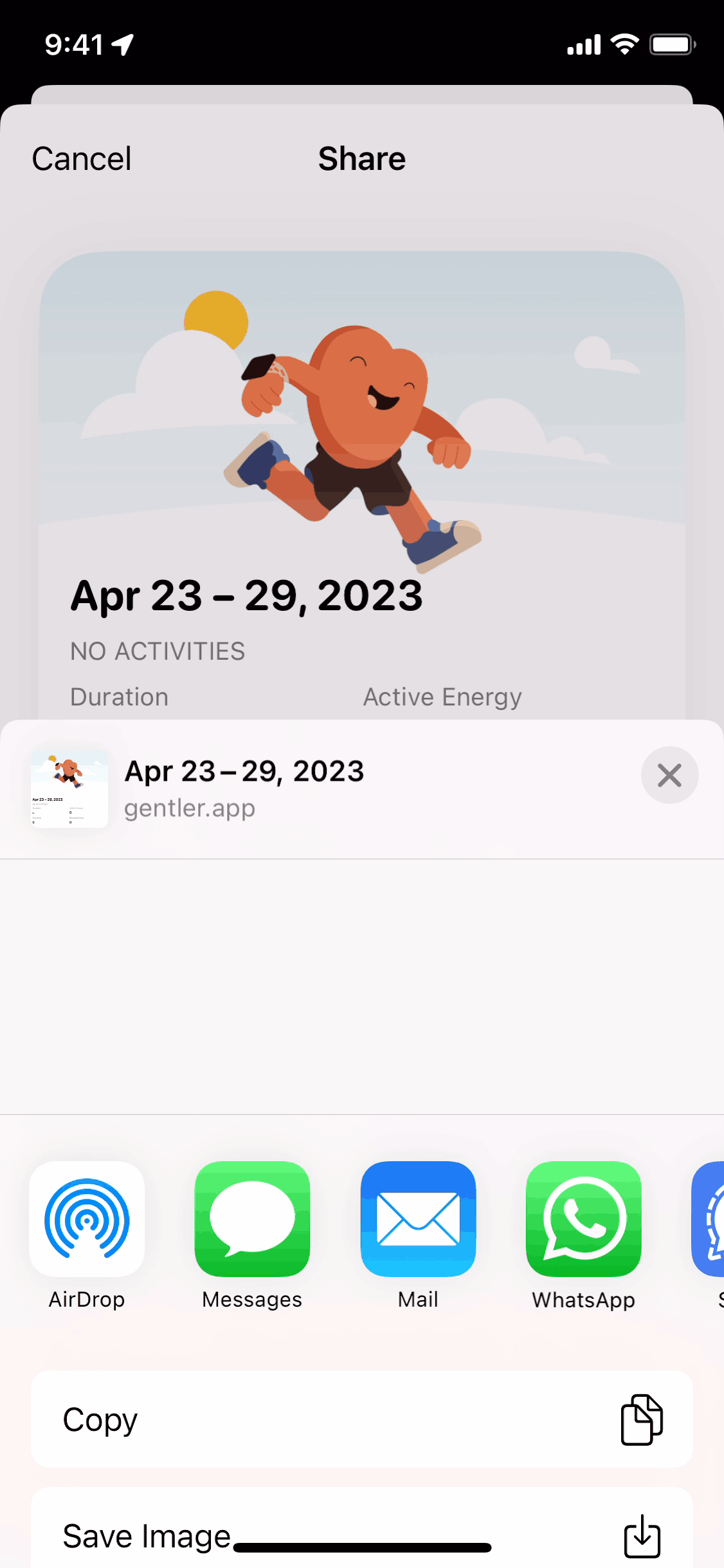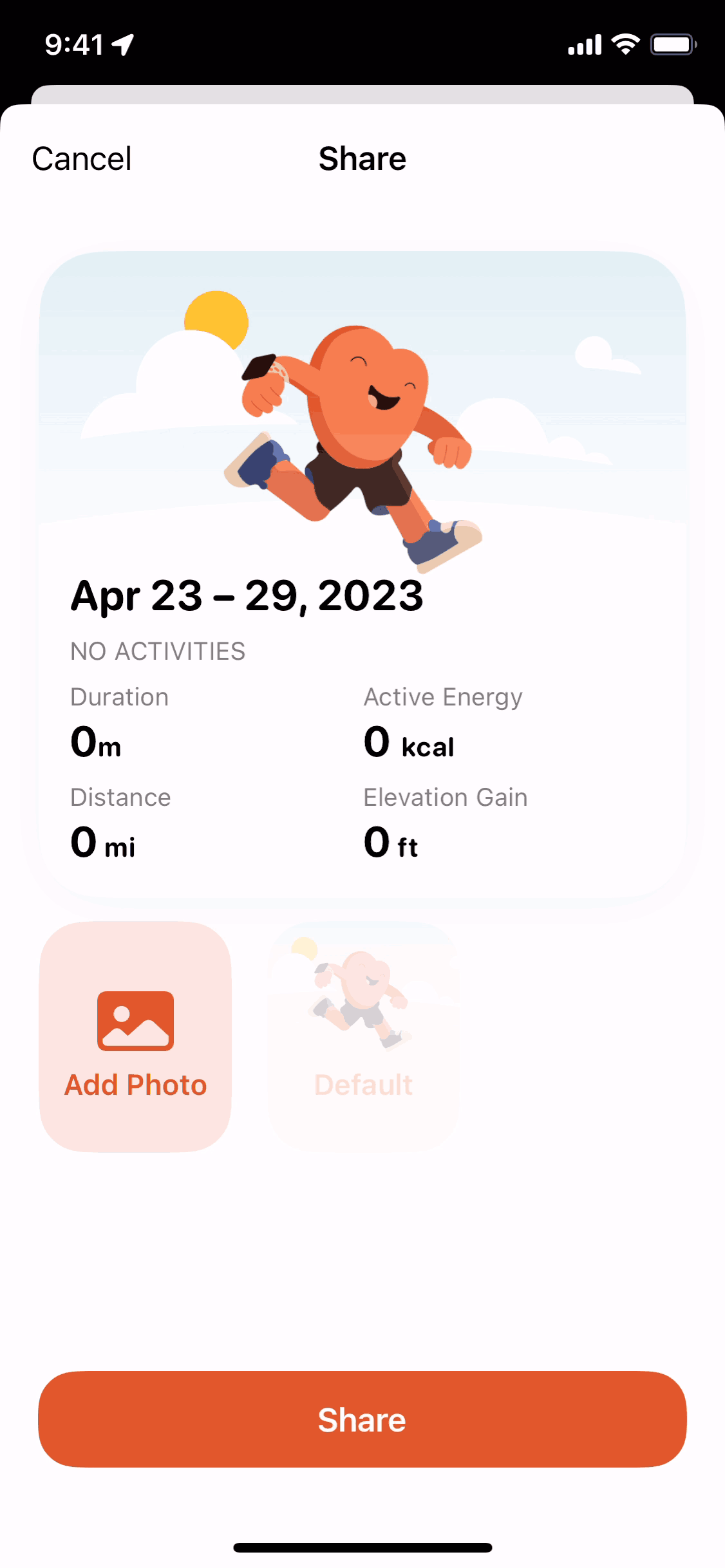 The user flow demonstrates sharing an activity summary. Even with no activities recorded, a shareable summary is available.