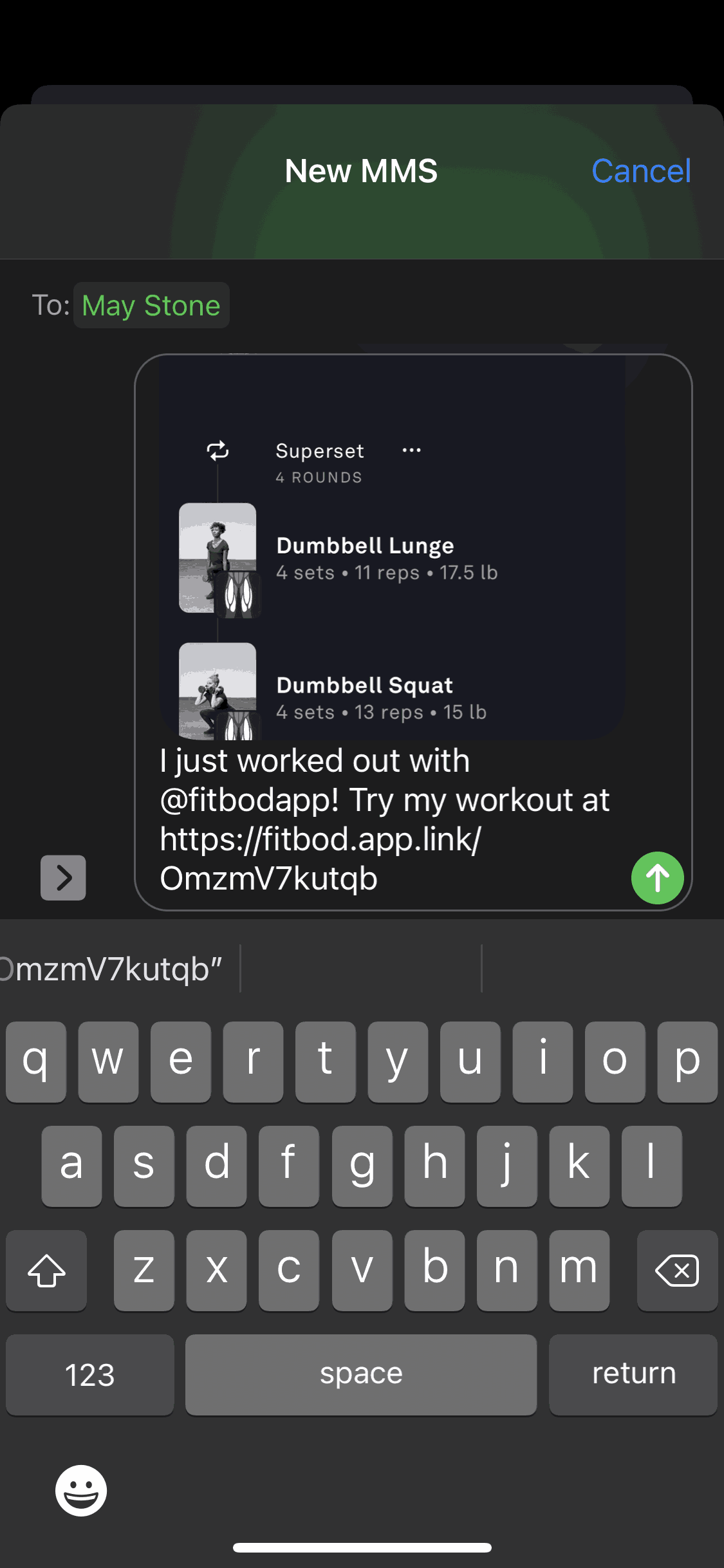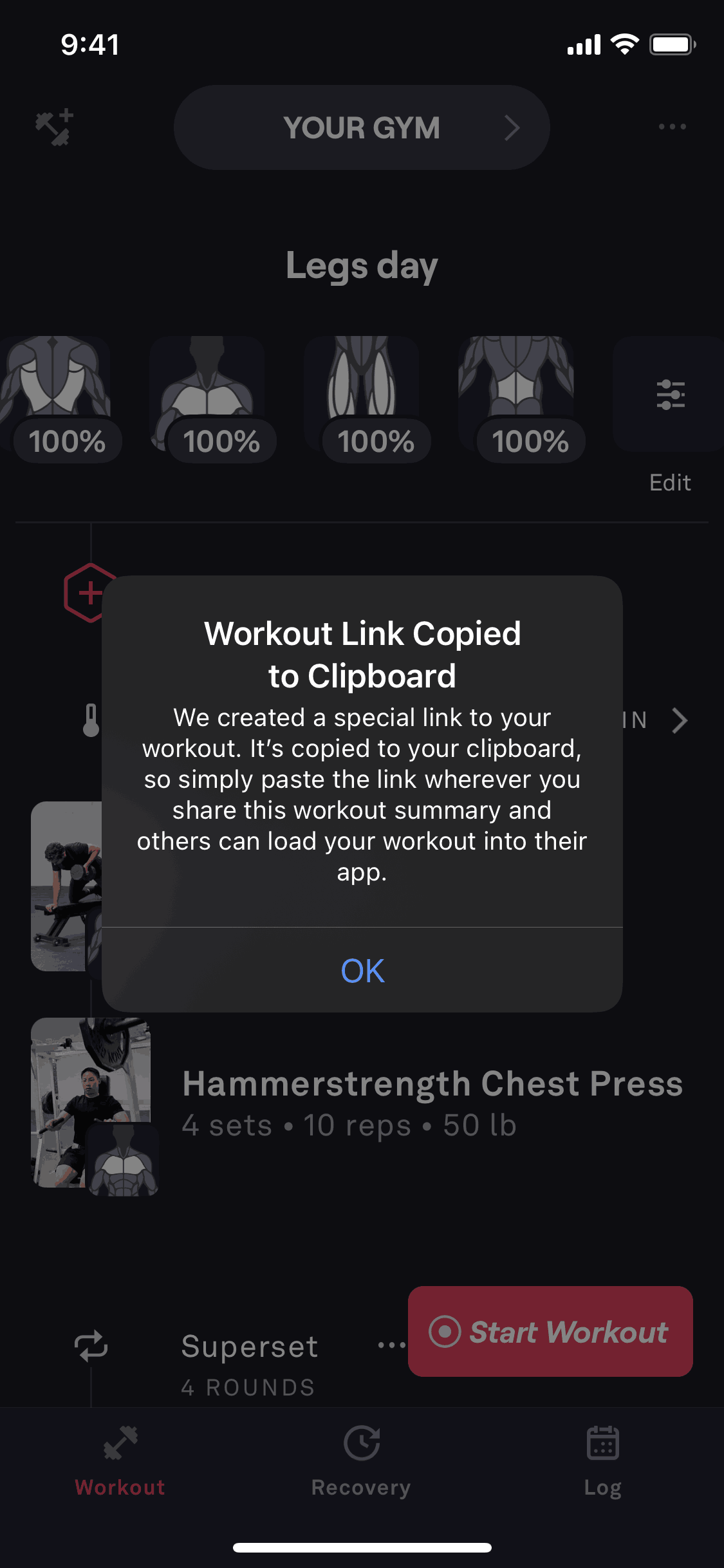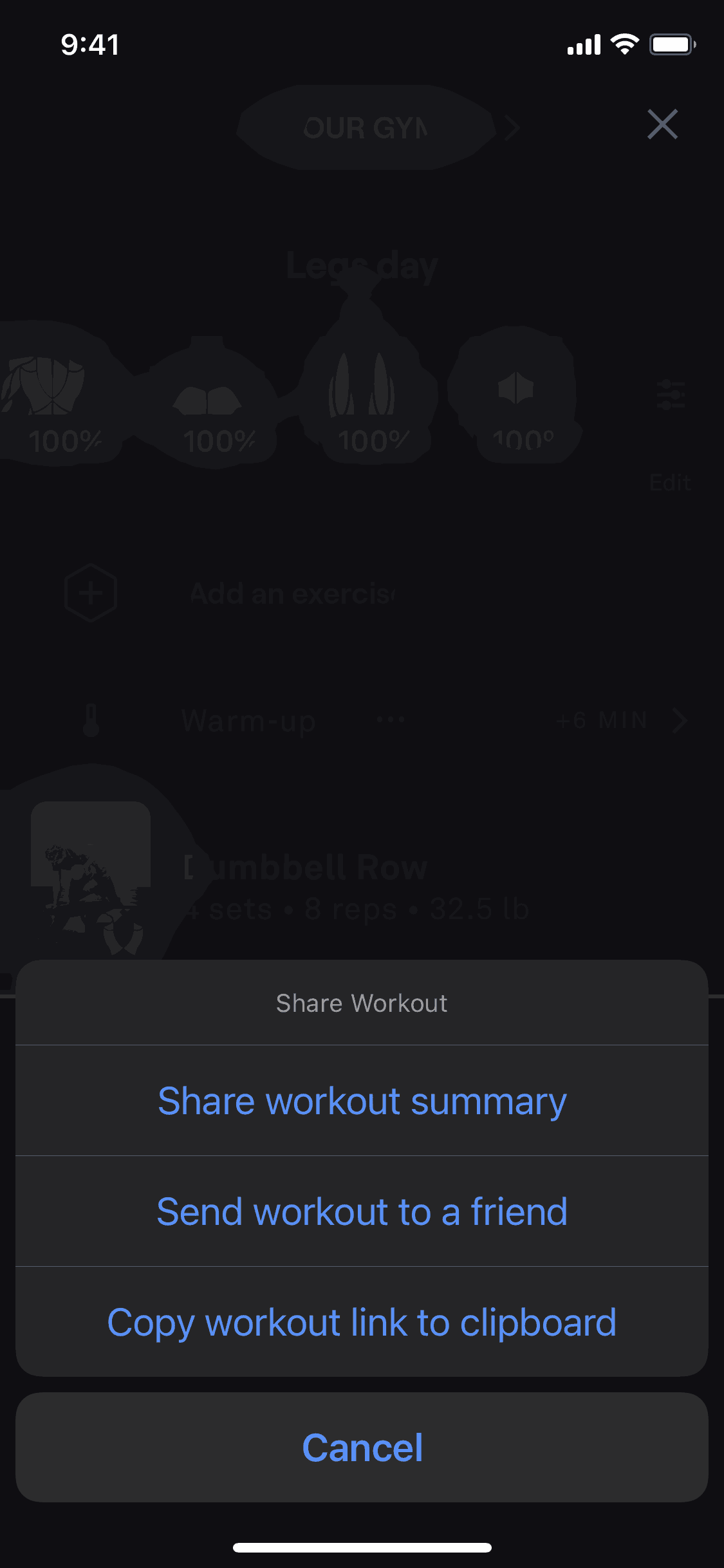 The user shares a workout summary by either copying the link or sending it to a friend. The flow starts and ends on the workout summary.
