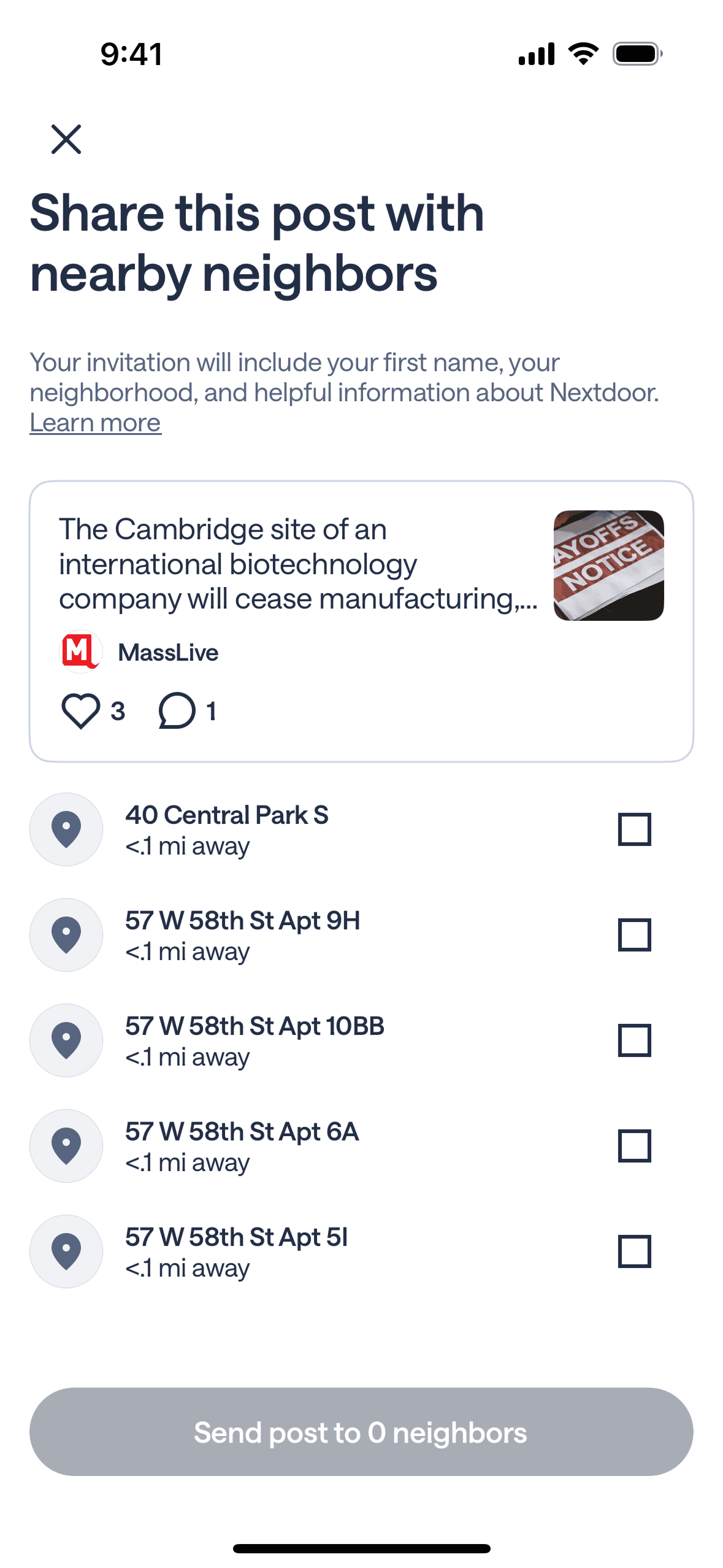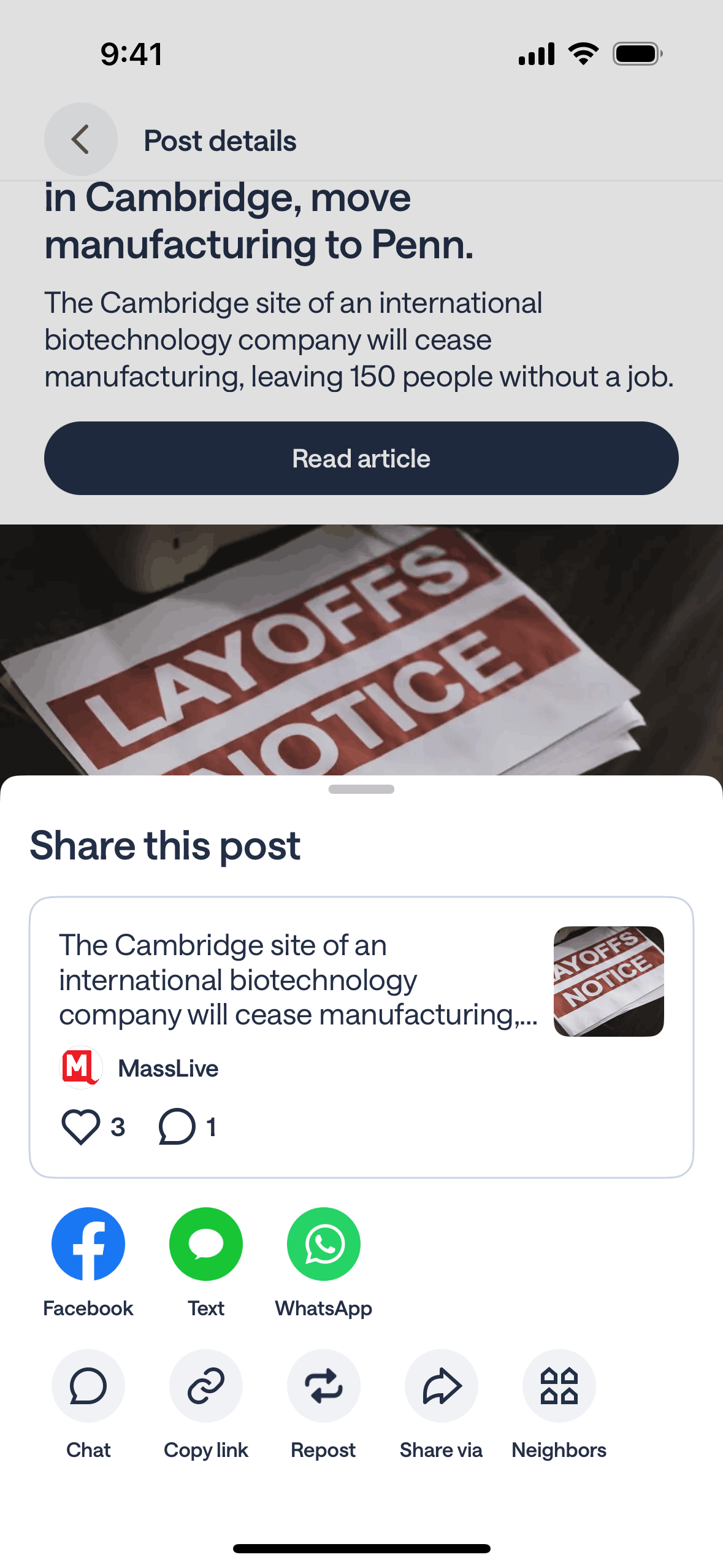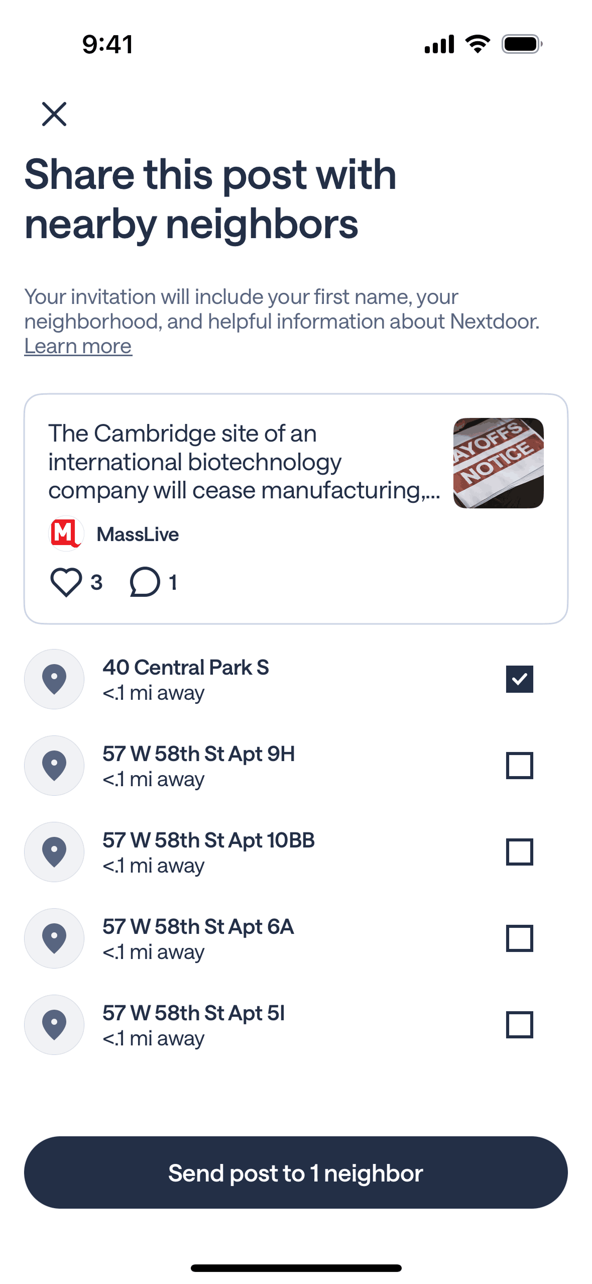 The user shares a post with a nearby neighbor. The flow involves selecting the share option, choosing neighbors, and confirming the action.