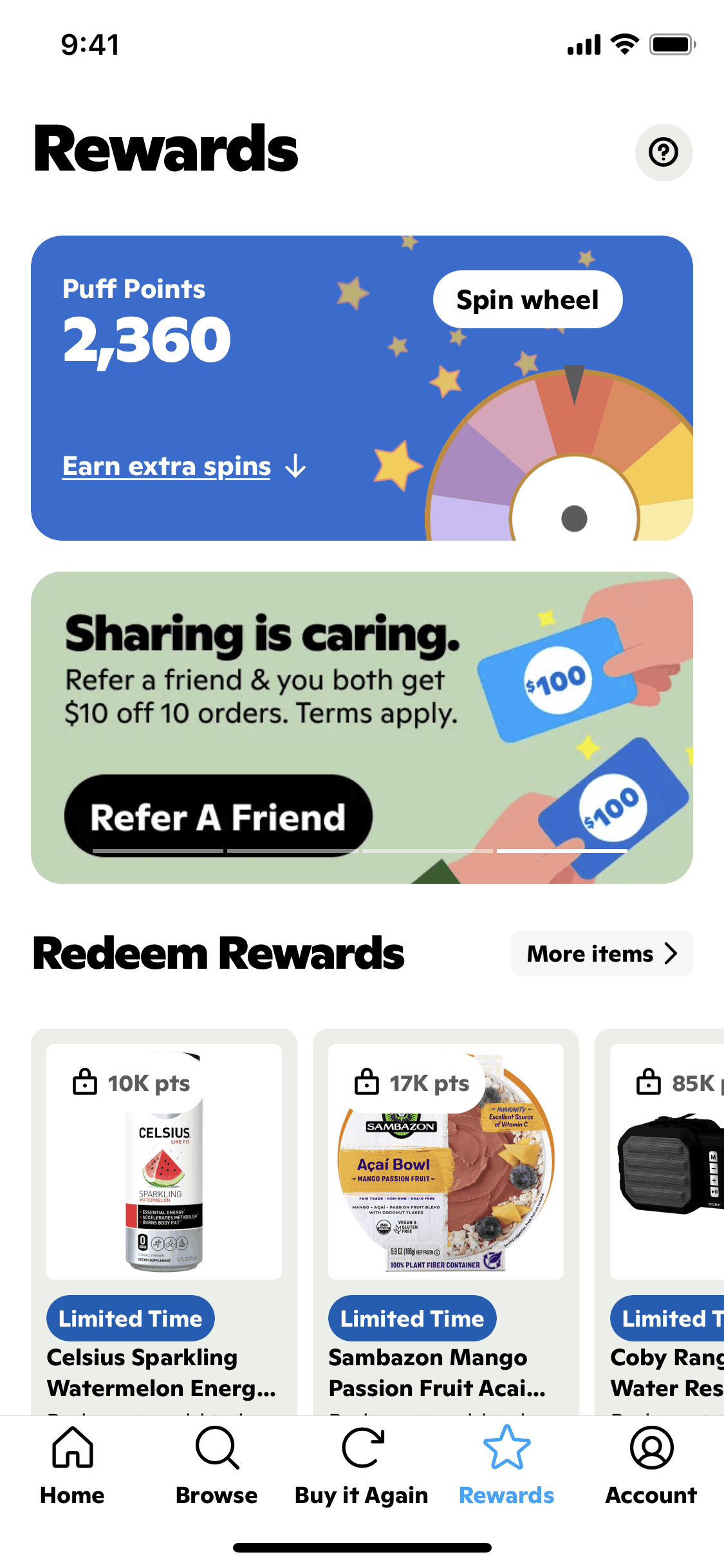 The user flow showcases the process of referring a friend, starting from the rewards page and ending with the share sheet. The user is presented with different options to share the referral link.