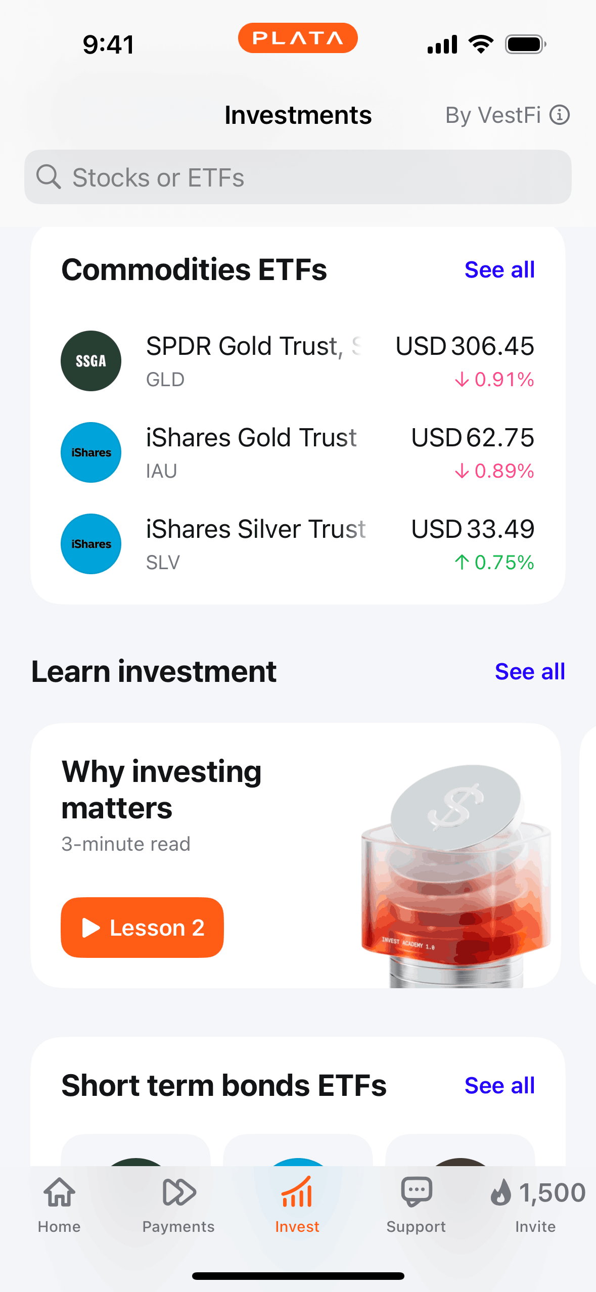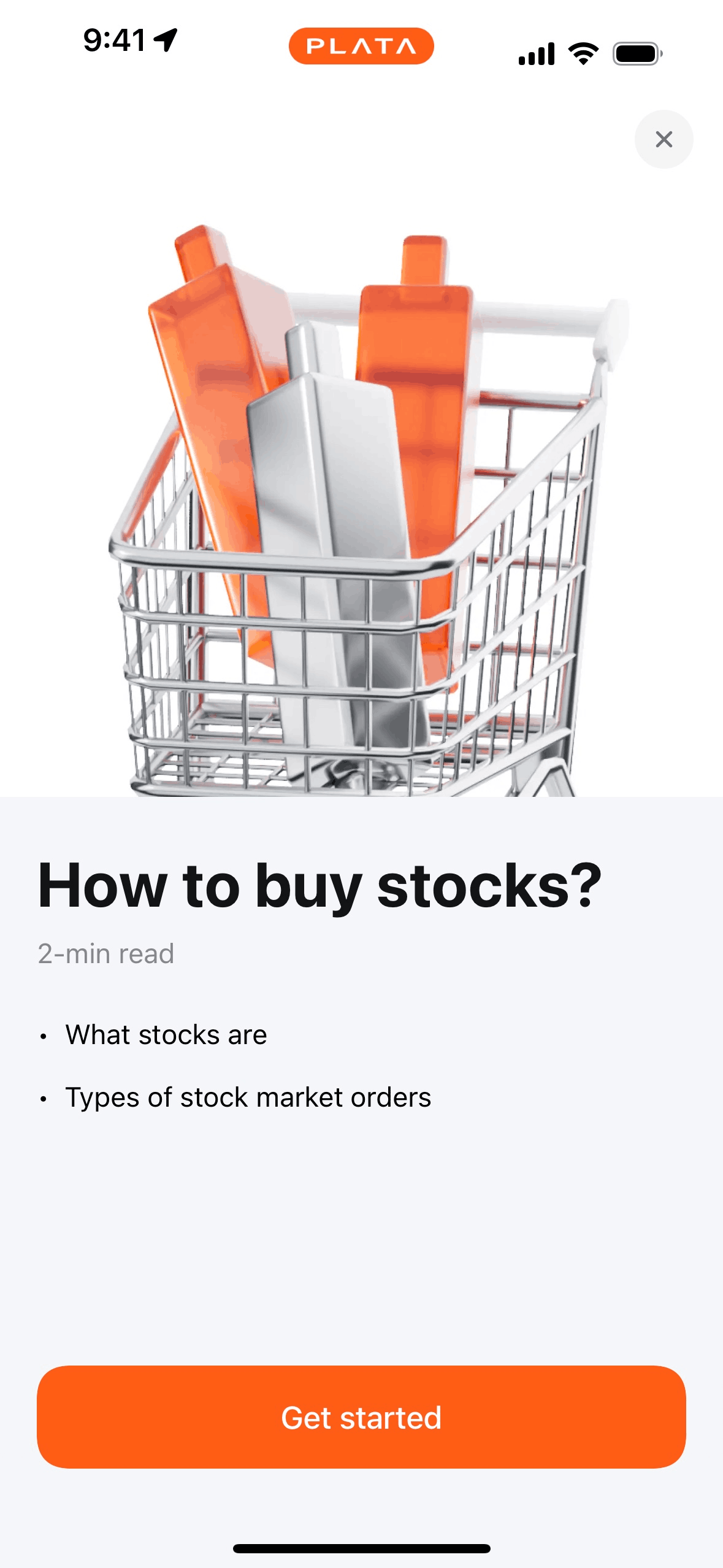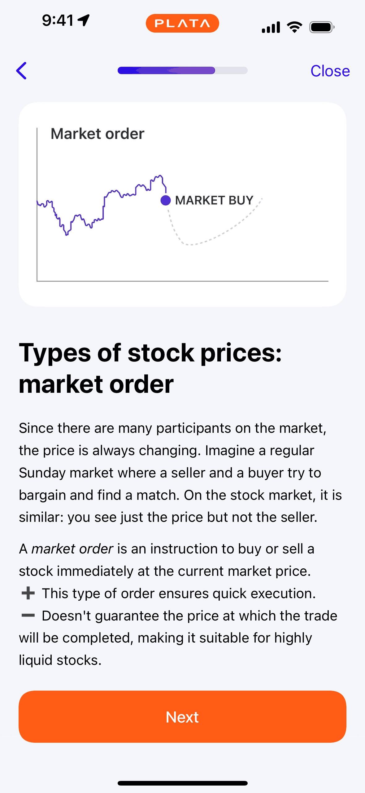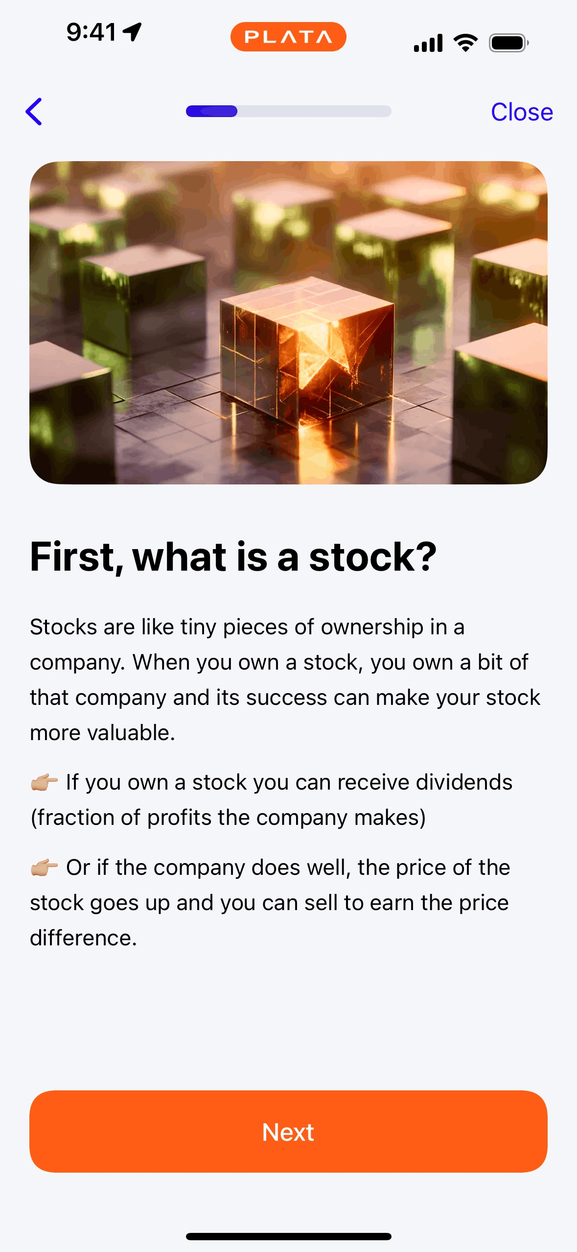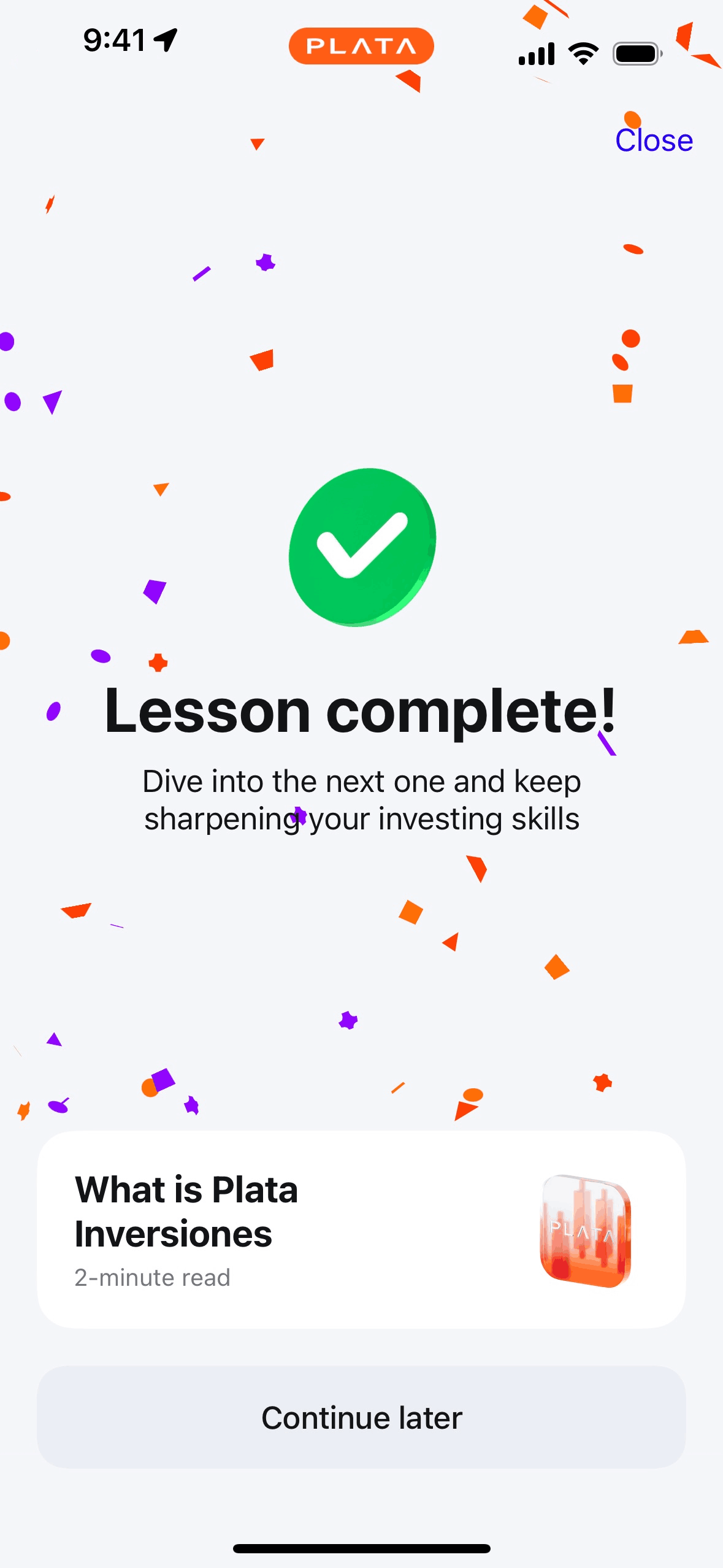 The user flow demonstrates completing a lesson within an investment app. It starts from the investment dashboard and ends with a lesson completion confirmation.