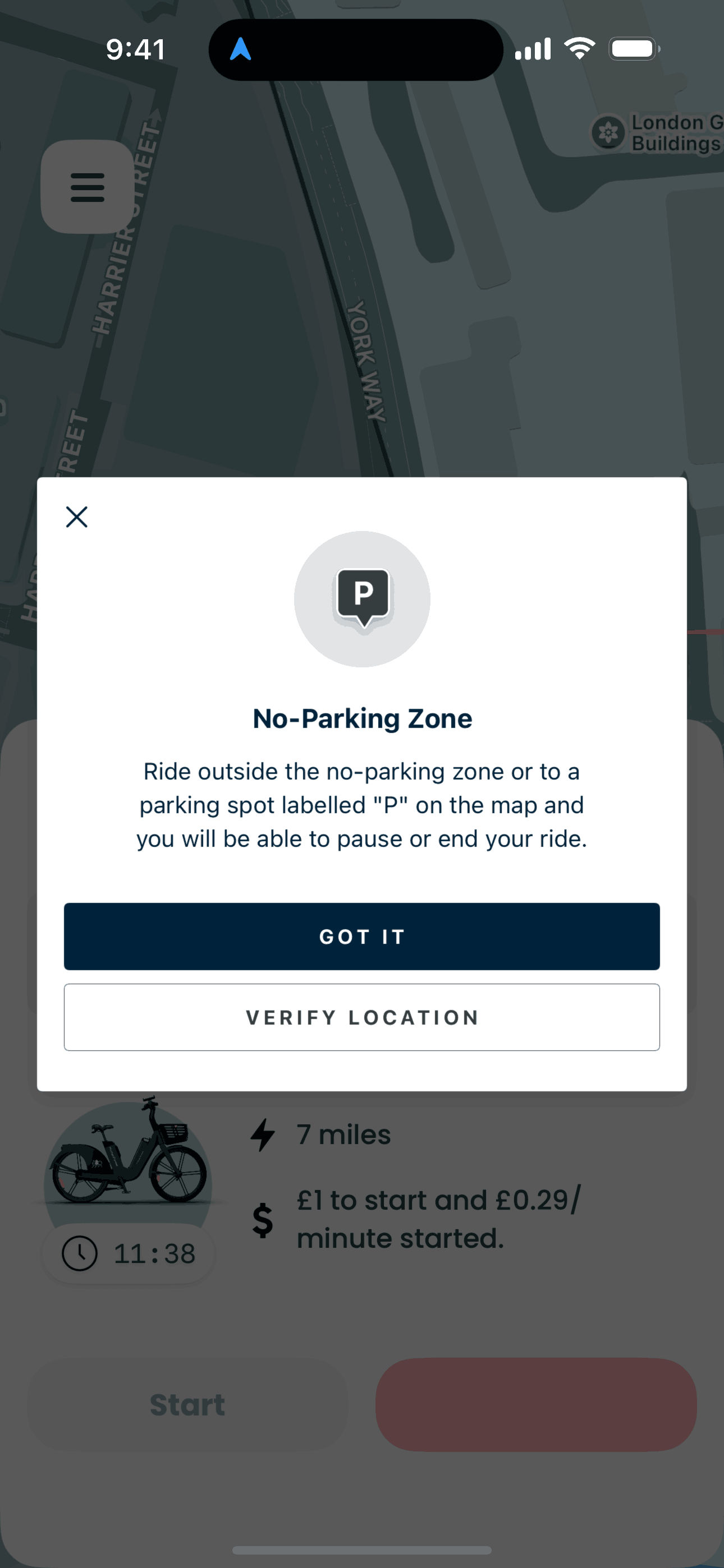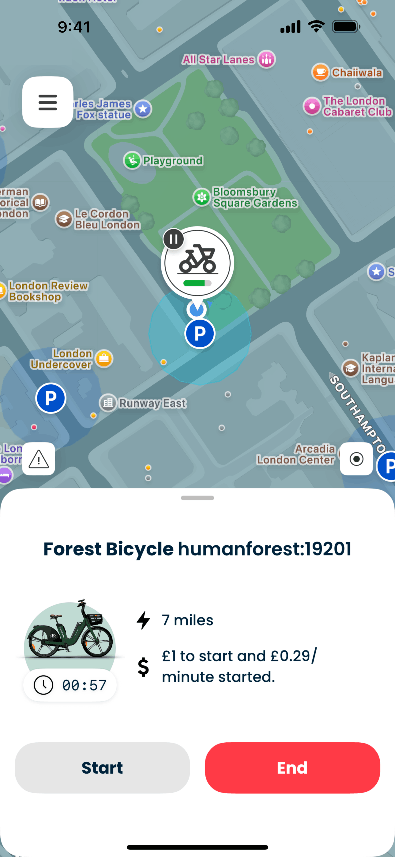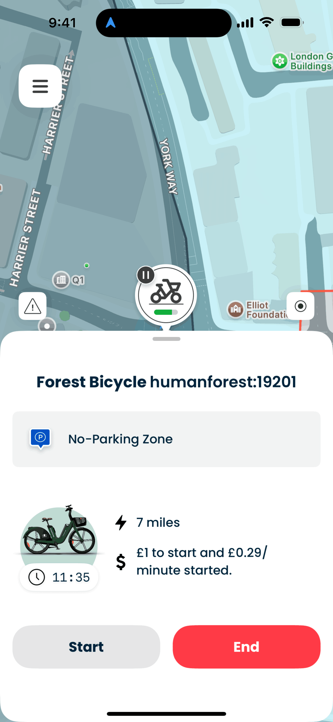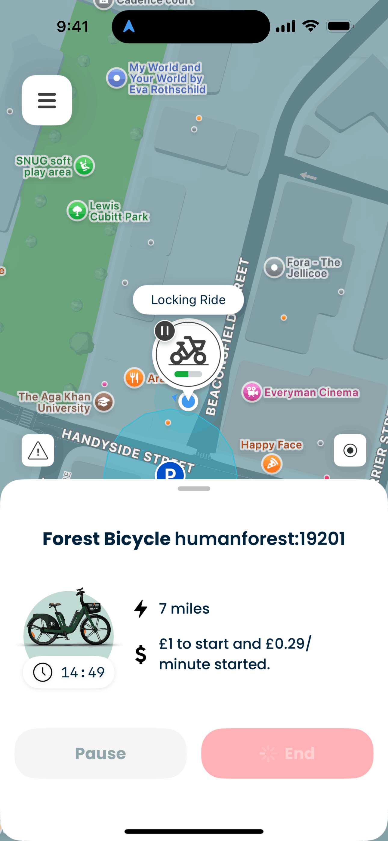 The user attempts to end a bicycle ride, is prompted to move out of a no-parking zone, and then completes the ride. A confirmation screen with ride details is shown.