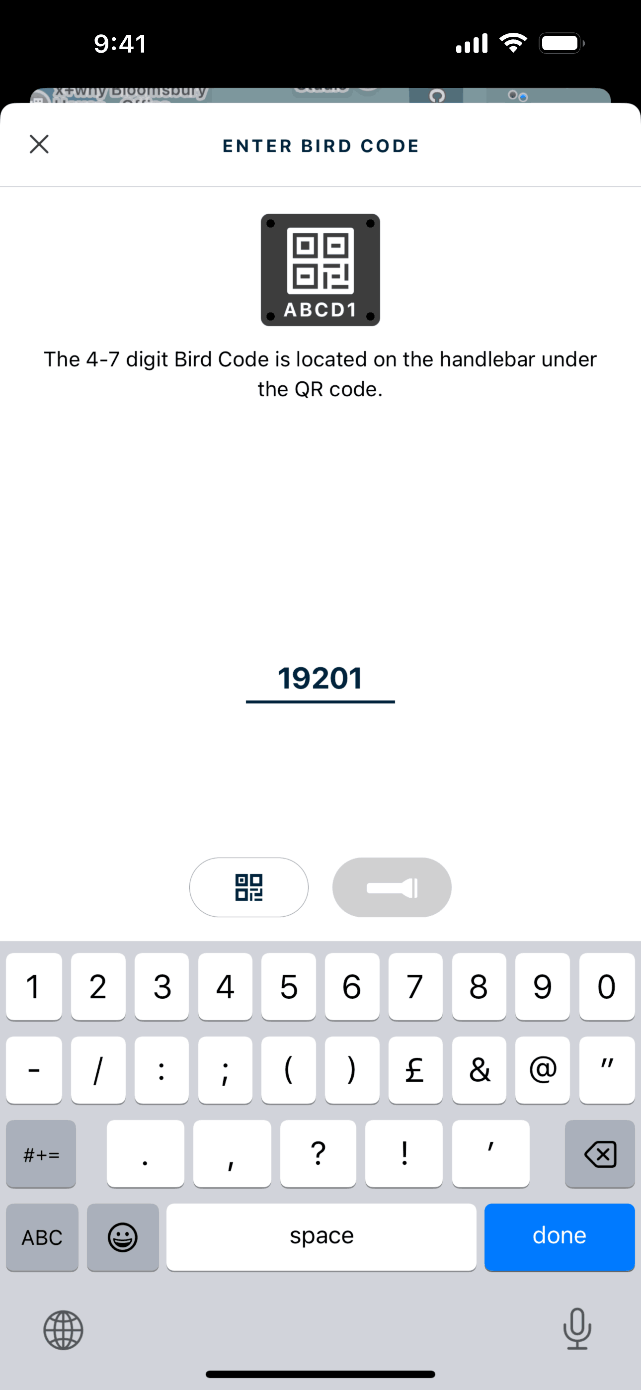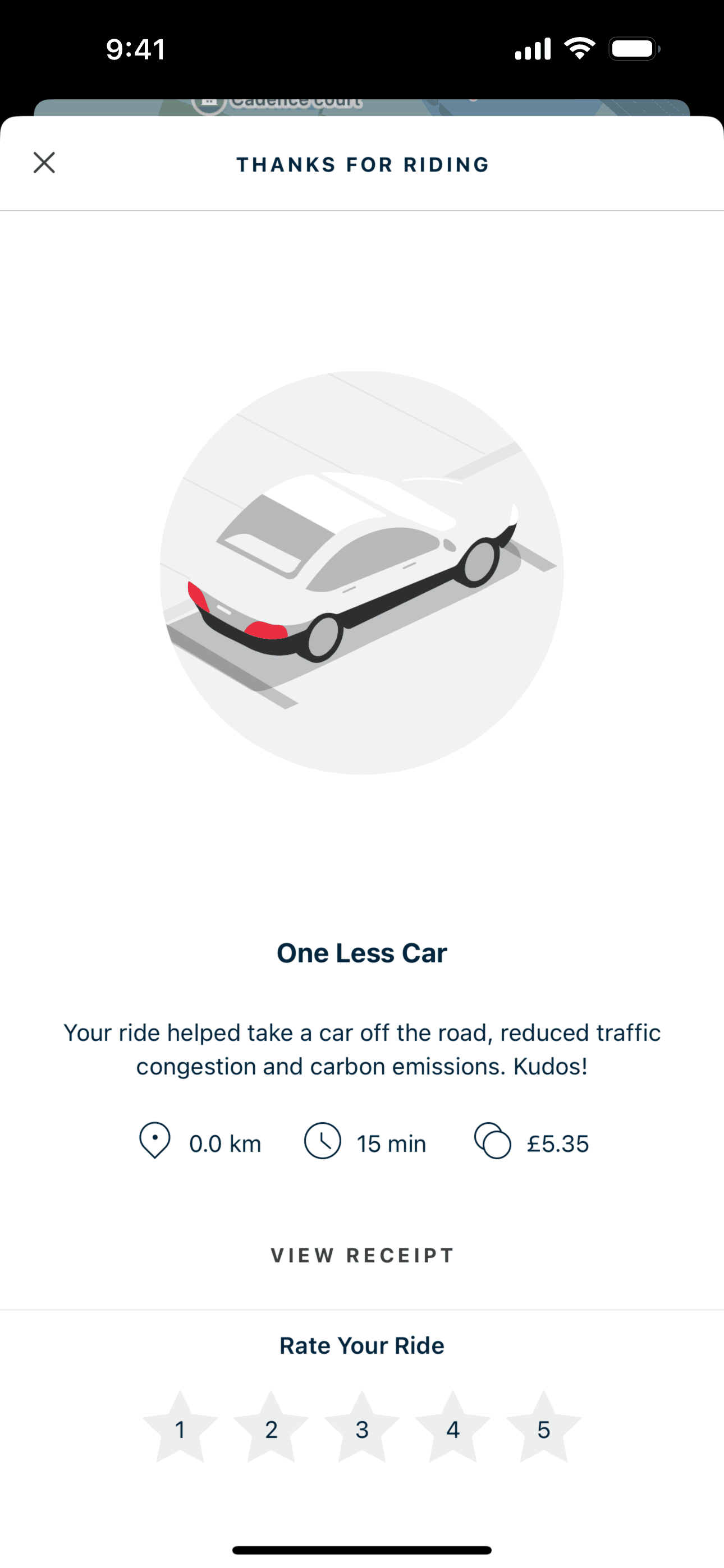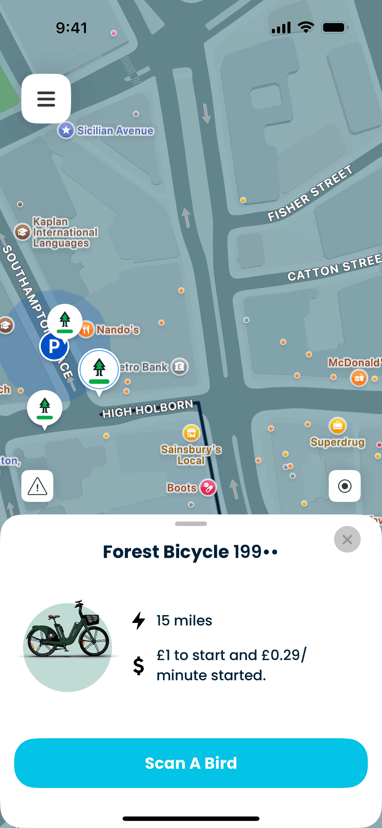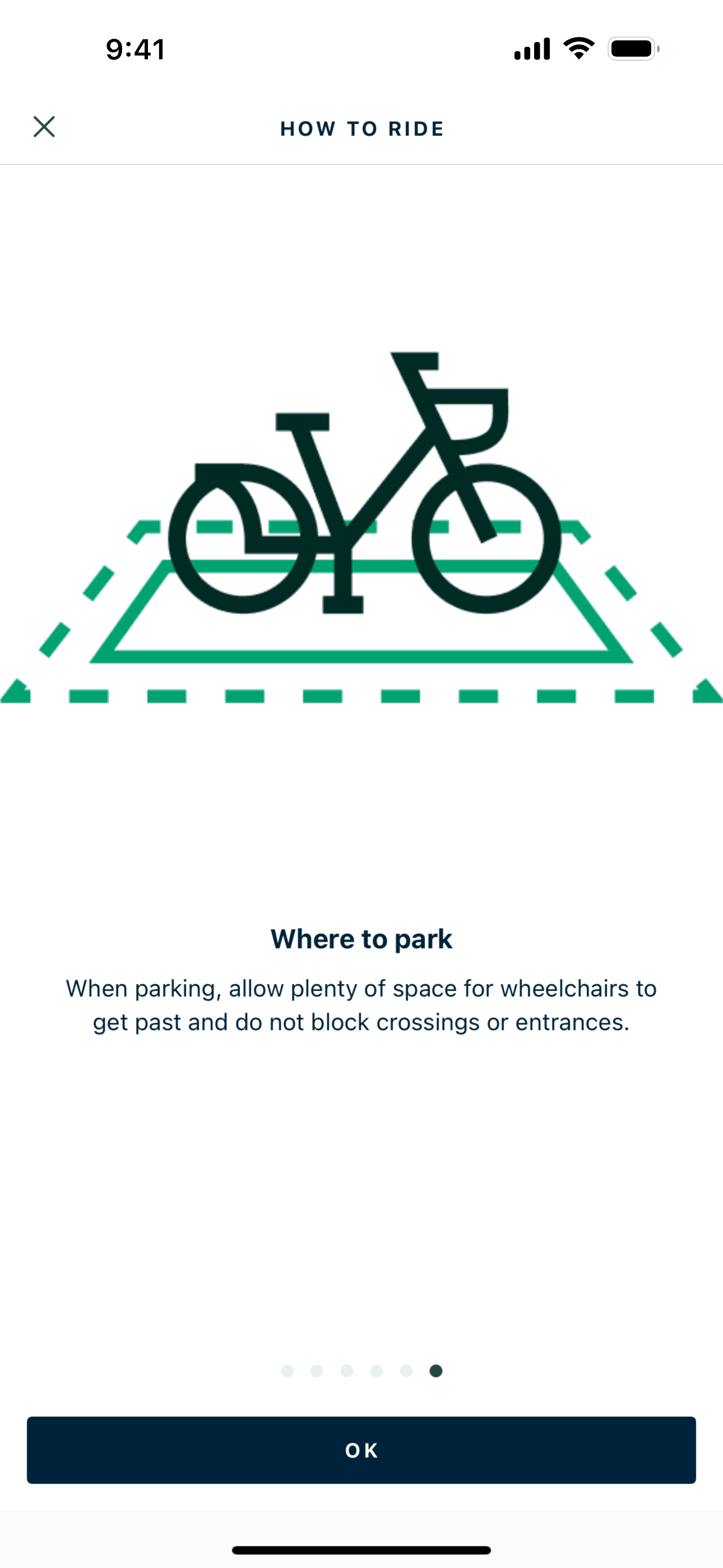 The user attempts to end a bicycle ride, is prompted to move out of a no-parking zone, and then completes the ride. A confirmation screen with ride details is shown.
