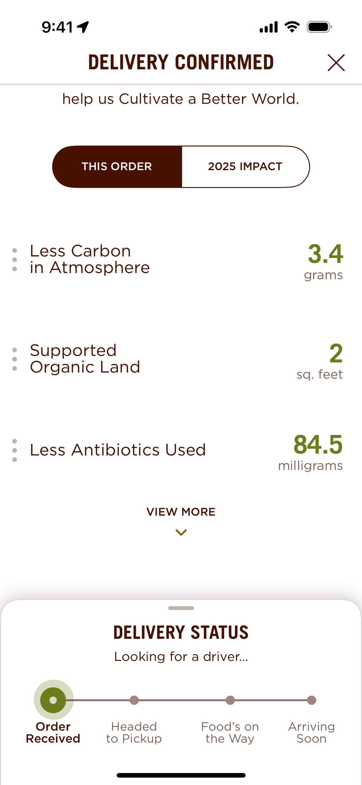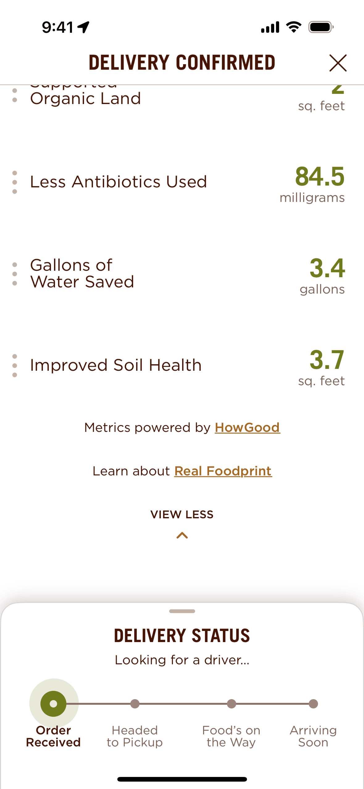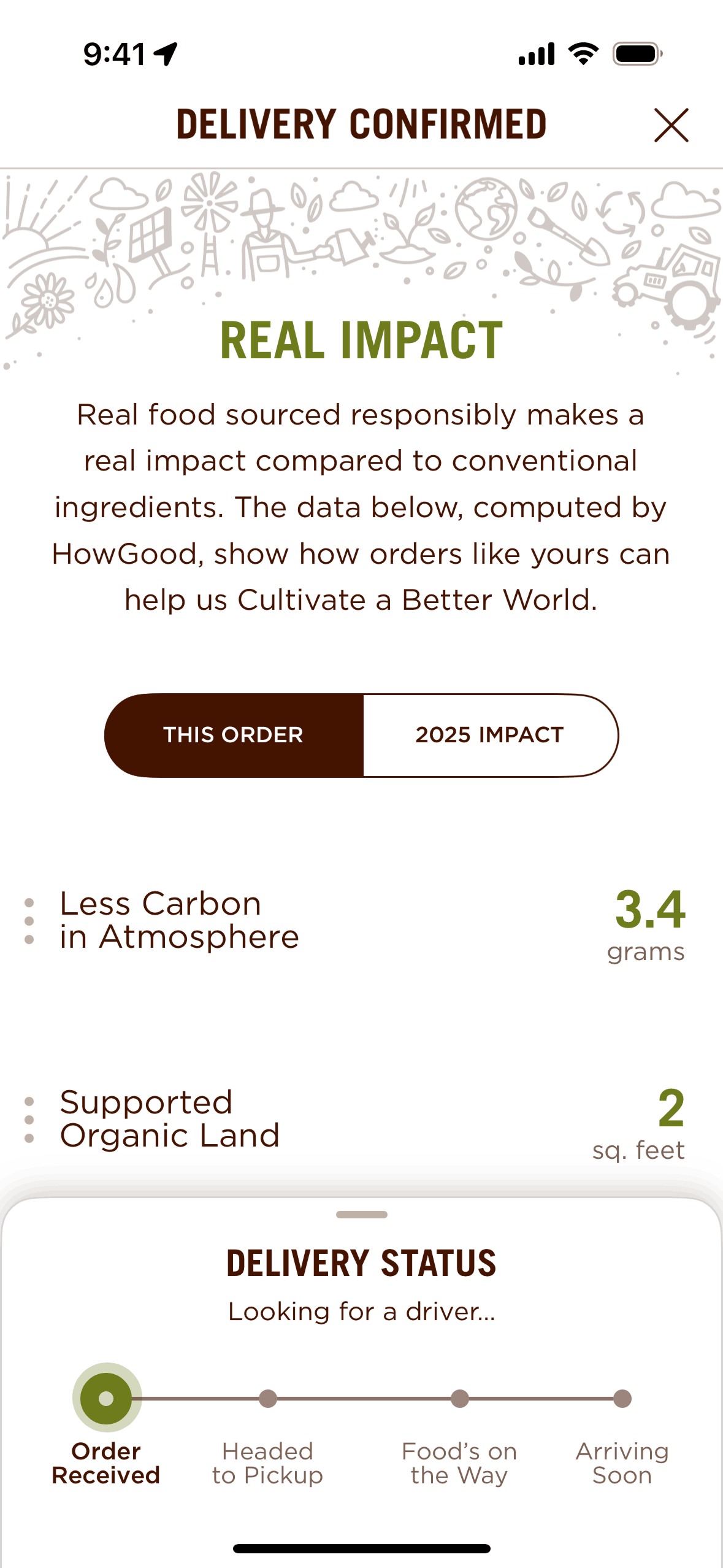The user tracks their order, views the order details, and explores the environmental impact. They can expand or collapse the impact metrics.