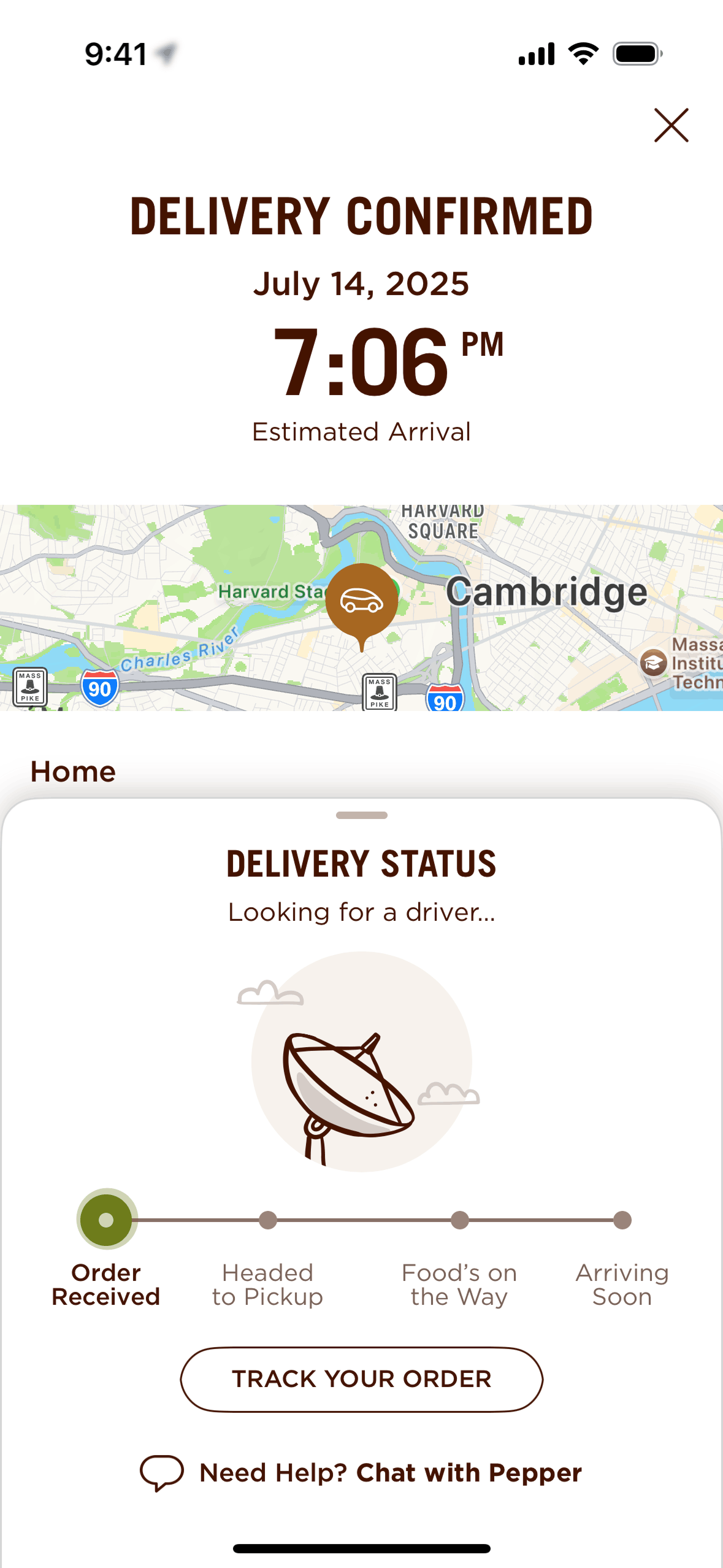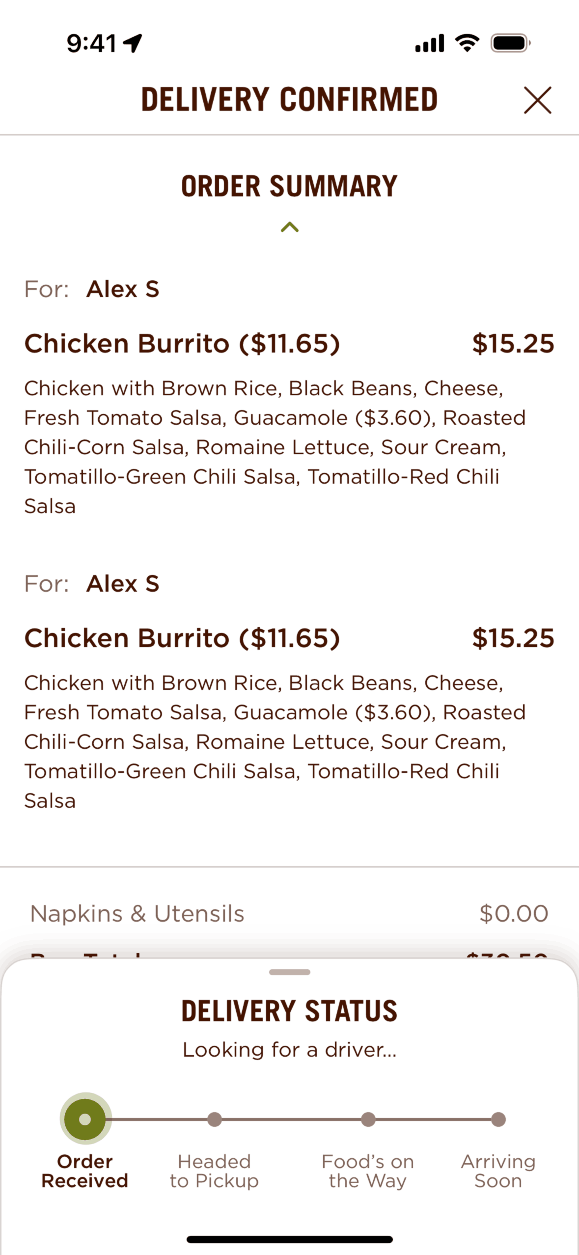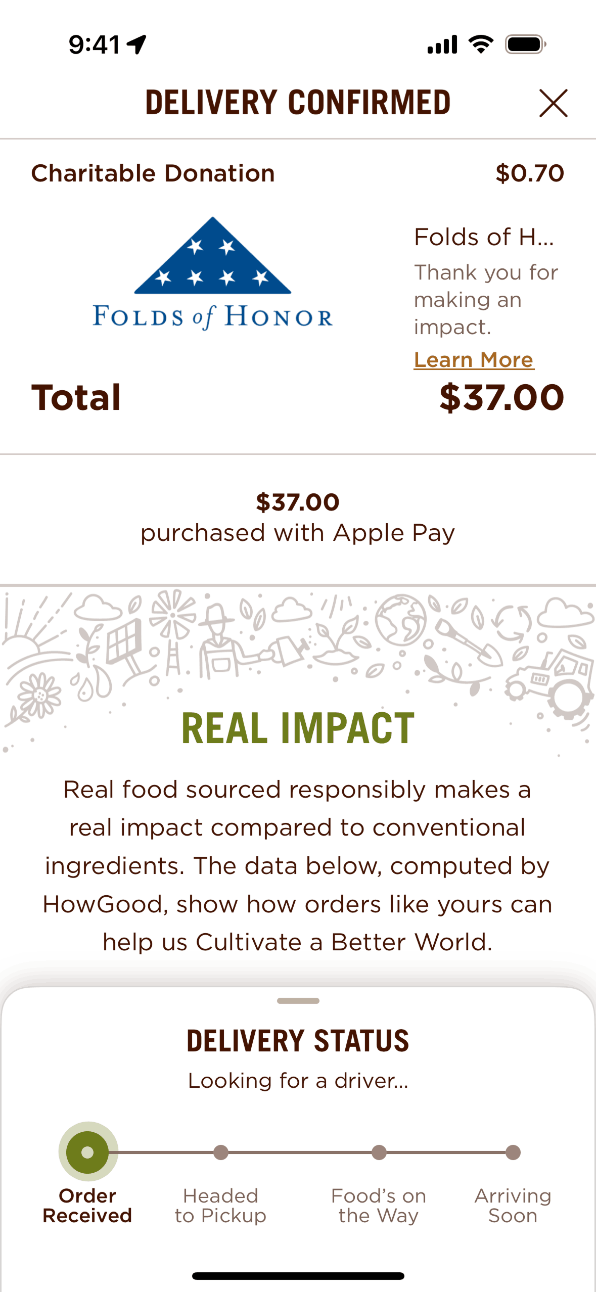The user tracks their order, views the order details, and explores the environmental impact. They can expand or collapse the impact metrics.