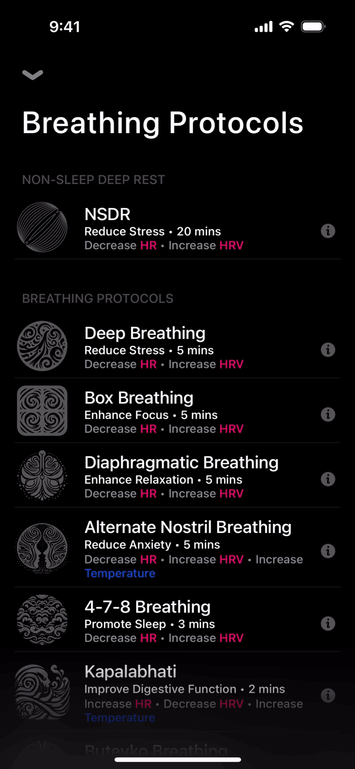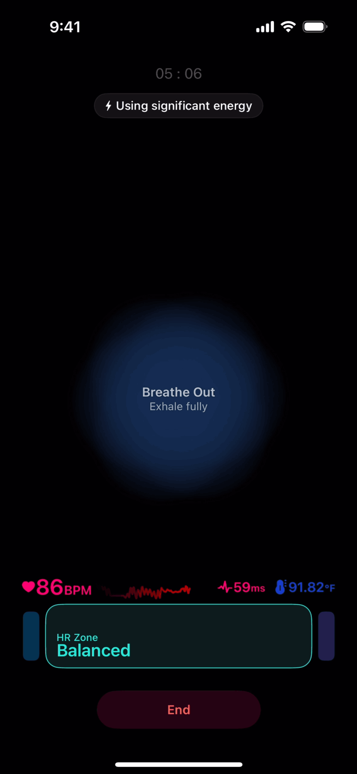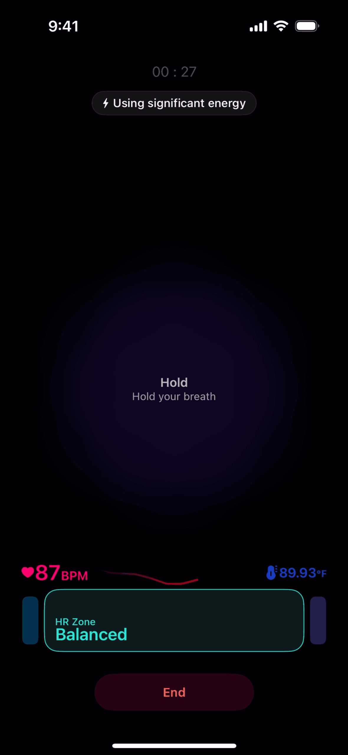 The user logs a breathwork session by selecting a protocol, performing the exercise, and viewing a session summary. The app tracks heart rate, HRV and temperature.