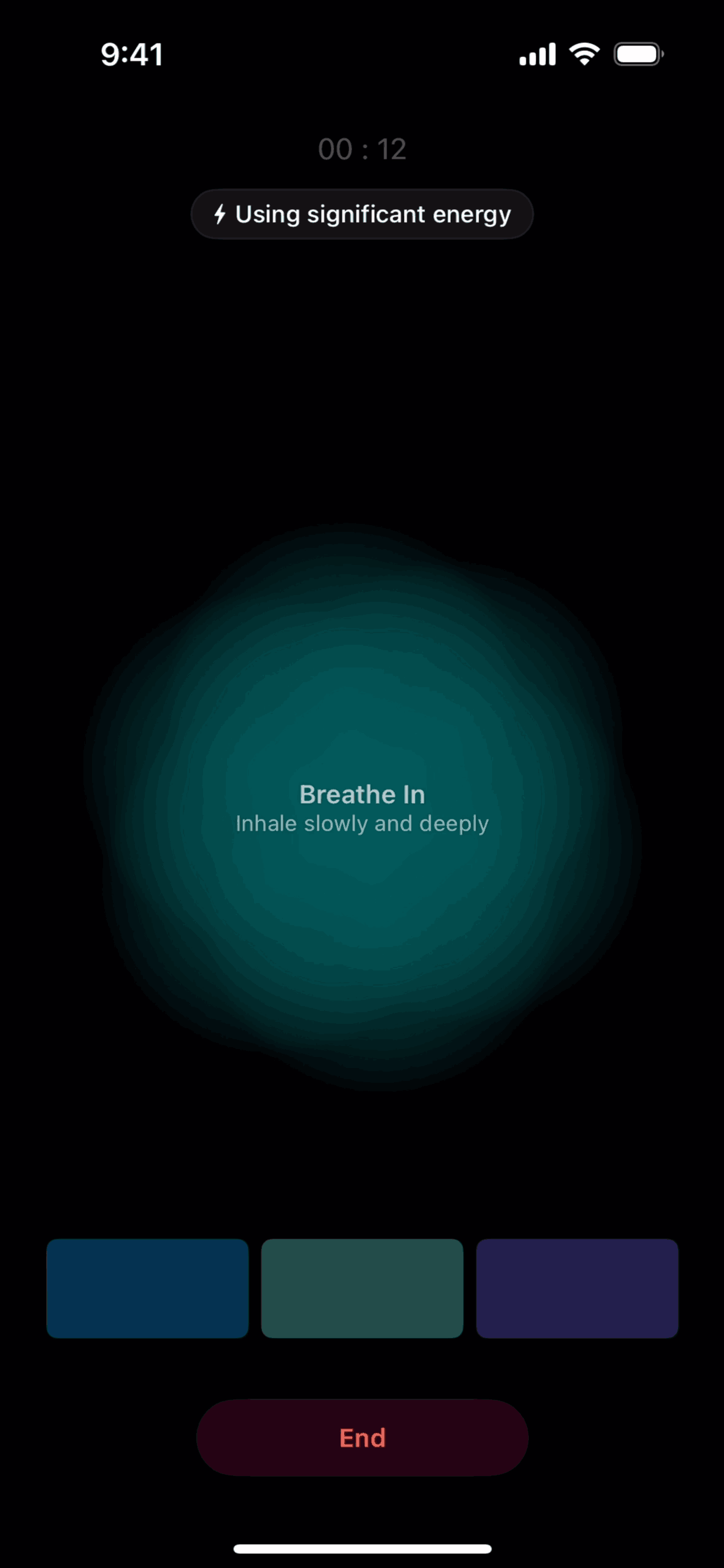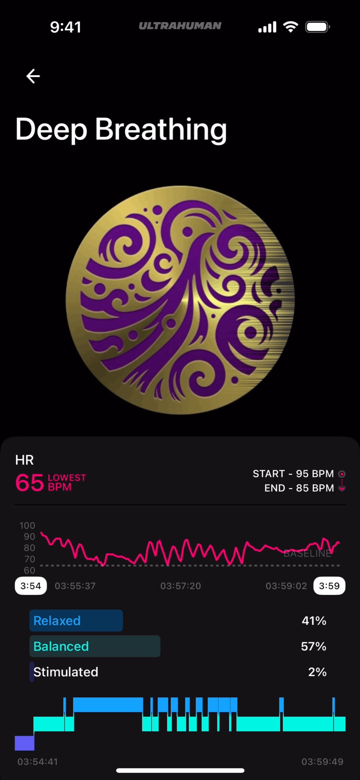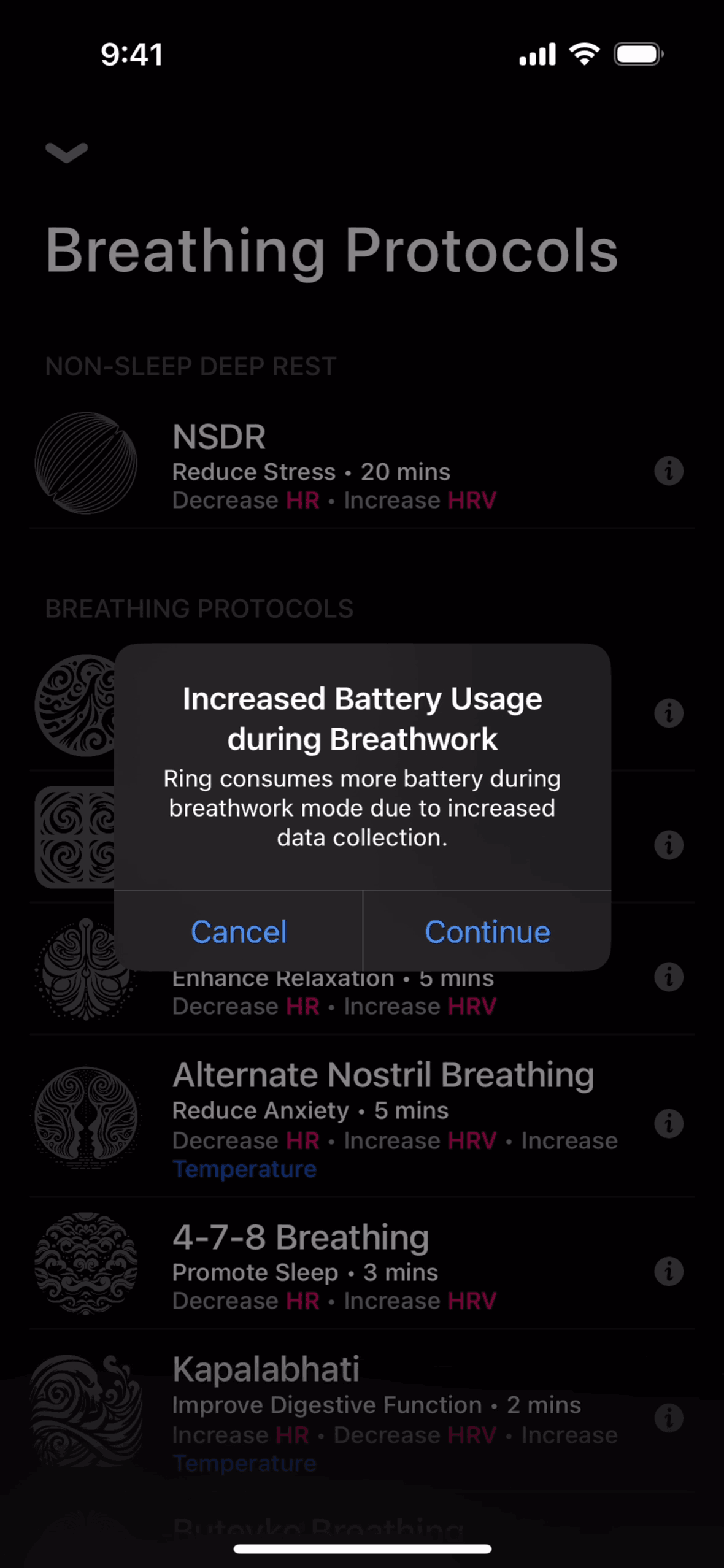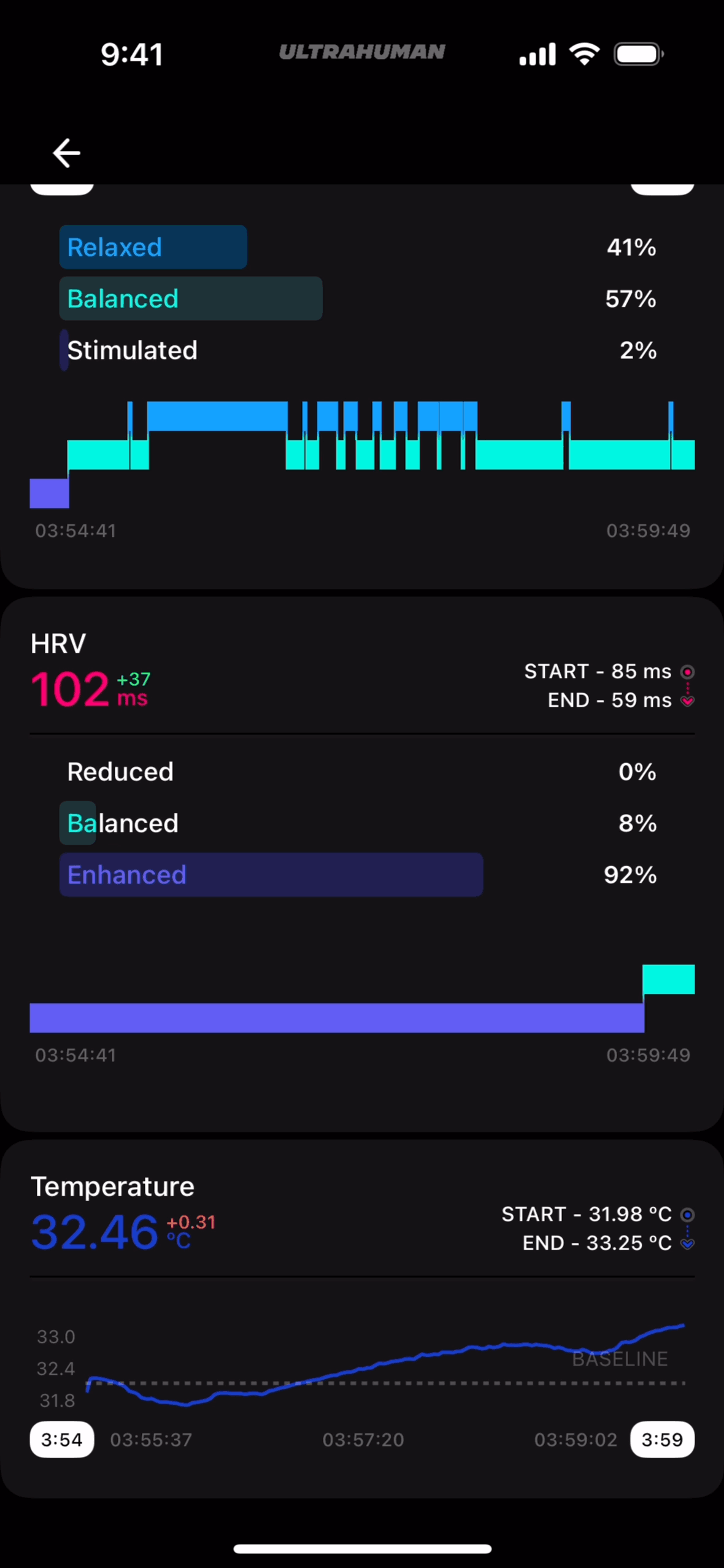 The user logs a breathwork session by selecting a protocol, performing the exercise, and viewing a session summary. The app tracks heart rate, HRV and temperature.