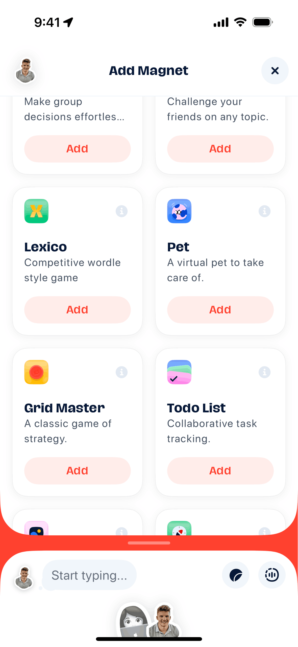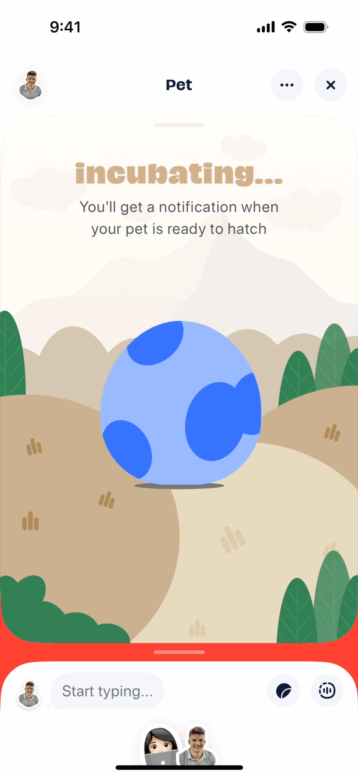 The user adds a virtual pet by selecting the 'Pet' magnet, choosing an egg, and waiting for it to hatch. The hatched pet is then displayed on the main screen.
