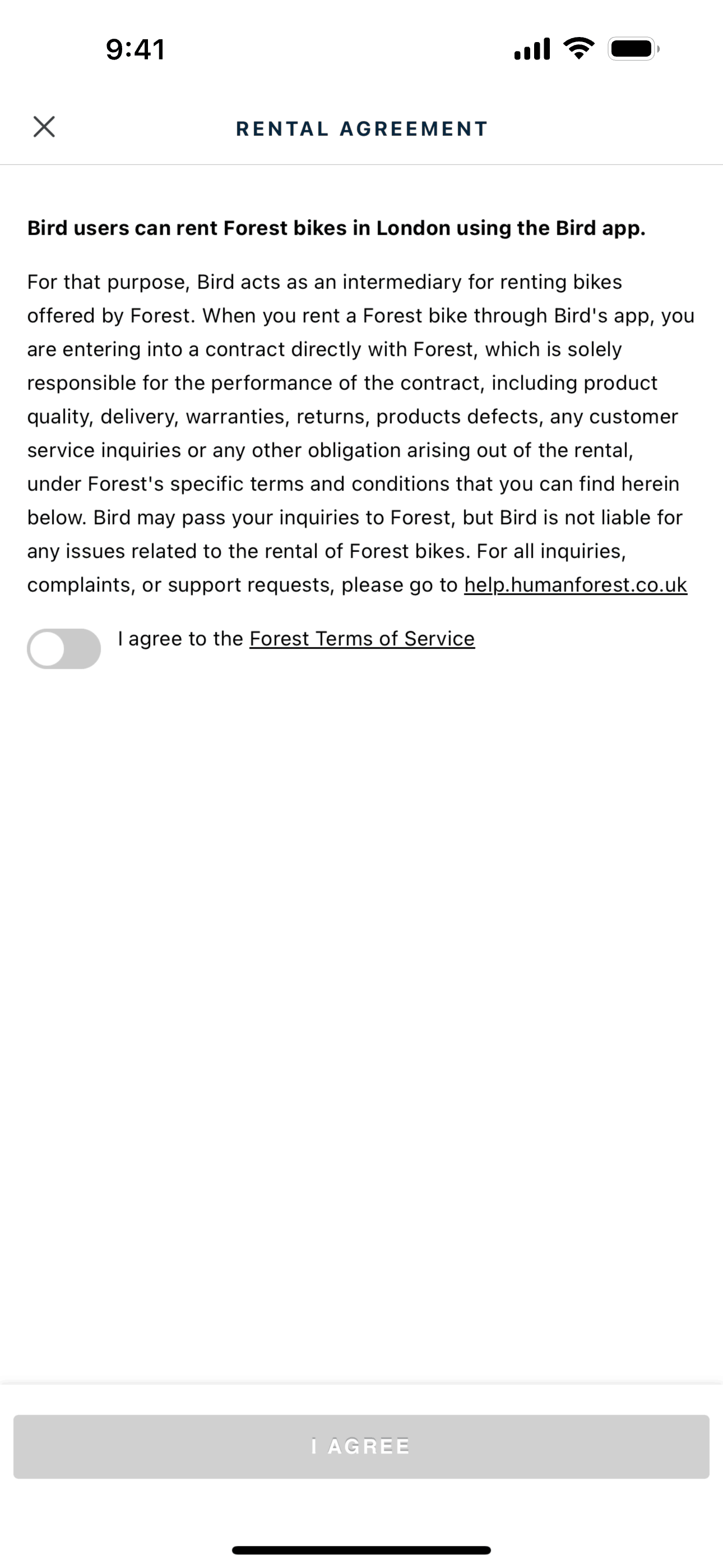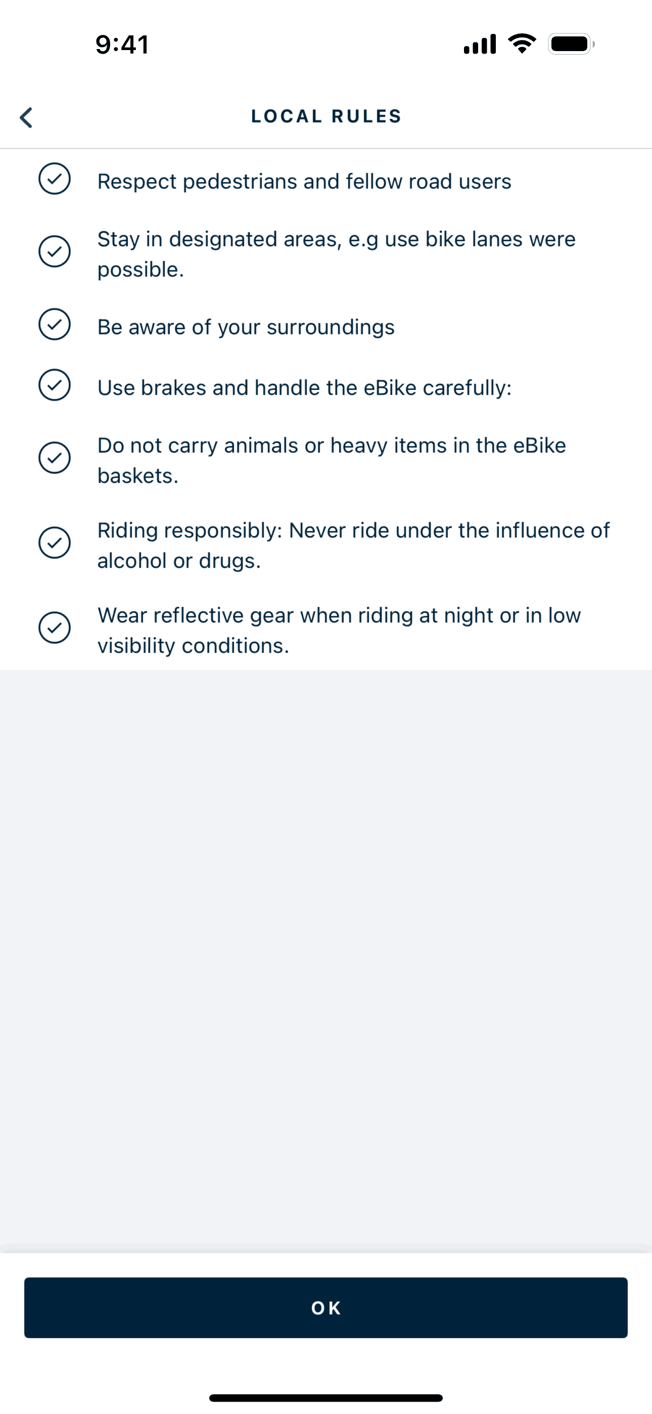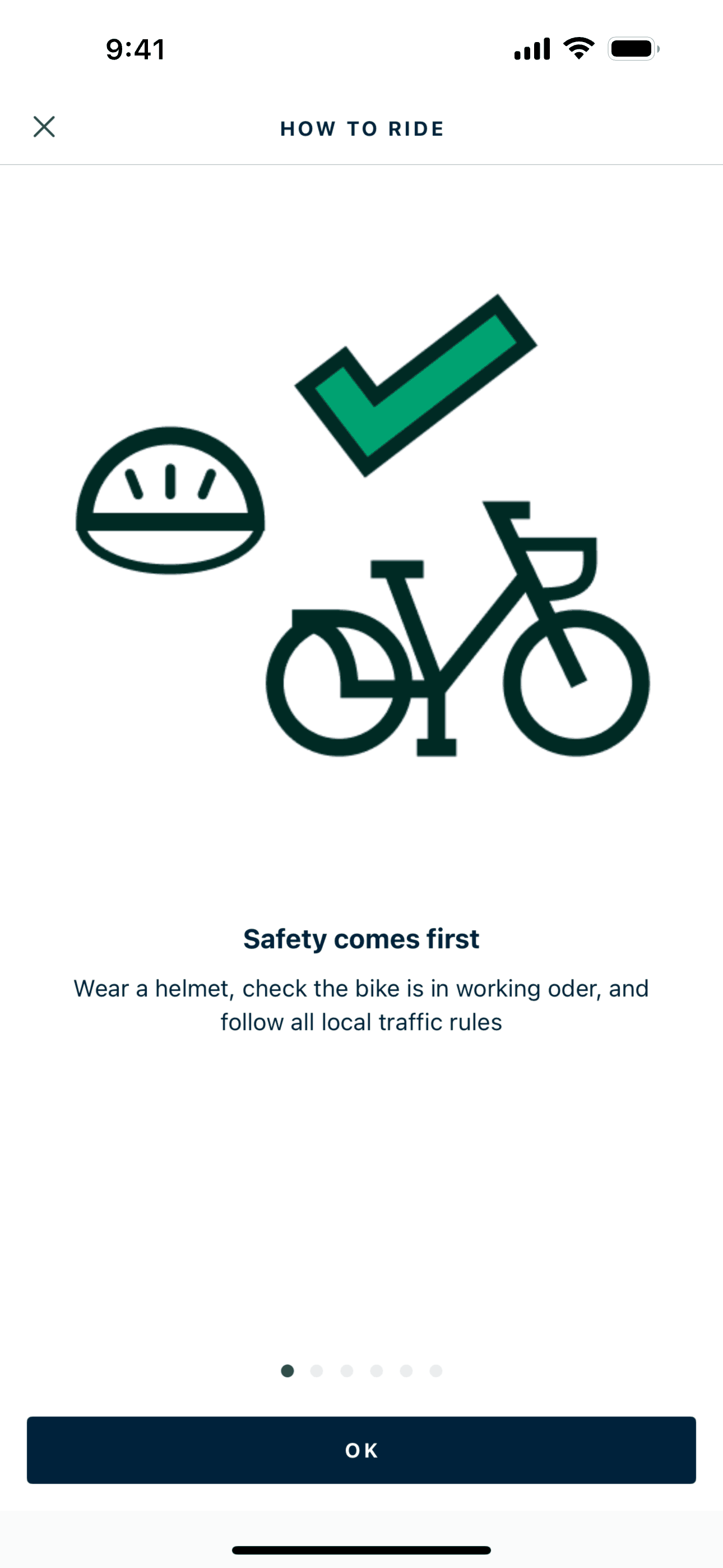 The user flow demonstrates how a user can start a ride by scanning a bicycle's QR code, agreeing to the terms, and reviewing safety information. The user then starts the ride.