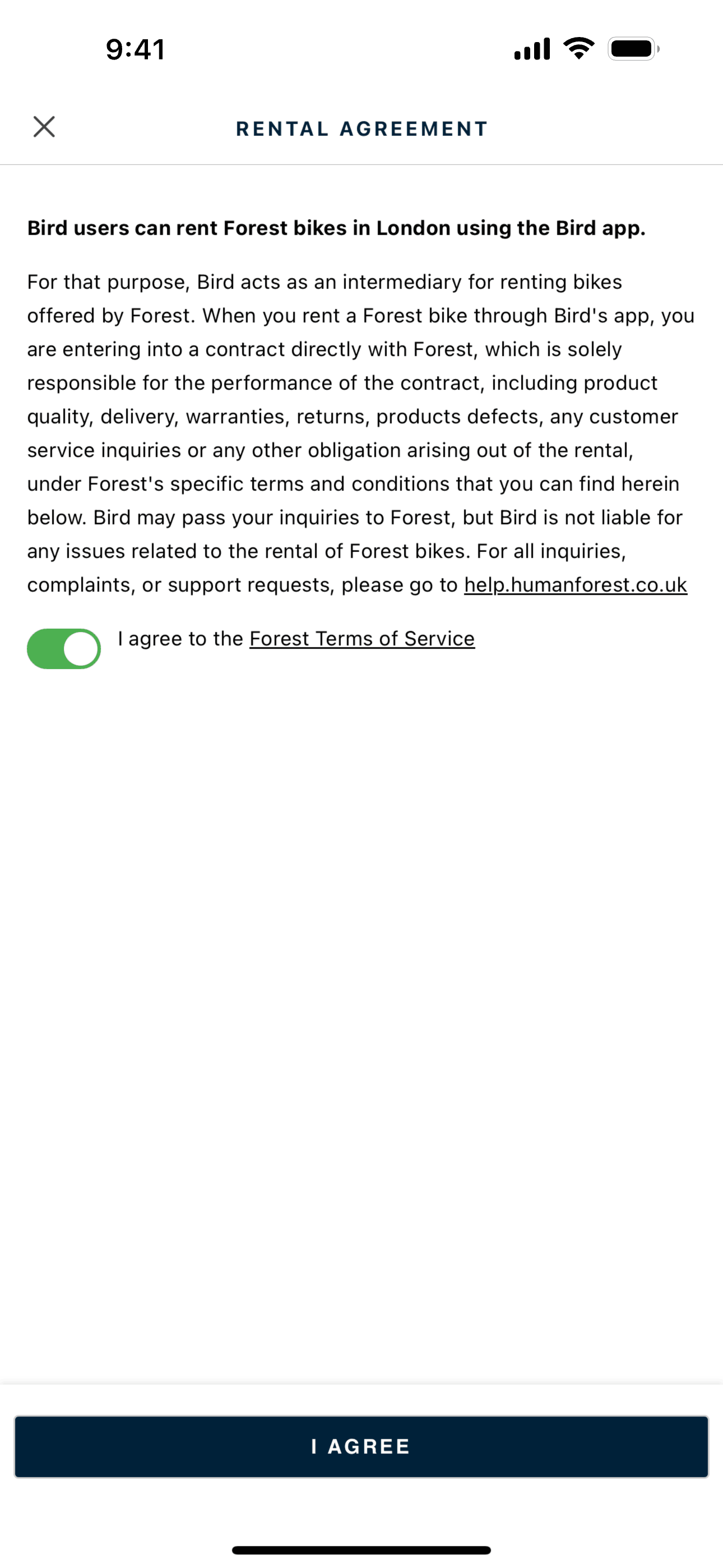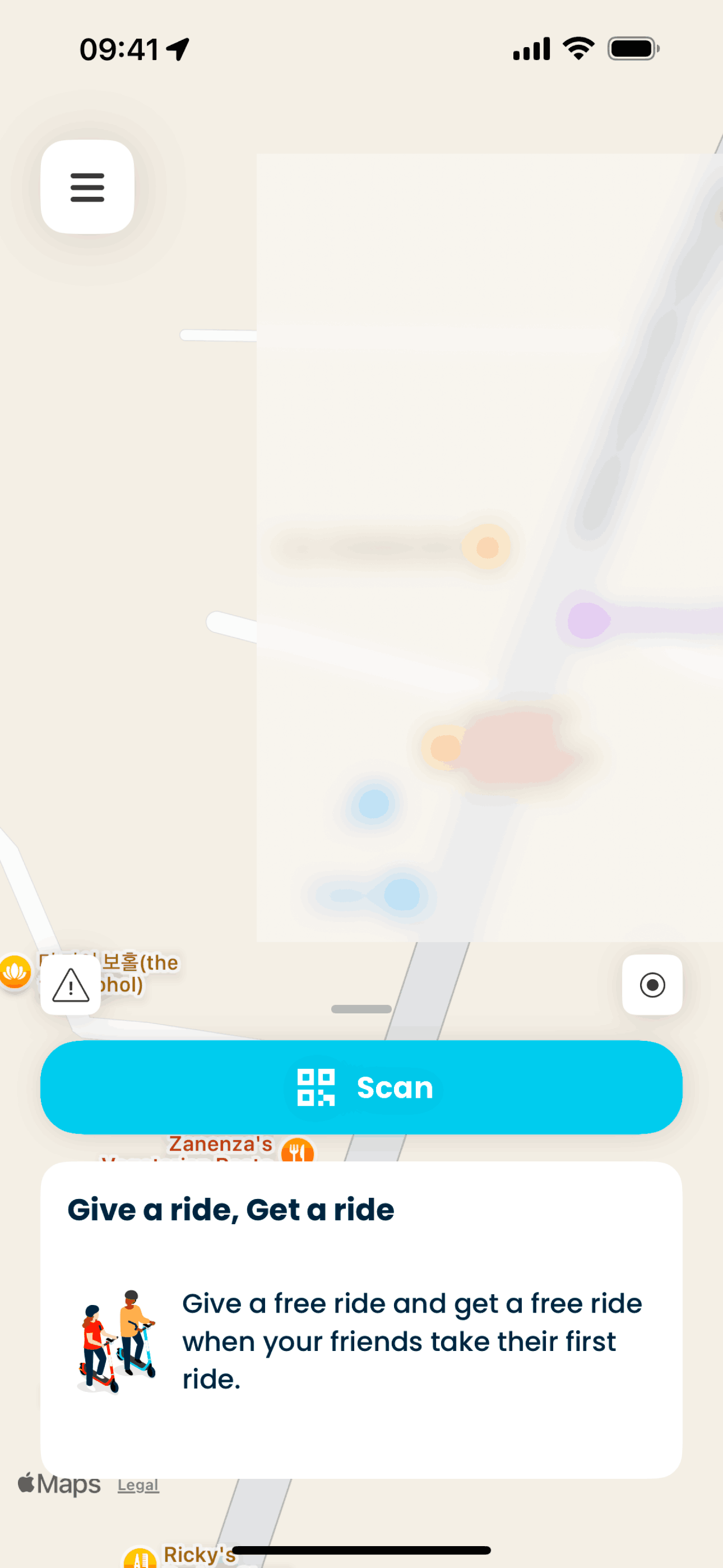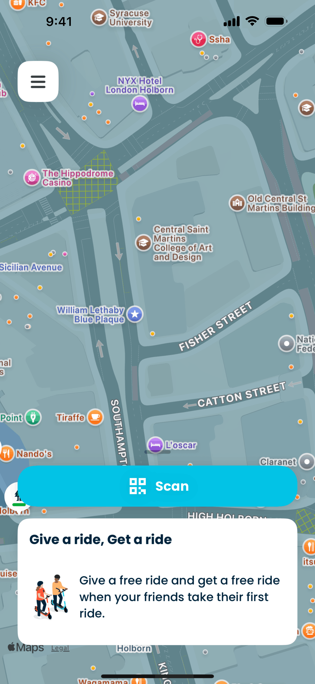 The user flow demonstrates how a user can start a ride by scanning a bicycle's QR code, agreeing to the terms, and reviewing safety information. The user then starts the ride.