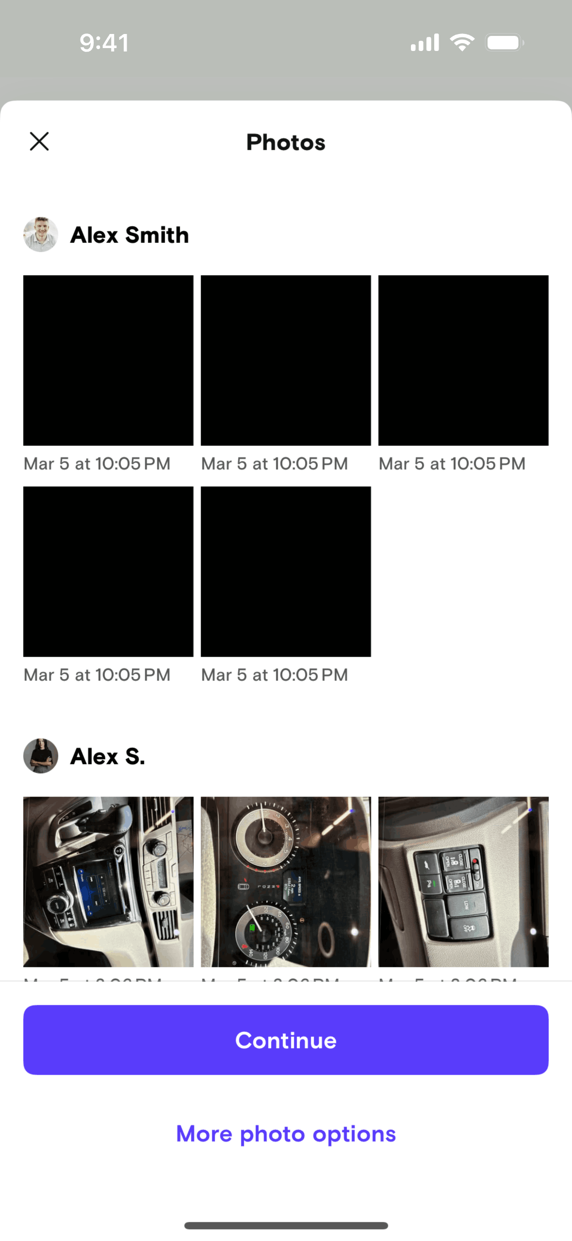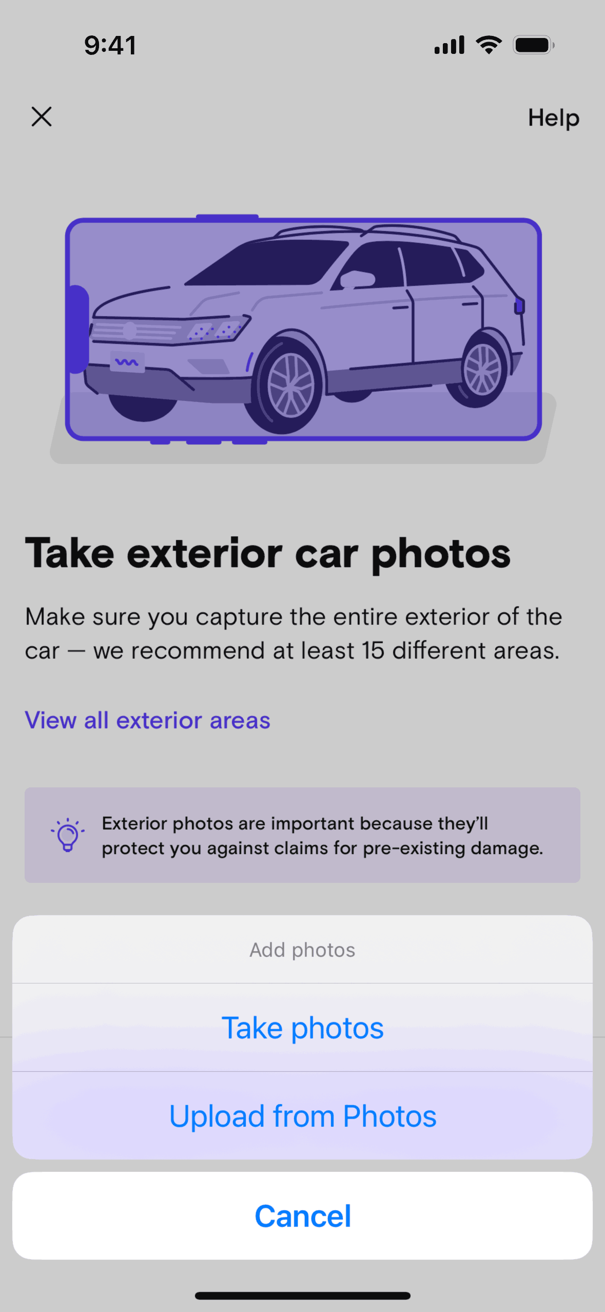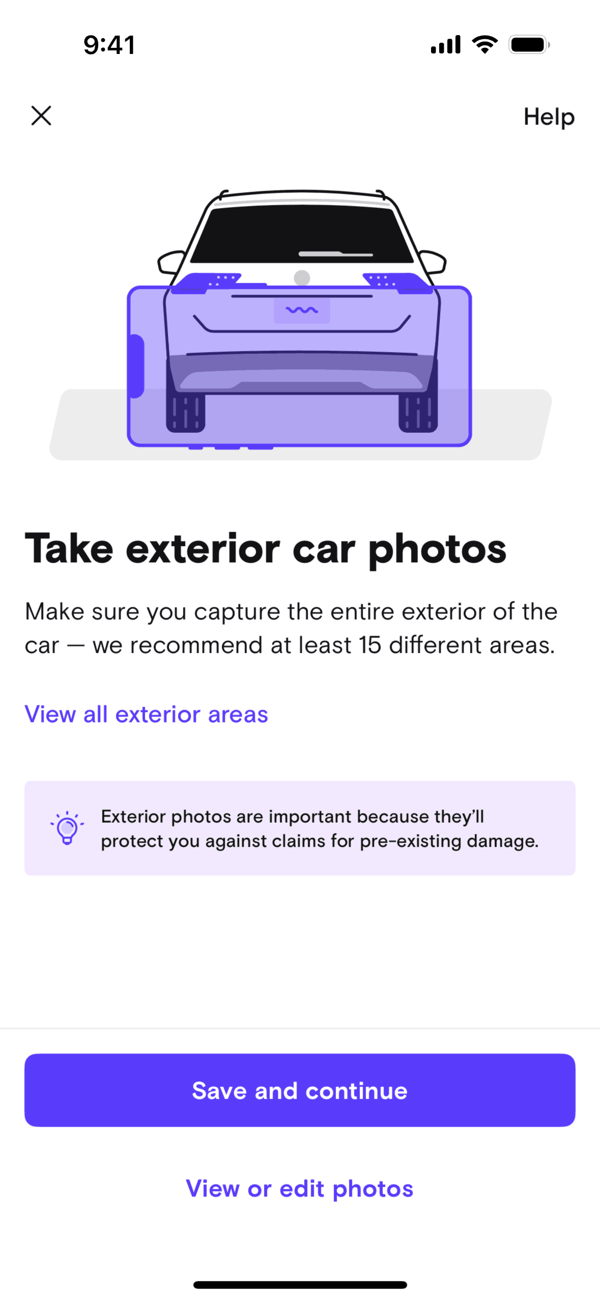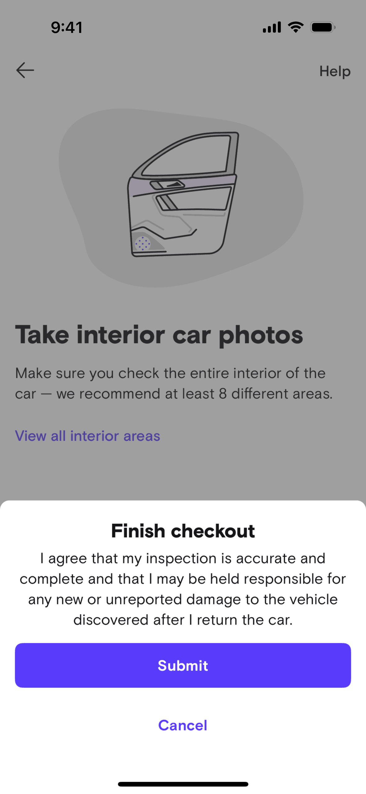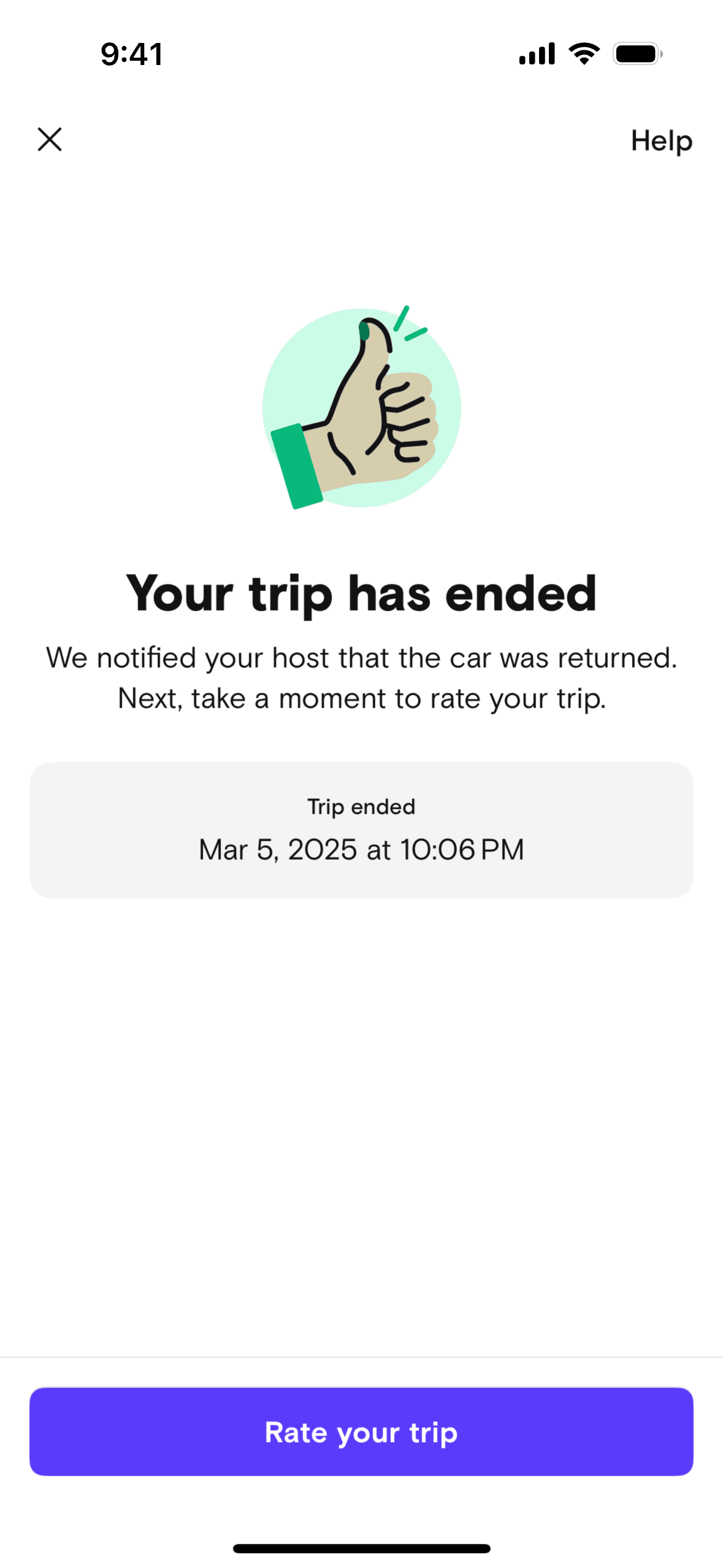 The user flow guides the user through ending a car rental trip, including taking photos for vehicle inspection. The flow ends with a confirmation and a prompt to rate the trip.