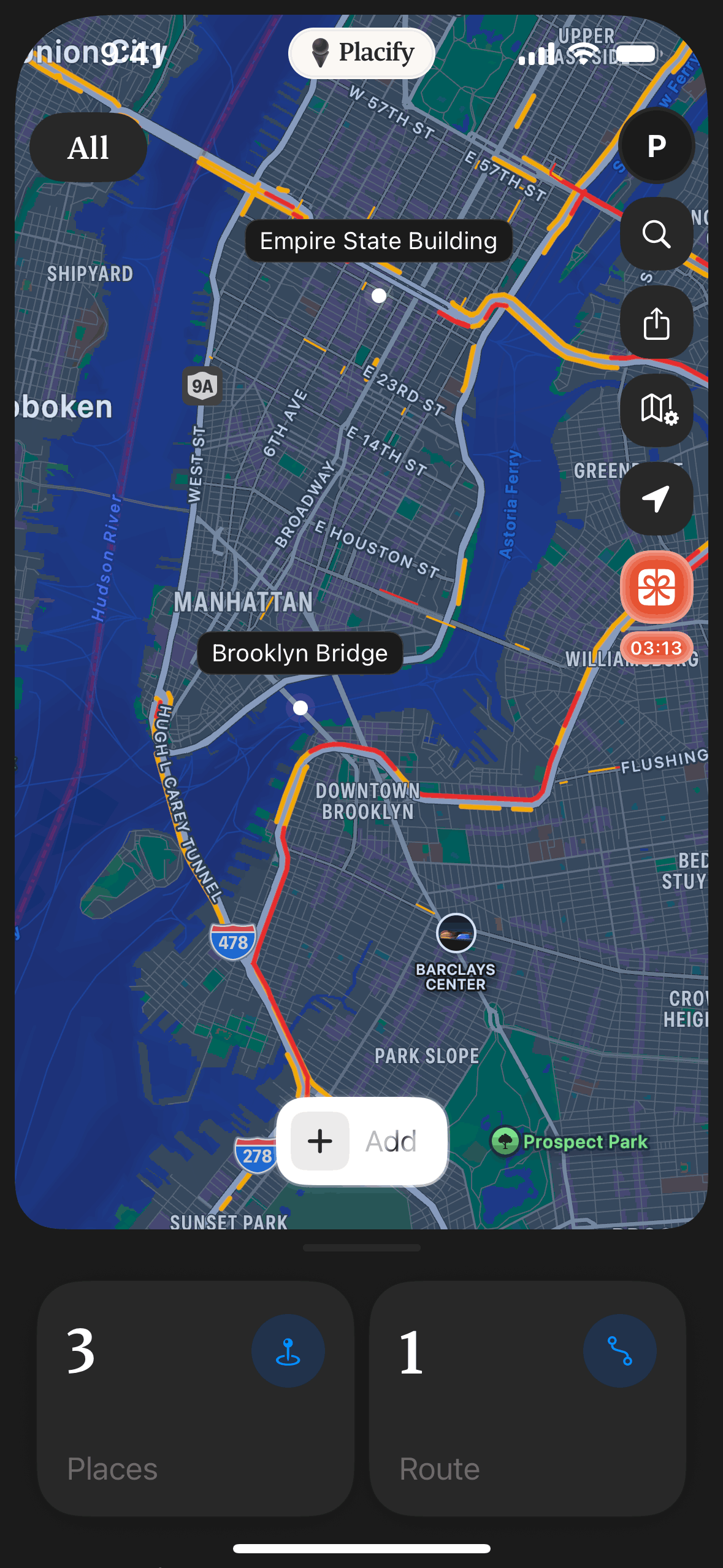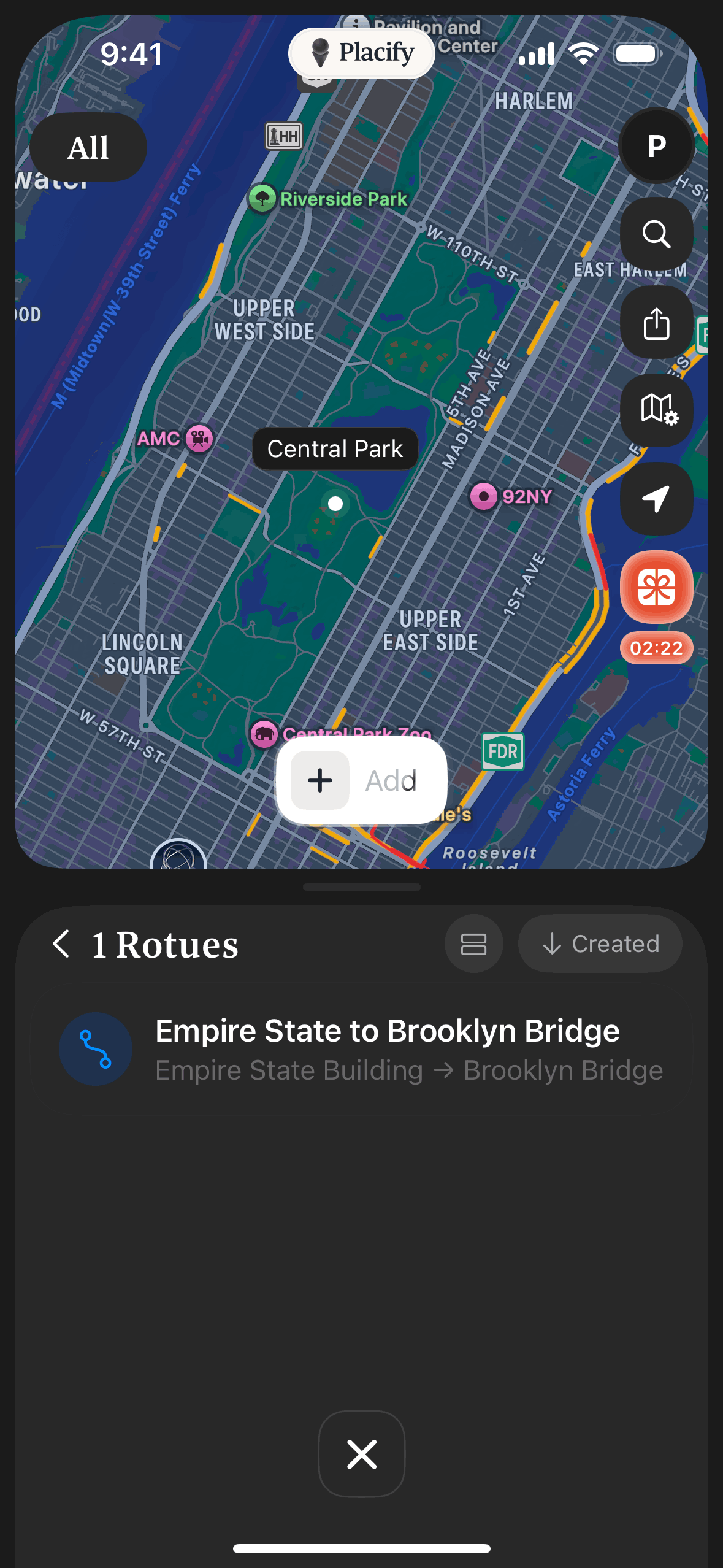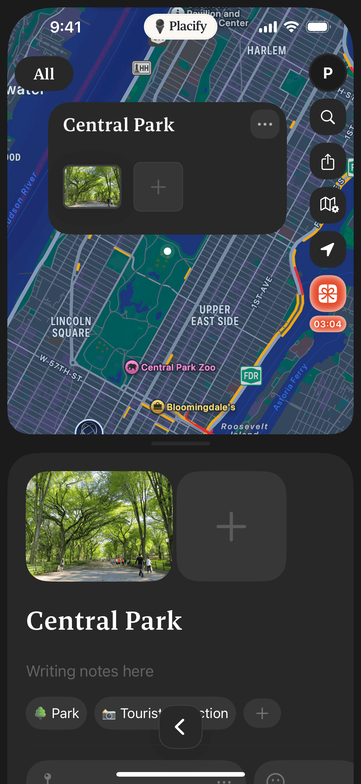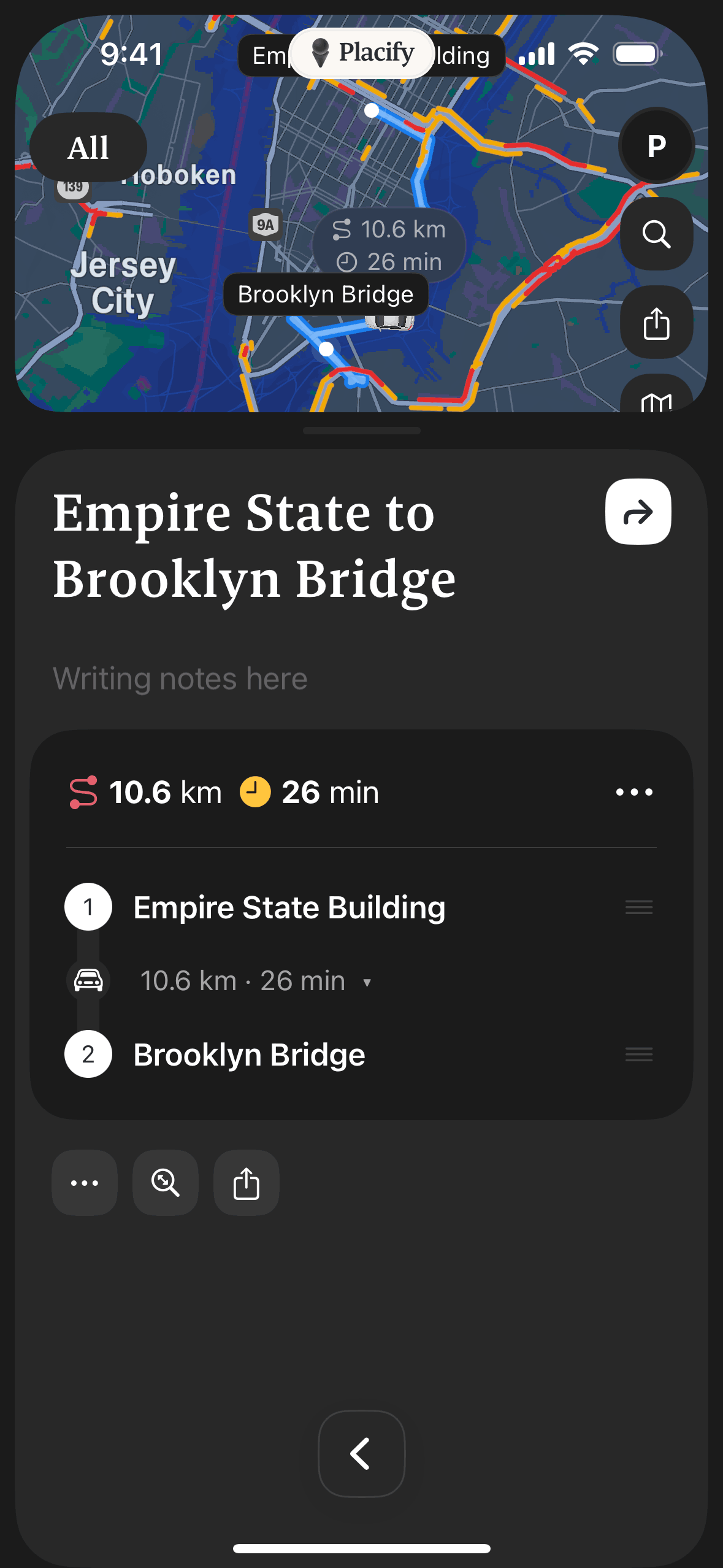 The user navigates through the app, switching to dark mode in settings and then viewing the map and route details. The flow showcases the app's appearance in dark mode.
