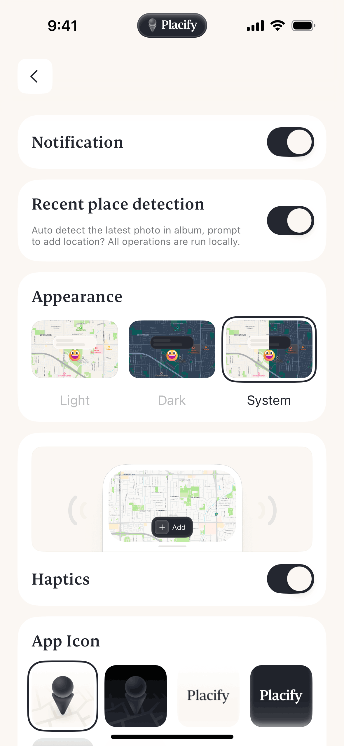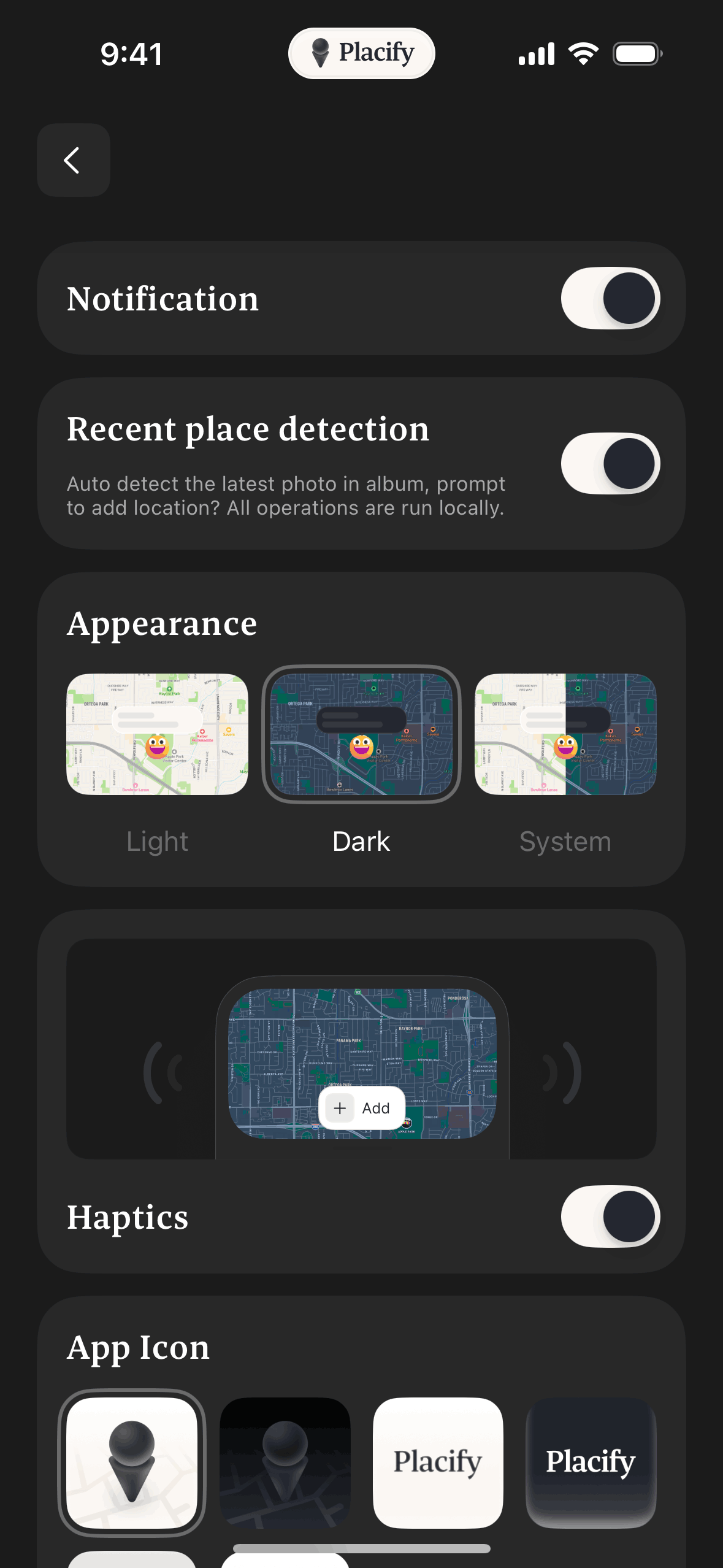 The user switches to dark mode via appearance settings. The app then displays all screens in dark mode.