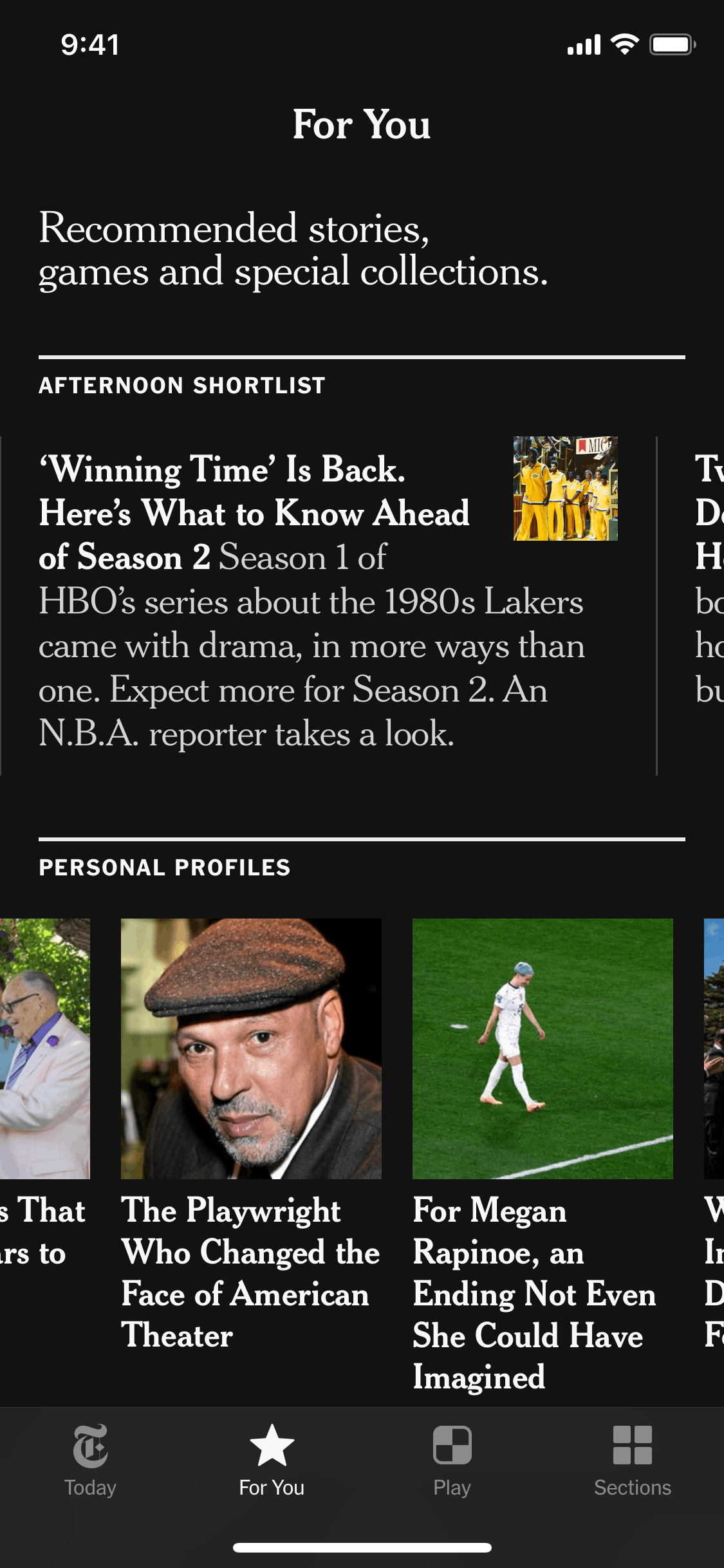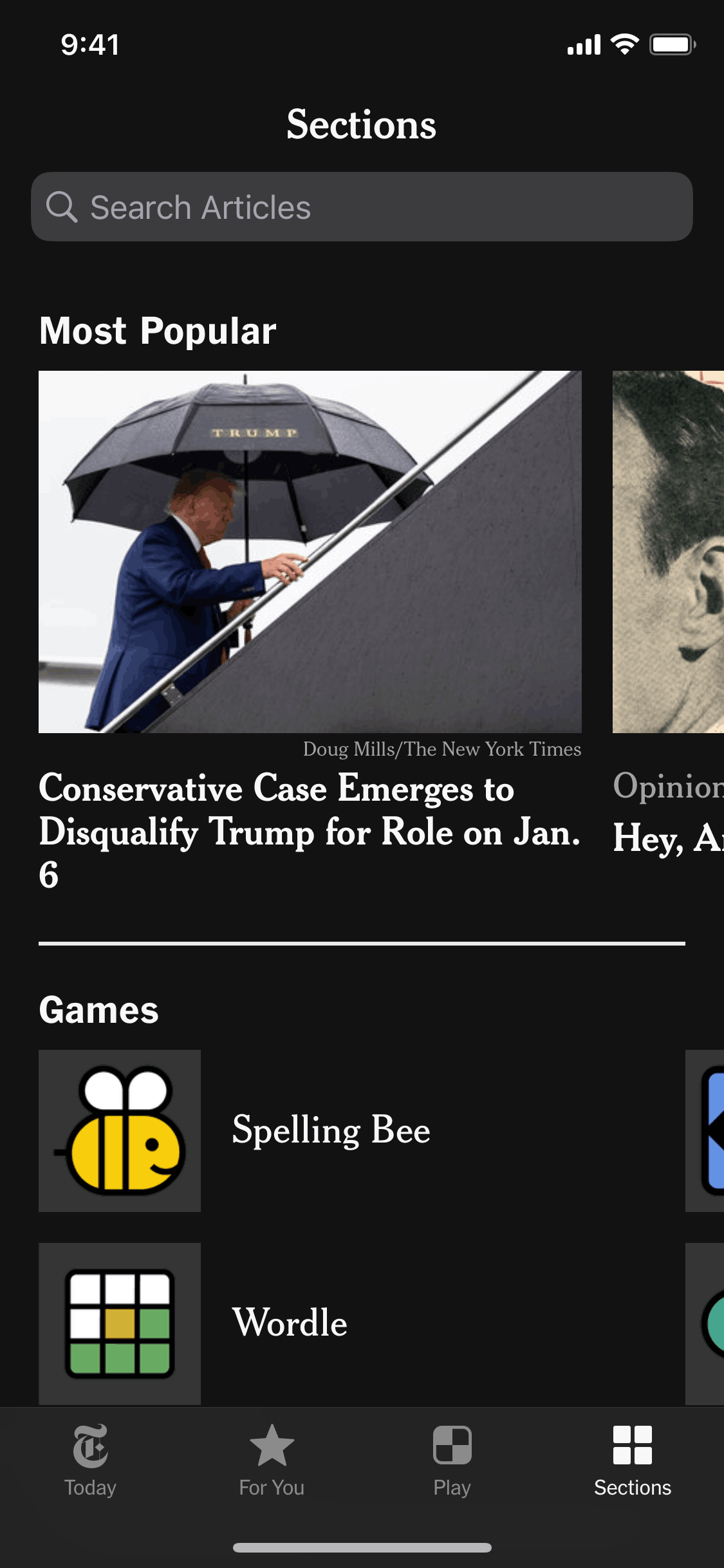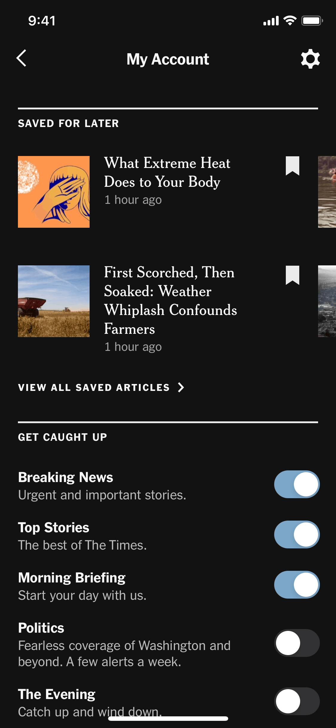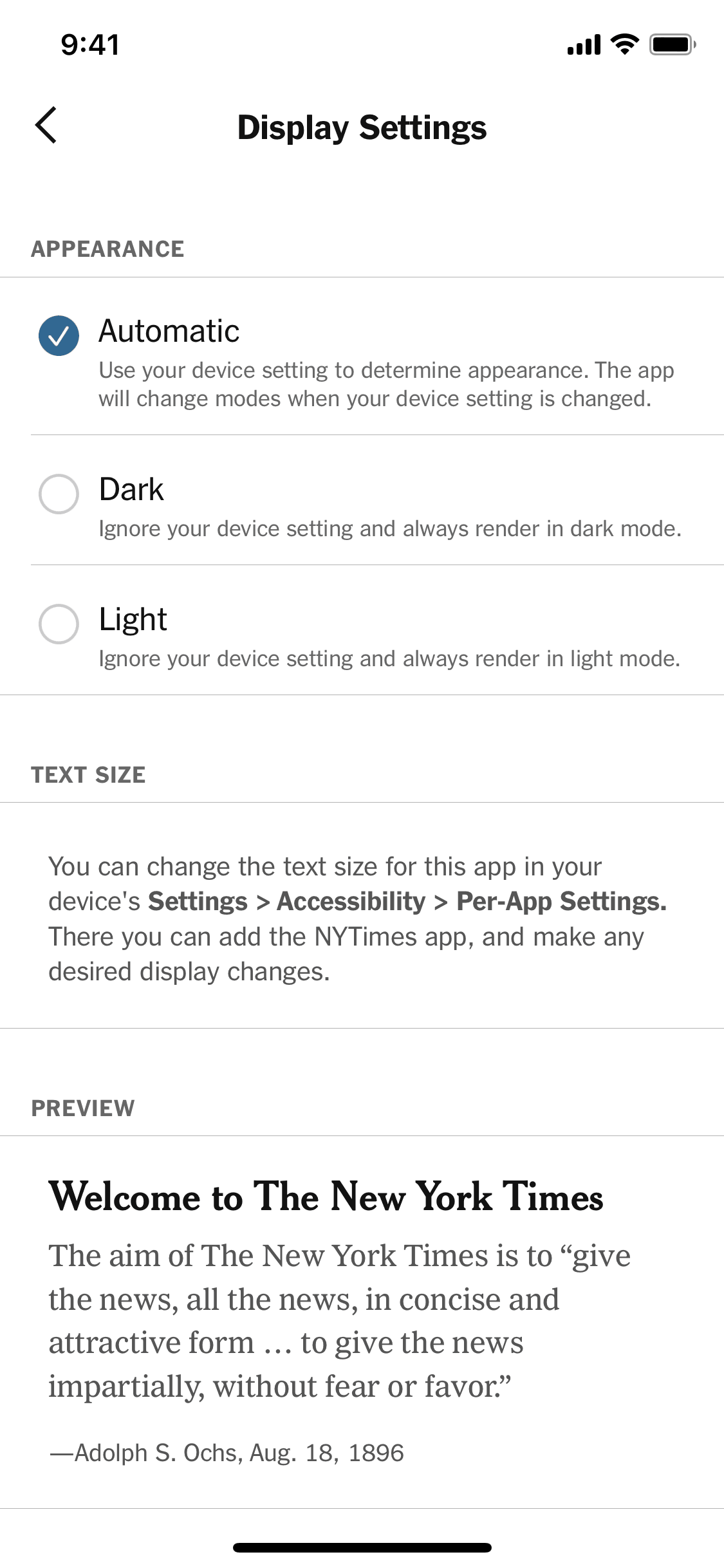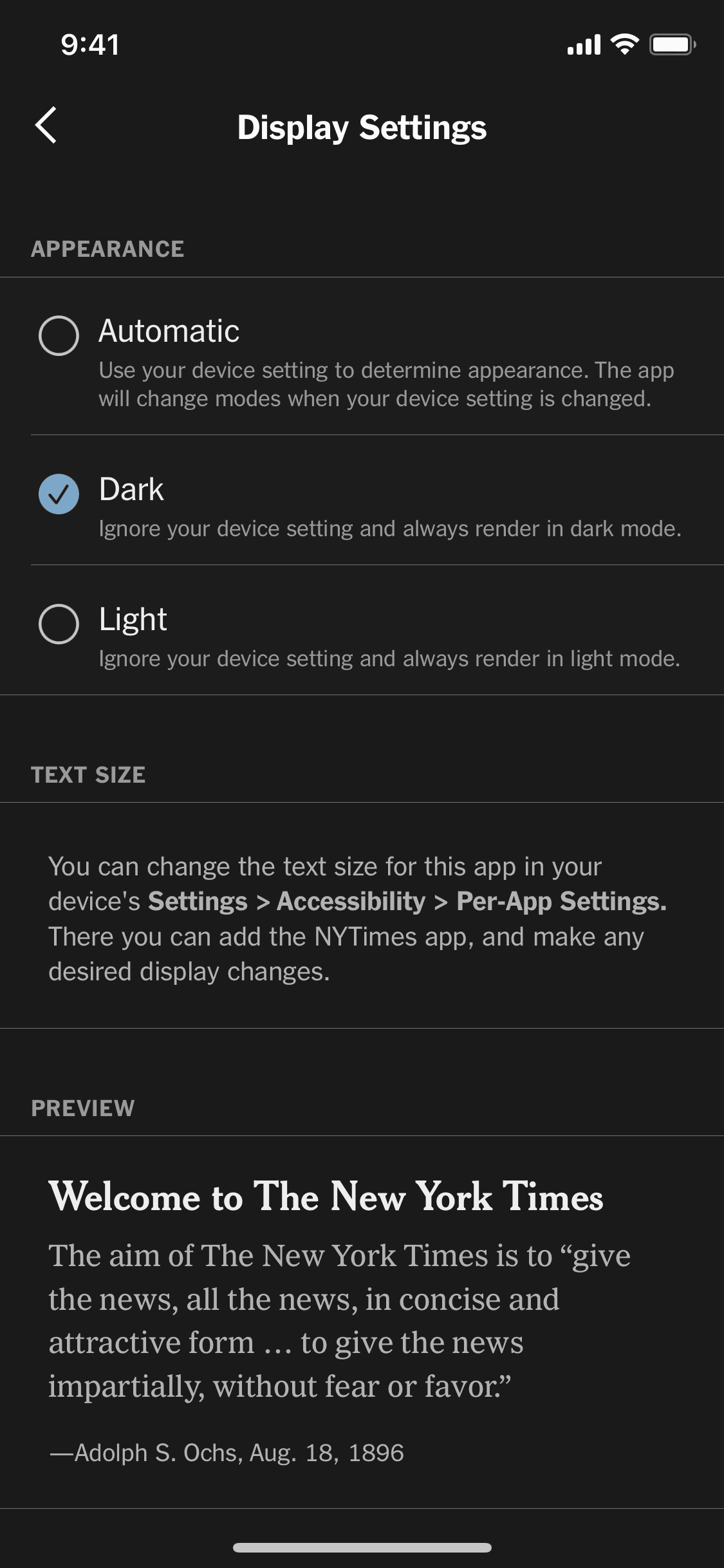 The user switches the New York Times app to dark mode. The flow showcases the app's interface in dark mode across different sections.