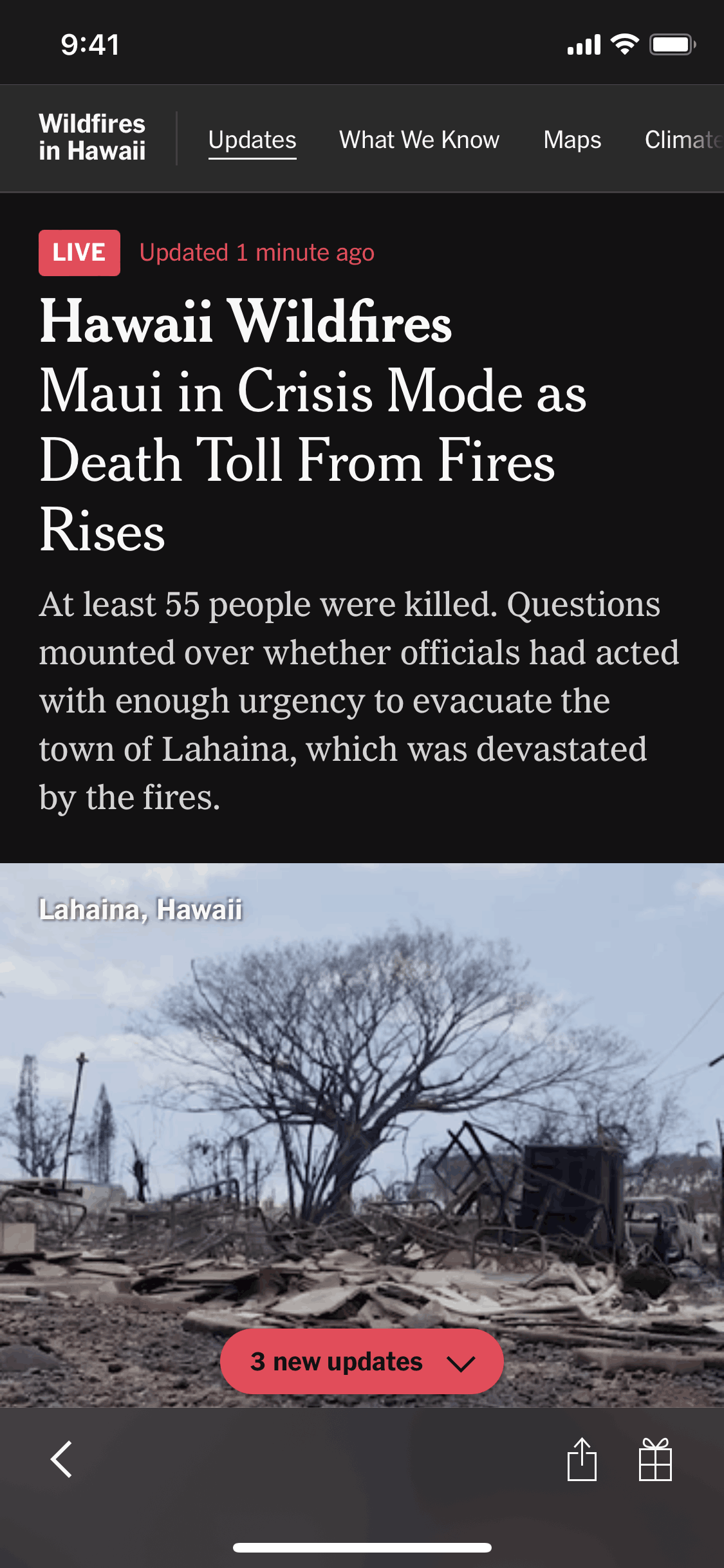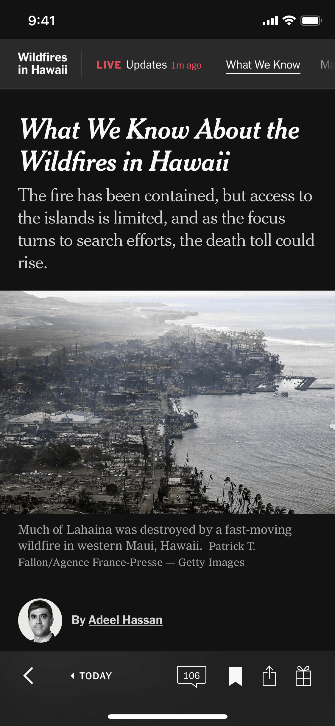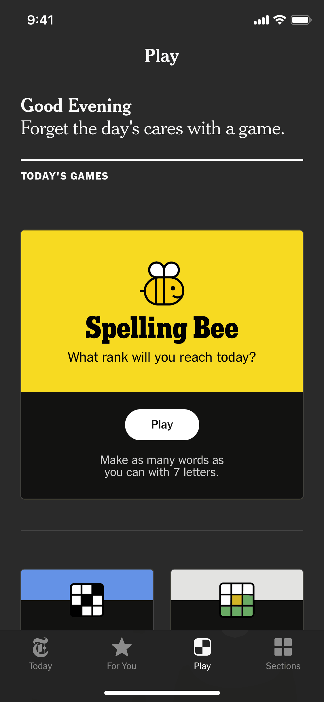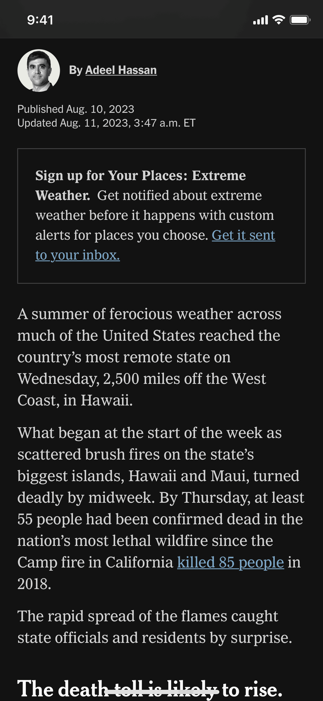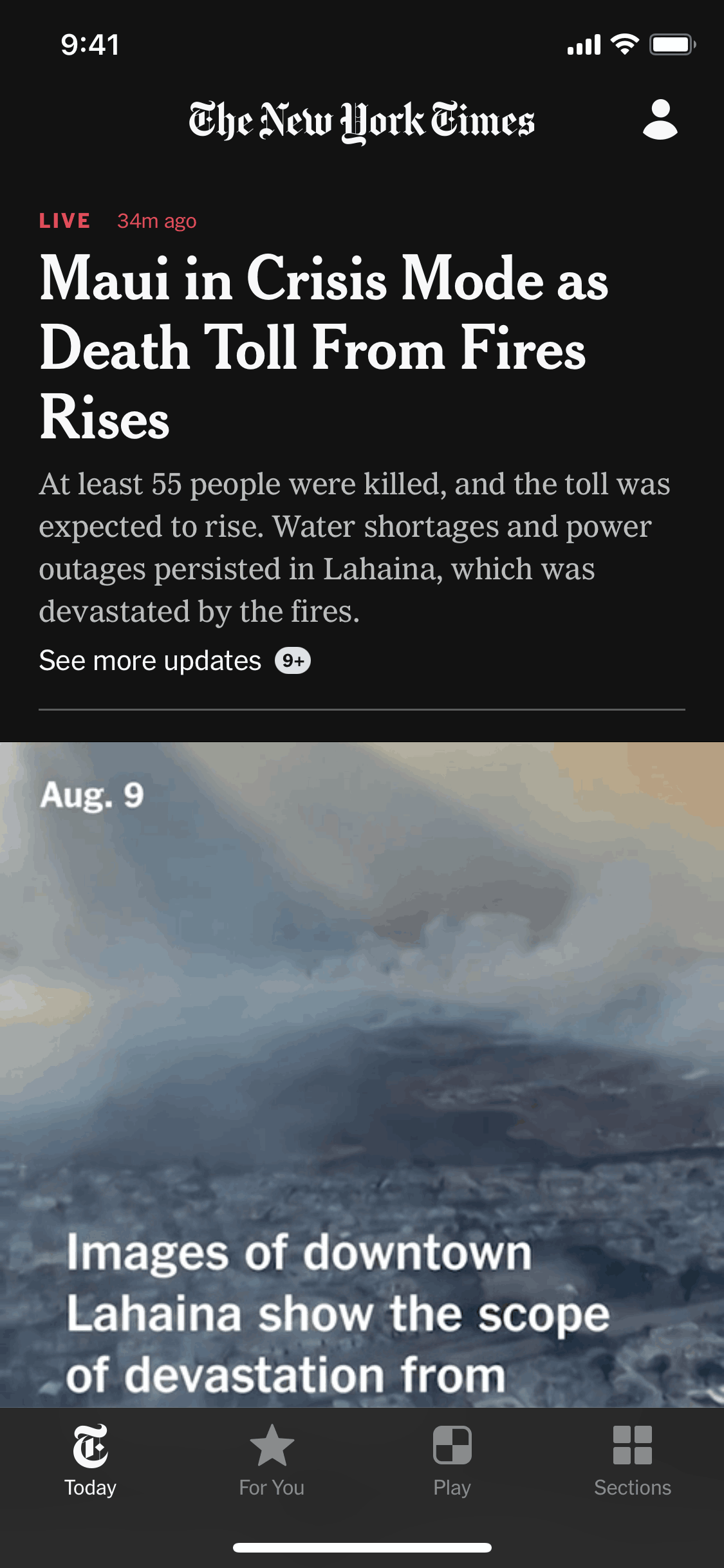 The user switches the New York Times app to dark mode. The flow showcases the app's interface in dark mode across different sections.