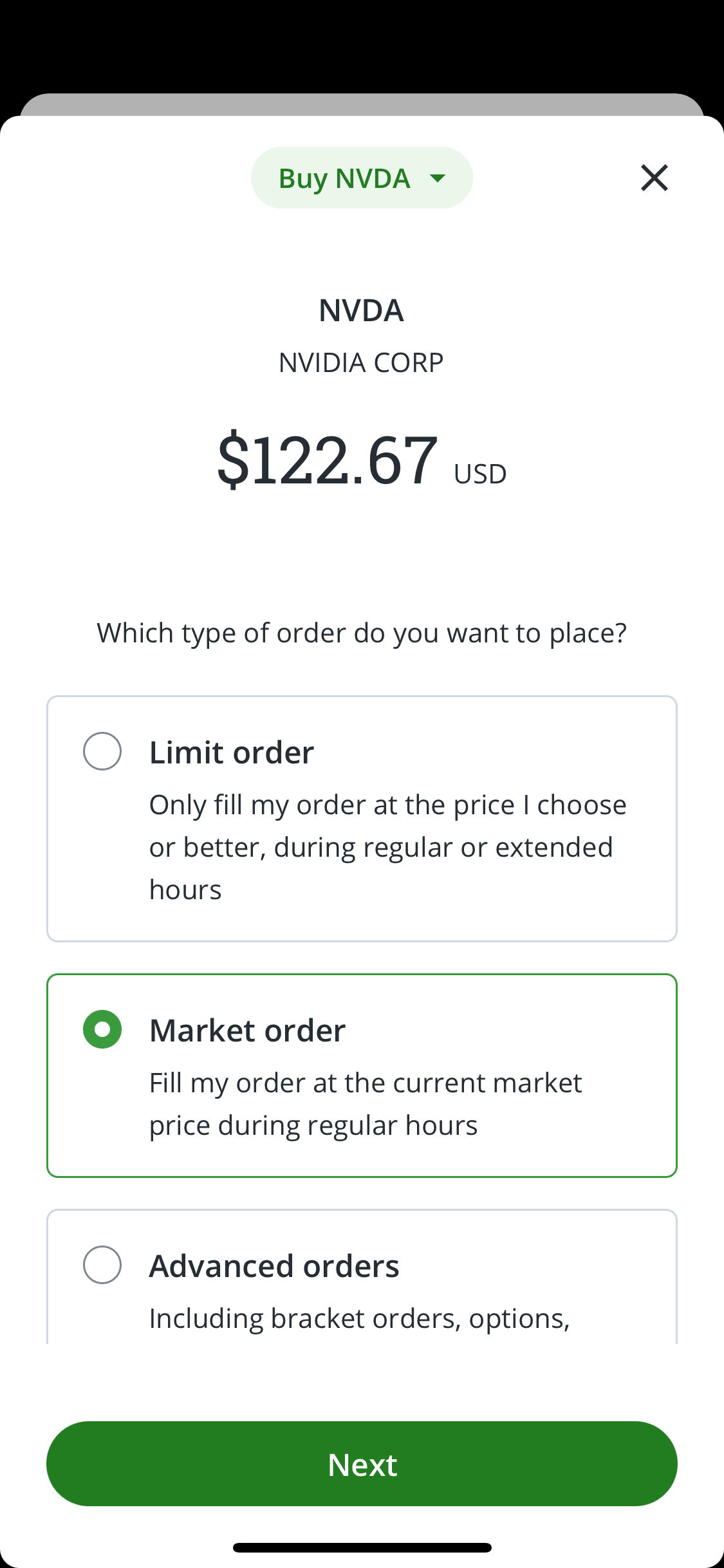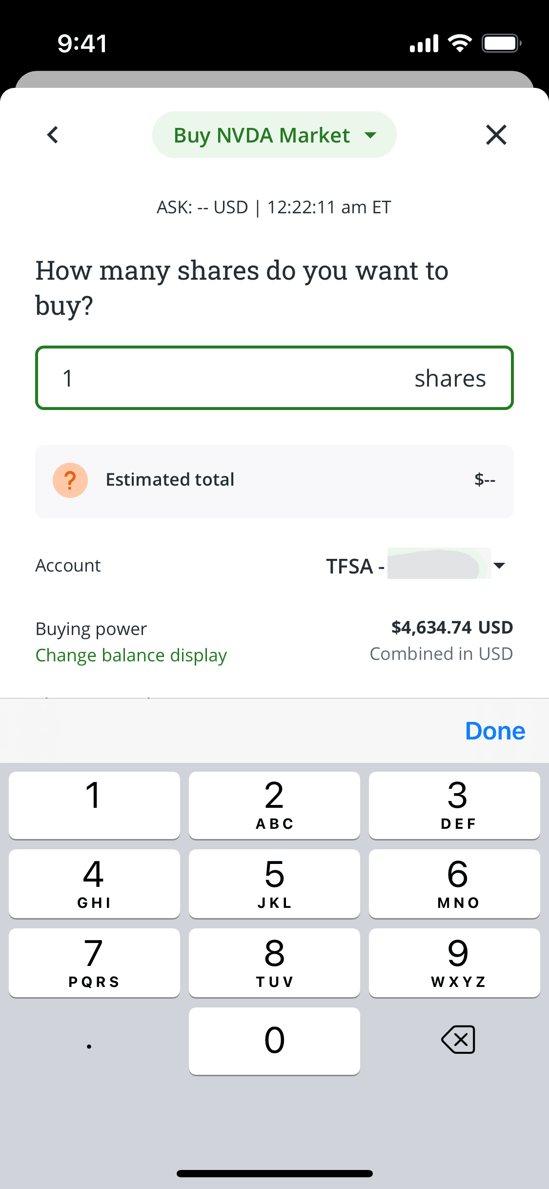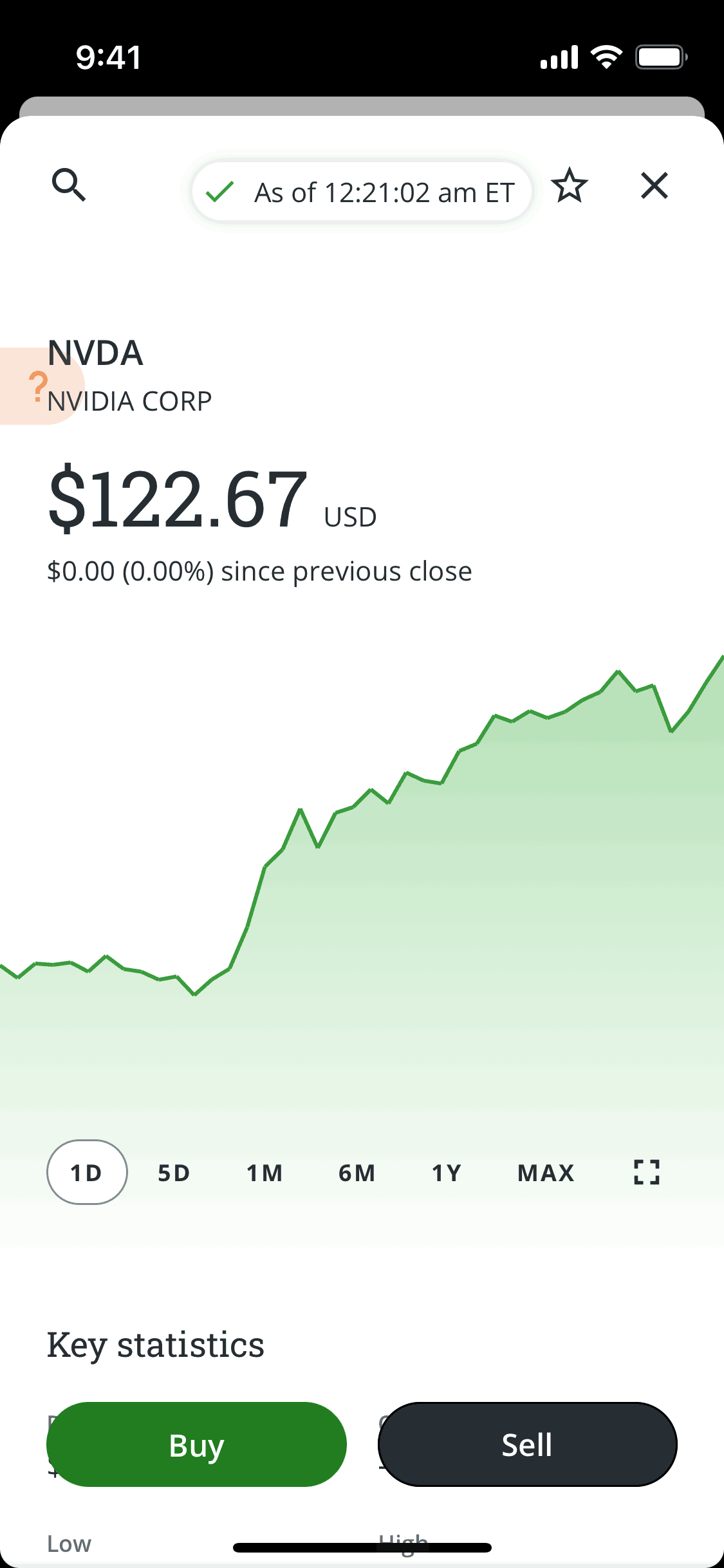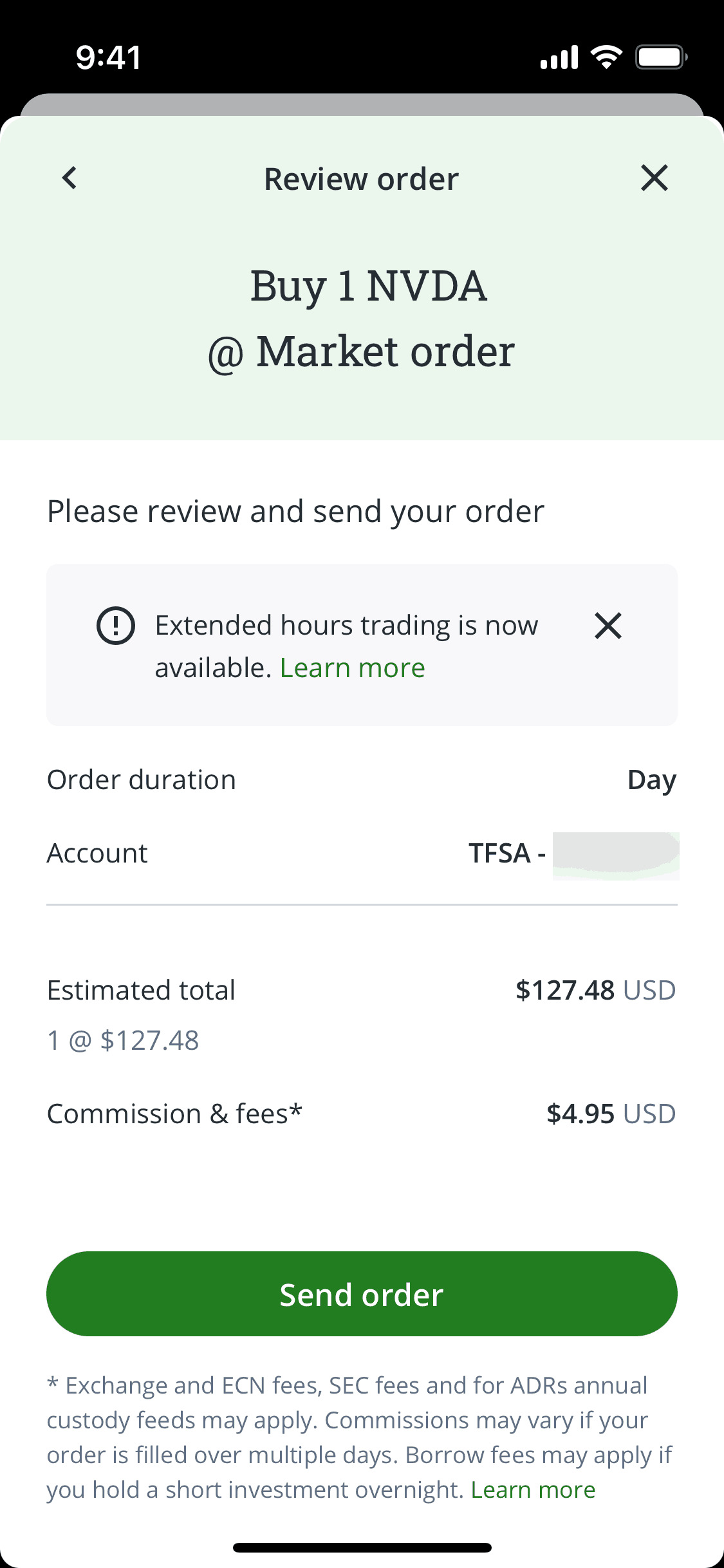 The user switches the theme to light mode and then navigates through the app to place a buy order for a stock.