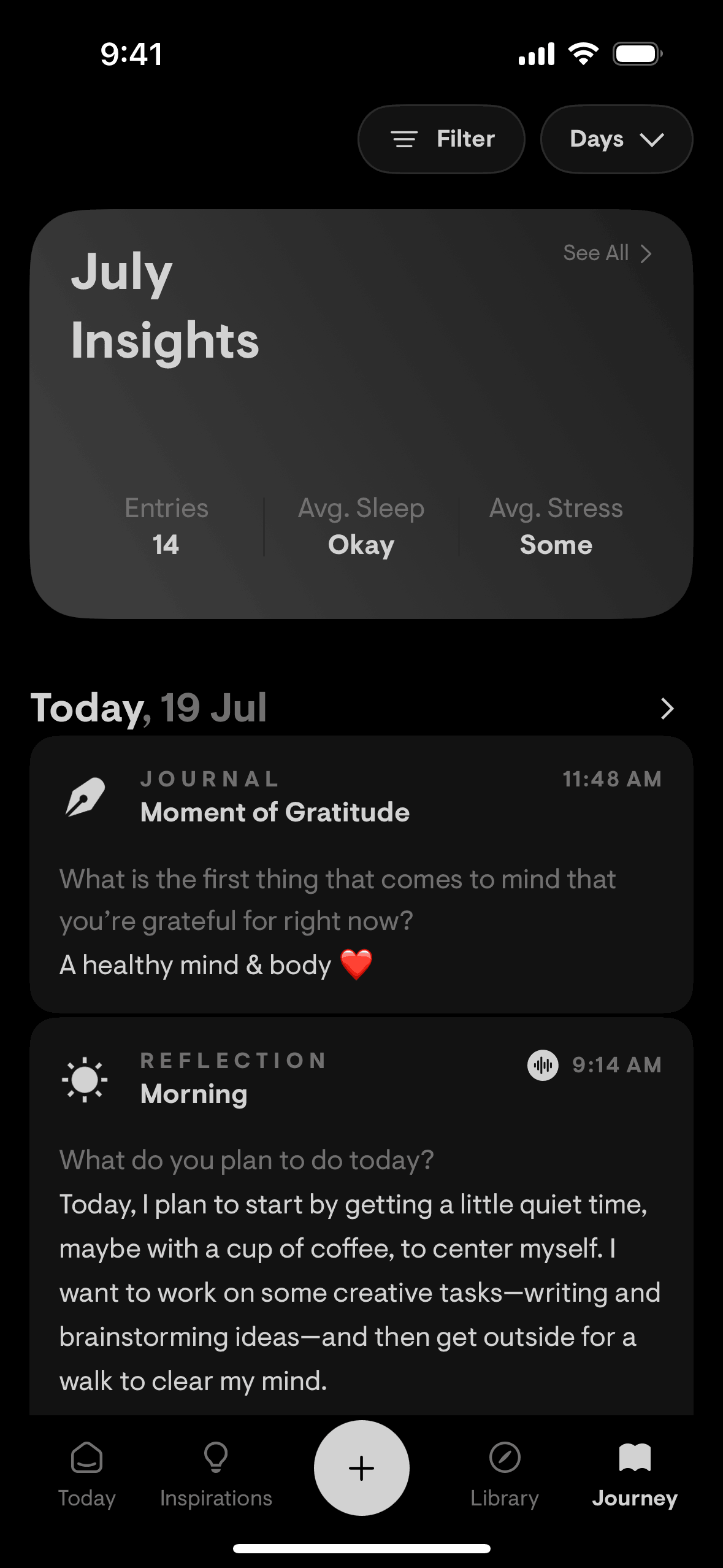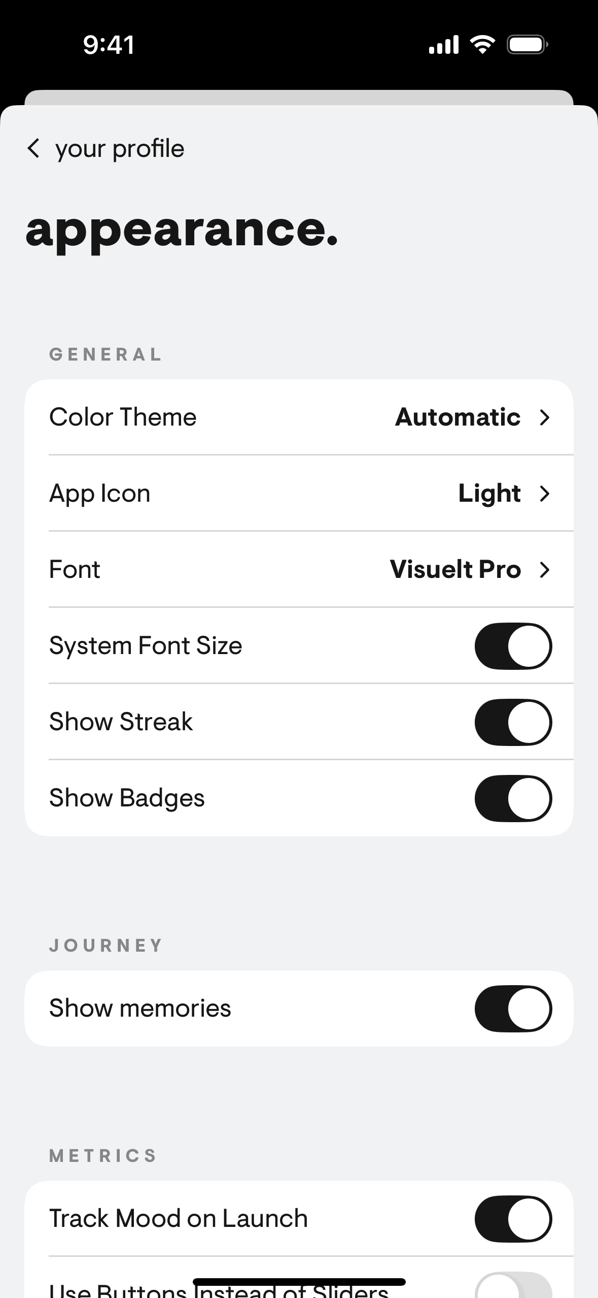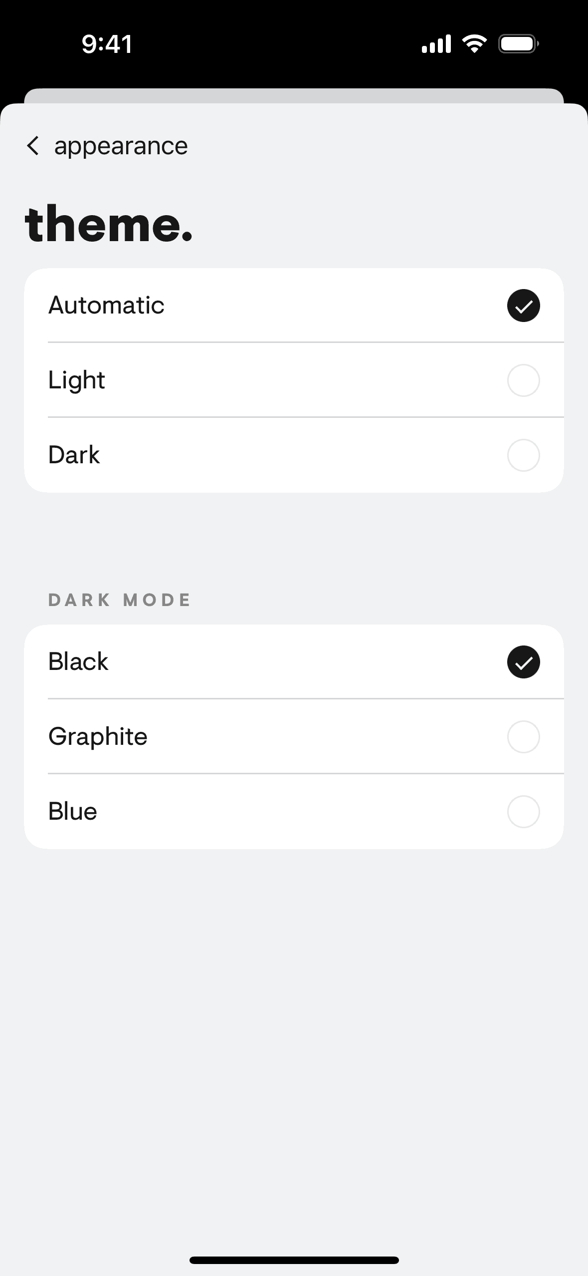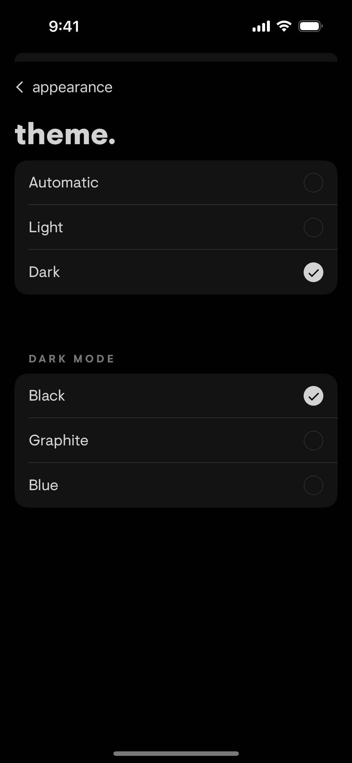 The user switches the app to dark mode by navigating through the settings. The app then displays in dark mode.