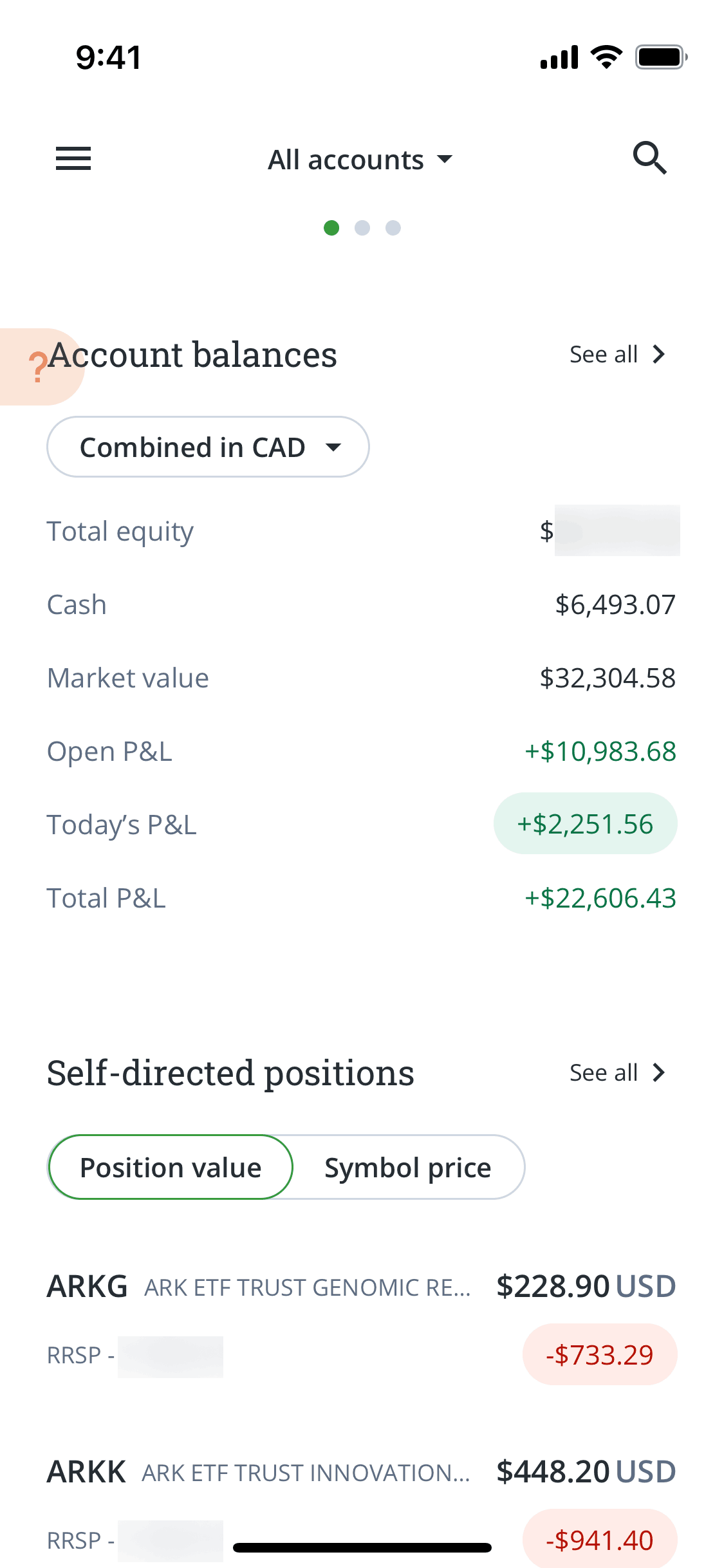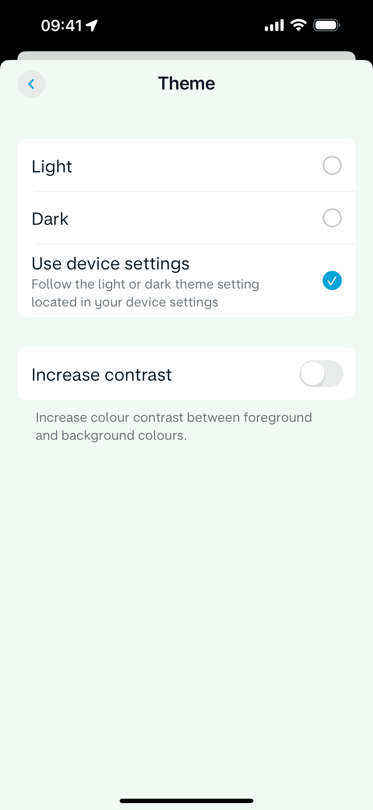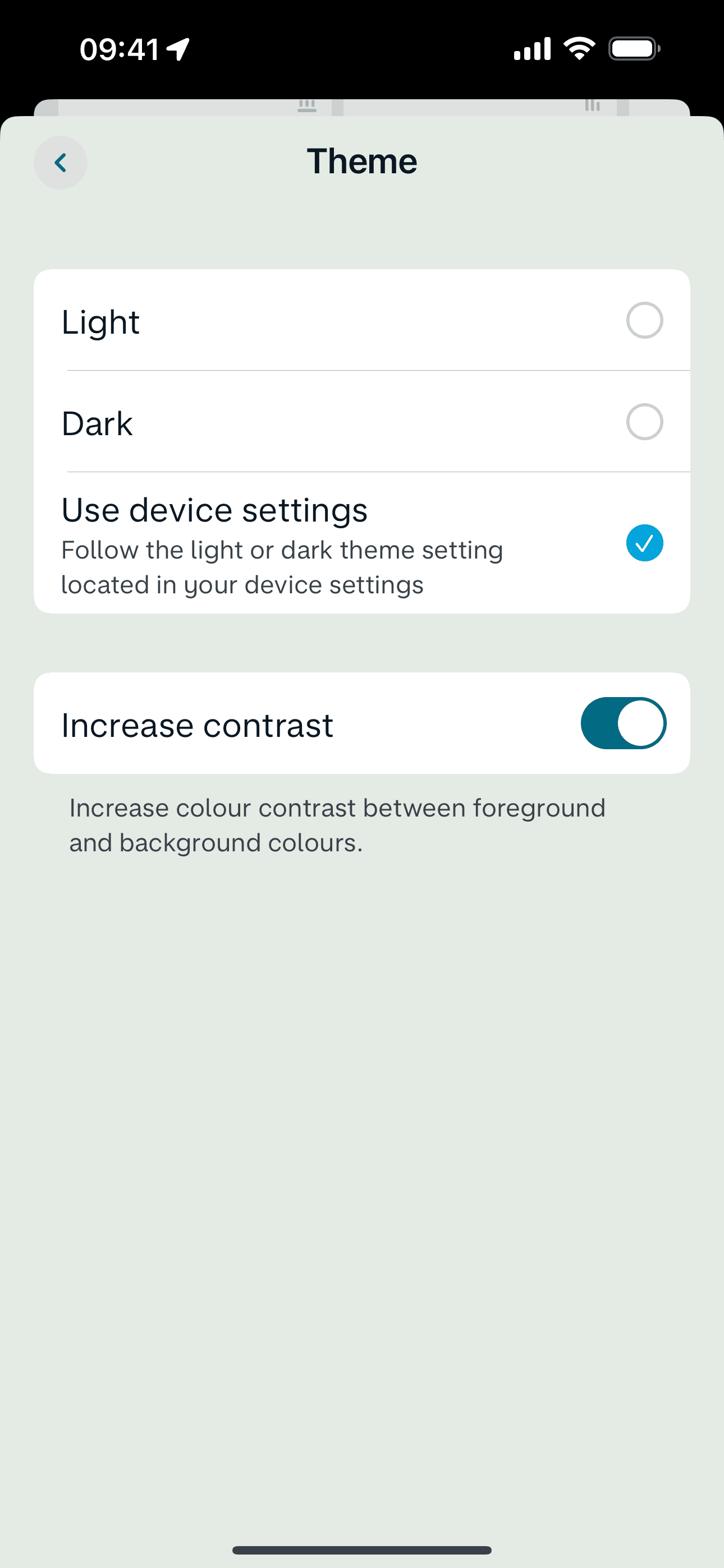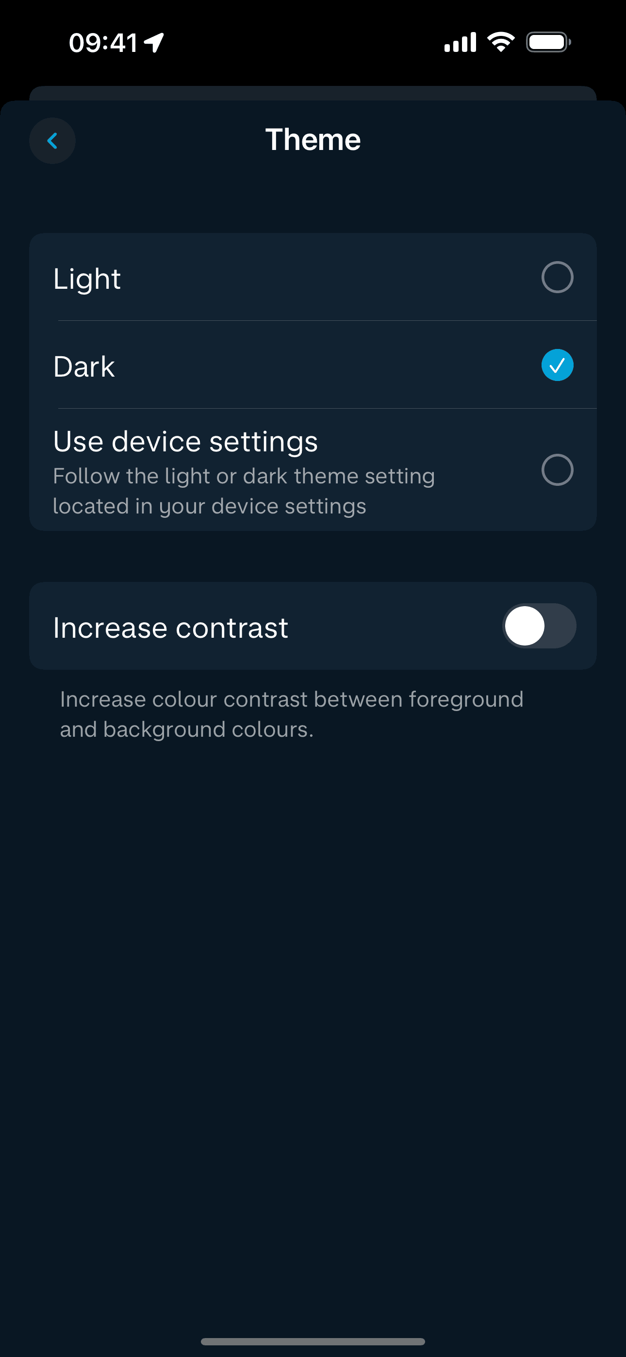 The user switches the app theme to dark mode and enables increased contrast. The user then views different screens in dark mode.