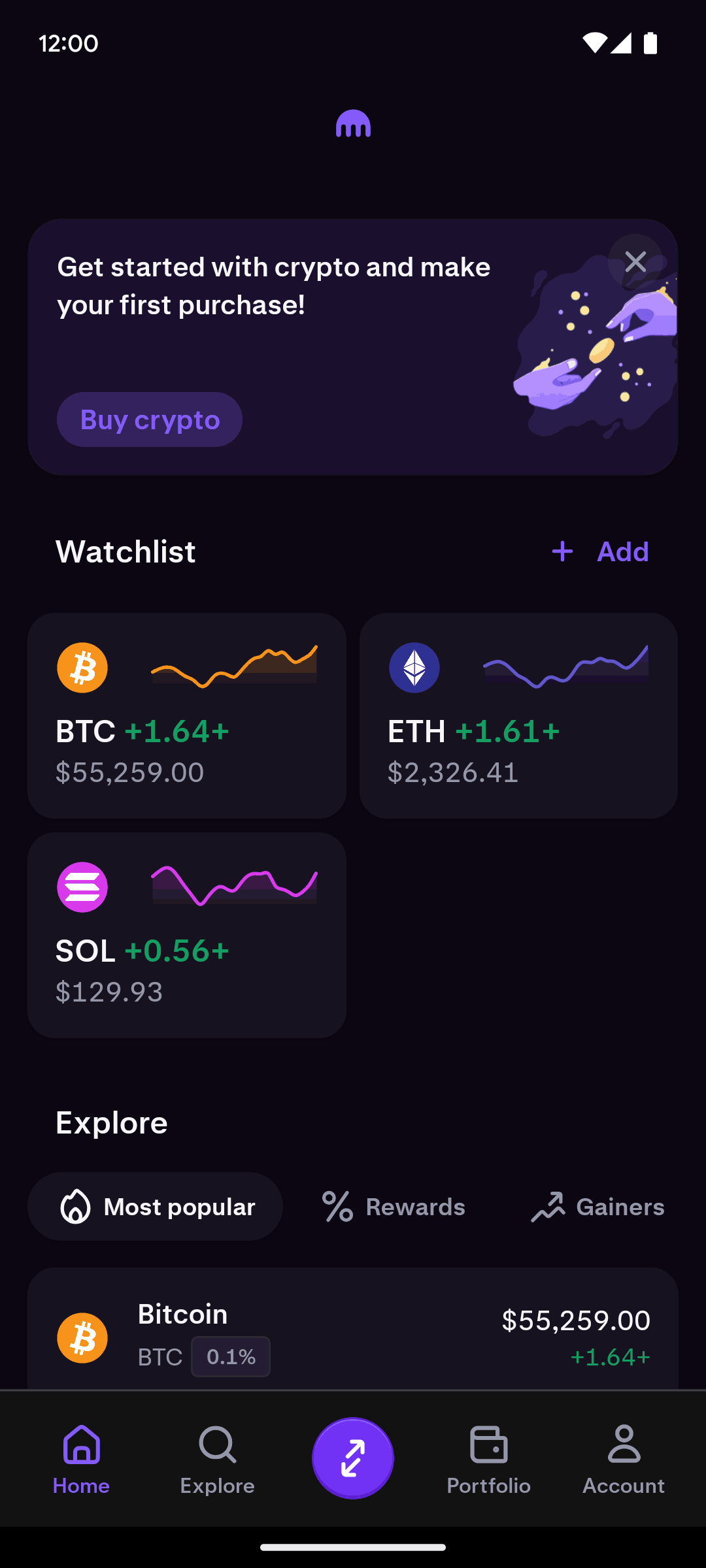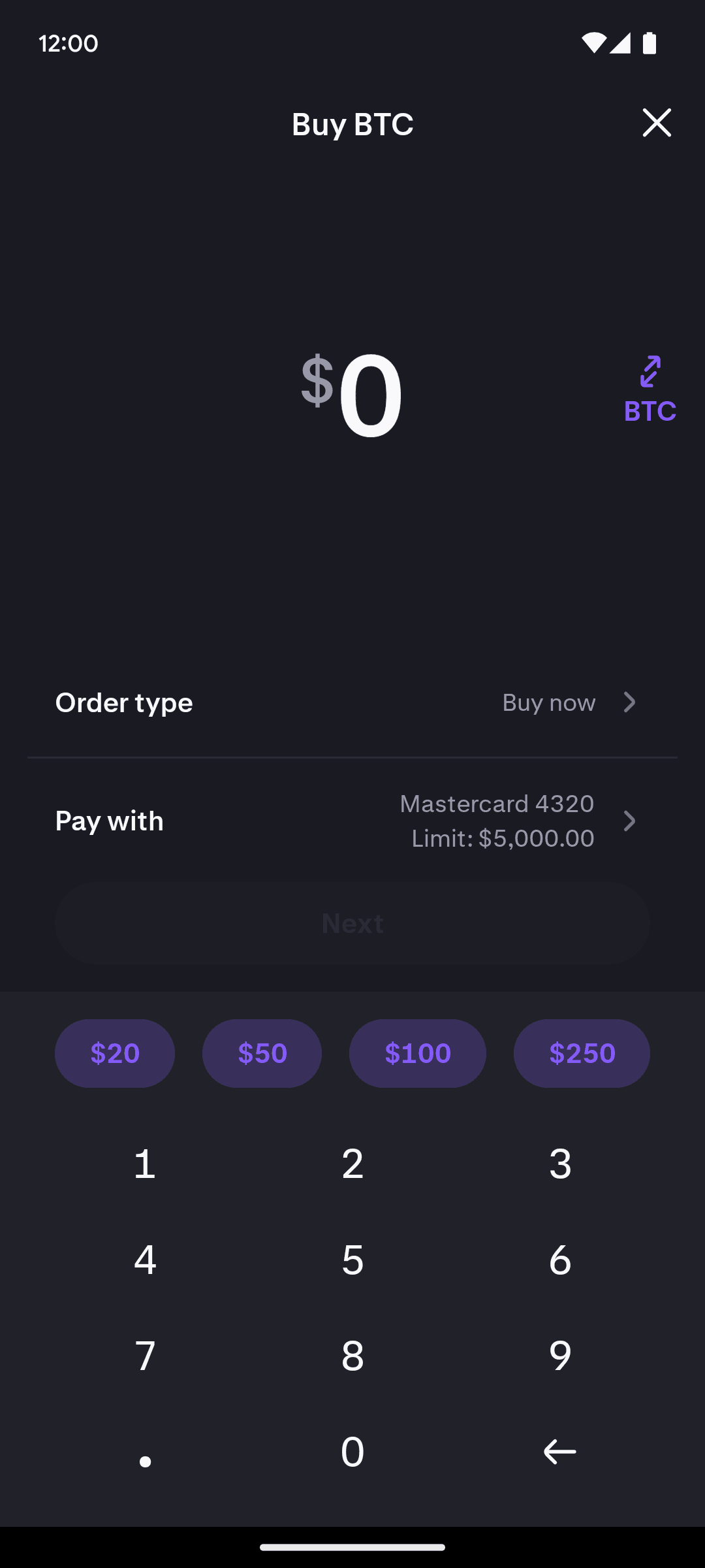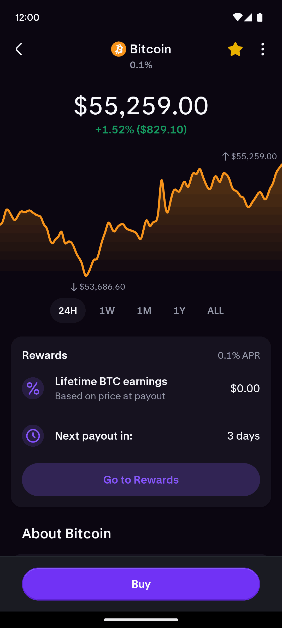 The user switches to dark mode, views Bitcoin details, and navigates to the 'Buy BTC' screen. The flow showcases a purchase action.