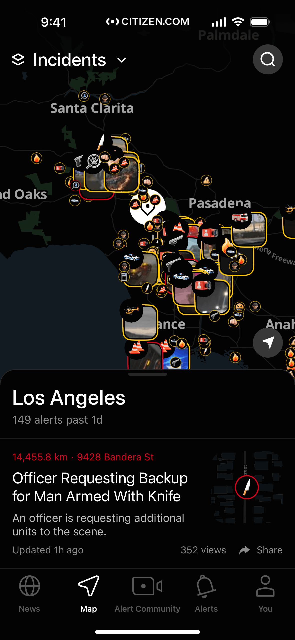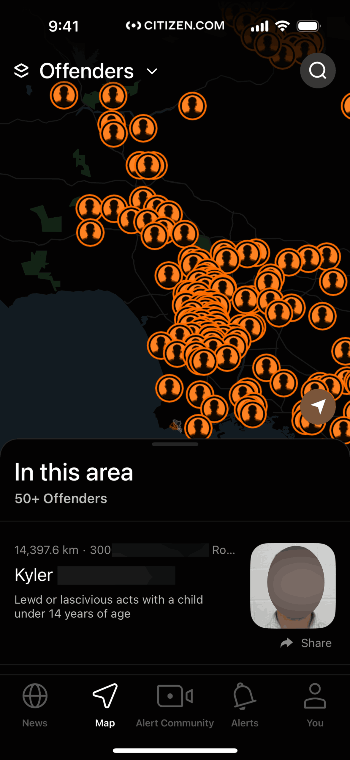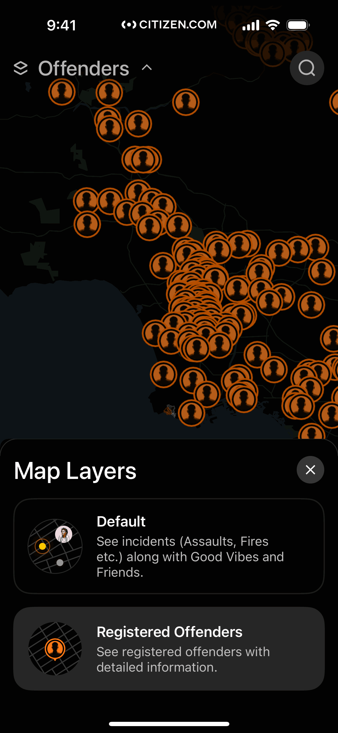 The user switches from viewing registered offenders on a map to viewing incidents. The map updates to display relevant information about the incidents.